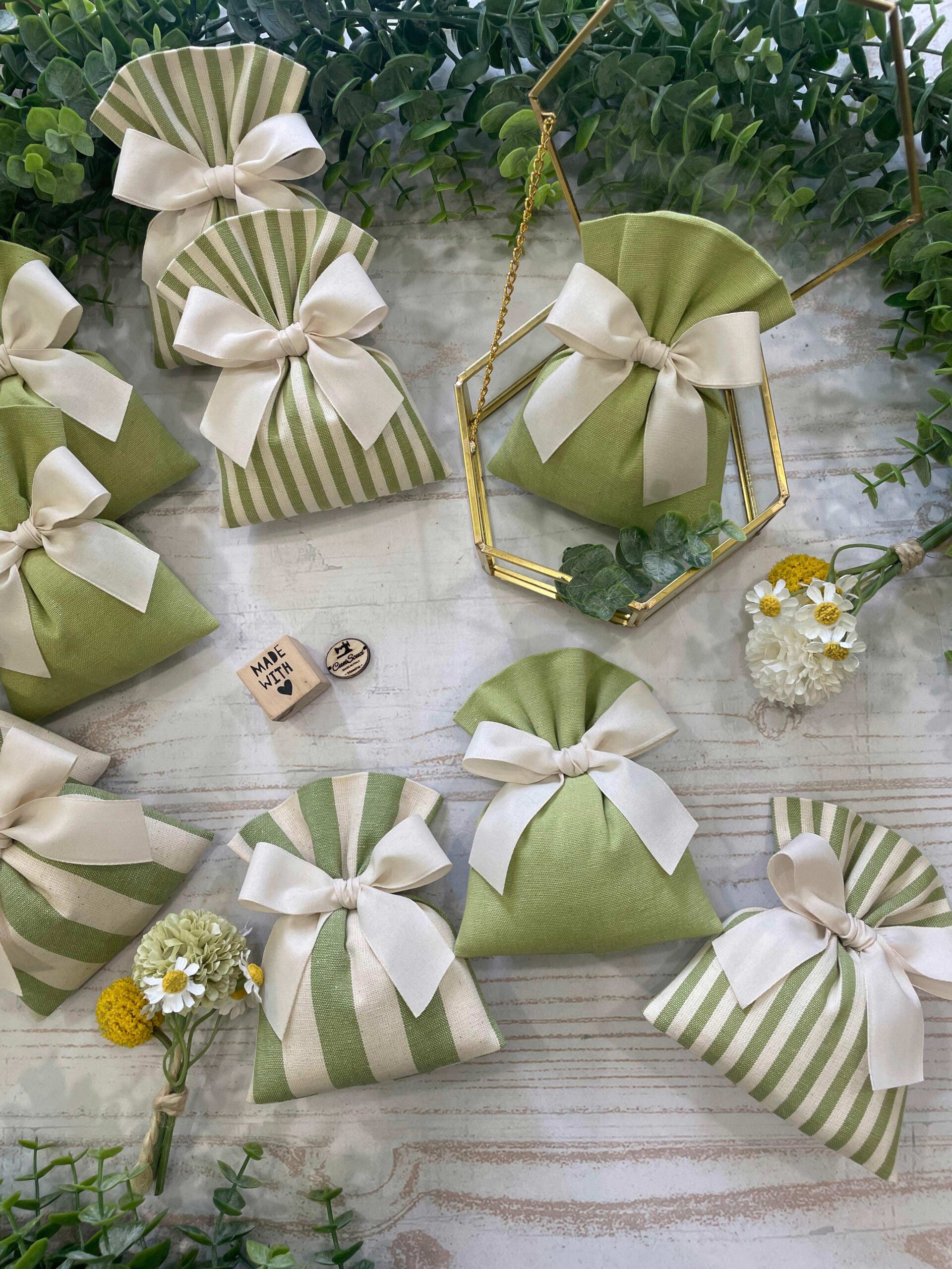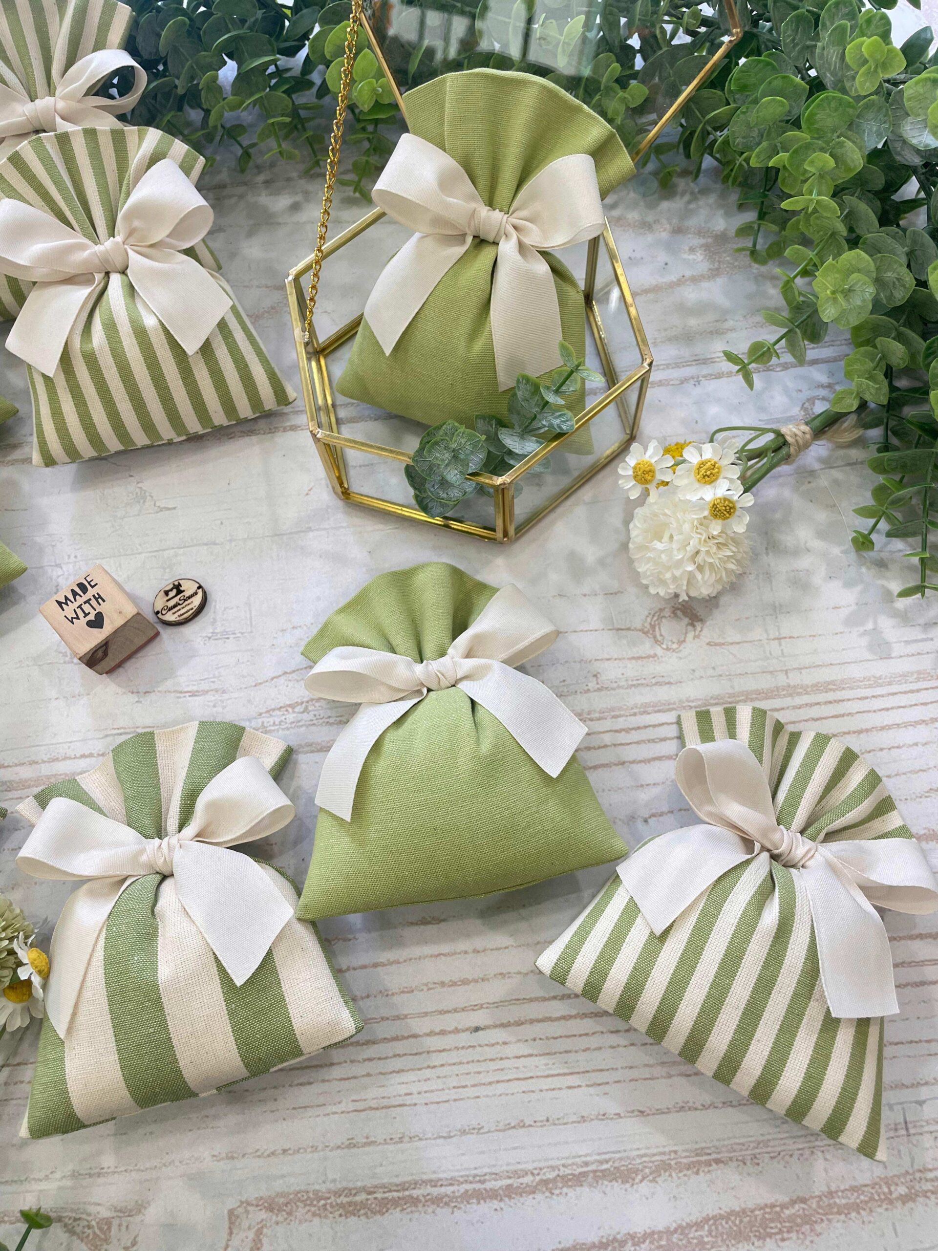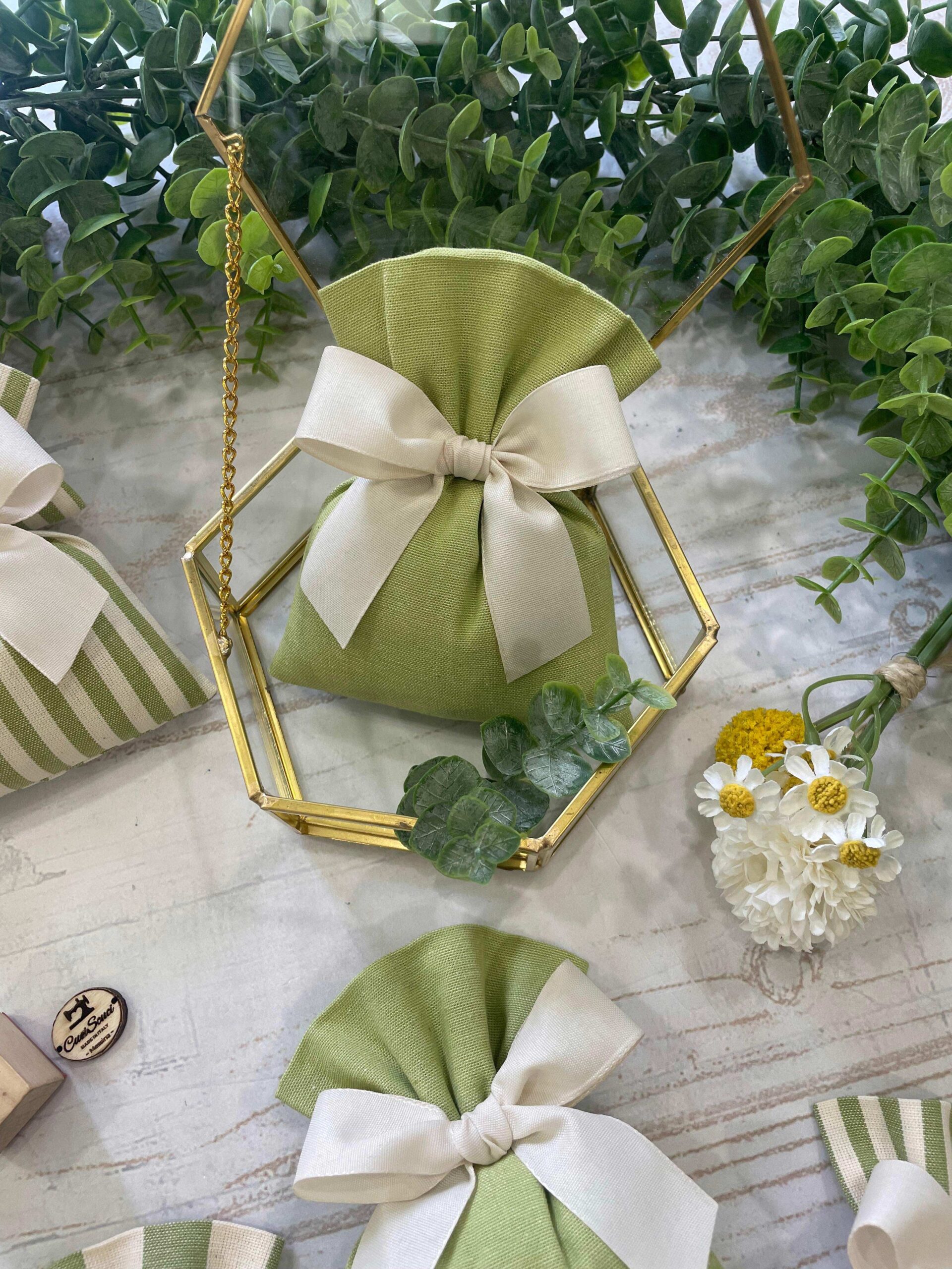 La bomboniera, pronta da donare ai tuoi ospiti, comprende il sacchetto, confezionato con imbottitura in ovatta, fiocco abbinato e 5 confetti in busta sigillata.