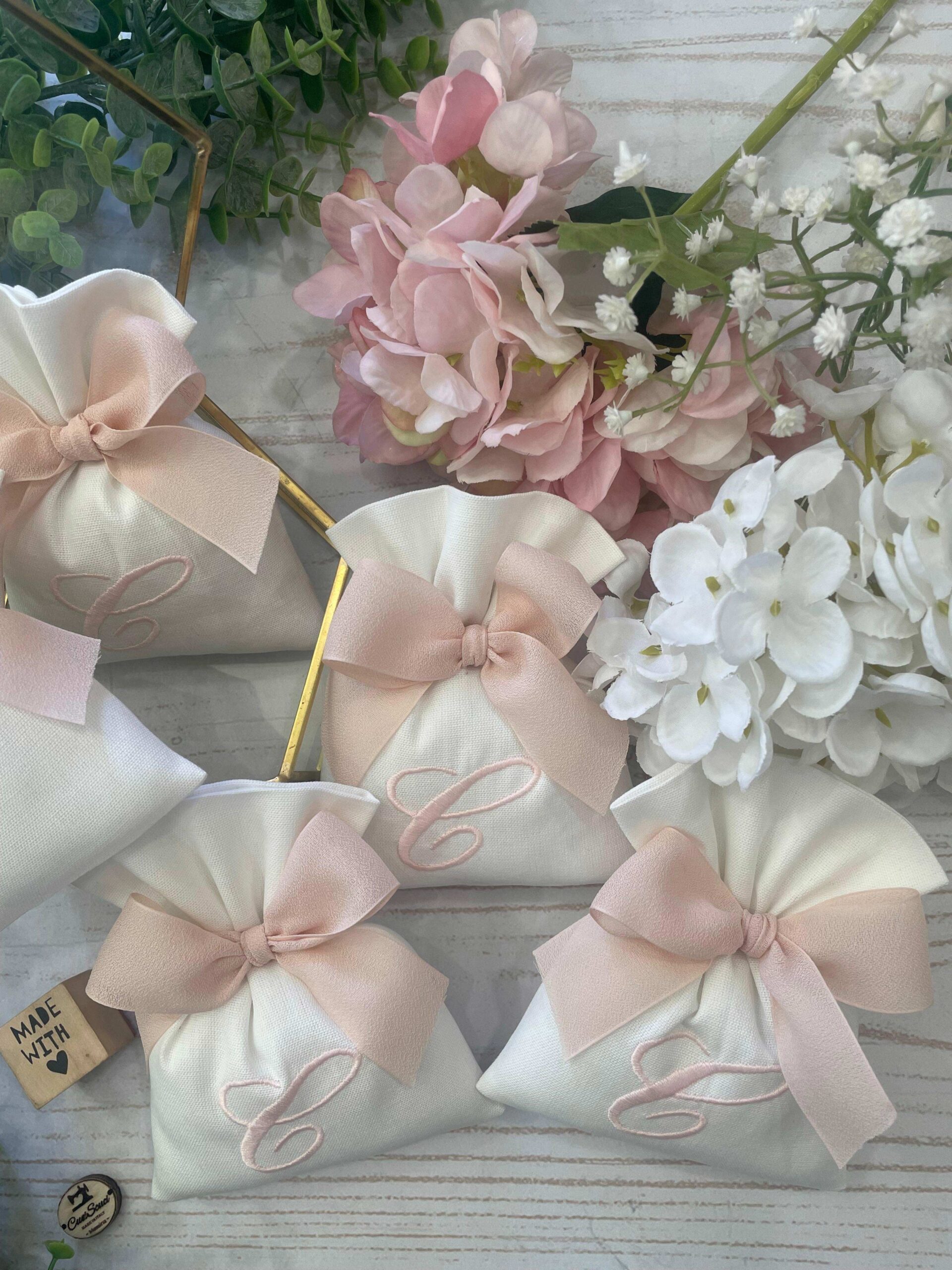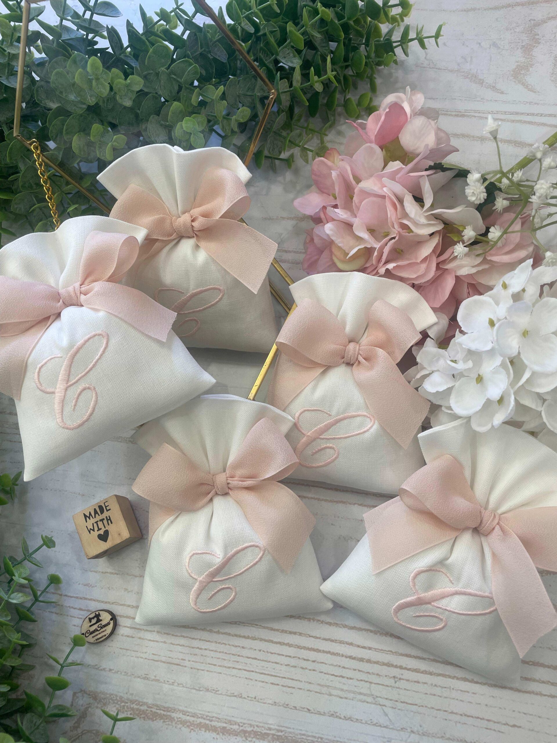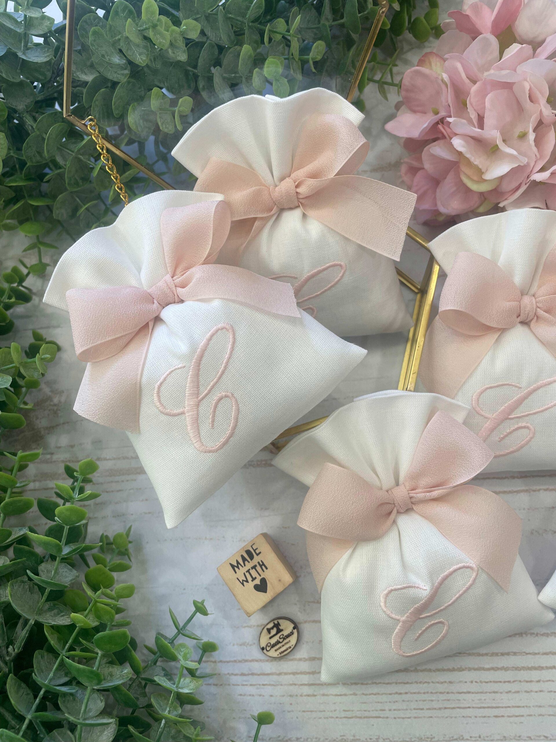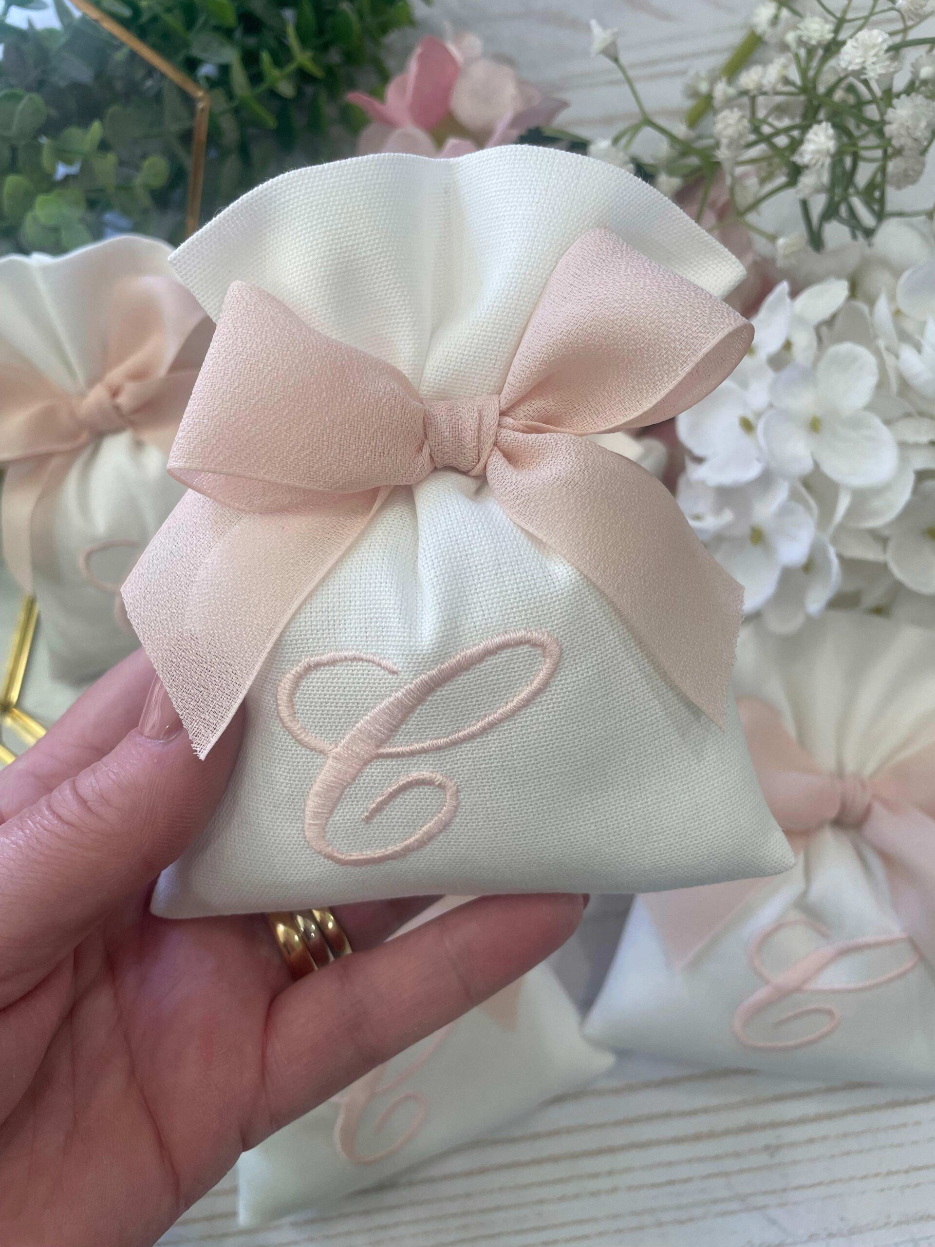 La bomboniera, pronta da donare ai tuoi ospiti, comprende il sacchetto con ricamo, confezionato con imbottitura in ovatta, fiocco abbinato e 5 confetti in busta sigillata.