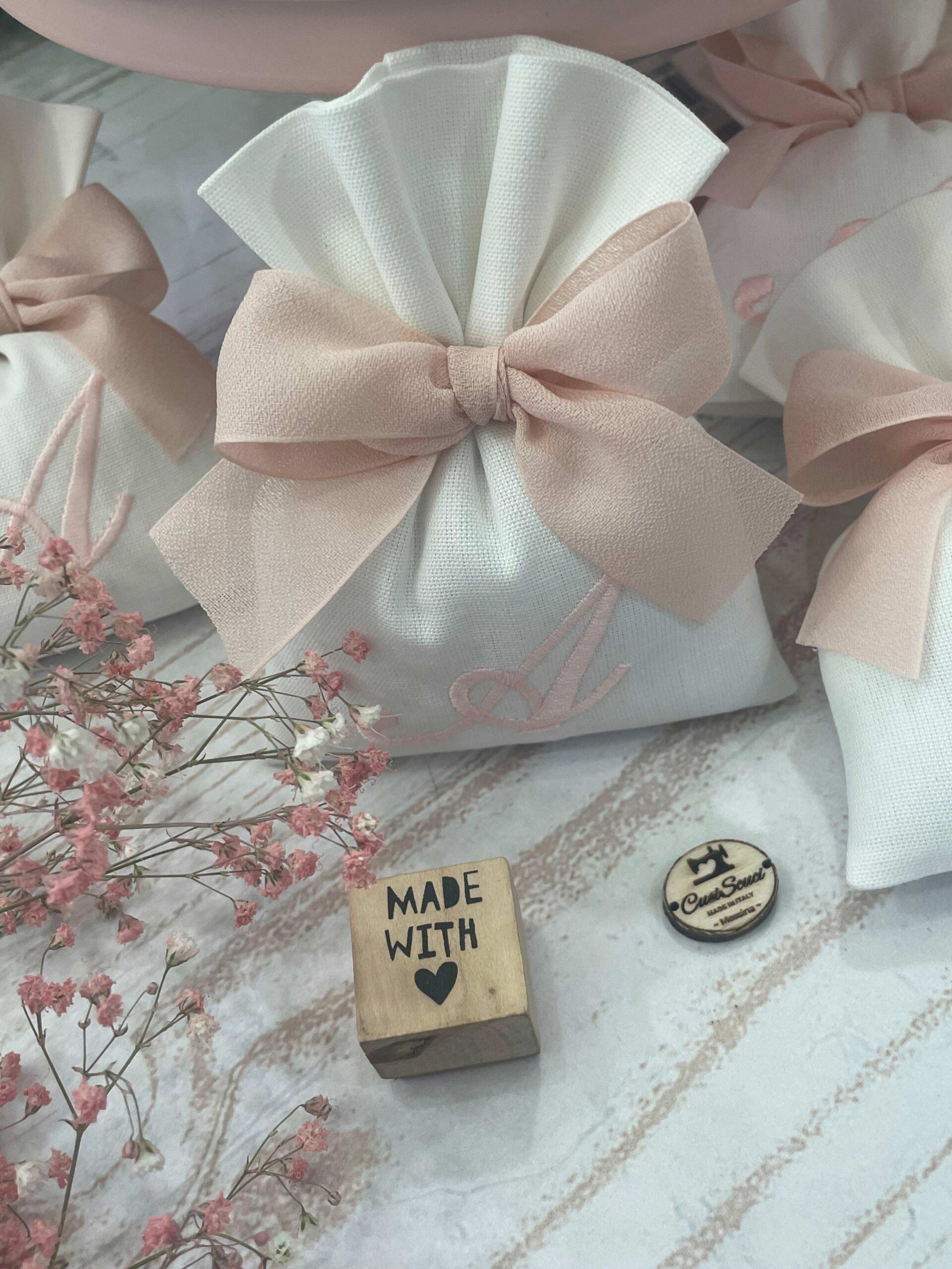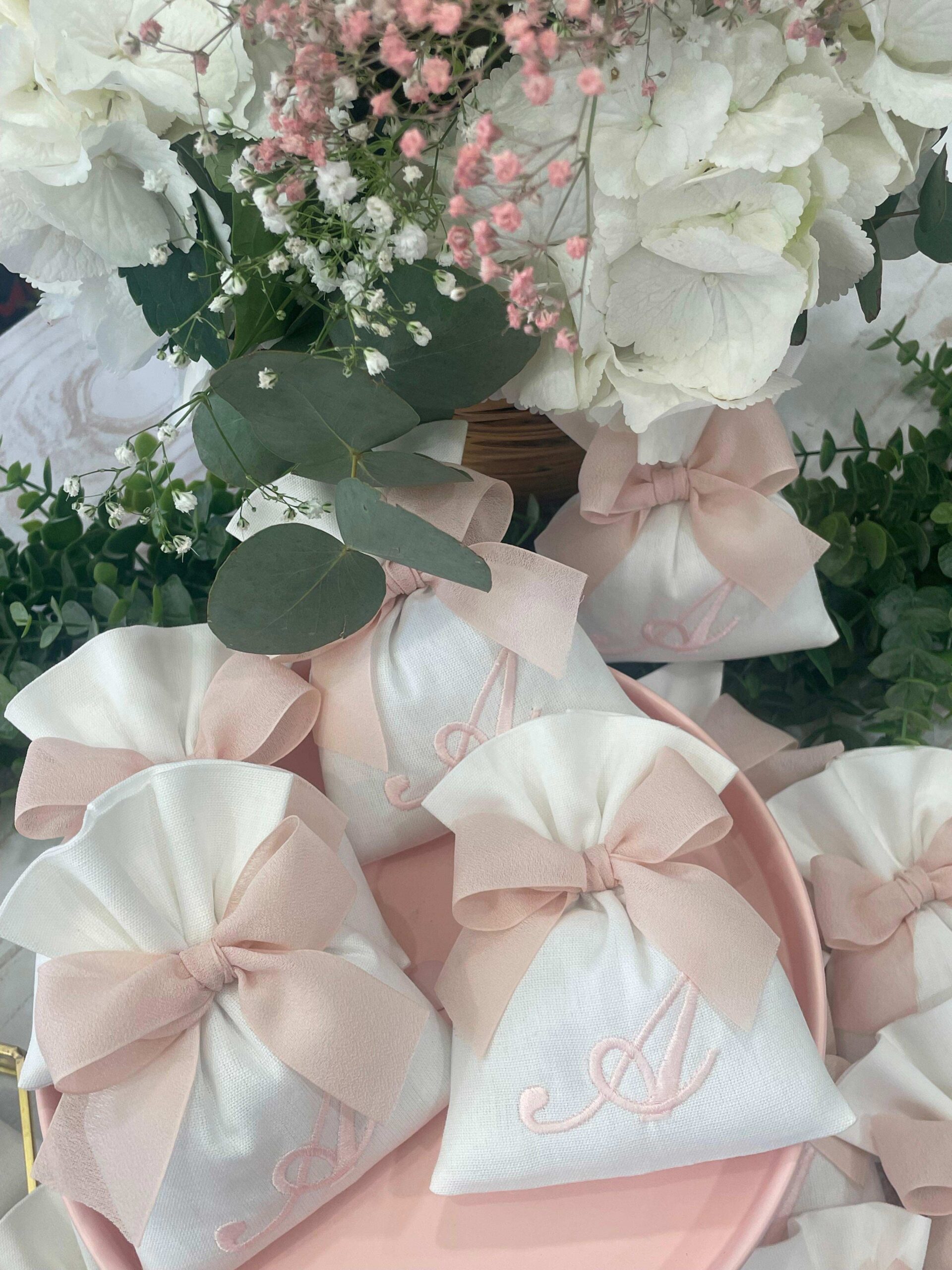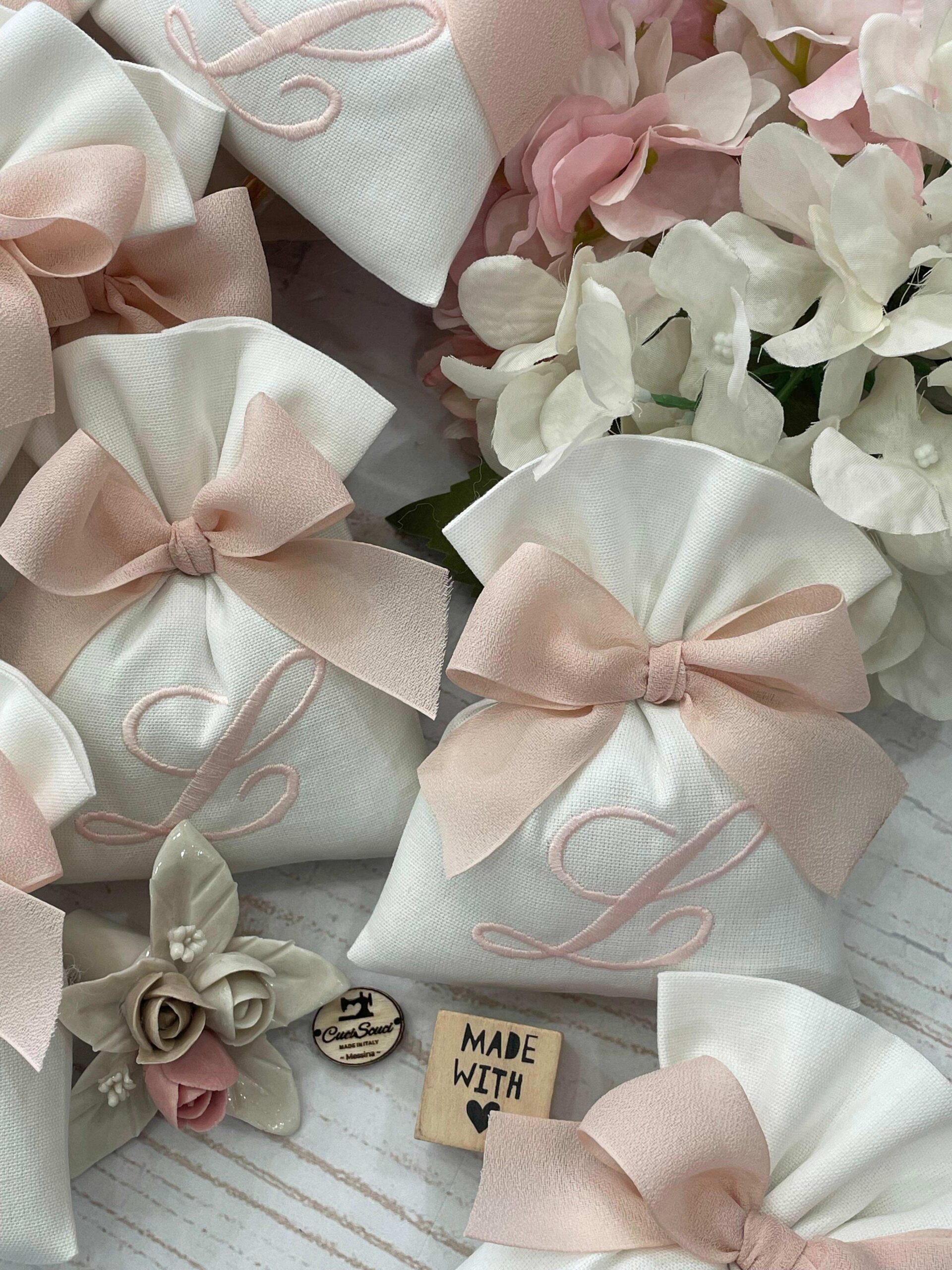La bomboniera, pronta da donare ai tuoi ospiti, comprende il sacchetto con ricamo, confezionato con imbottitura in ovatta, fiocco abbinato e 5 confetti in busta sigillata.