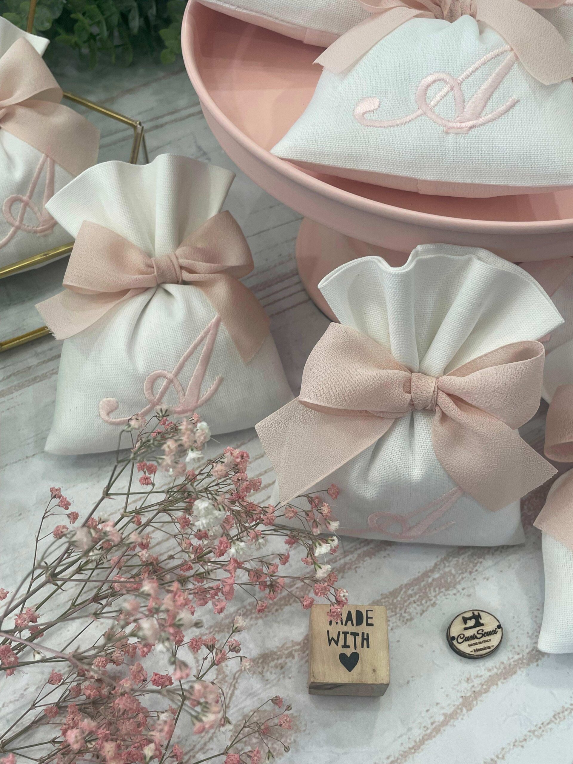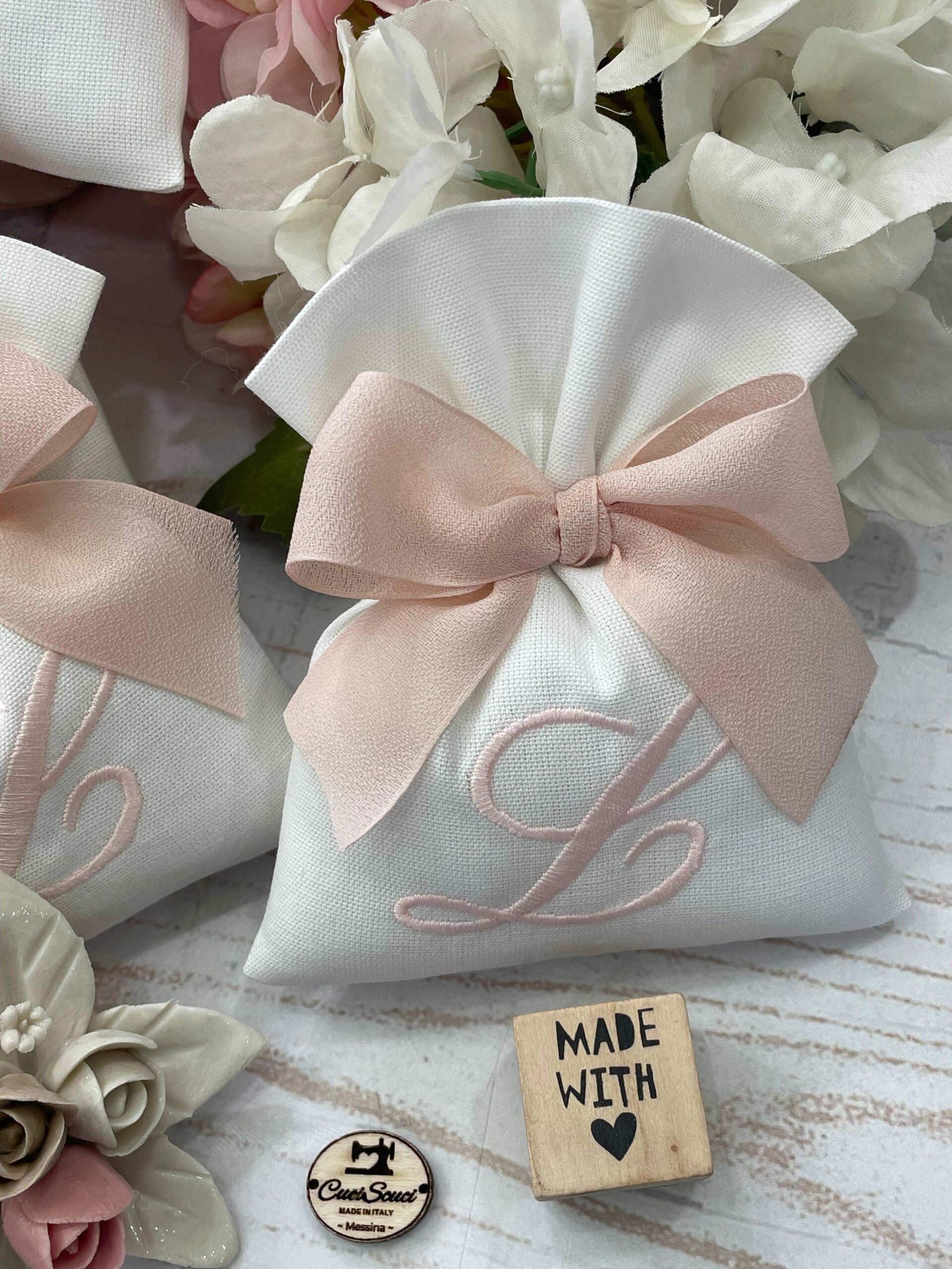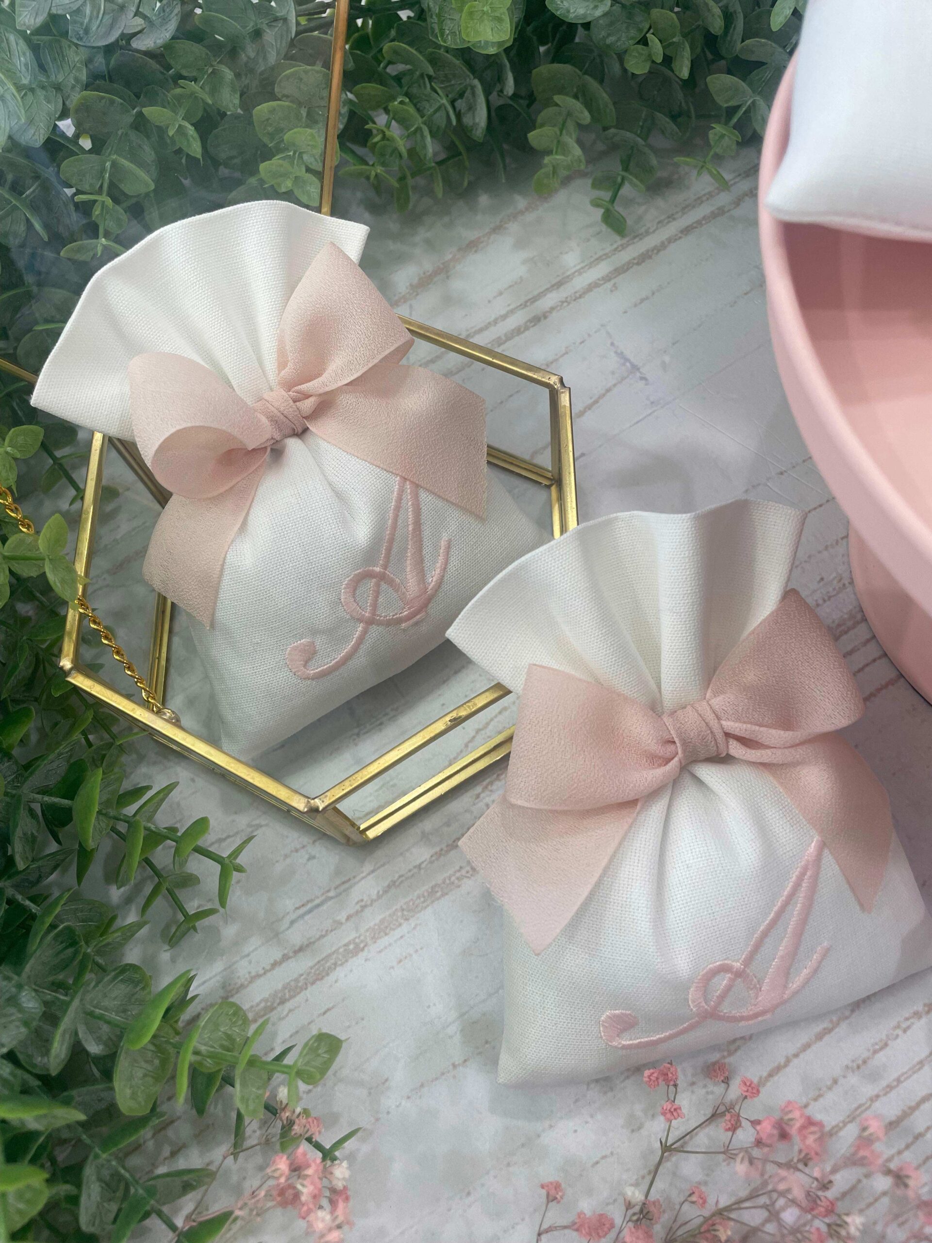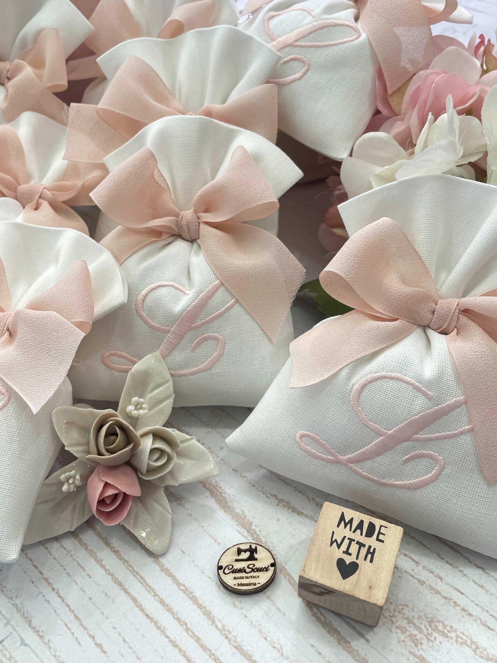 La bomboniera, pronta da donare ai tuoi ospiti, comprende il sacchetto con ricamo, confezionato con imbottitura in ovatta, fiocco abbinato e 5 confetti in busta sigillata.