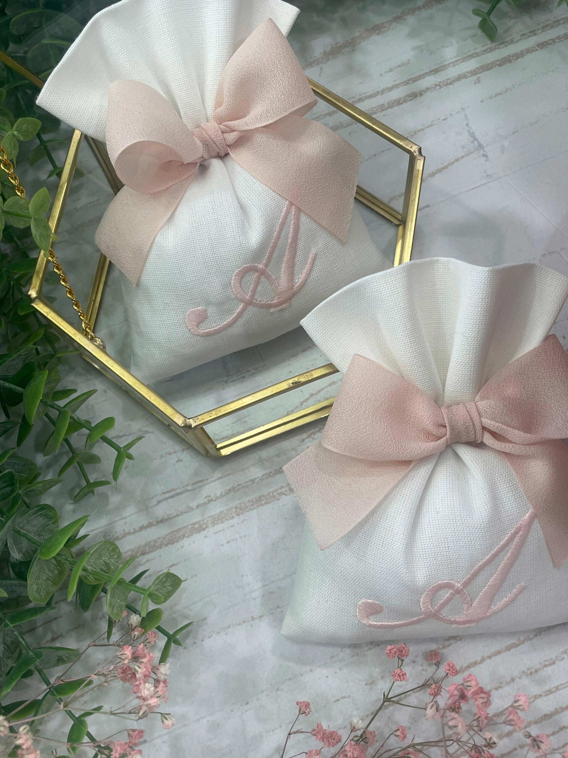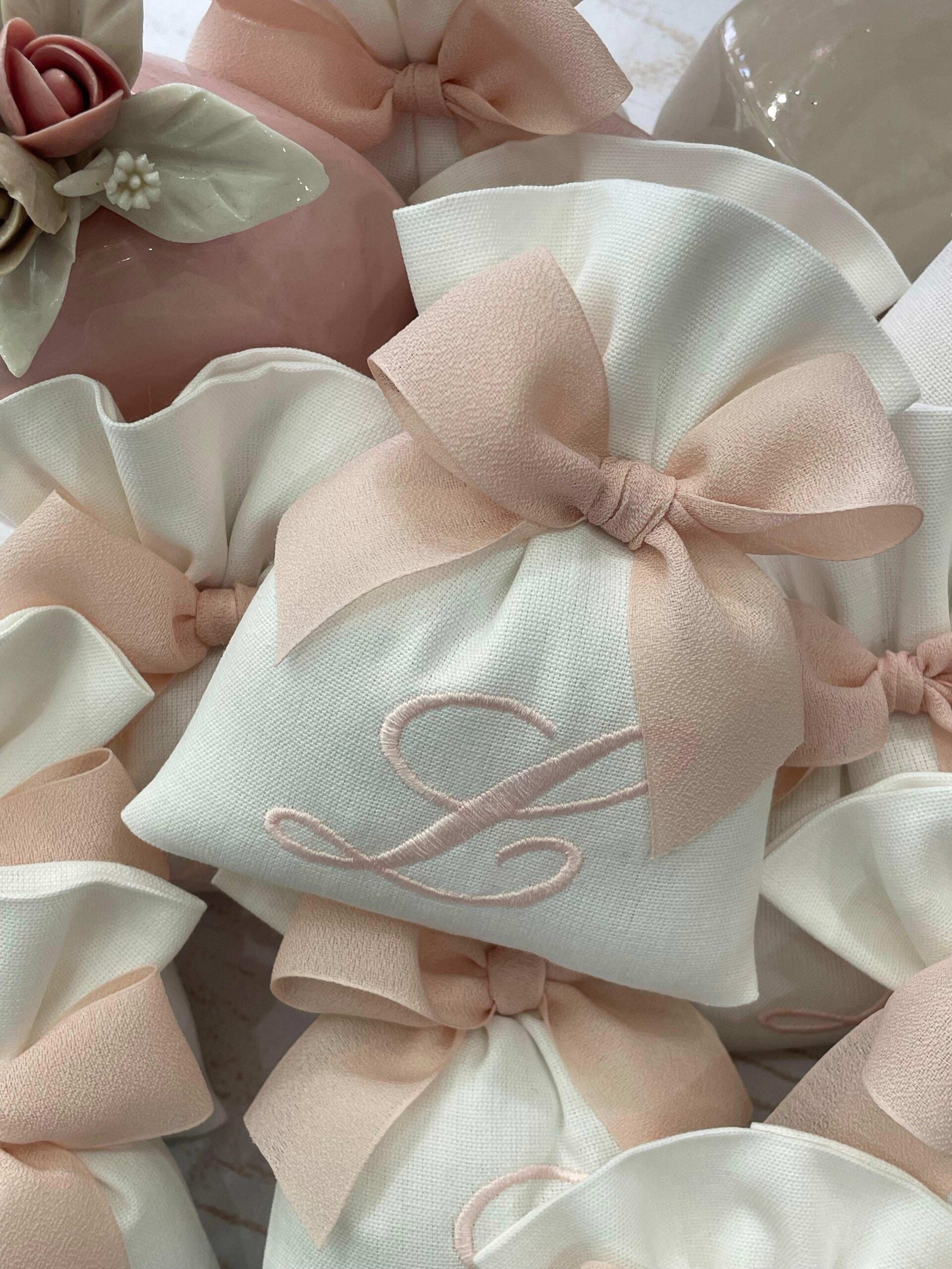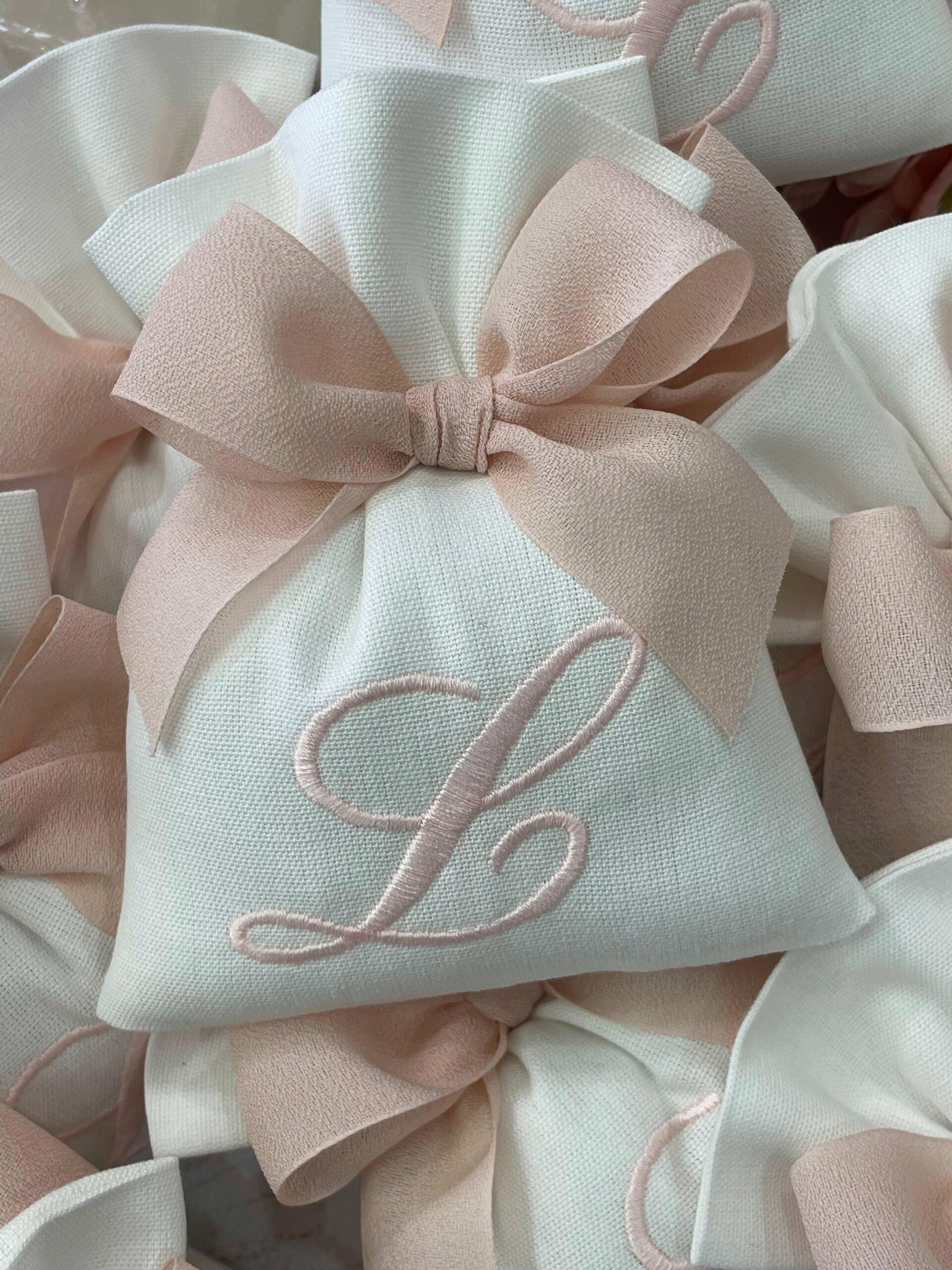 Realizzato con cotone tinto filo nei toni del bianco latte e del rosa cipria, con il ricamo di un’iniziale bianca o rosa.