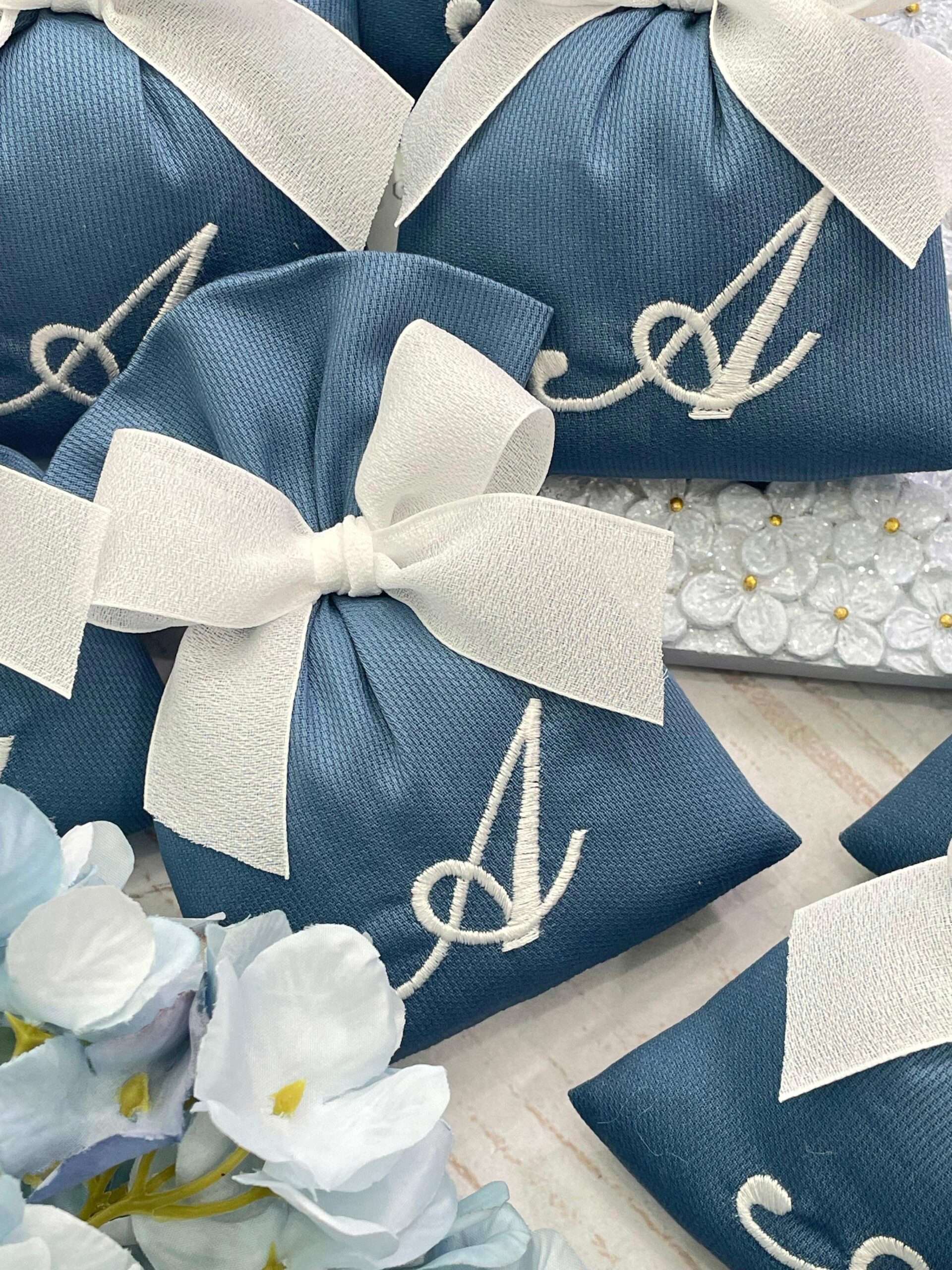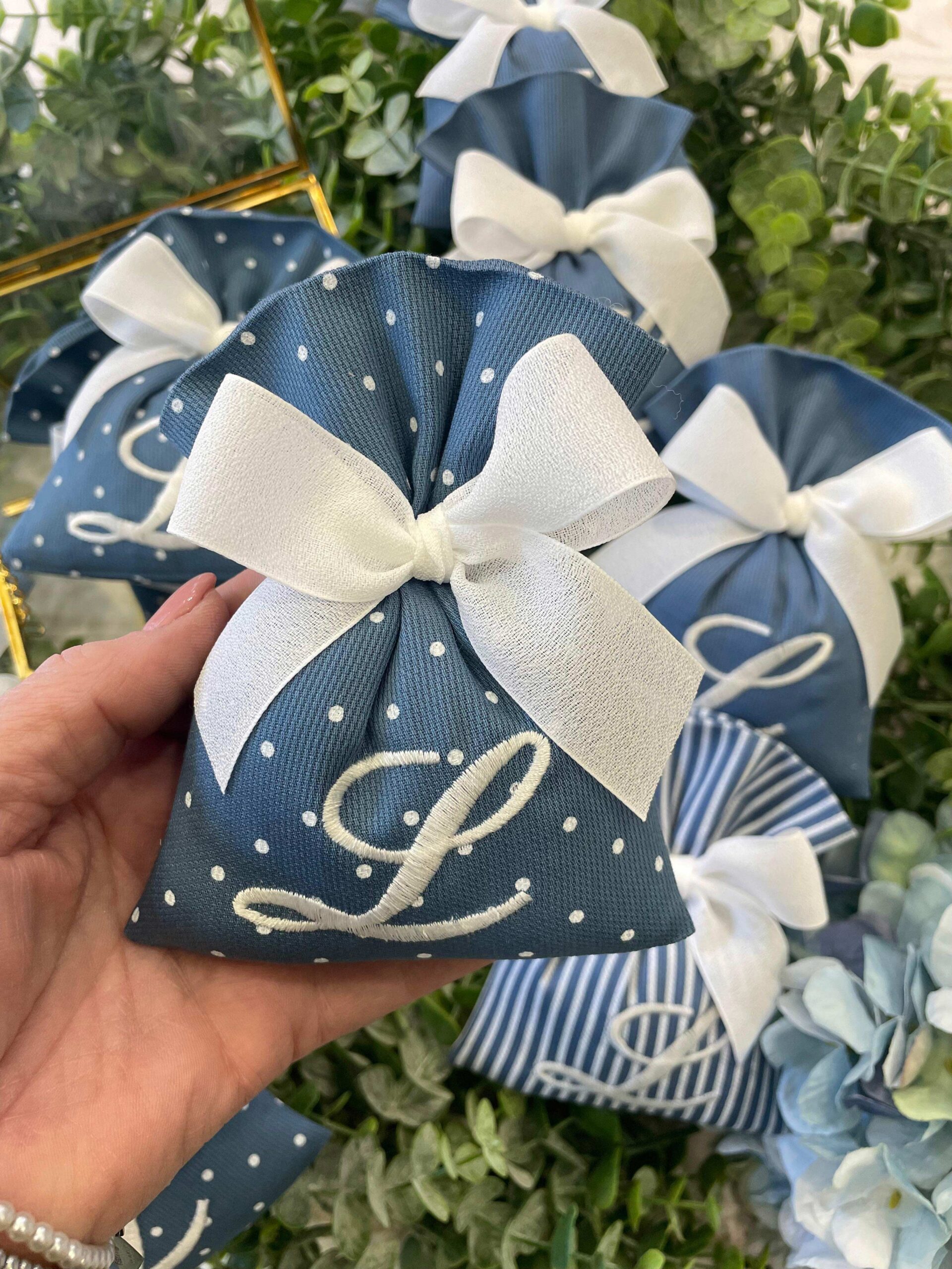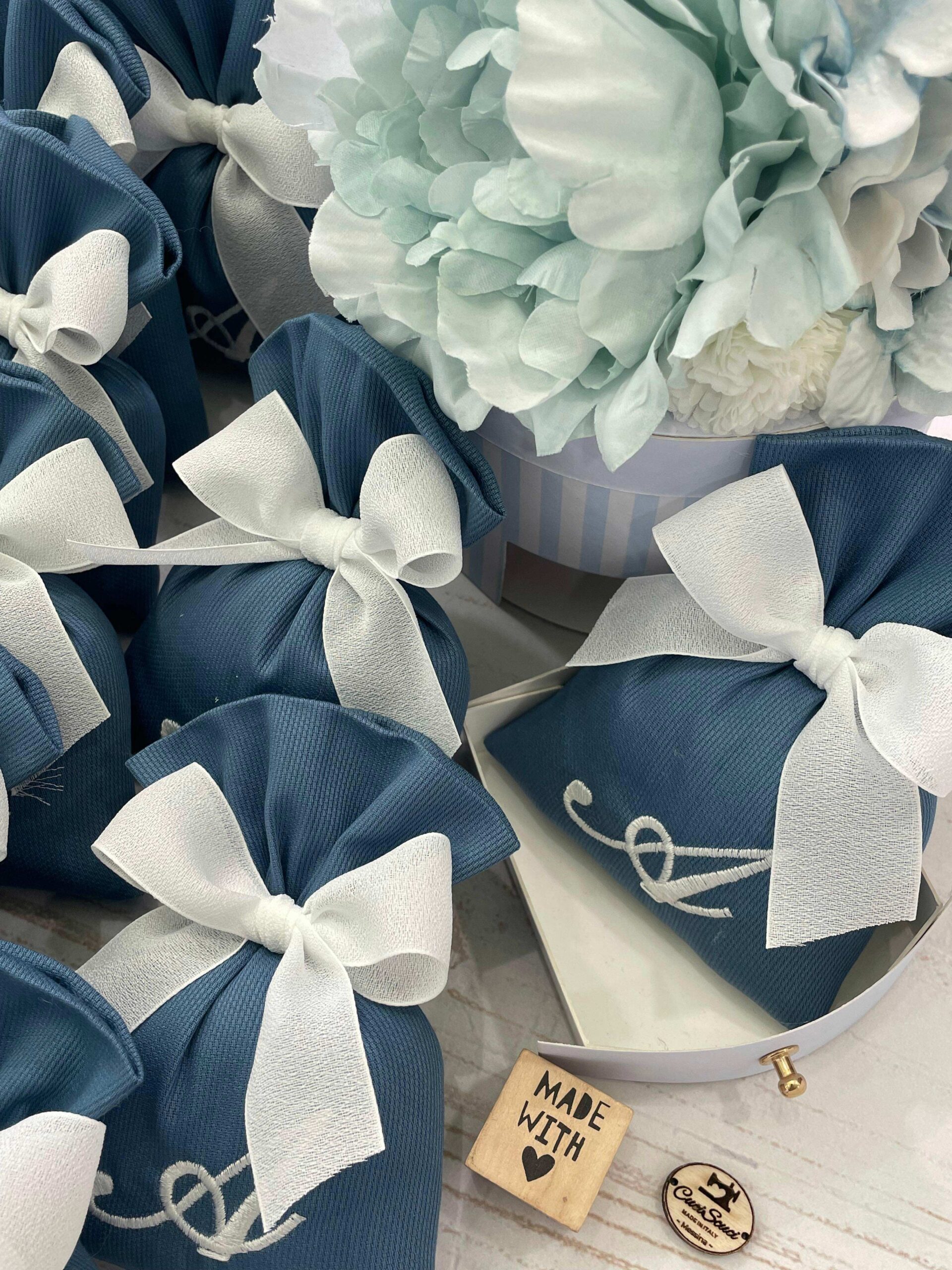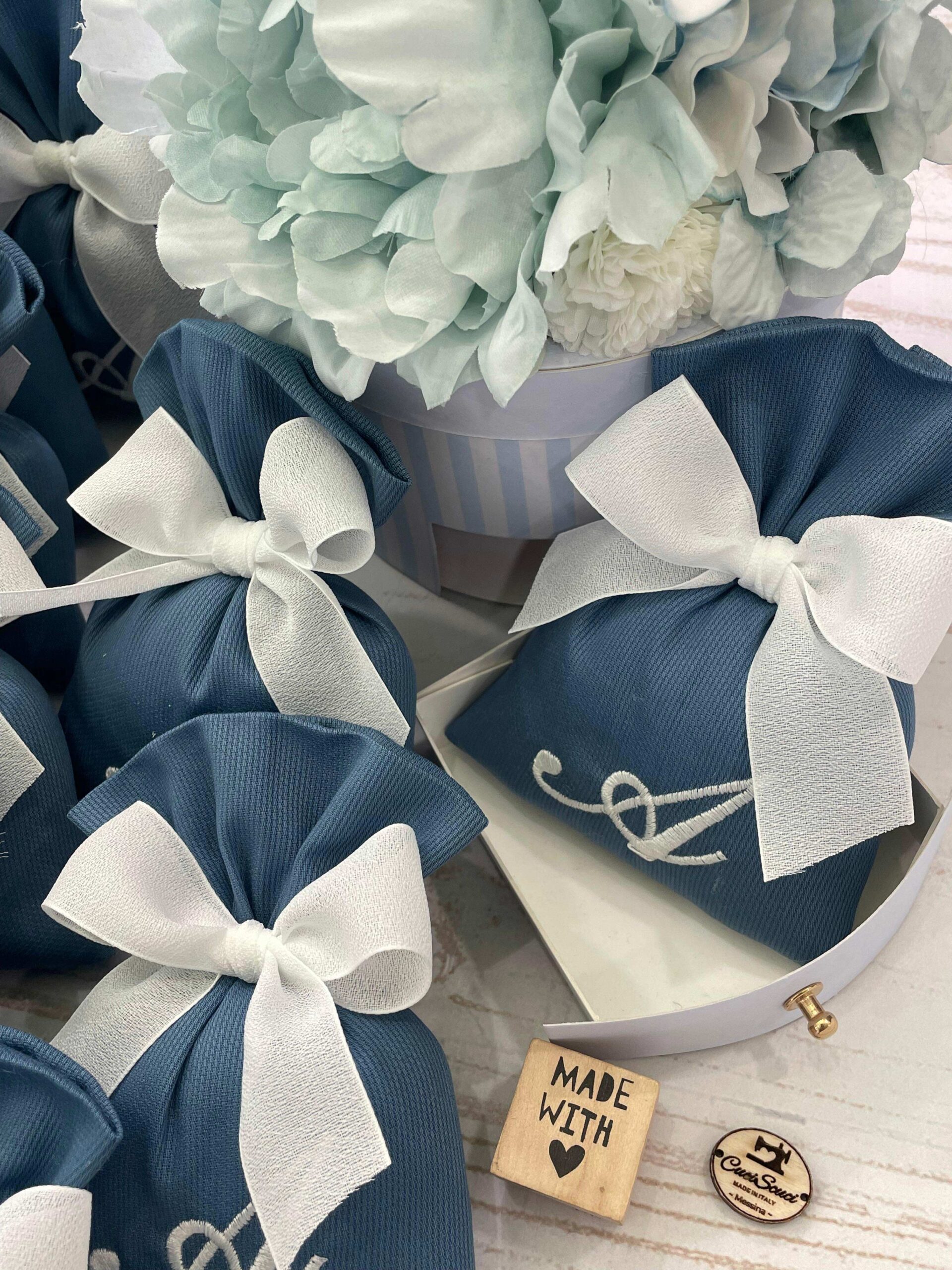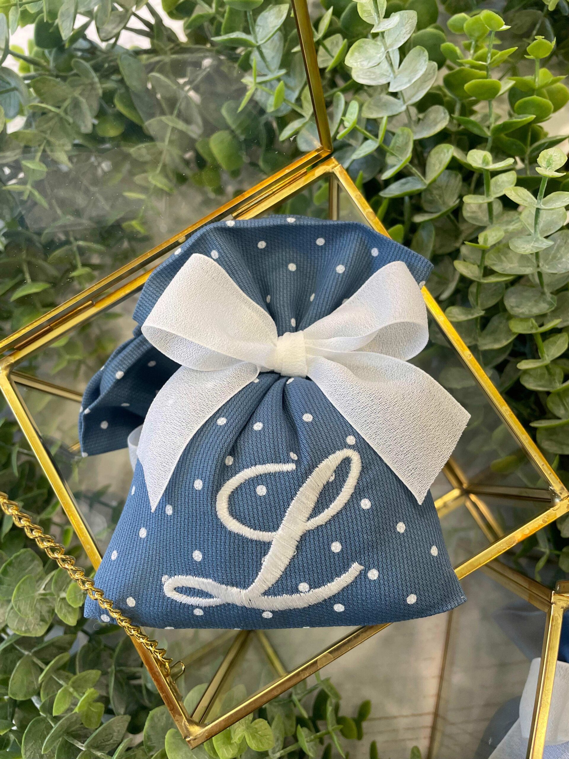 La bomboniera, pronta da donare ai tuoi ospiti, comprende il sacchetto con ricamo, confezionato con imbottitura in ovatta, fiocco abbinato e 5 confetti in busta sigillata.