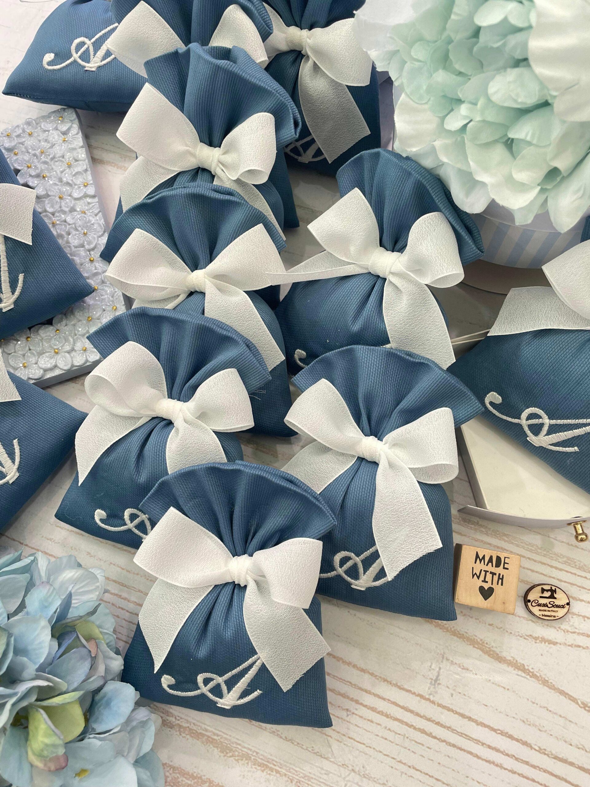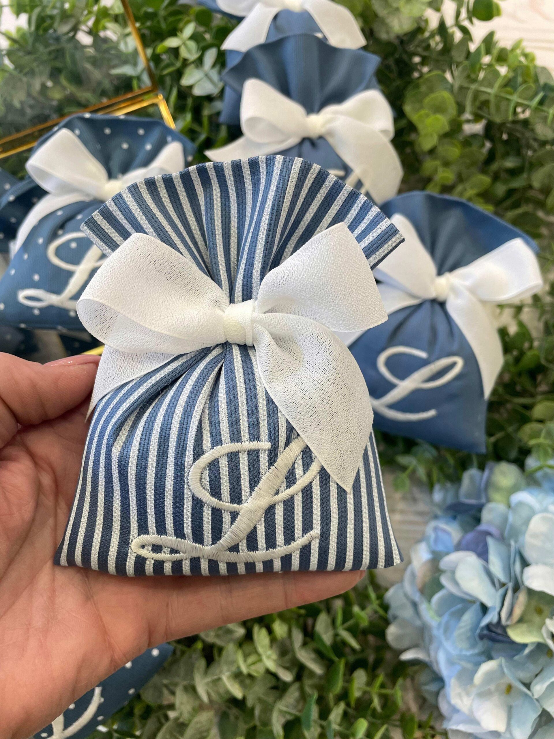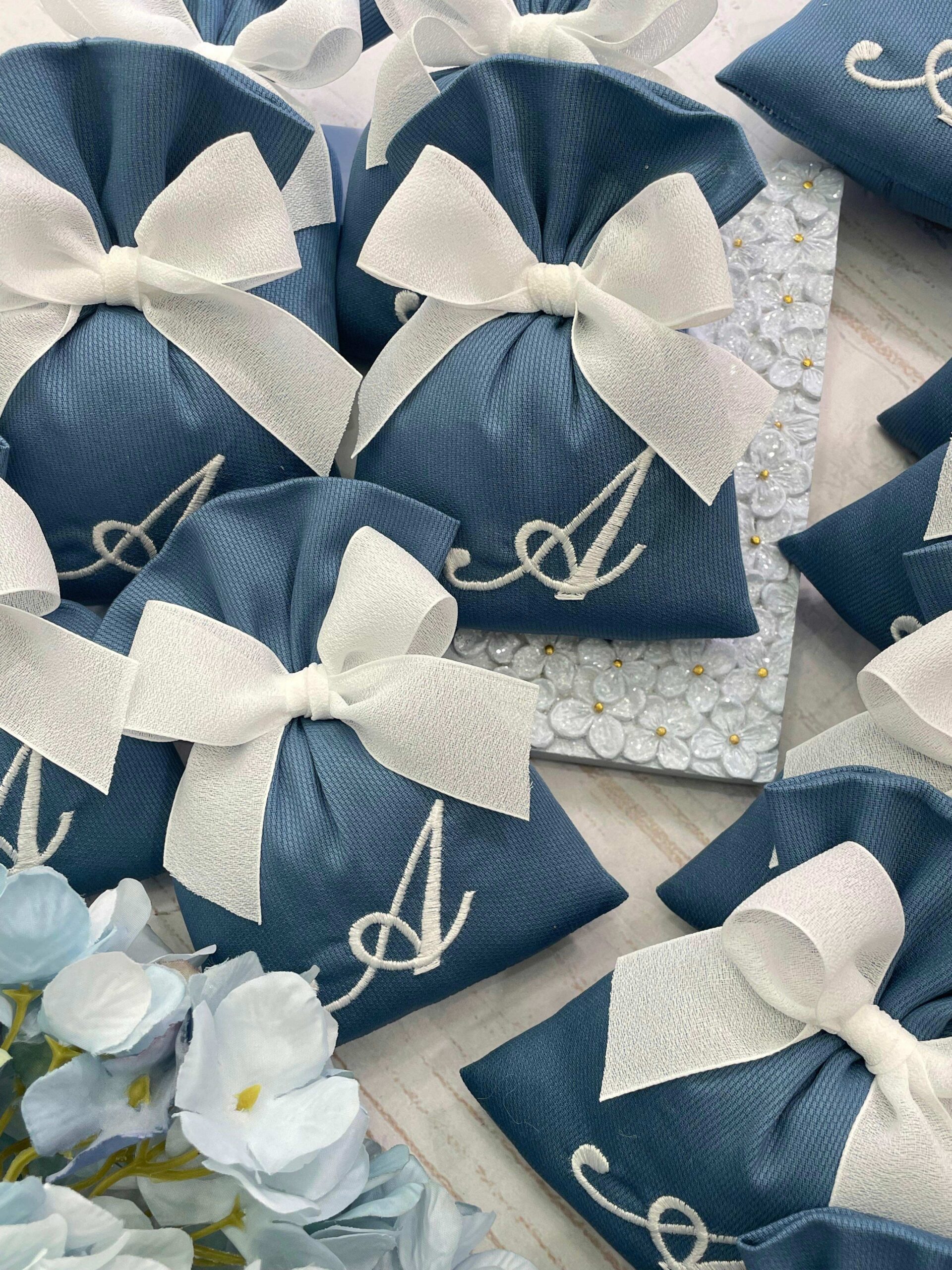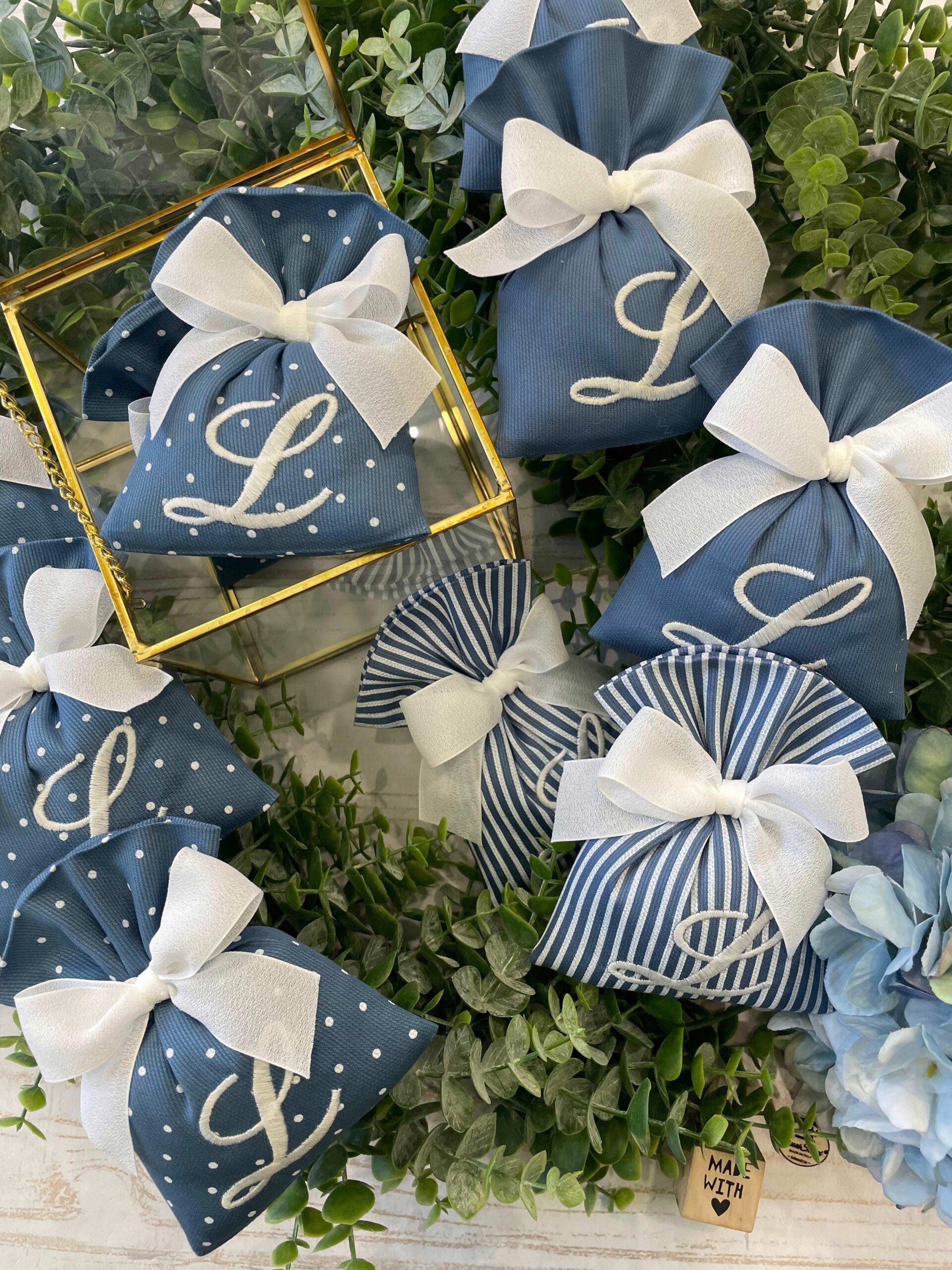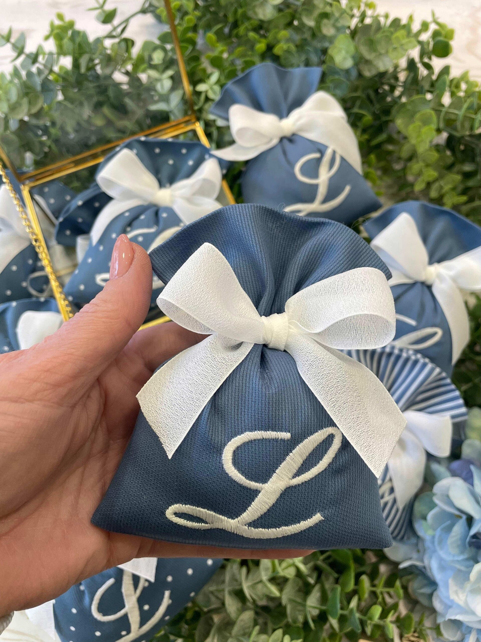 La bomboniera, pronta da donare ai tuoi ospiti, comprende il sacchetto con ricamo, confezionato con imbottitura in ovatta, fiocco abbinato e 5 confetti in busta sigillata.