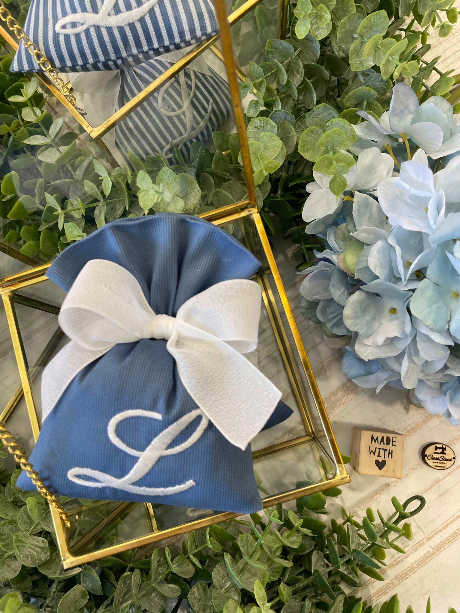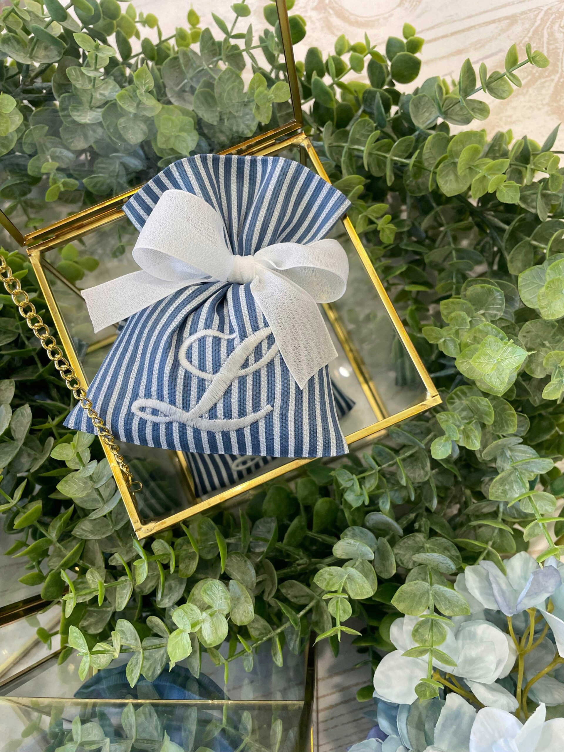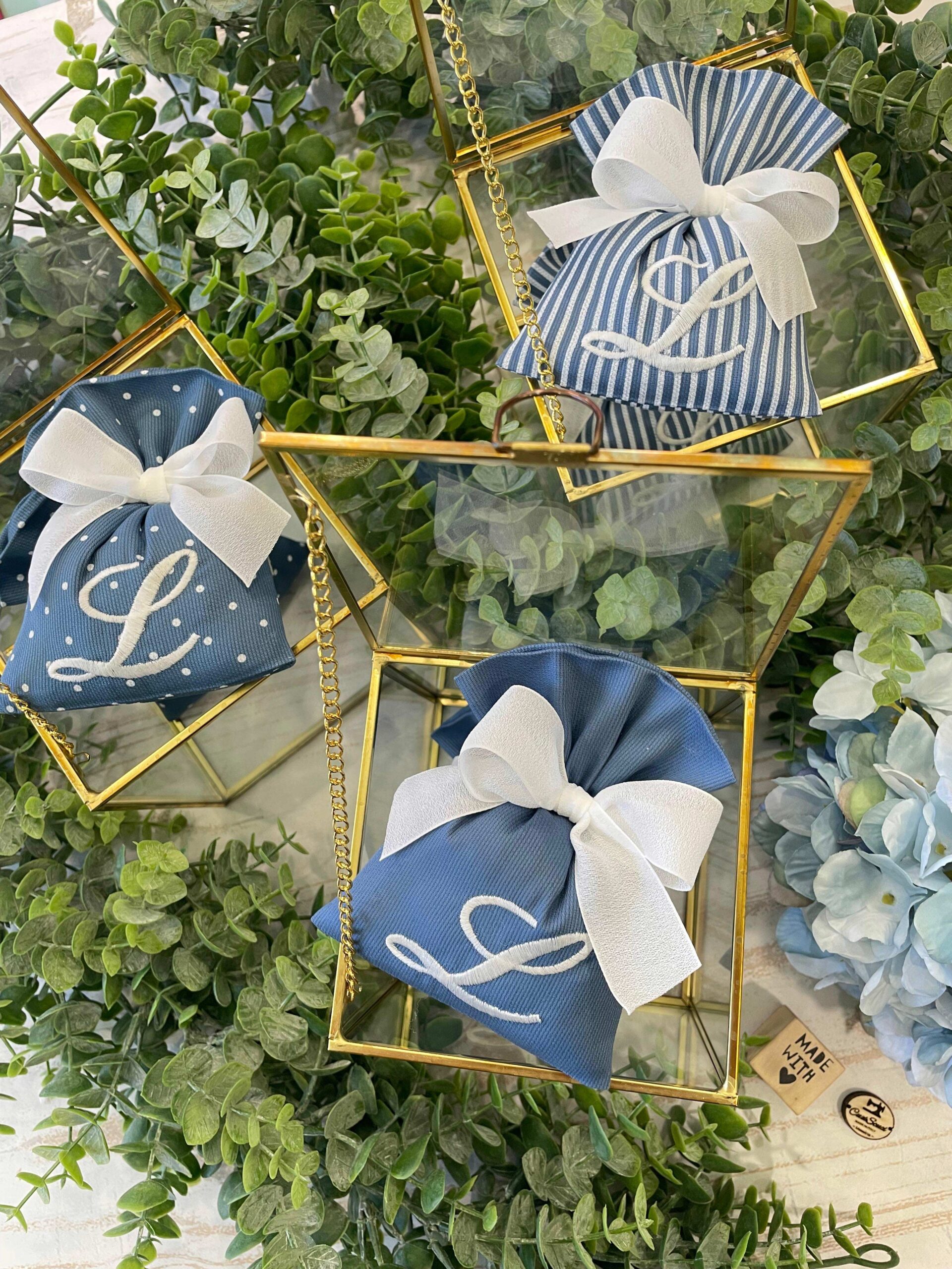 Realizzato con rigatino di cotone in fantasie assortite, o a scelta, nei toni del colore carta da zucchero, con il ricamo di un’iniziale.