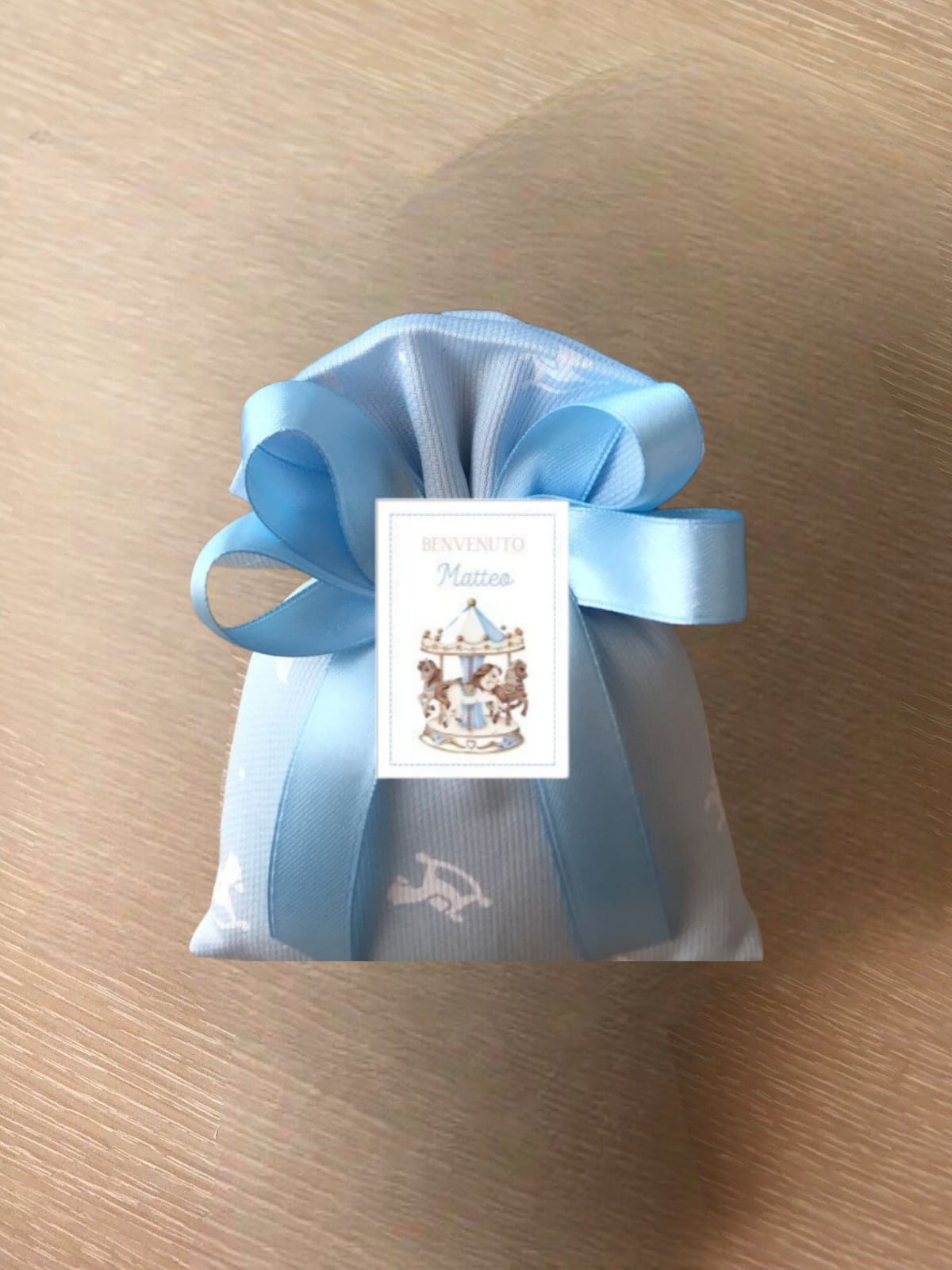 Realizzato con cotone rigatino celeste, fantasia cavallini a dondolo, con l’applicazione di un tag personalizzato.