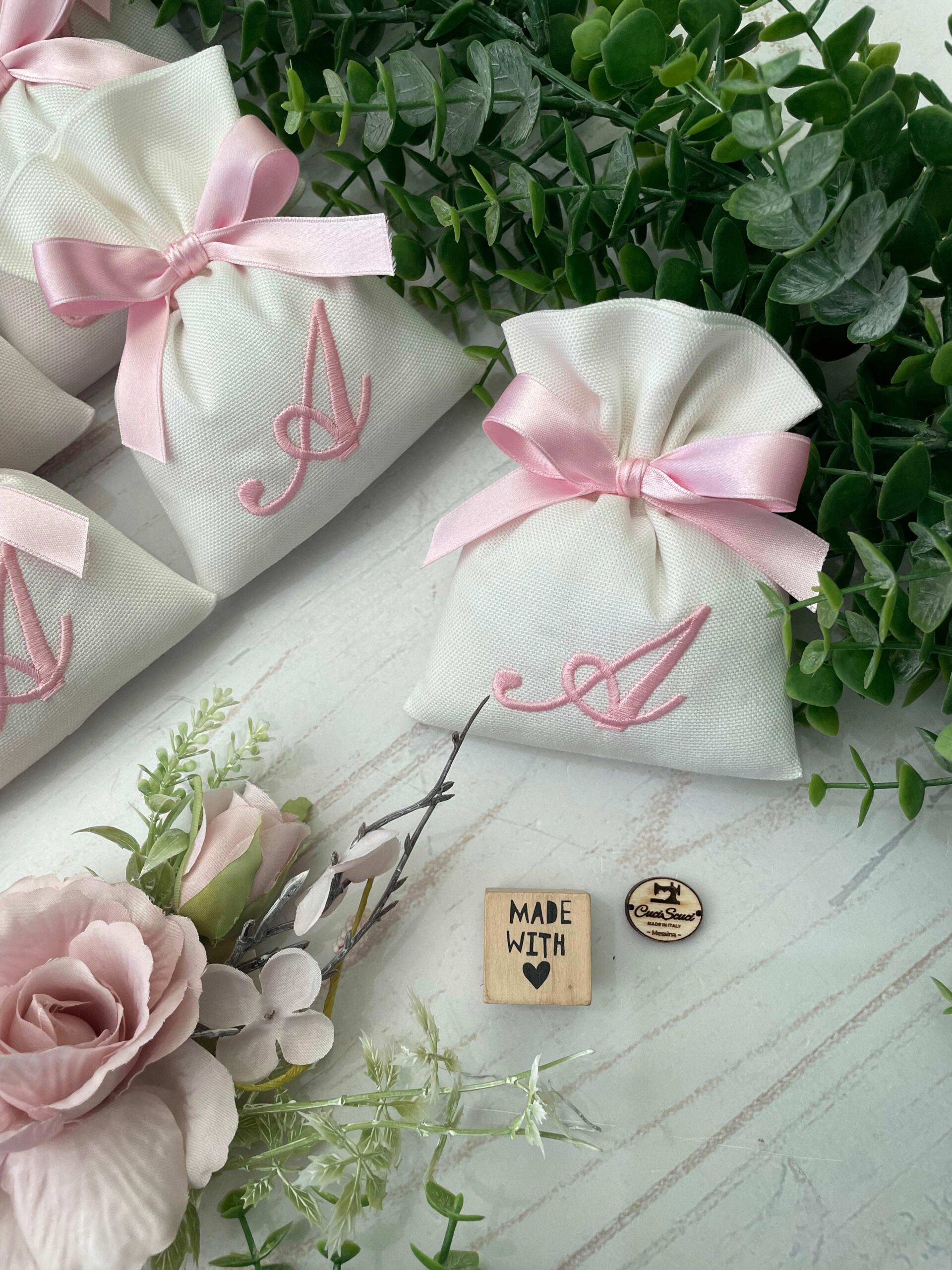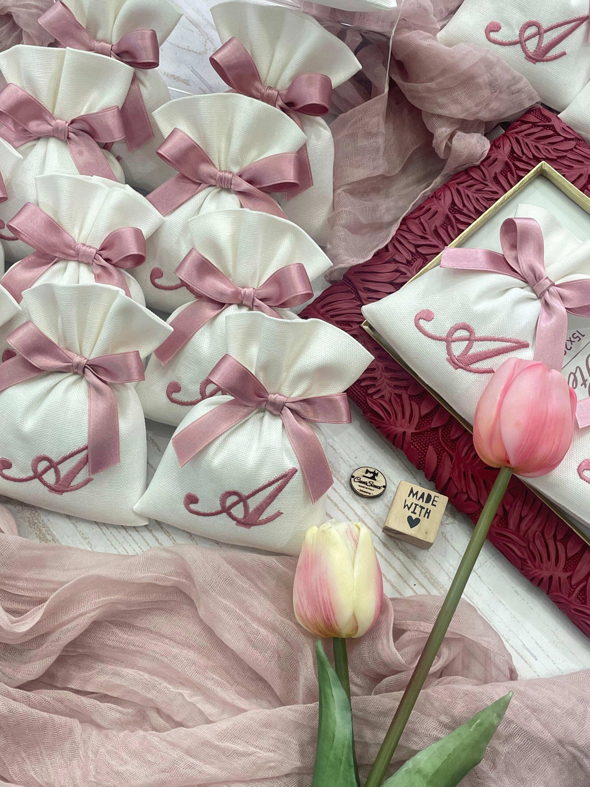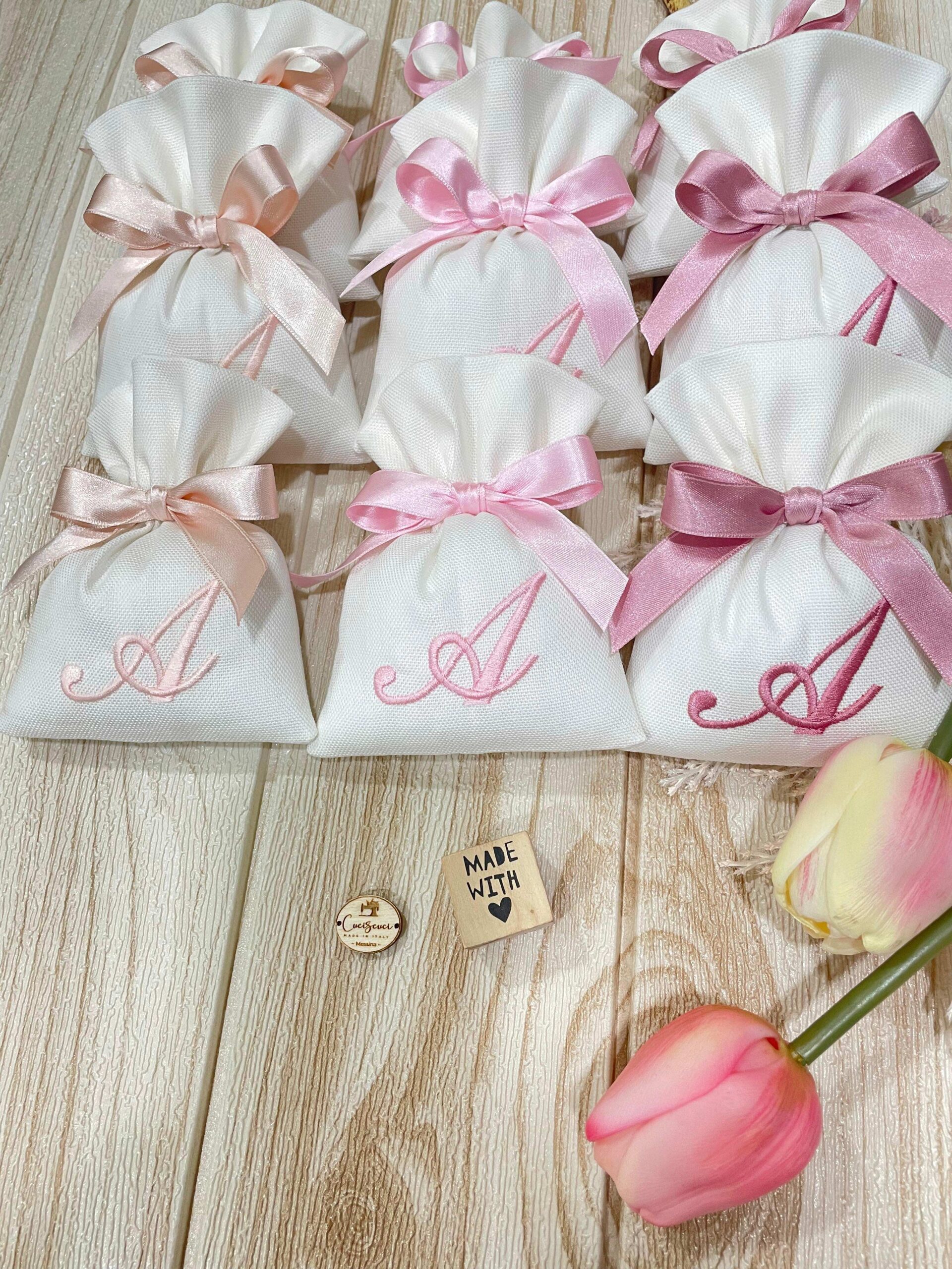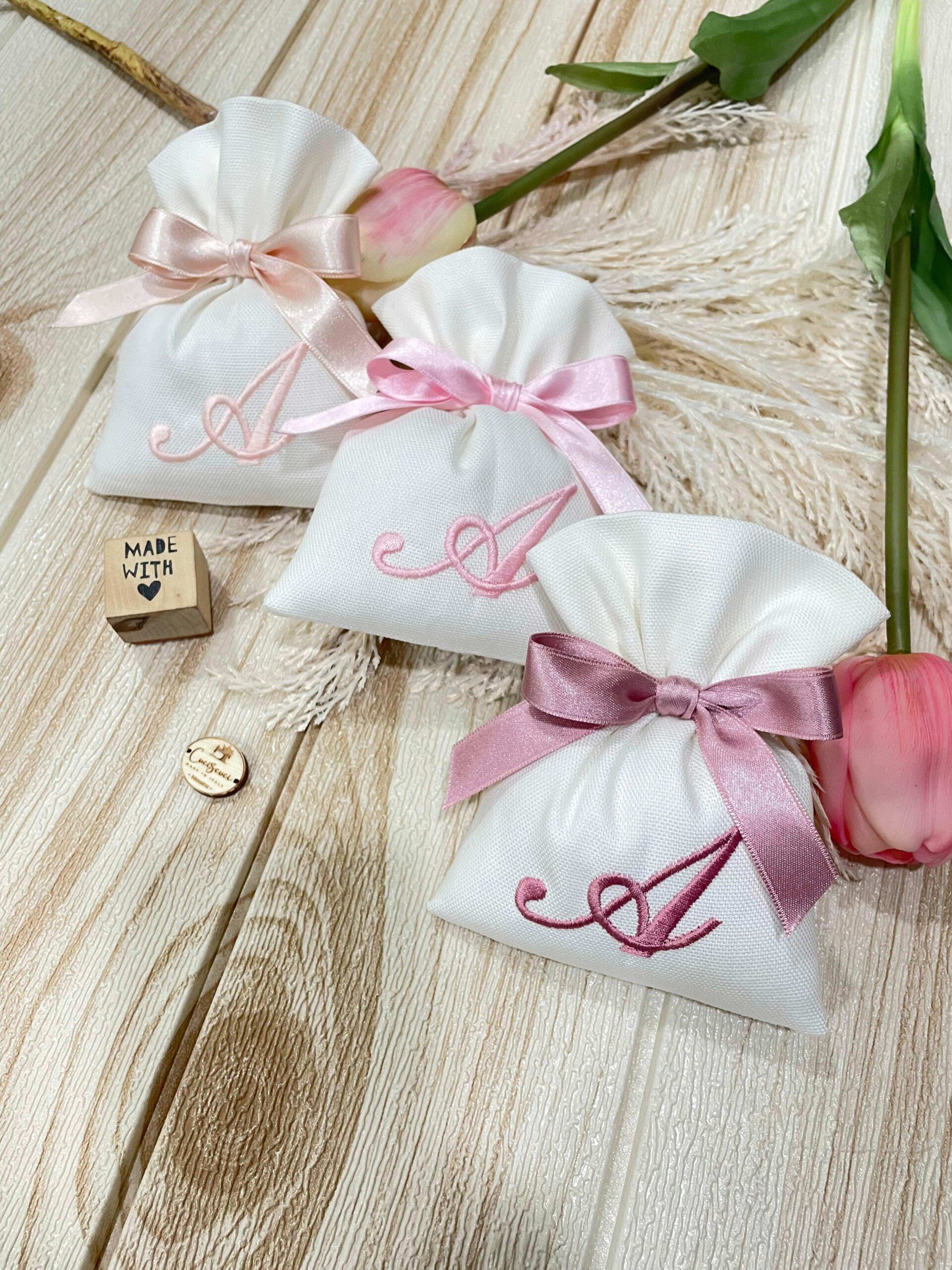 La bomboniera, pronta da donare ai tuoi ospiti, comprende il sacchetto con ricamo, confezionato con imbottitura in ovatta, fiocco abbinato e 5 confetti in busta sigillata.