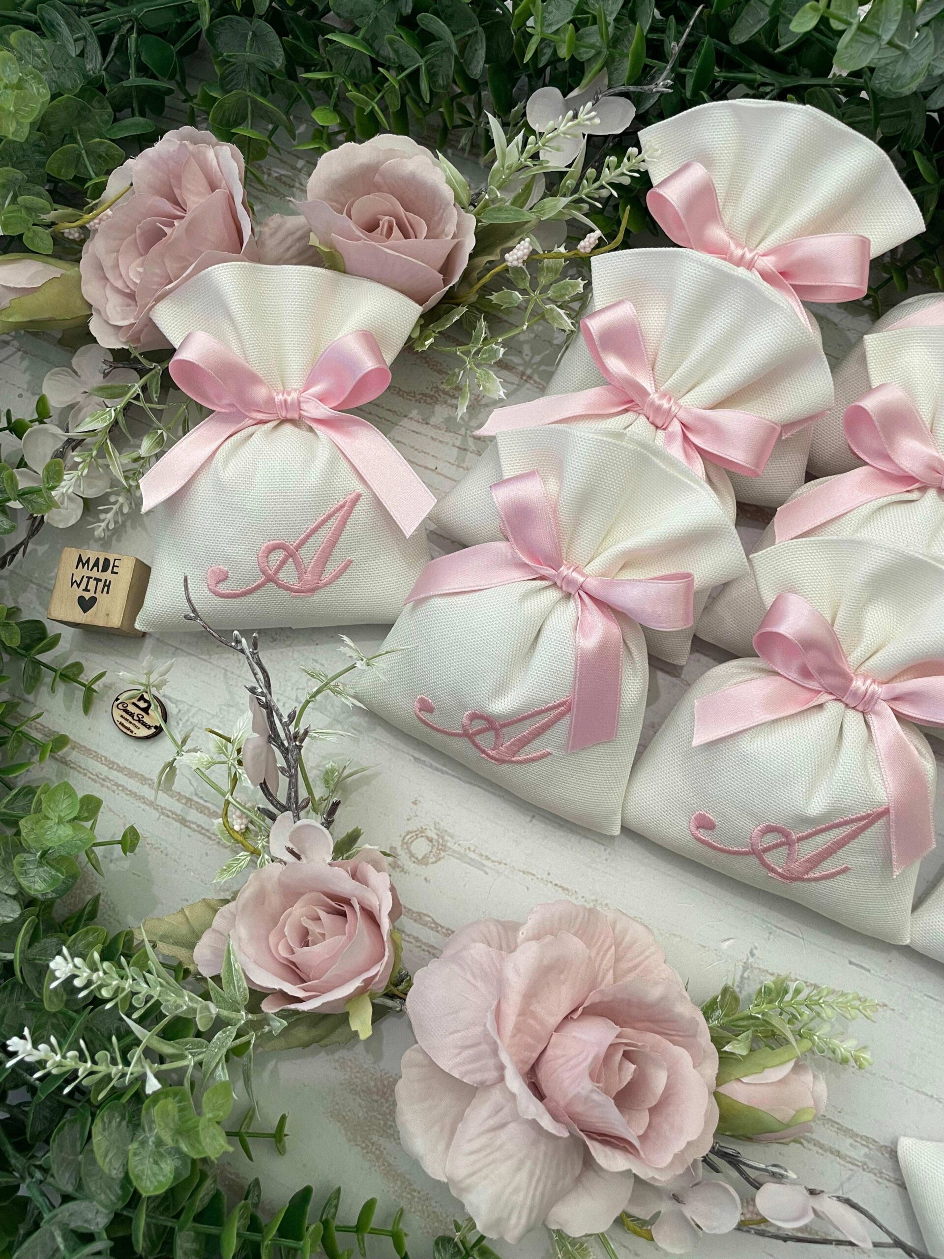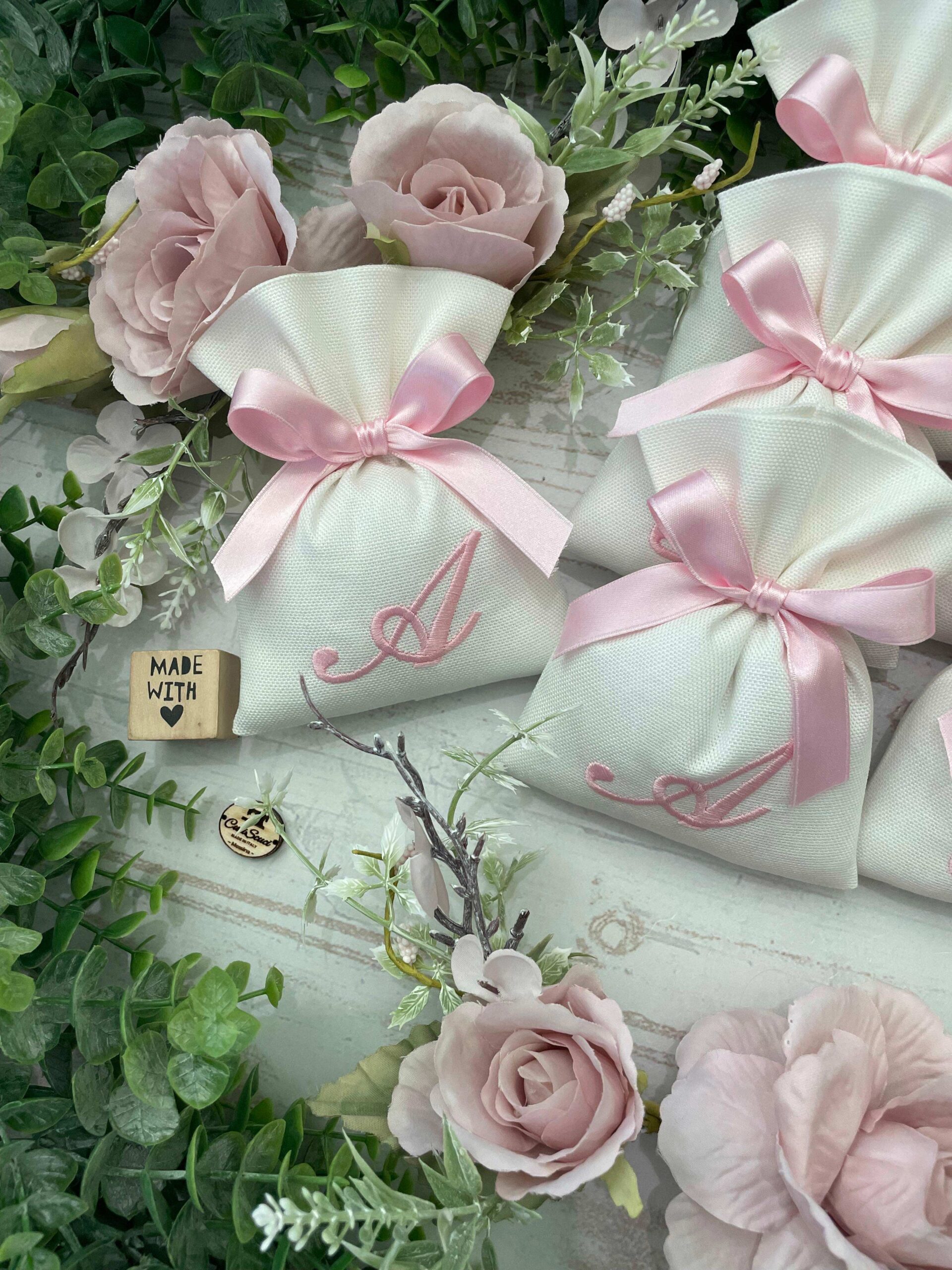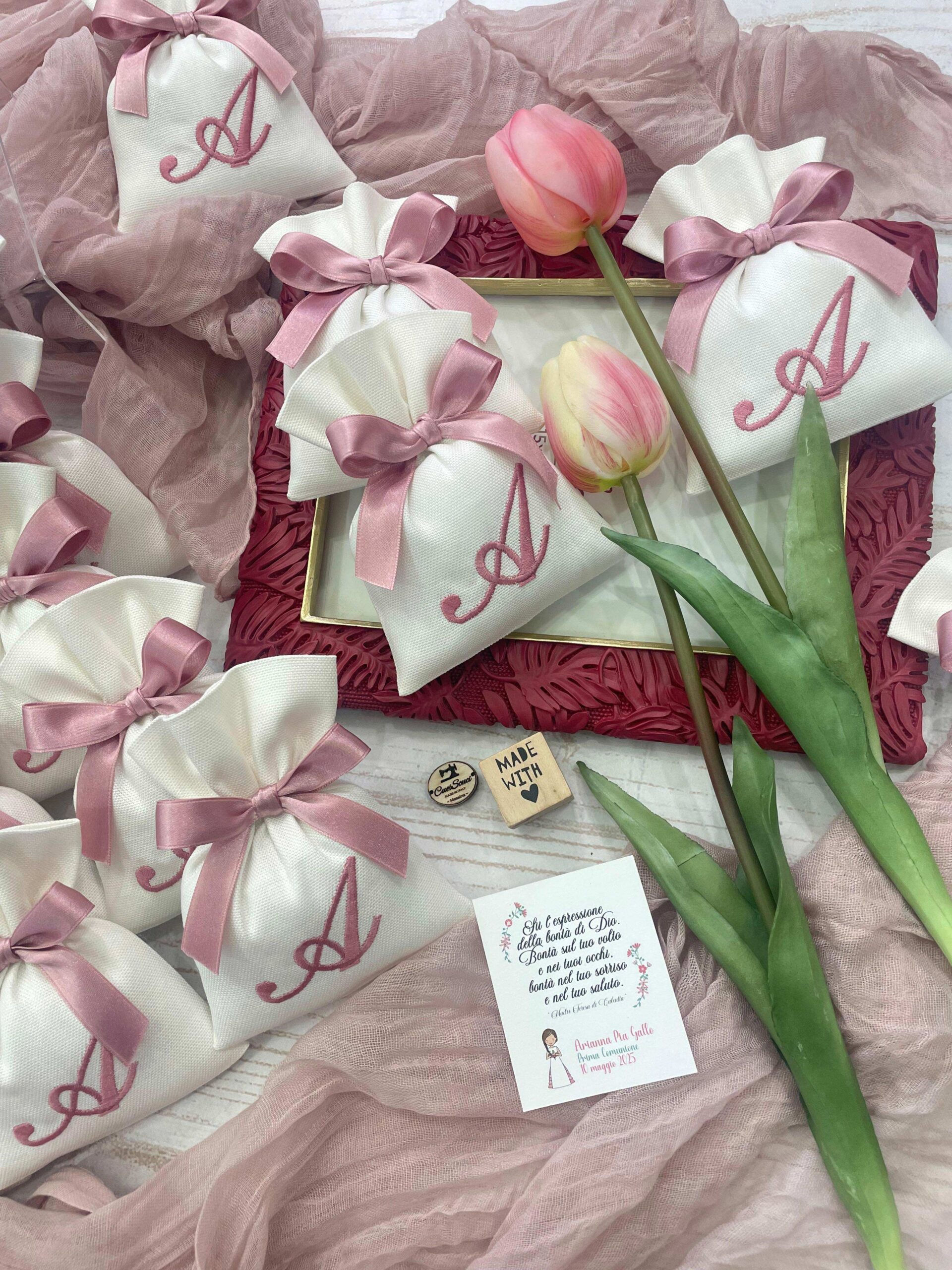 La bomboniera, pronta da donare ai tuoi ospiti, comprende il sacchetto con ricamo, confezionato con imbottitura in ovatta, fiocco abbinato e 5 confetti in busta sigillata.
