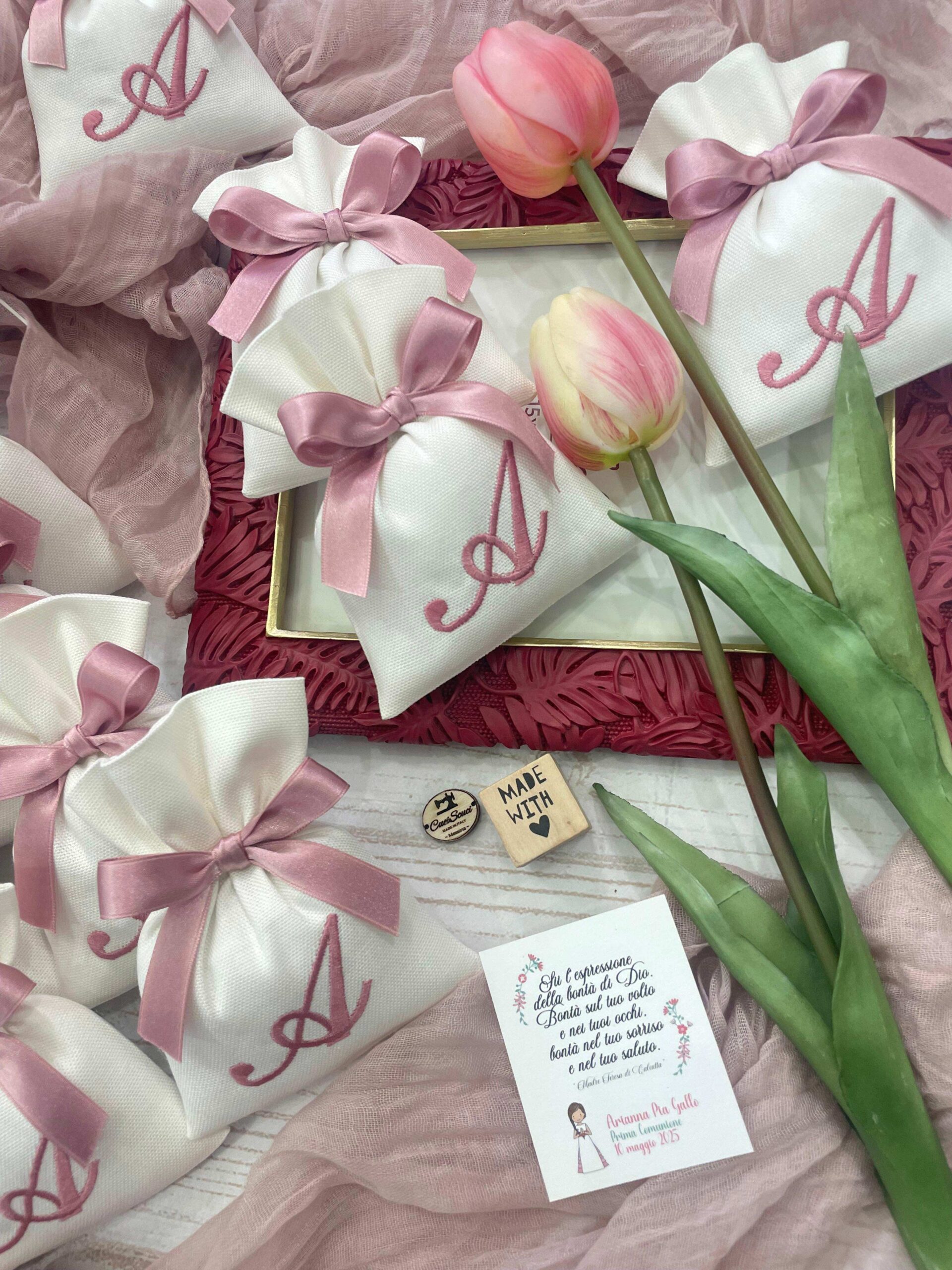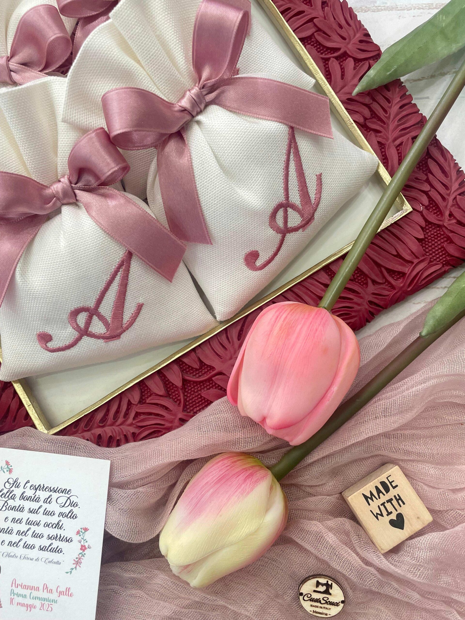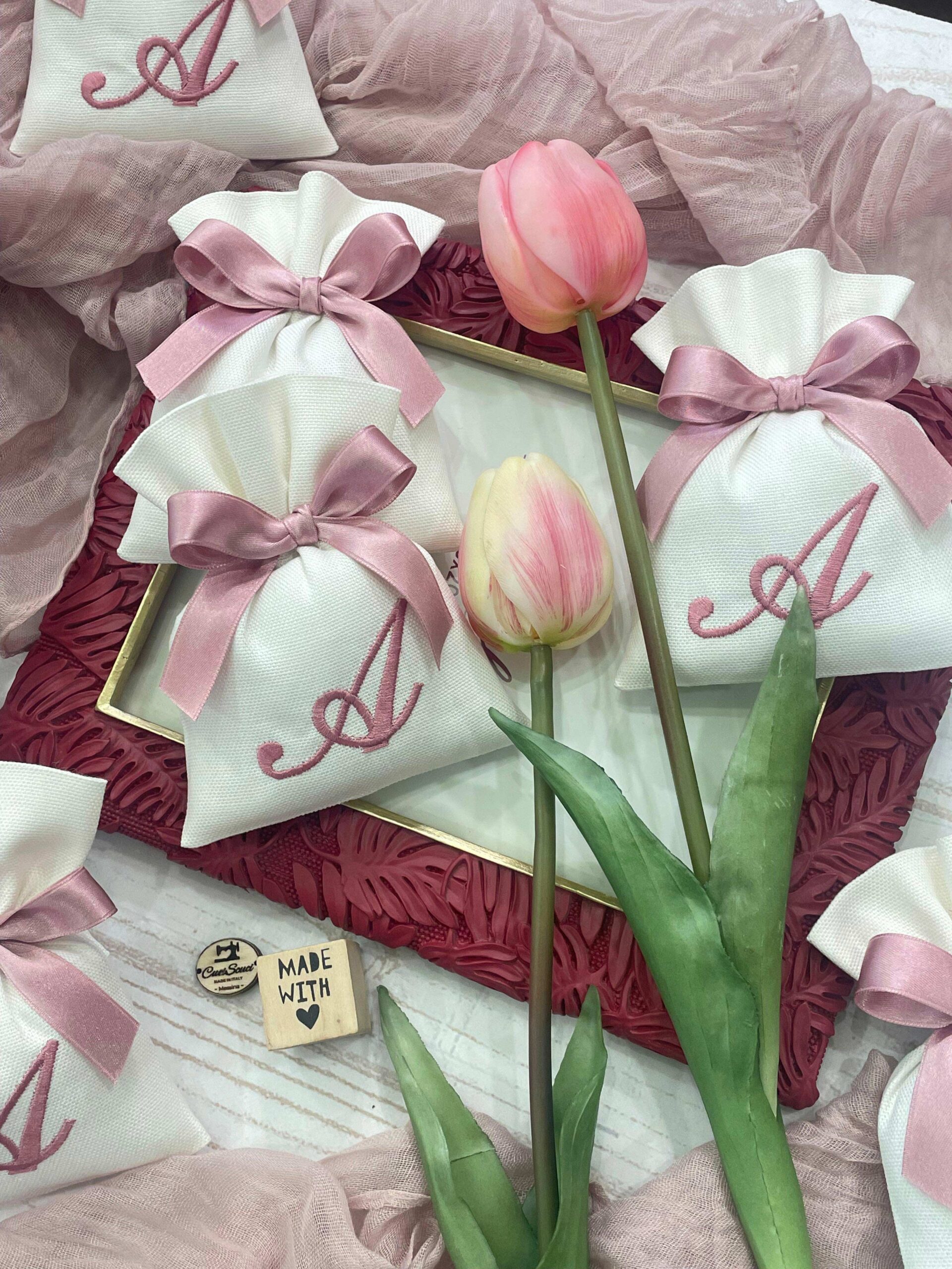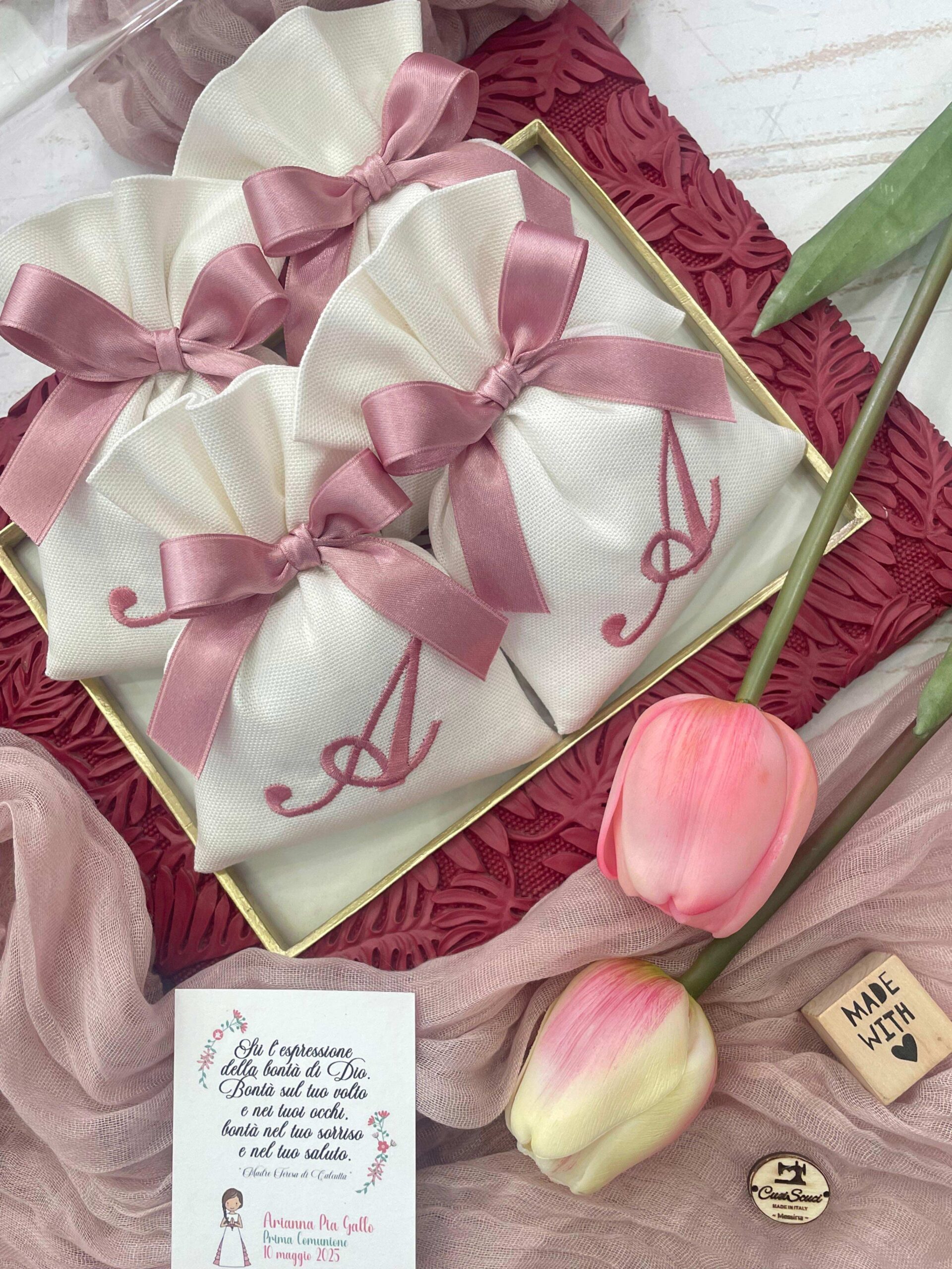 La bomboniera, pronta da donare ai tuoi ospiti, comprende il sacchetto con ricamo, confezionato con imbottitura in ovatta, fiocco abbinato e 5 confetti in busta sigillata.