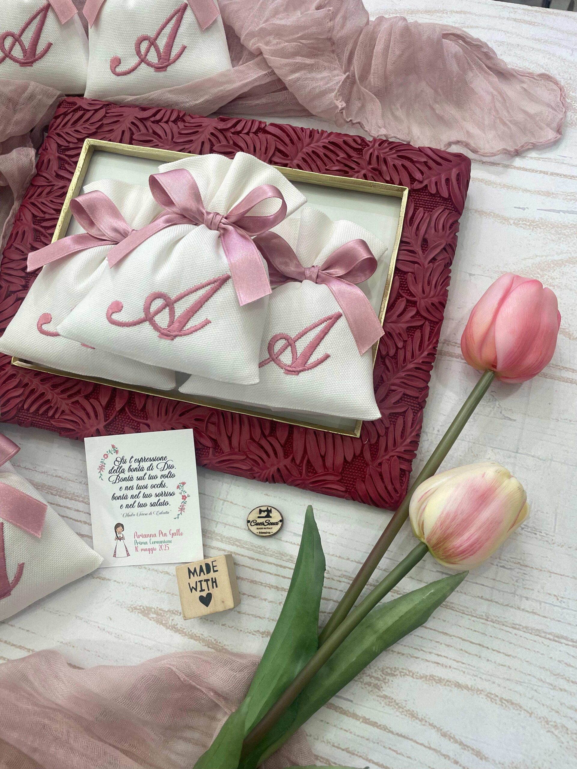 Realizzato con tela di cotone color seta con il ricamo di un’iniziale di colore rosa o fucsia (personalizzabile).