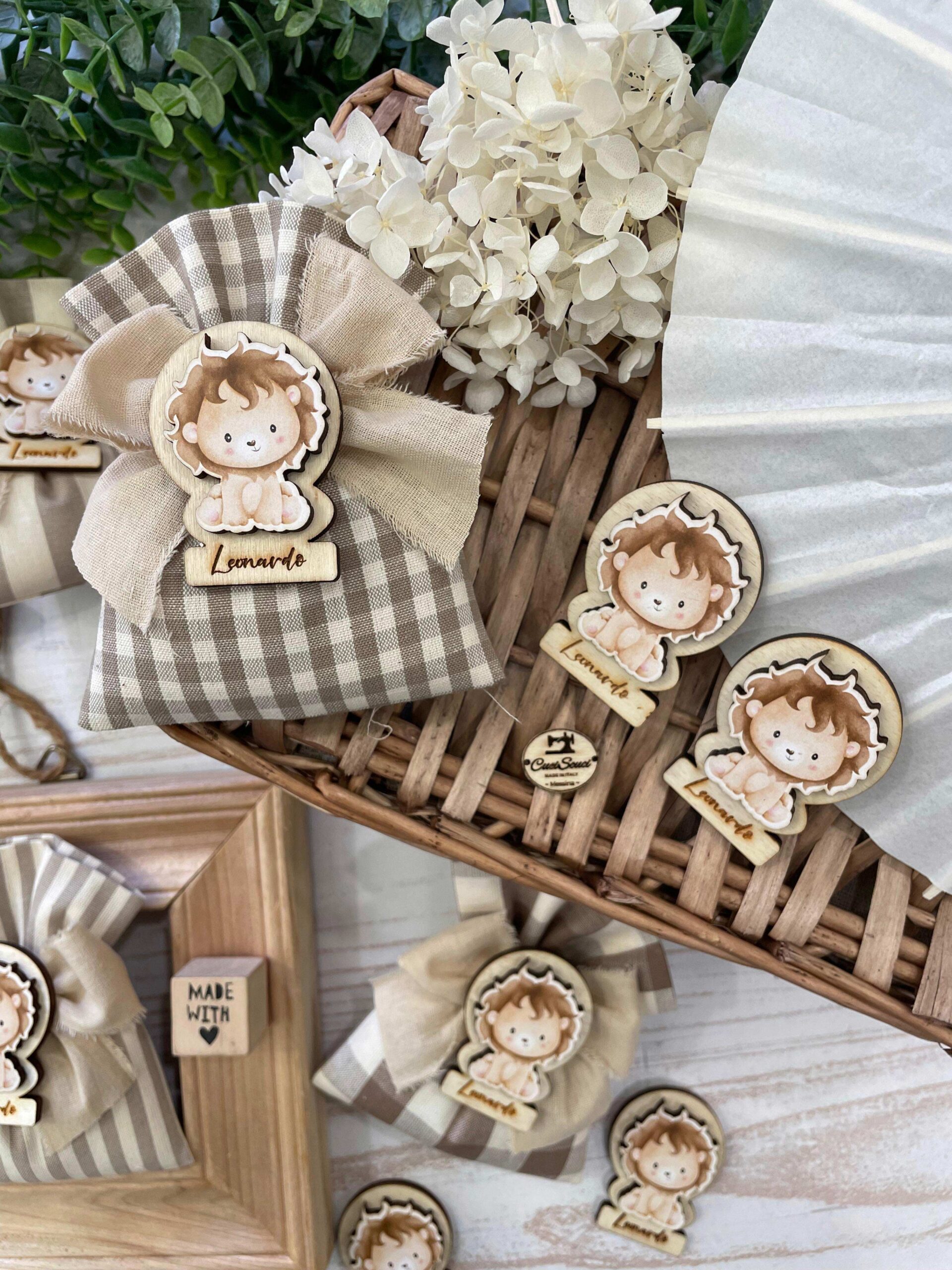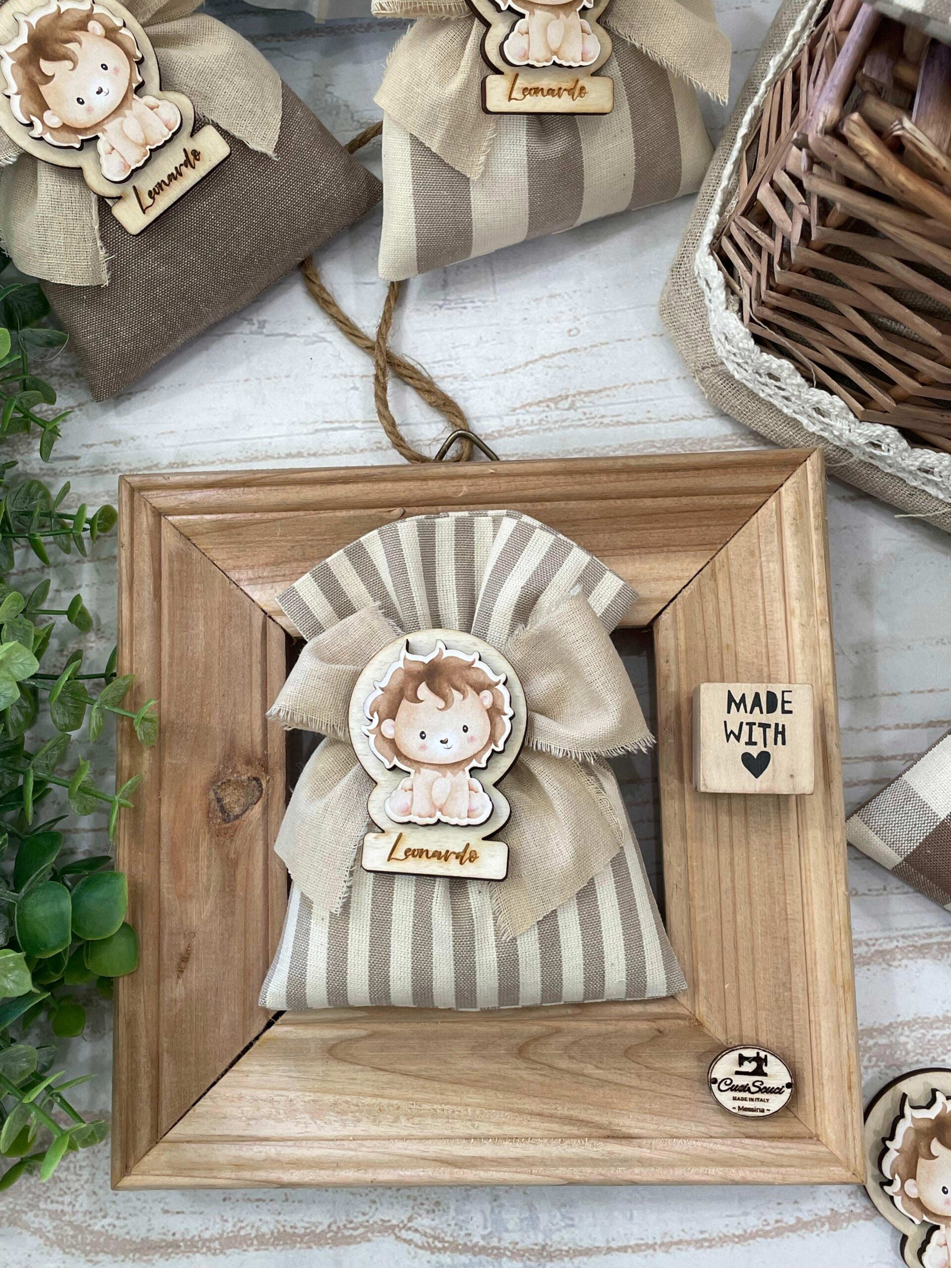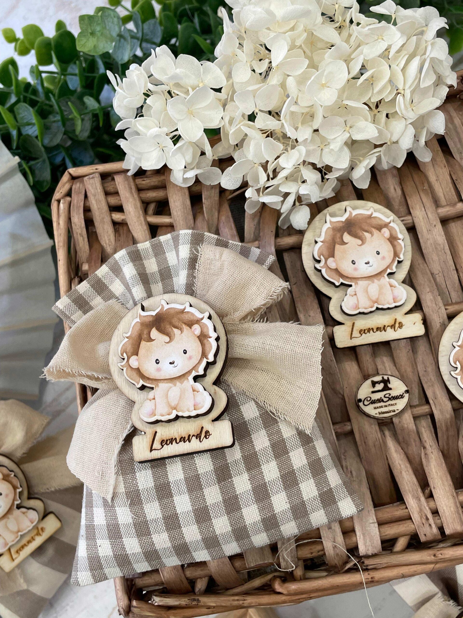 Realizzato in cotone tinto filo, colore e fantasia a scelta (consultando l’apposita foto dei tessuti in galleria) con l’applicazione di una calamita in legno con leoncino e nome inciso.