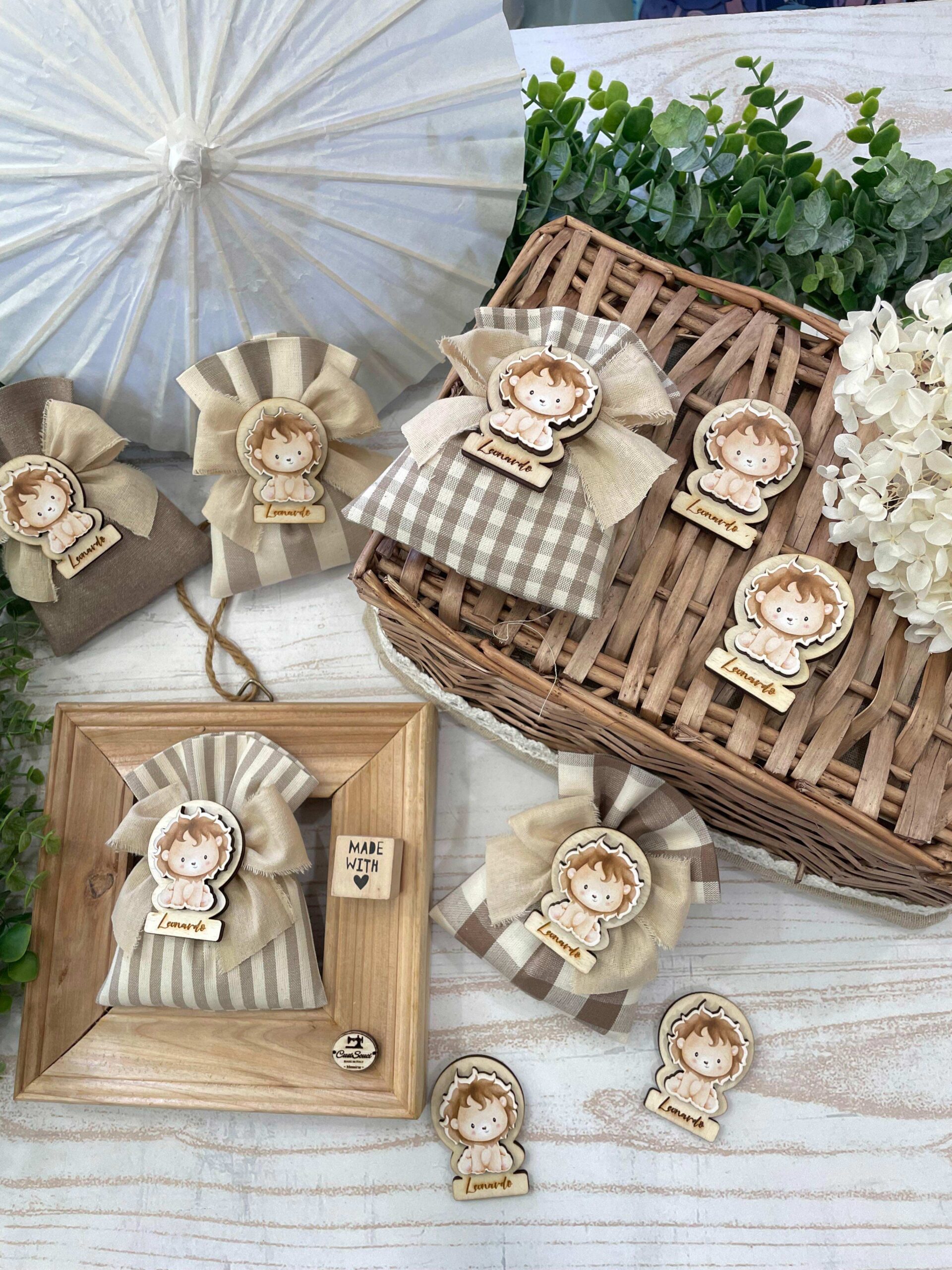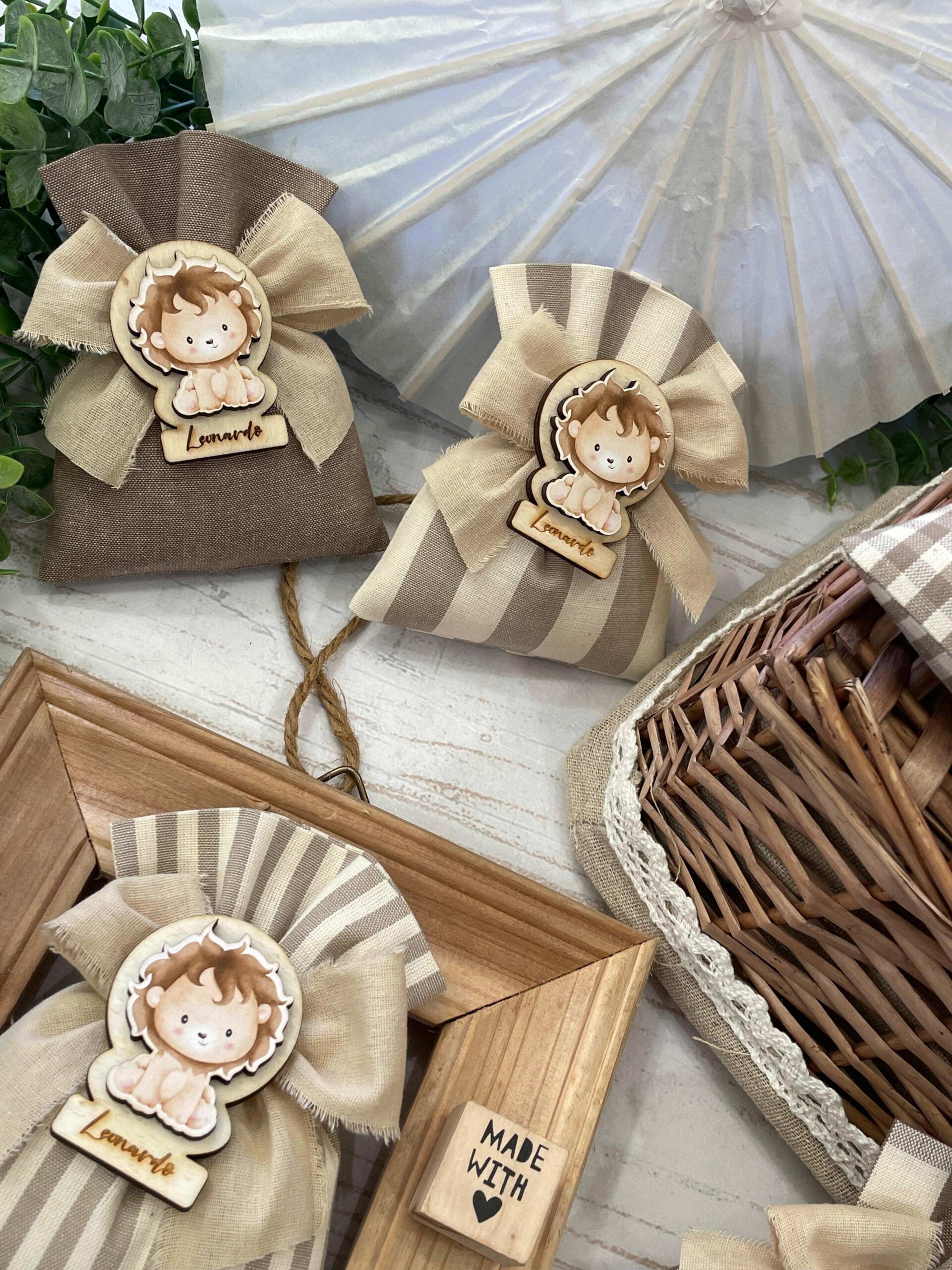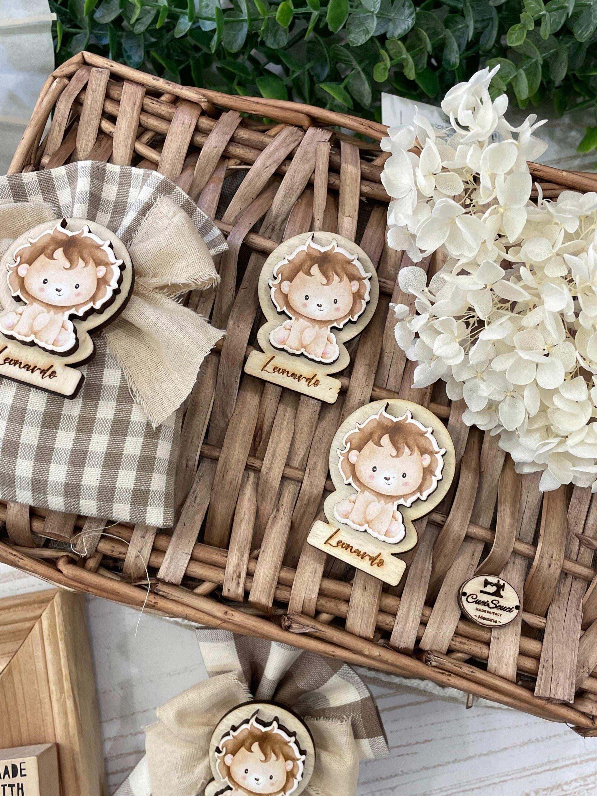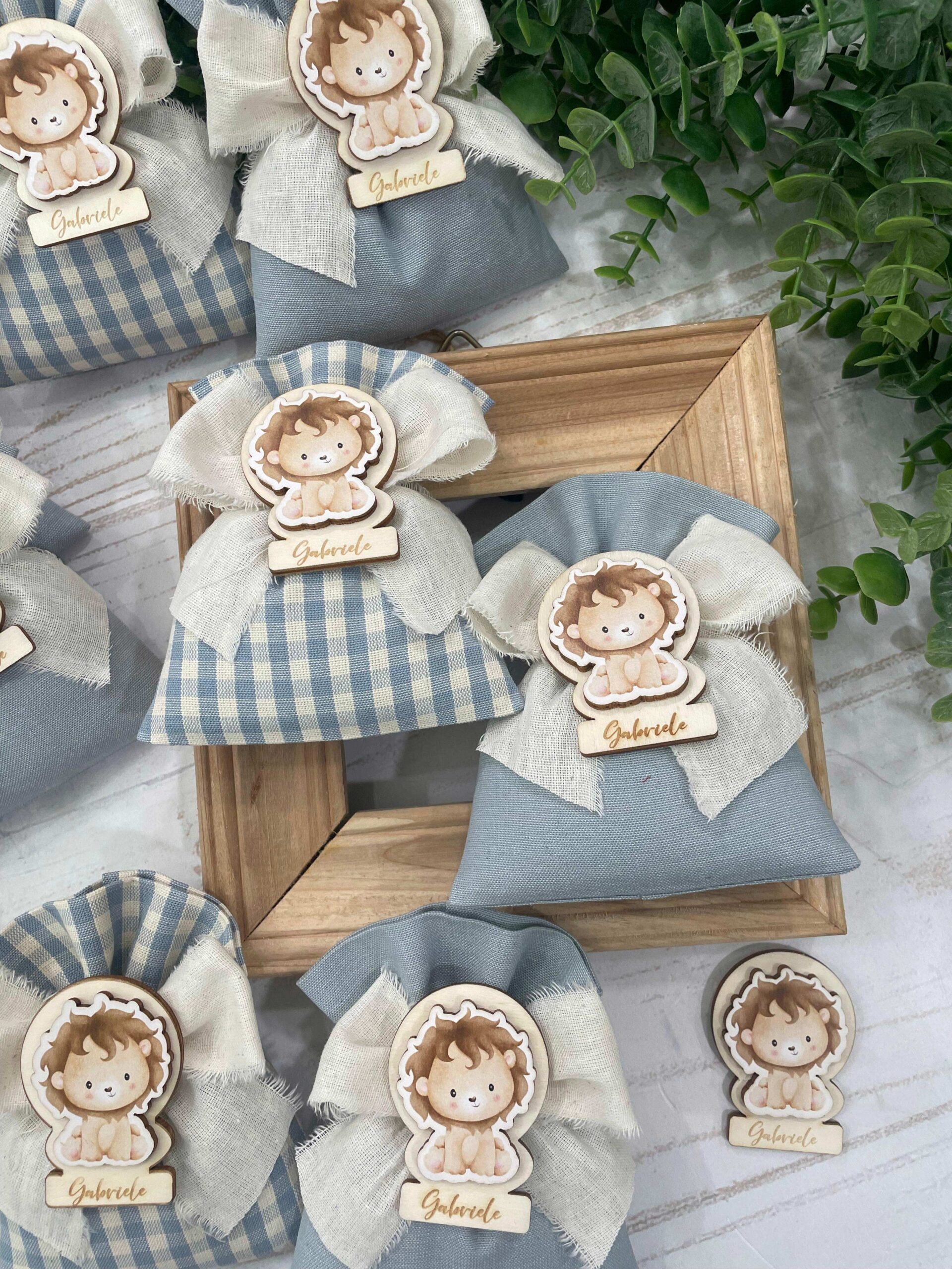 Realizzato in cotone tinto filo, colore e fantasia a scelta (consultando l’apposita foto dei tessuti in galleria) con l’applicazione di una calamita in legno con leoncino e nome inciso.