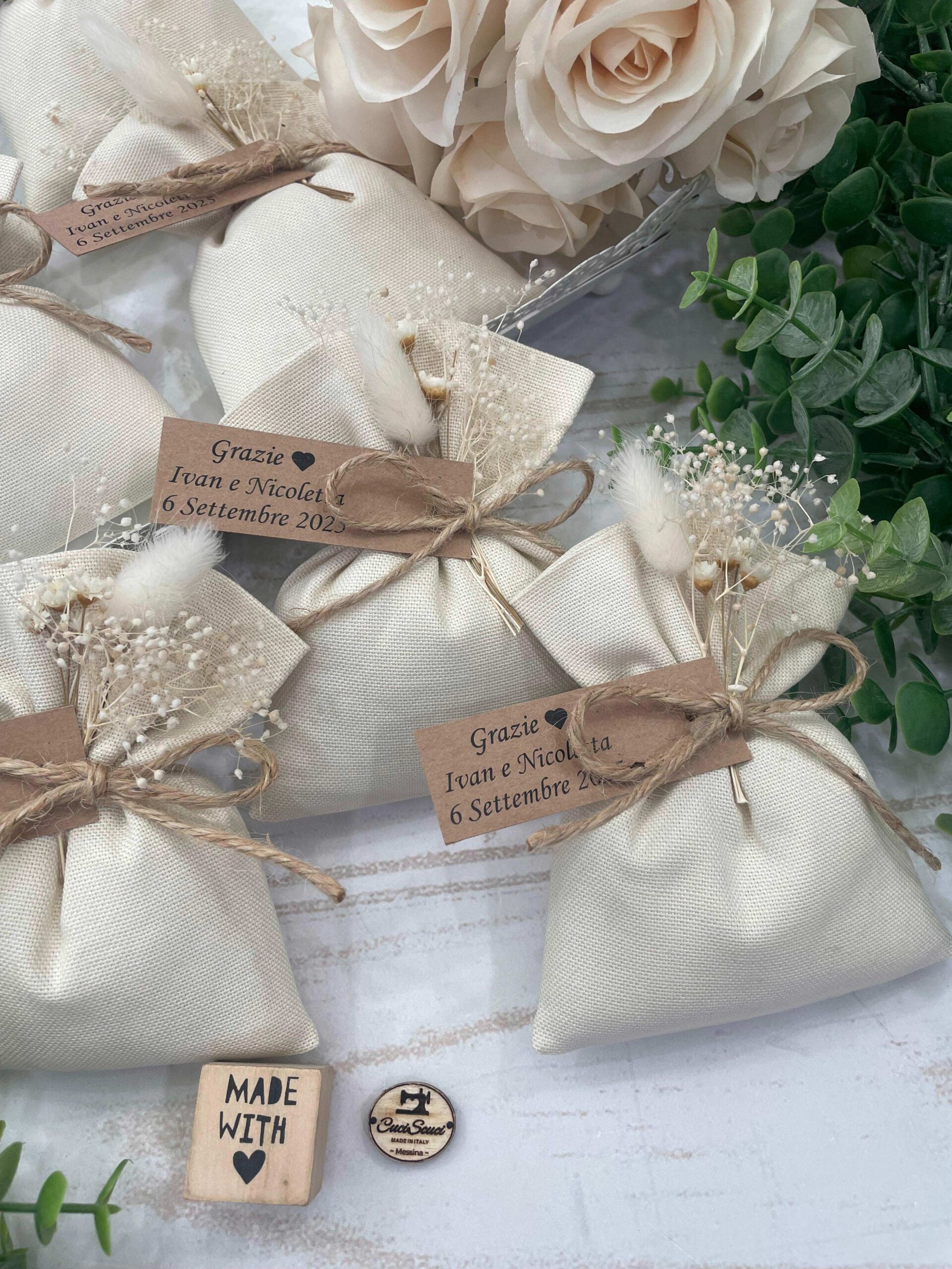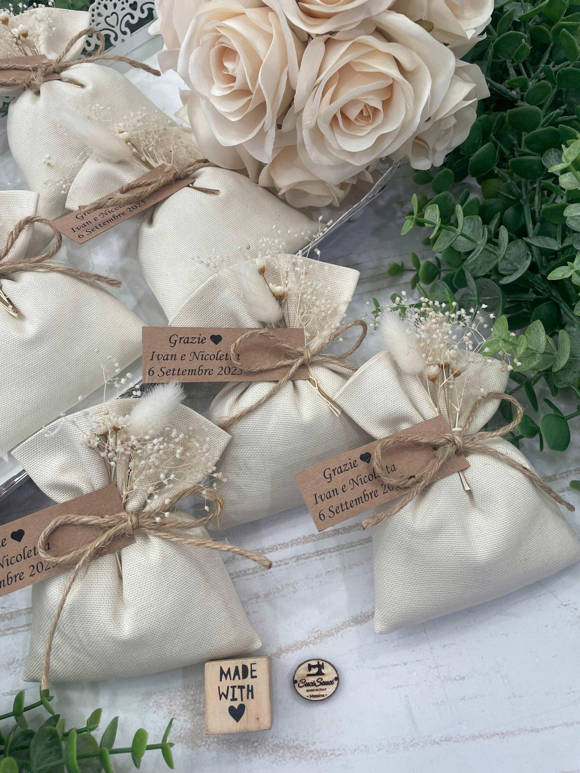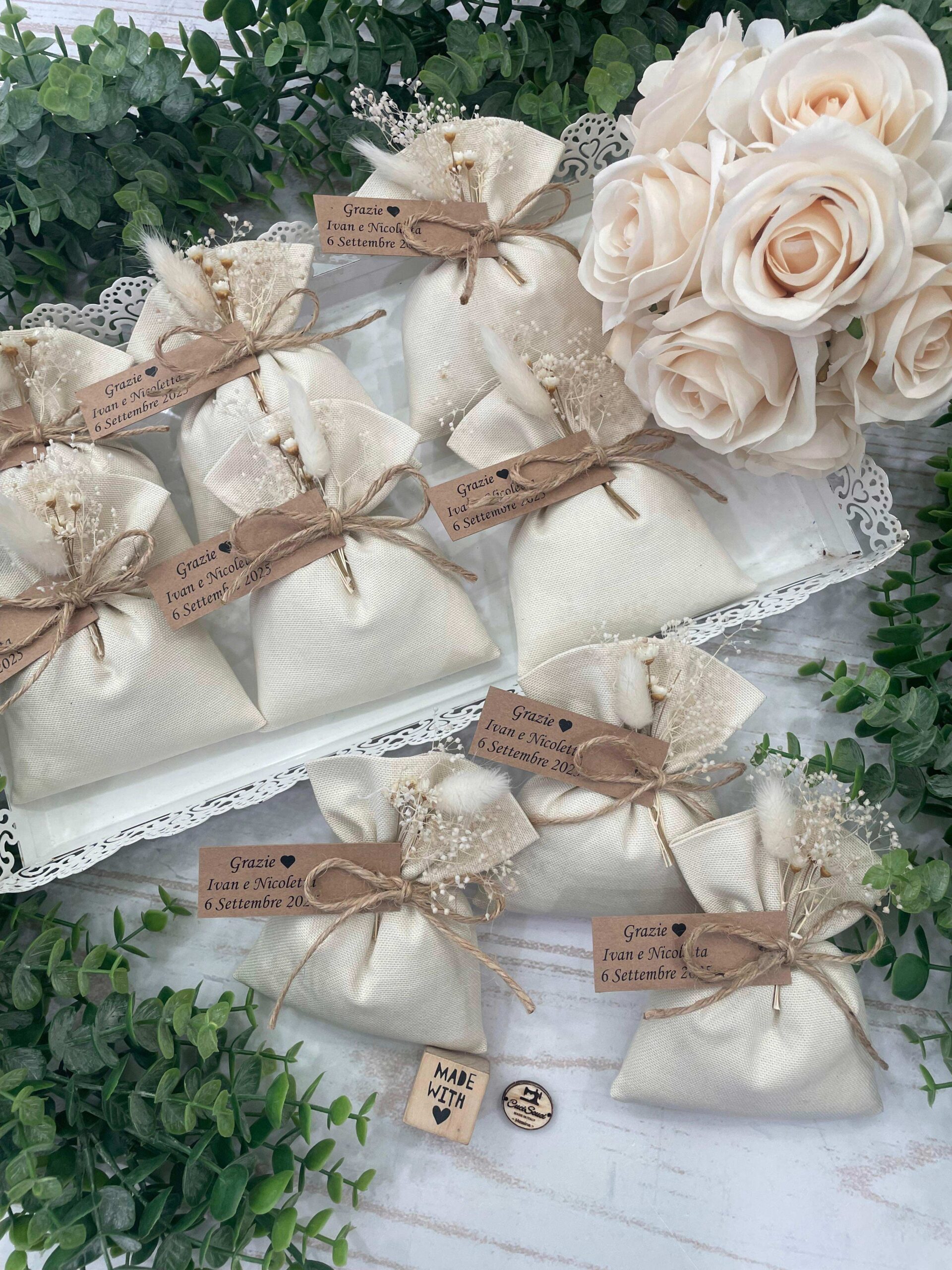La bomboniera, pronta da donare ai tuoi ospiti, comprende il sacchetto, confezionato con imbottitura in ovatta, fiocco abbinato, 5 confetti in busta sigillata, applicazione fiori secchi, con o senza tag.