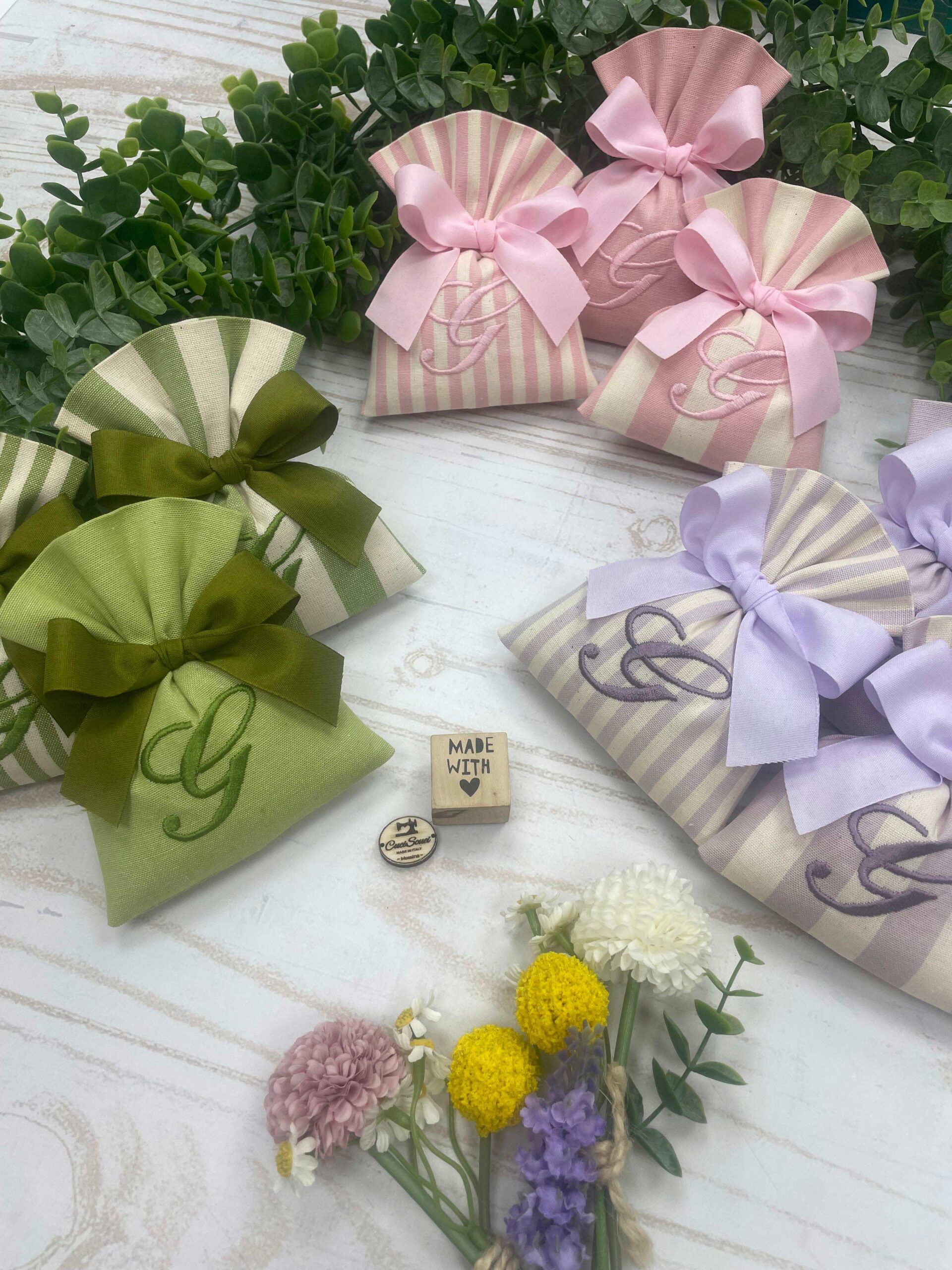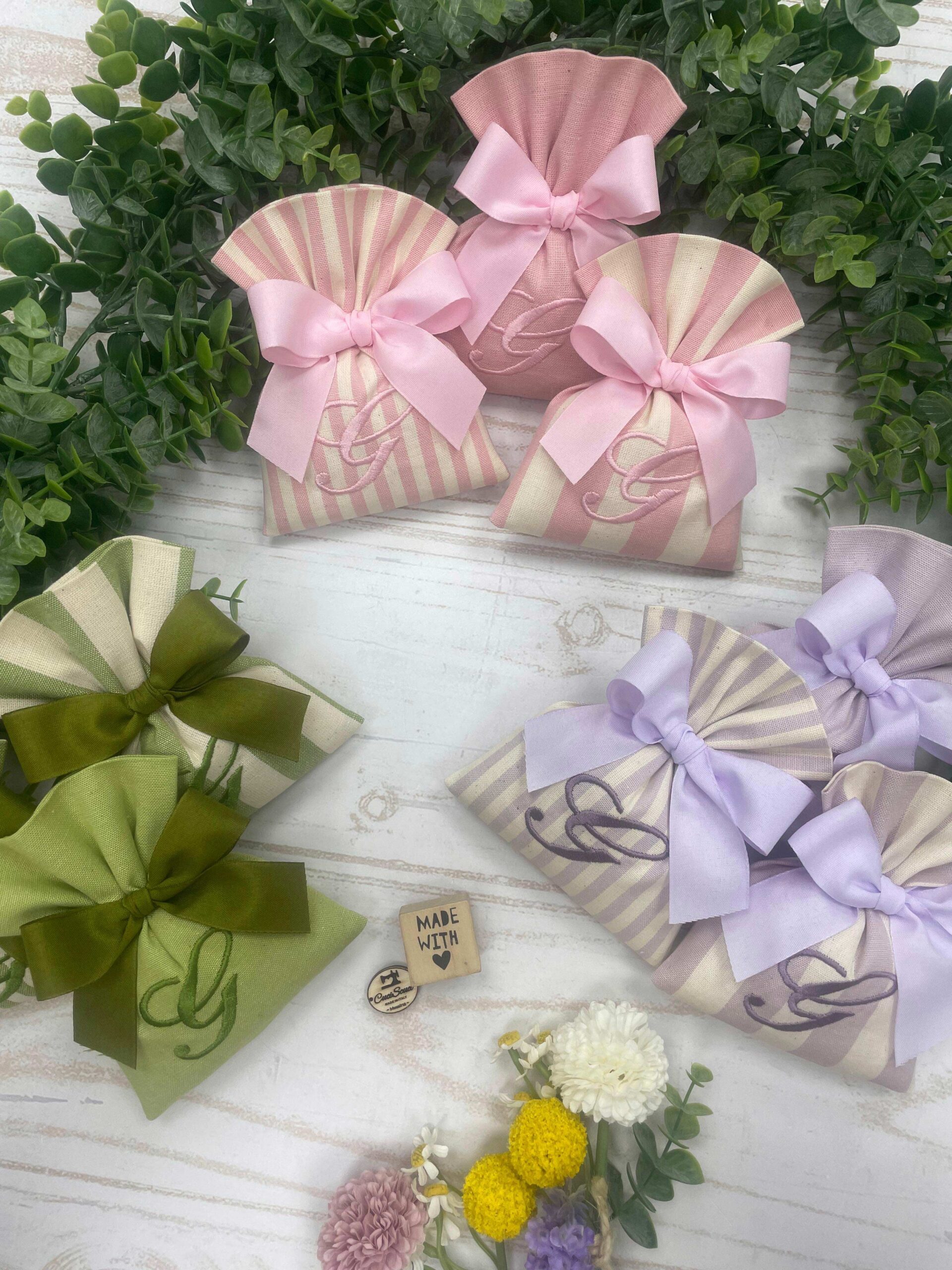 Realizzato con cotone tinto filo in fantasie, assortite o a scelta, nei colori pastello rosa baby, provenza e verde kiwi, con il ricamo di un’iniziale.
