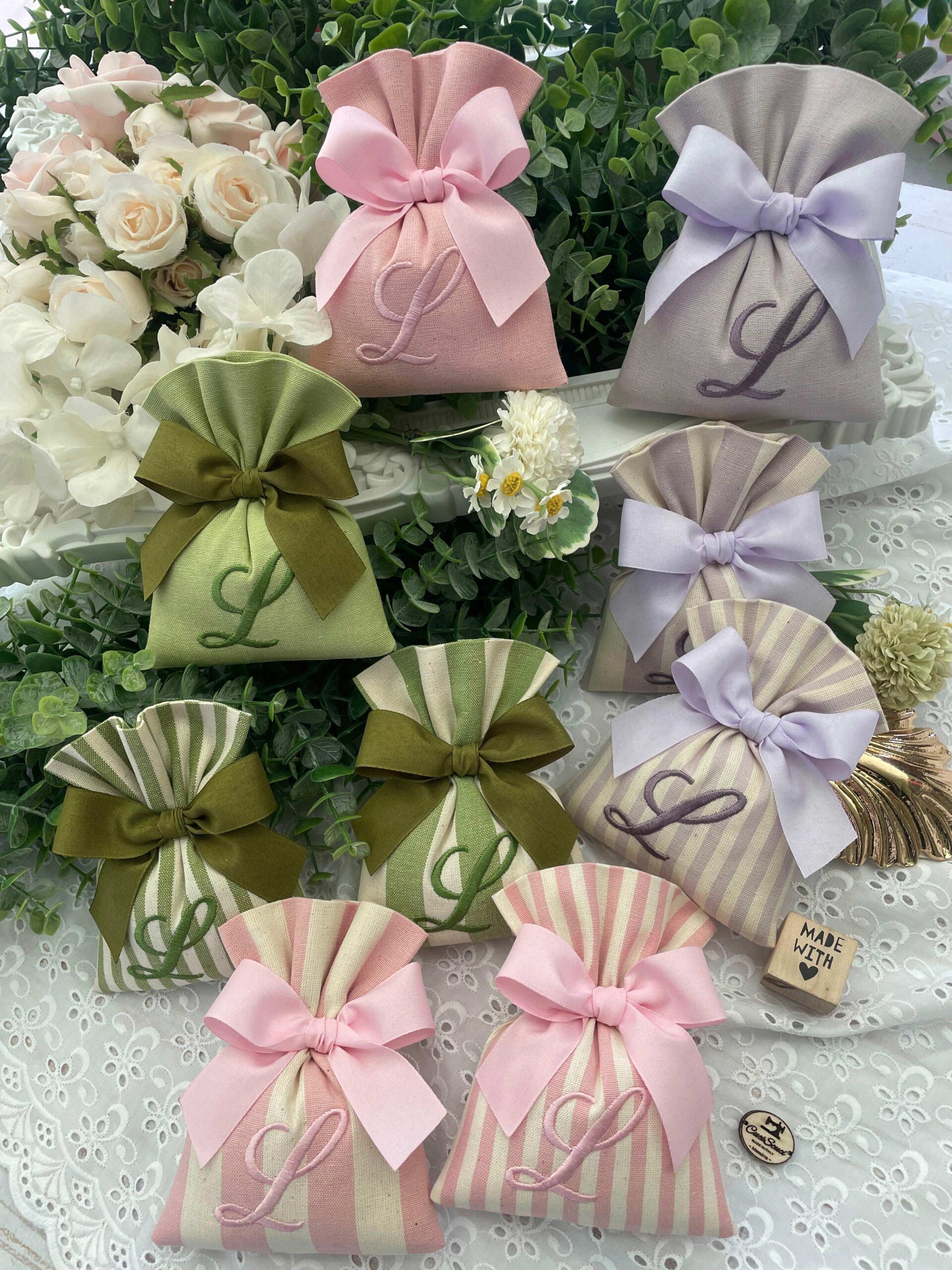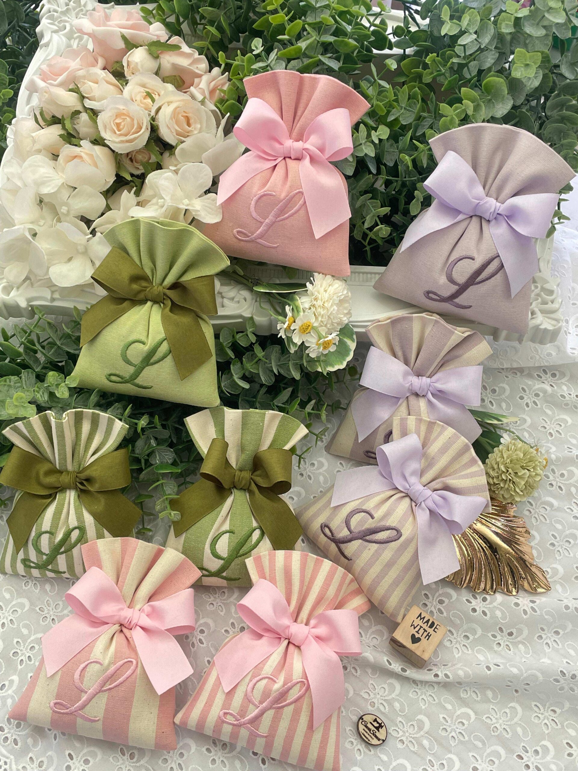 La bomboniera, pronta da donare ai tuoi ospiti, comprende il sacchetto con ricamo, confezionato con imbottitura in ovatta, fiocco abbinato e 5 confetti in busta sigillata.