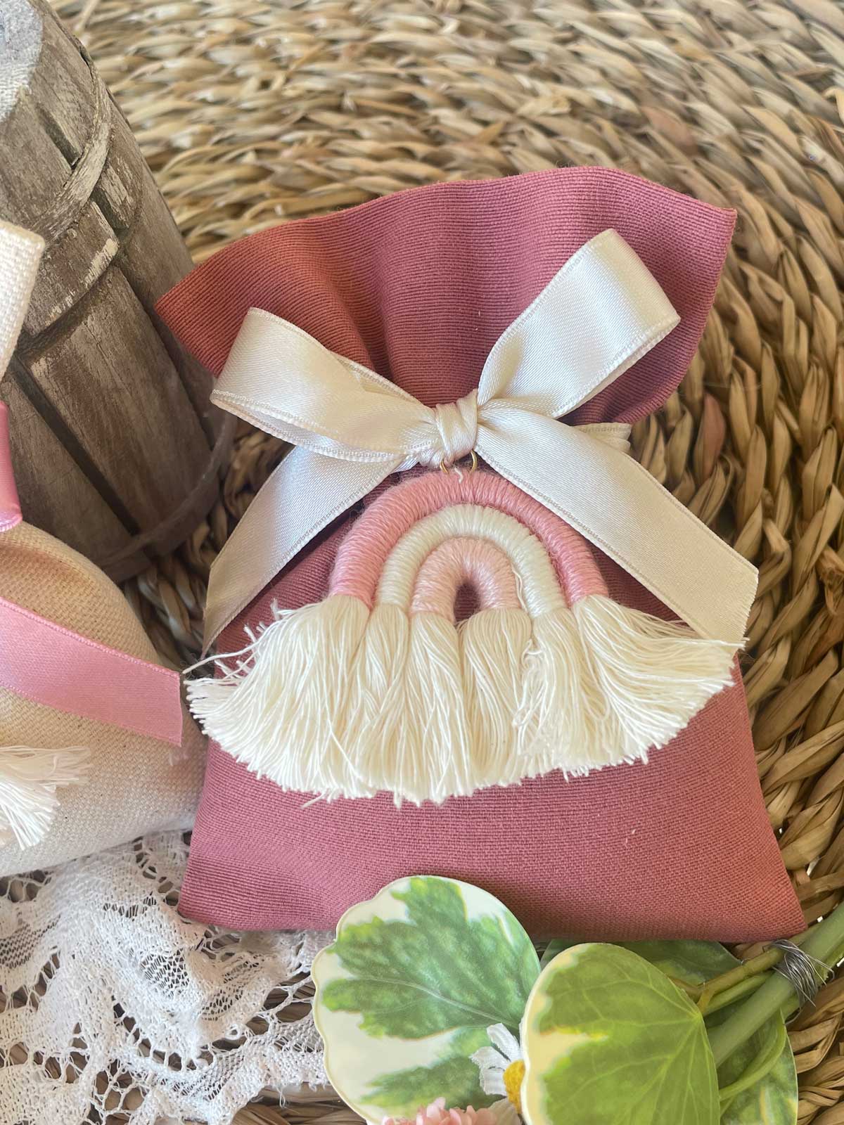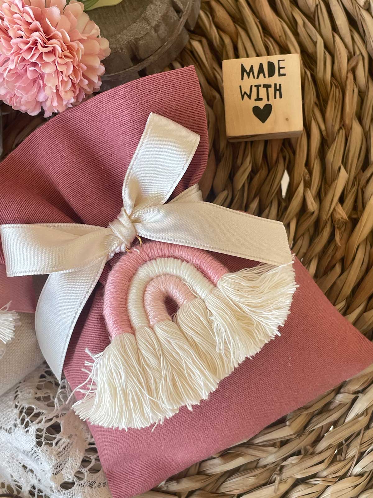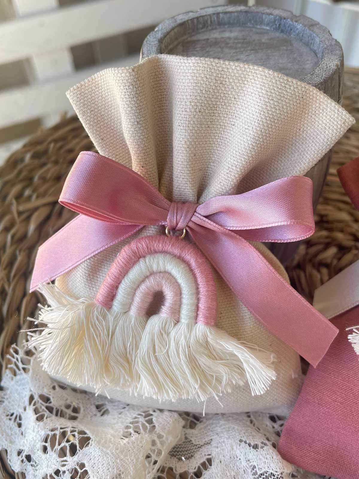 Sacchetto in cotone tinto filo, realizzato a mano dalla nostra sartoria, con l’applicazione di un arcobaleno rosa in tessuto. Art. 29929.