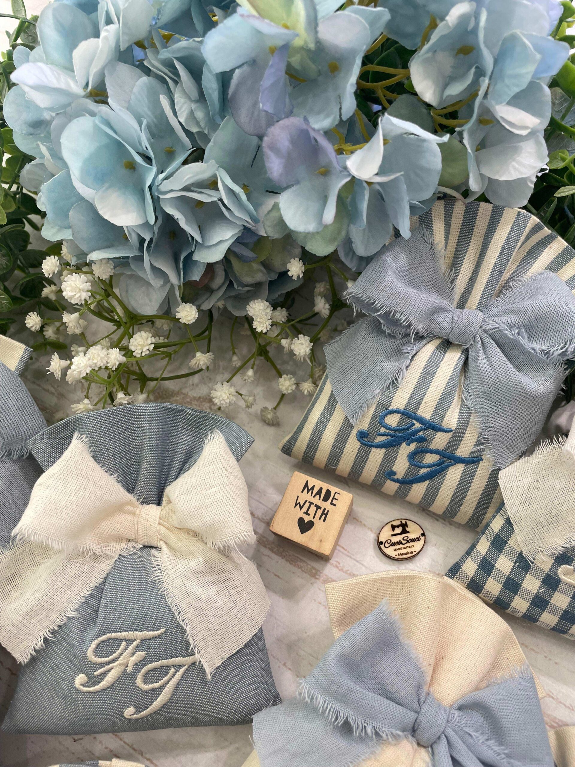 Realizzato con cotone tinto filo, nei toni dell’azzurro polvere e del panna, con il ricamo di due iniziali.