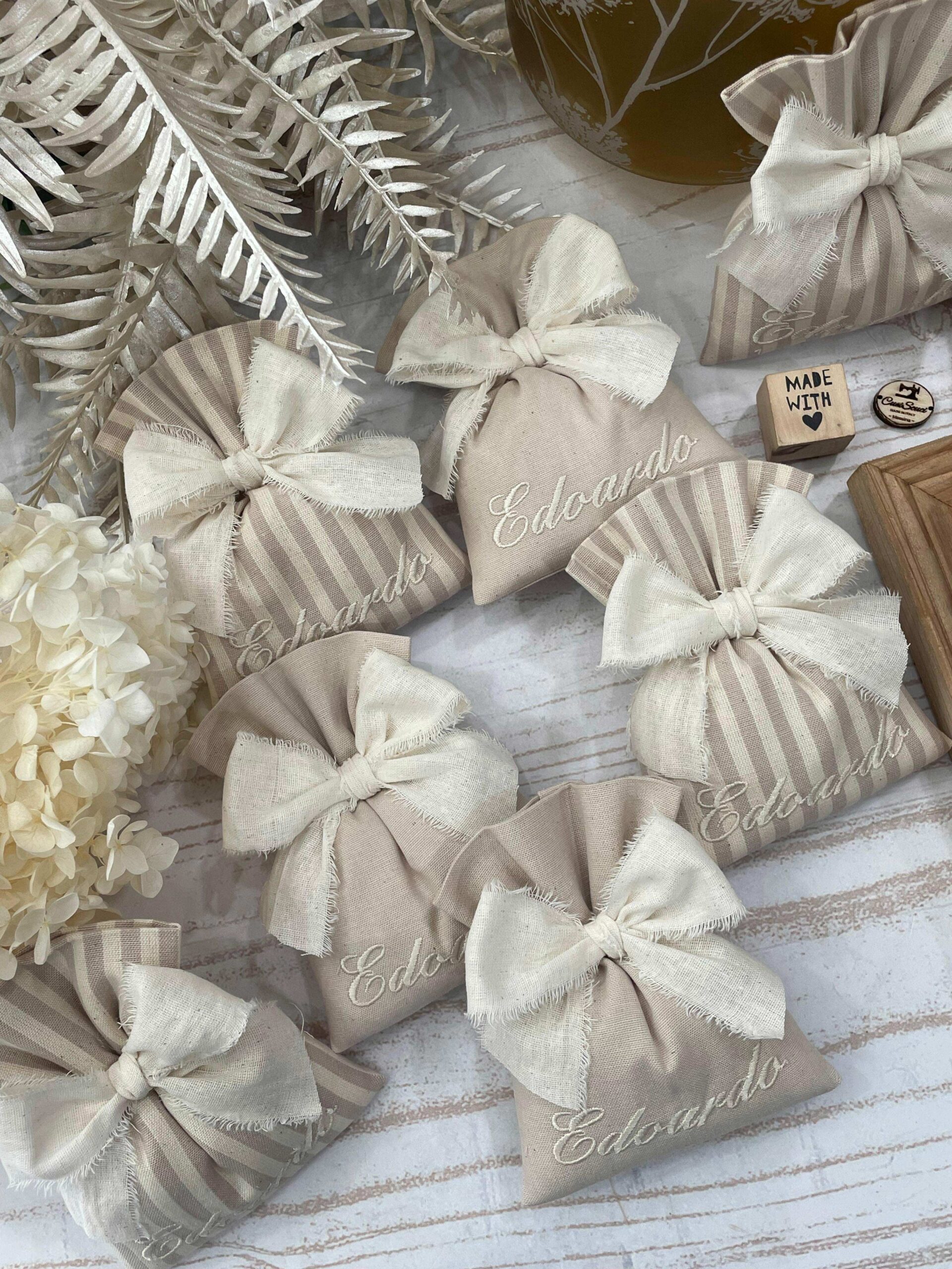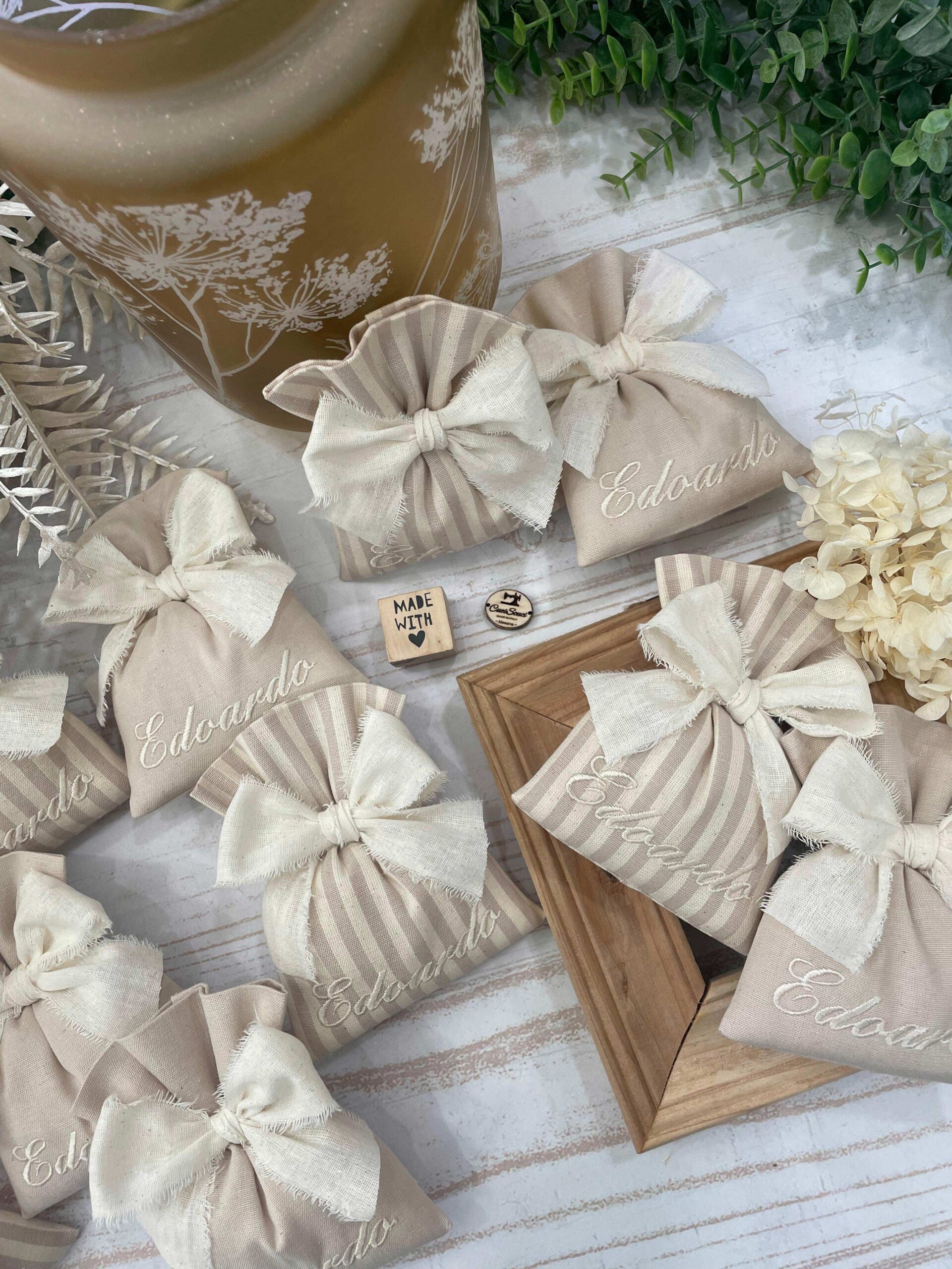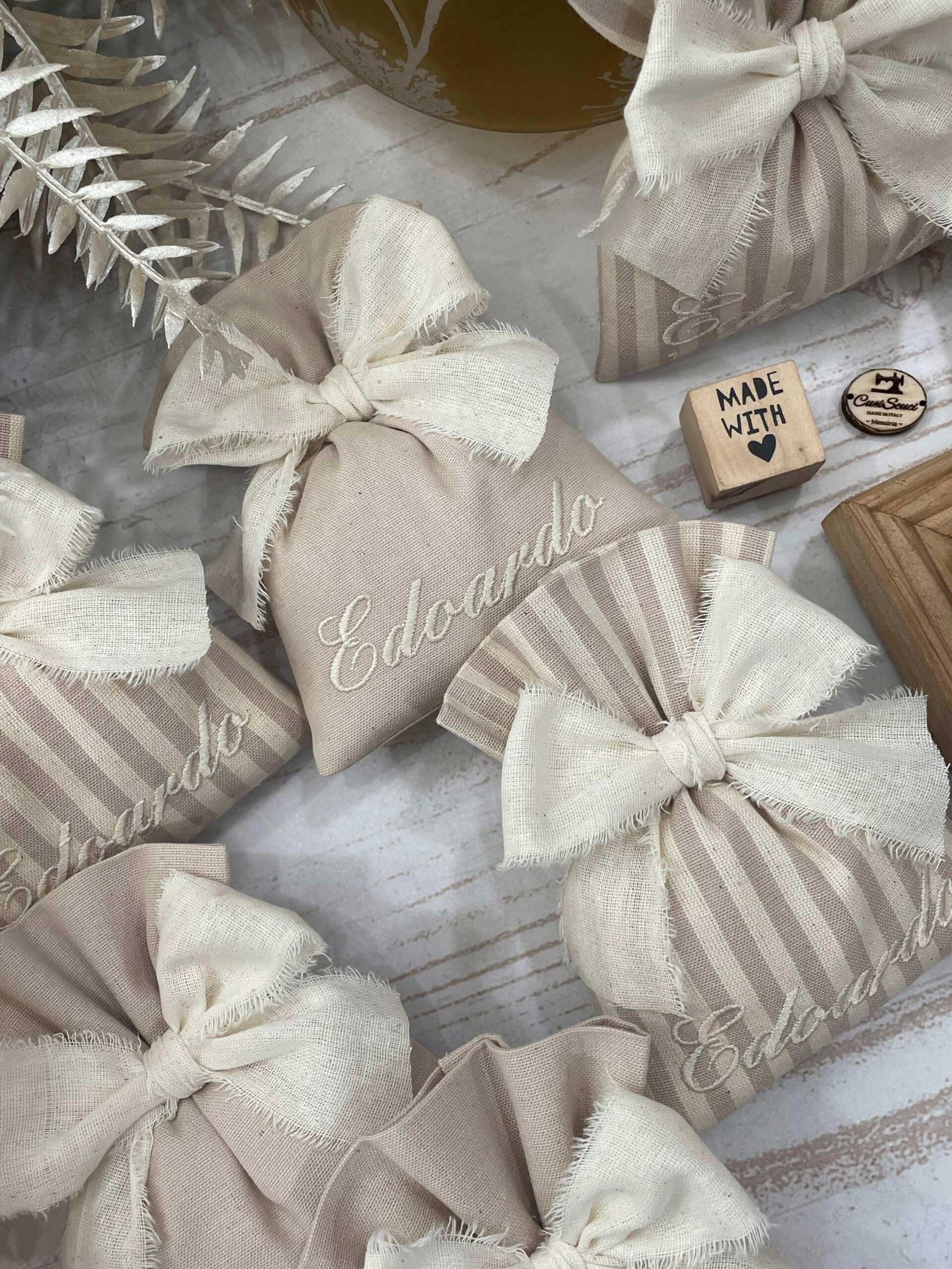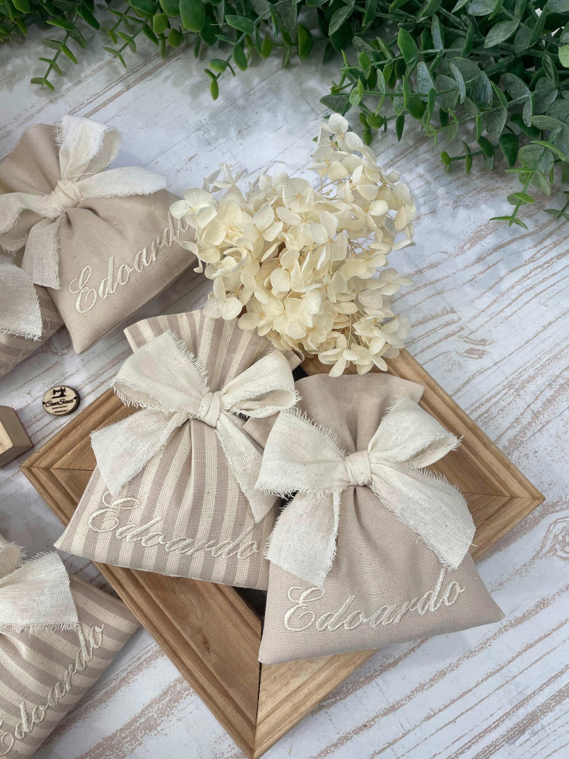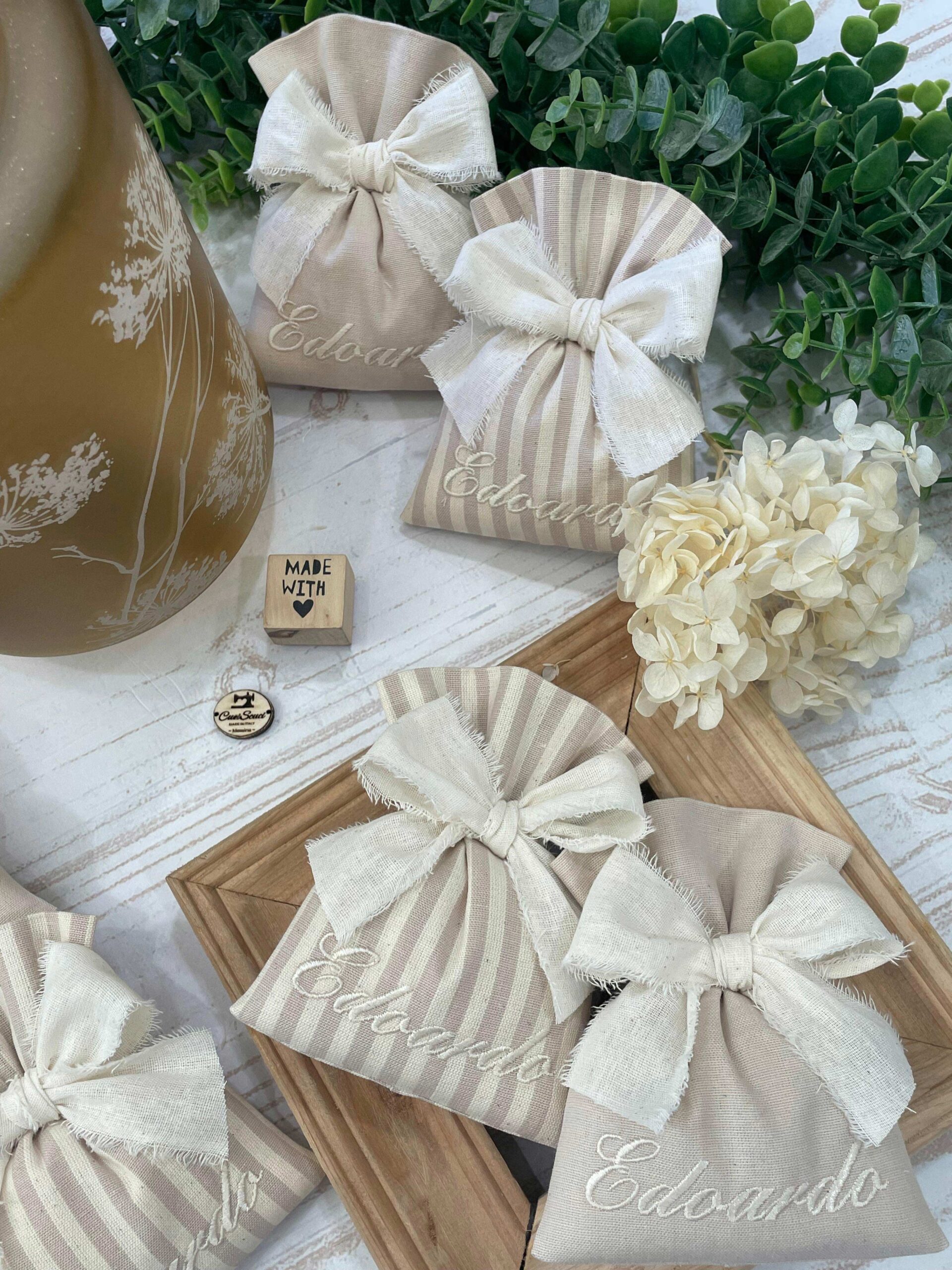 La bomboniera, pronta da donare ai tuoi ospiti, comprende il sacchetto con ricamo, confezionato con imbottitura in ovatta, fiocco abbinato e 5 confetti in busta sigillata.