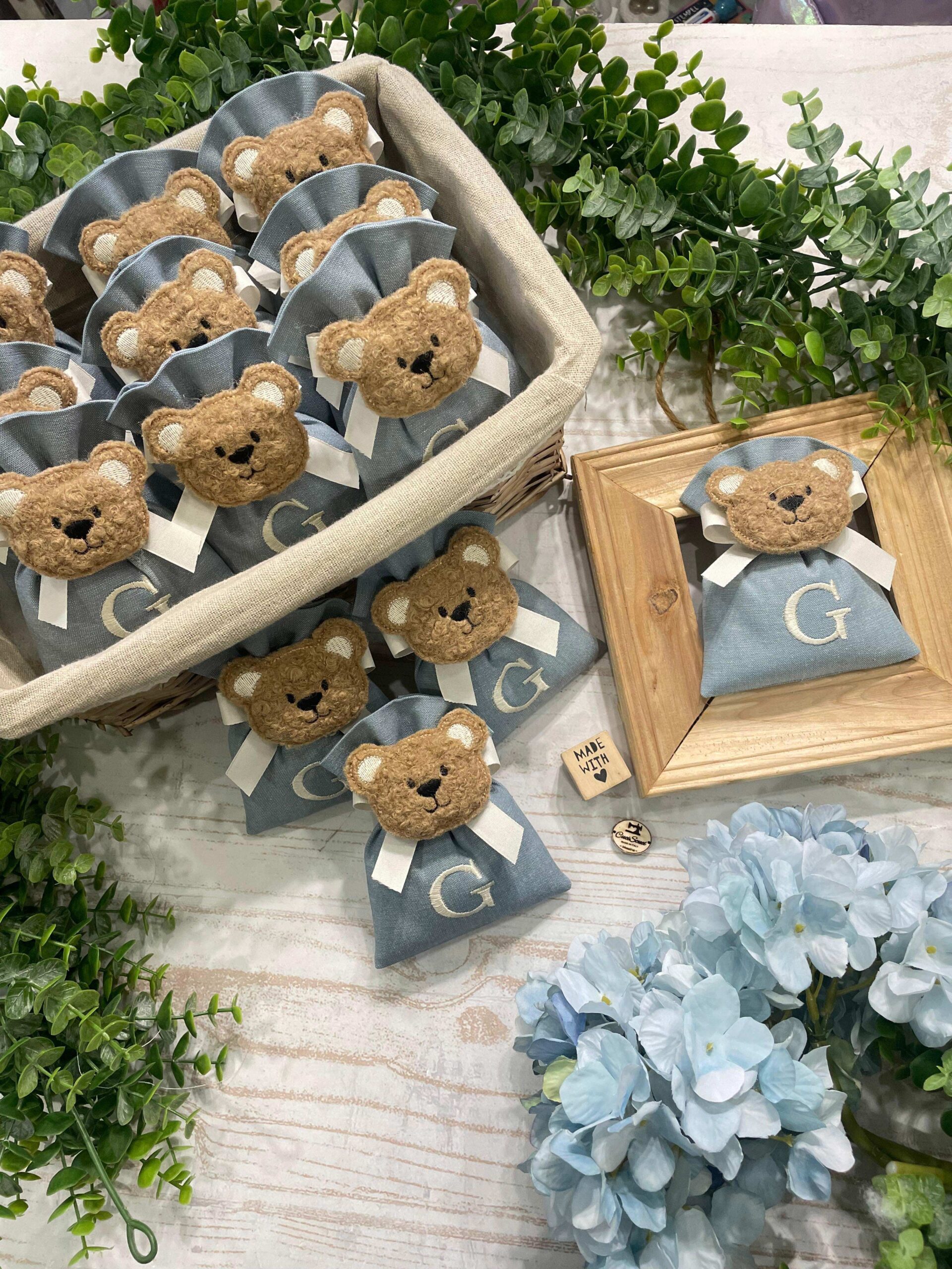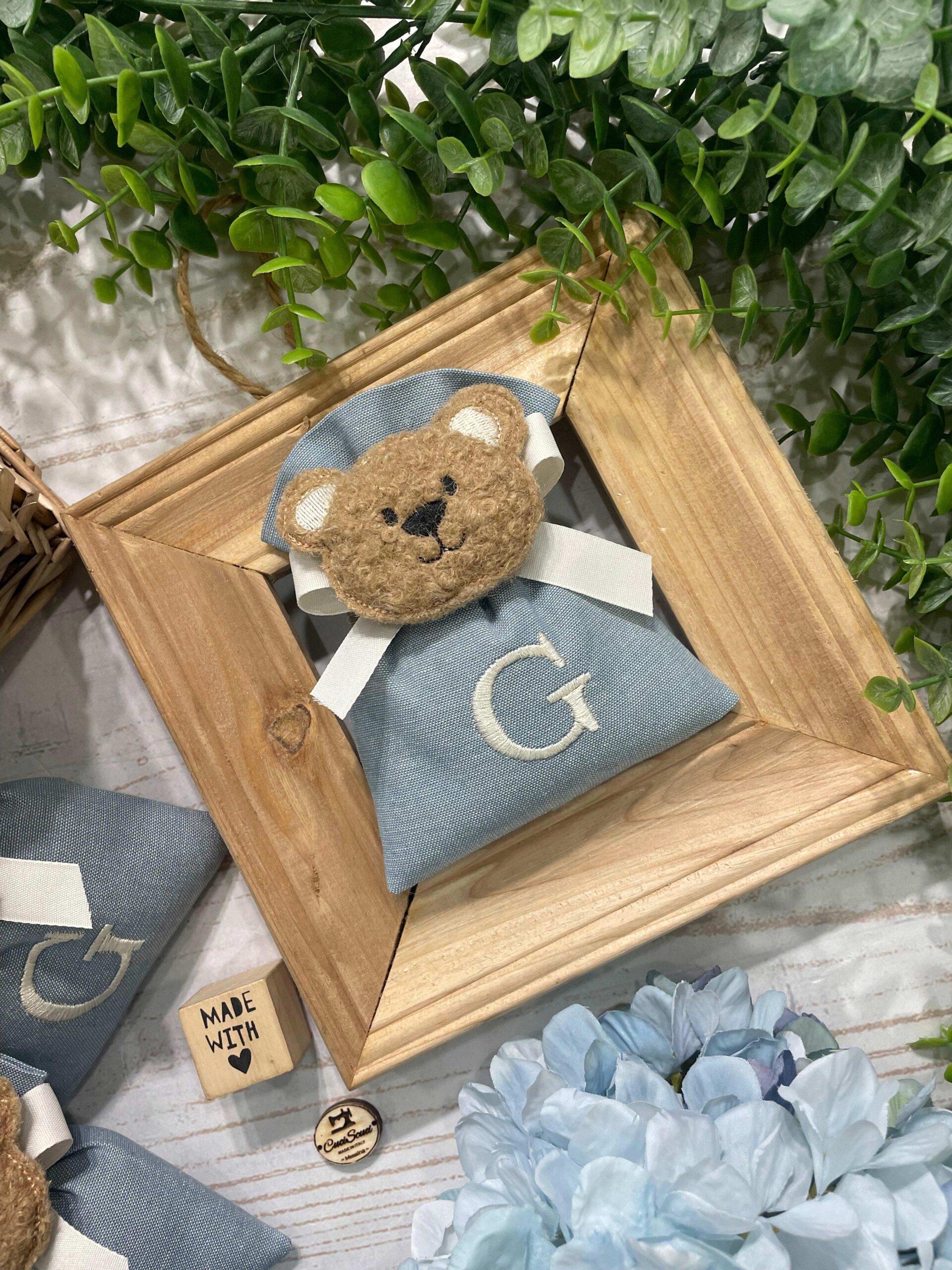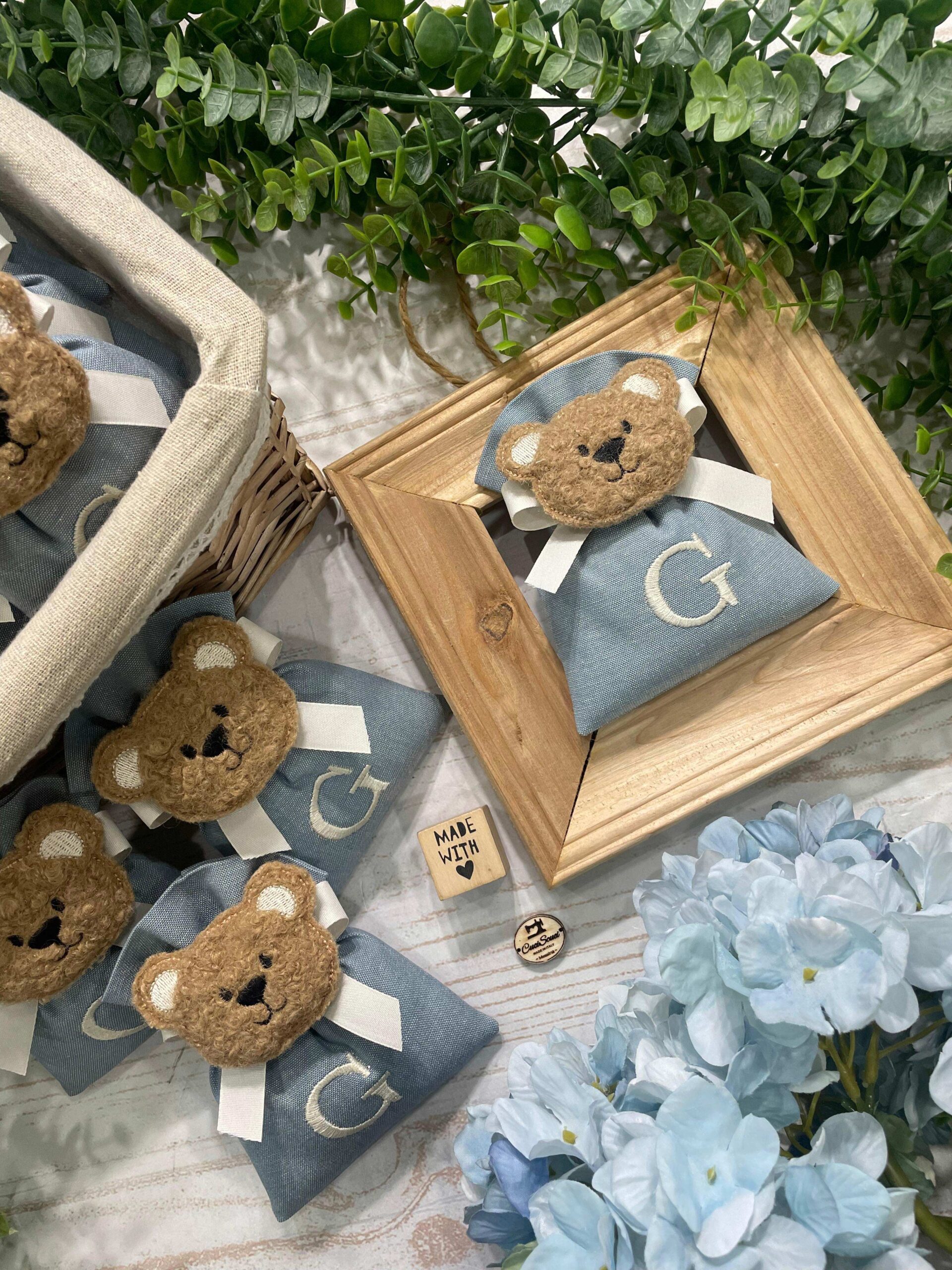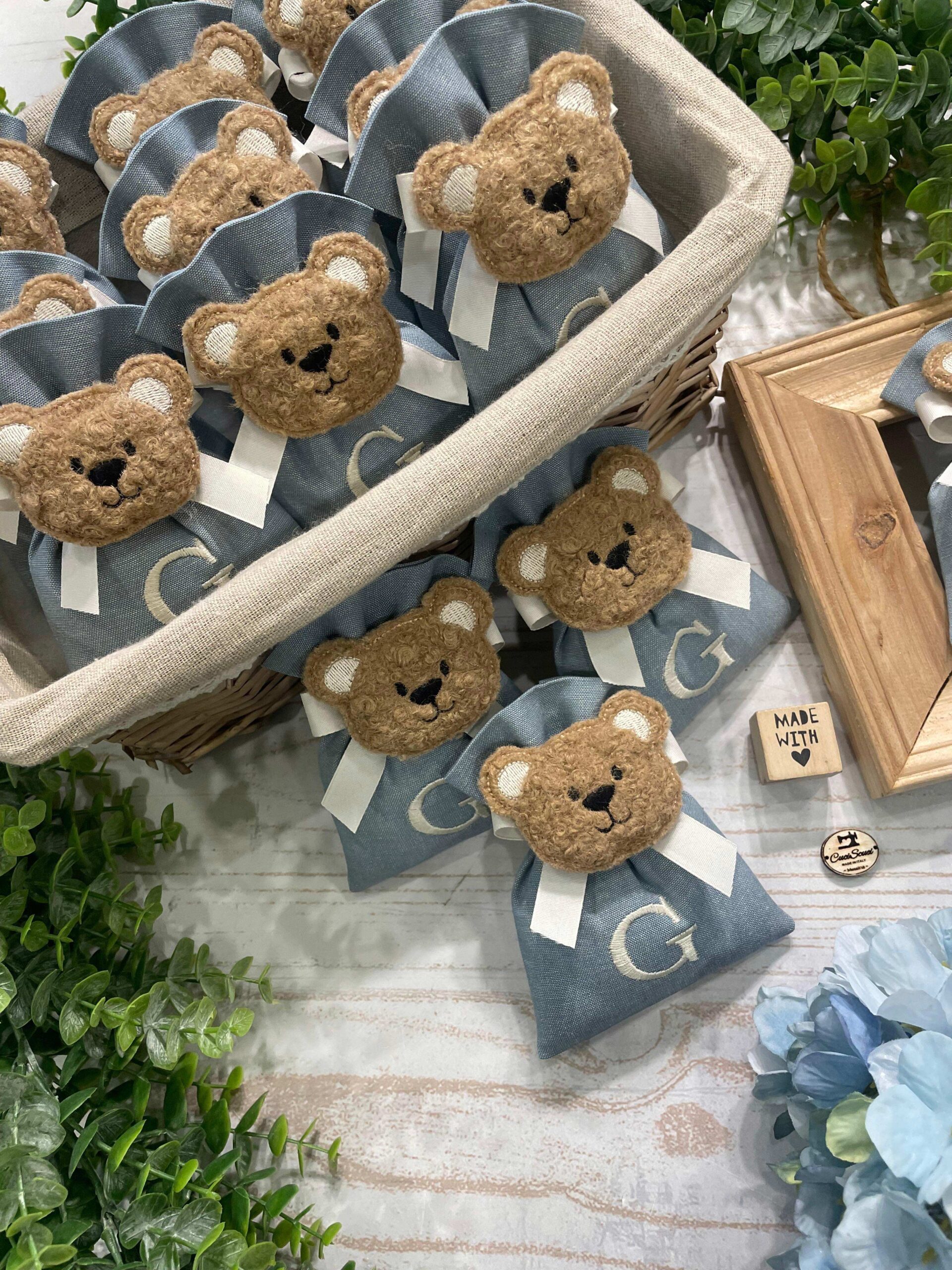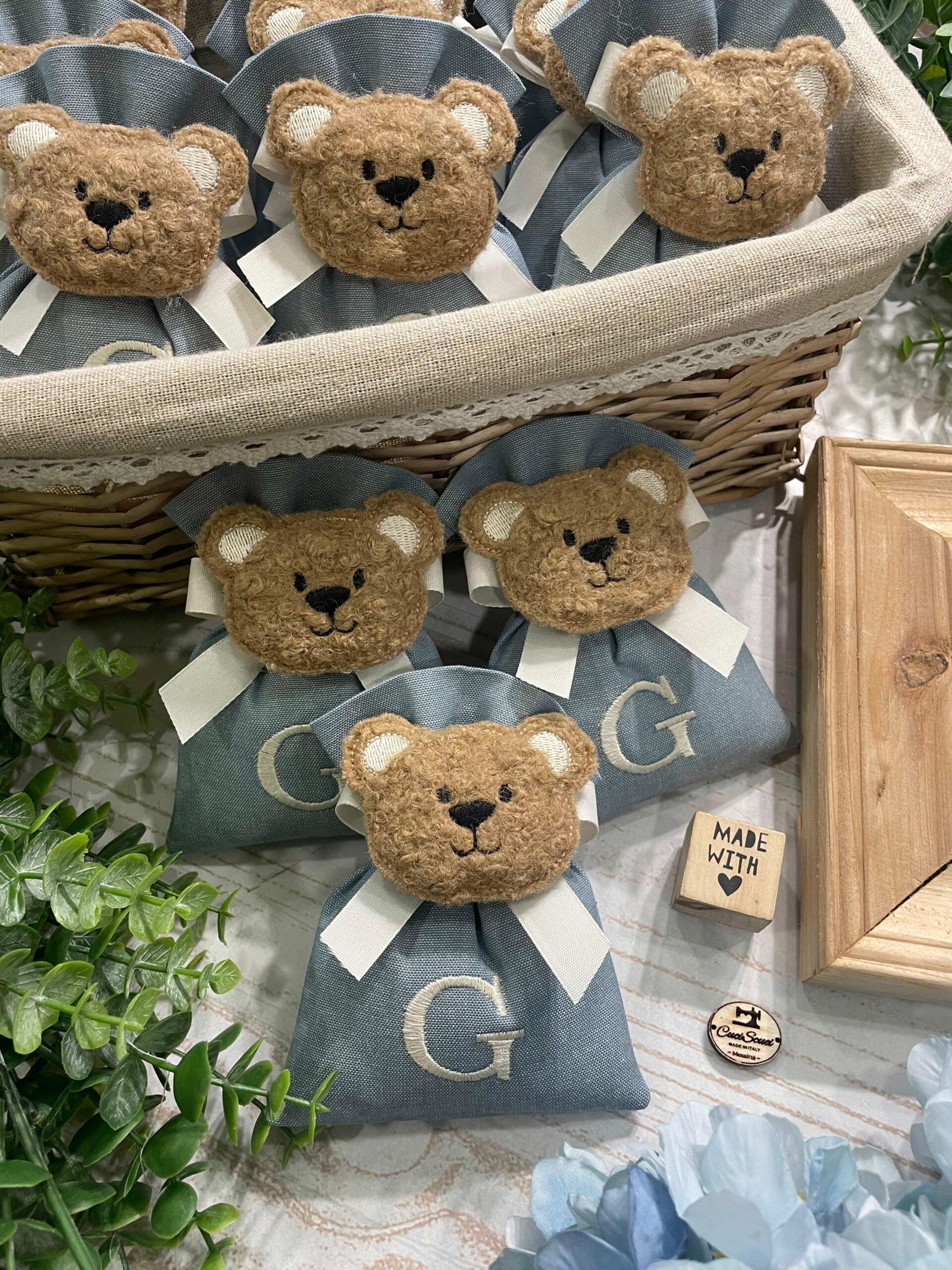 La bomboniera, pronta da donare ai tuoi ospiti, comprende il sacchetto con ricamo, confezionato con imbottitura in ovatta, fiocco abbinato, 5 confetti in busta sigillata e applicazione orsetto.