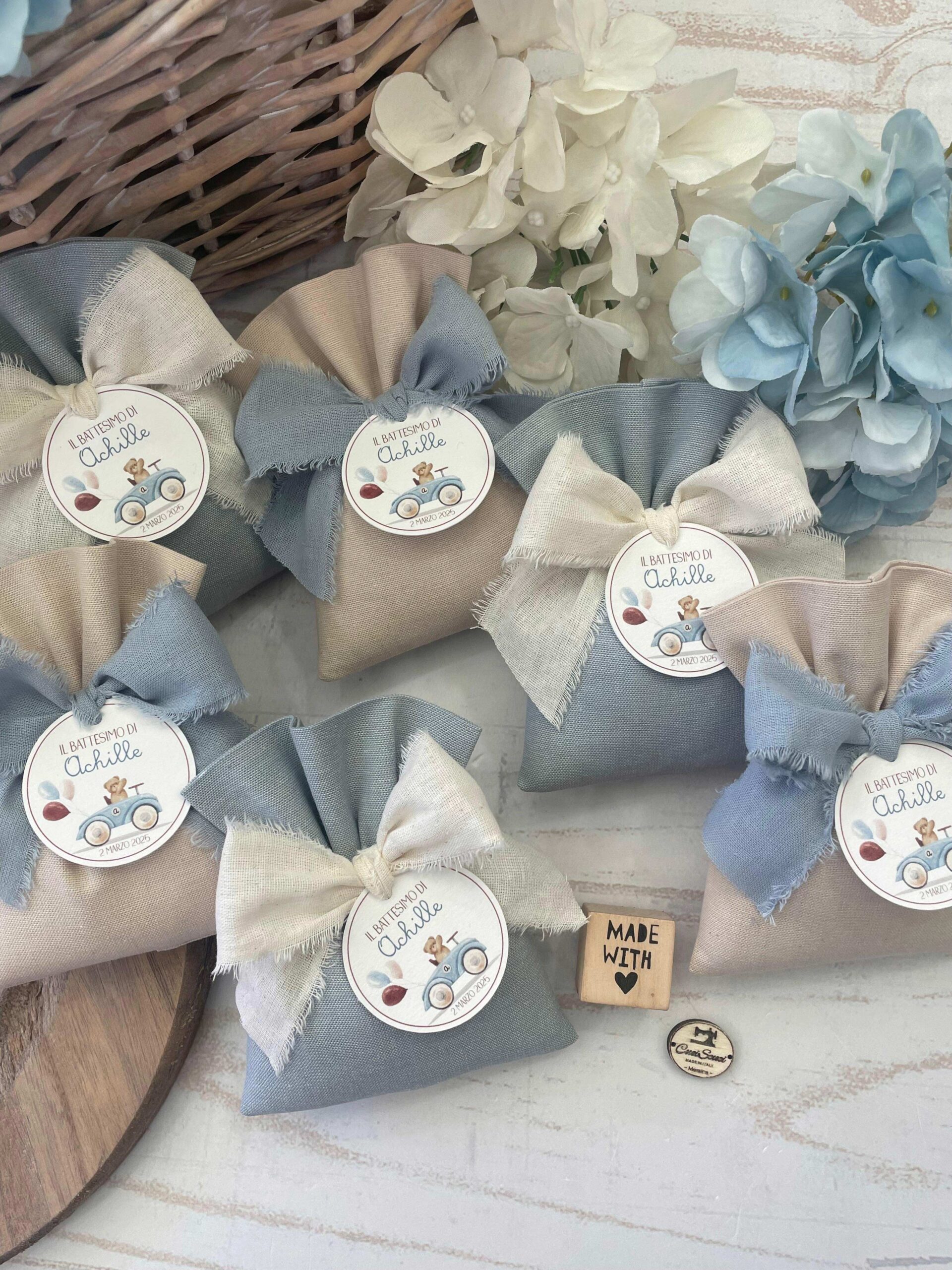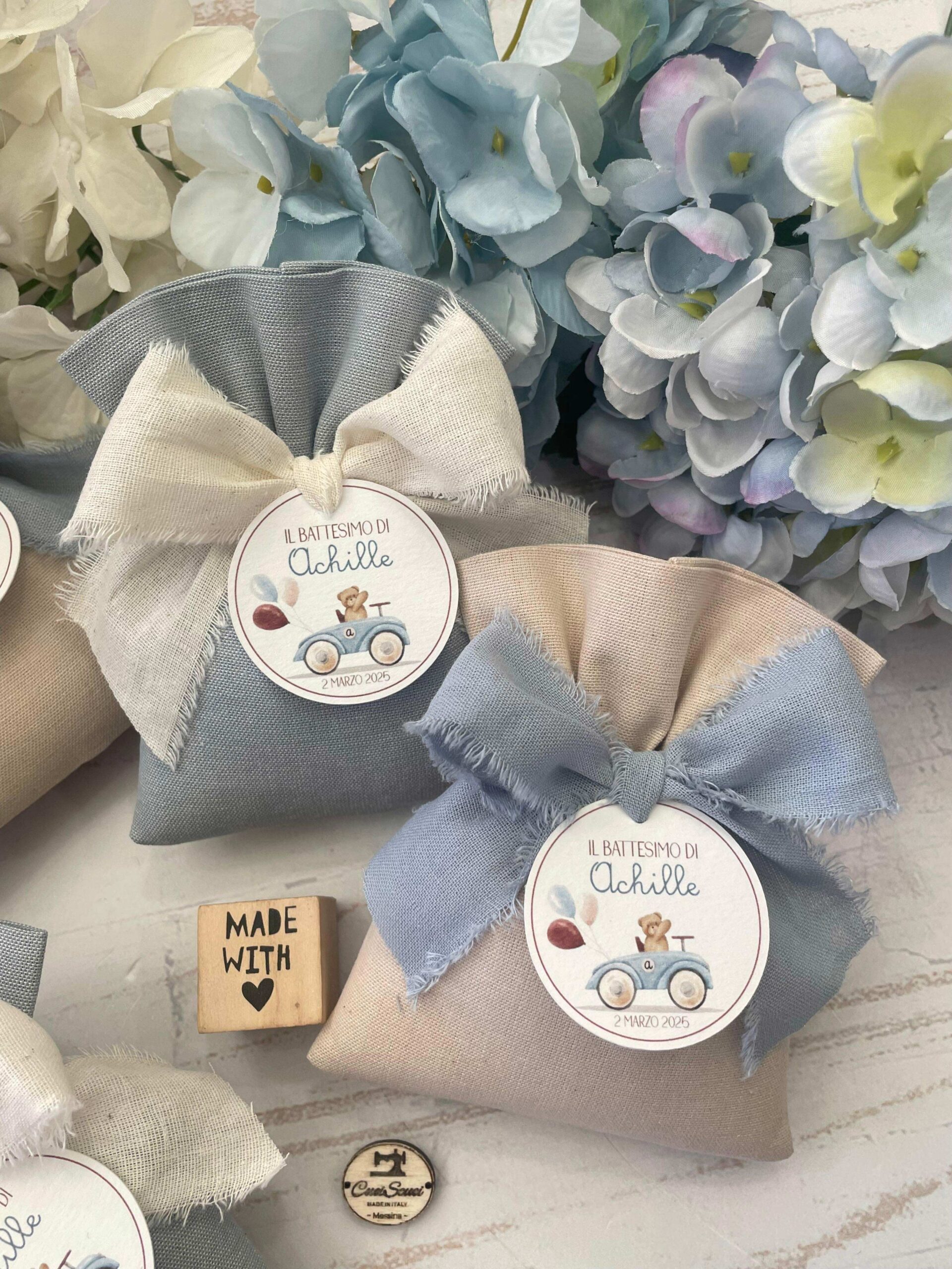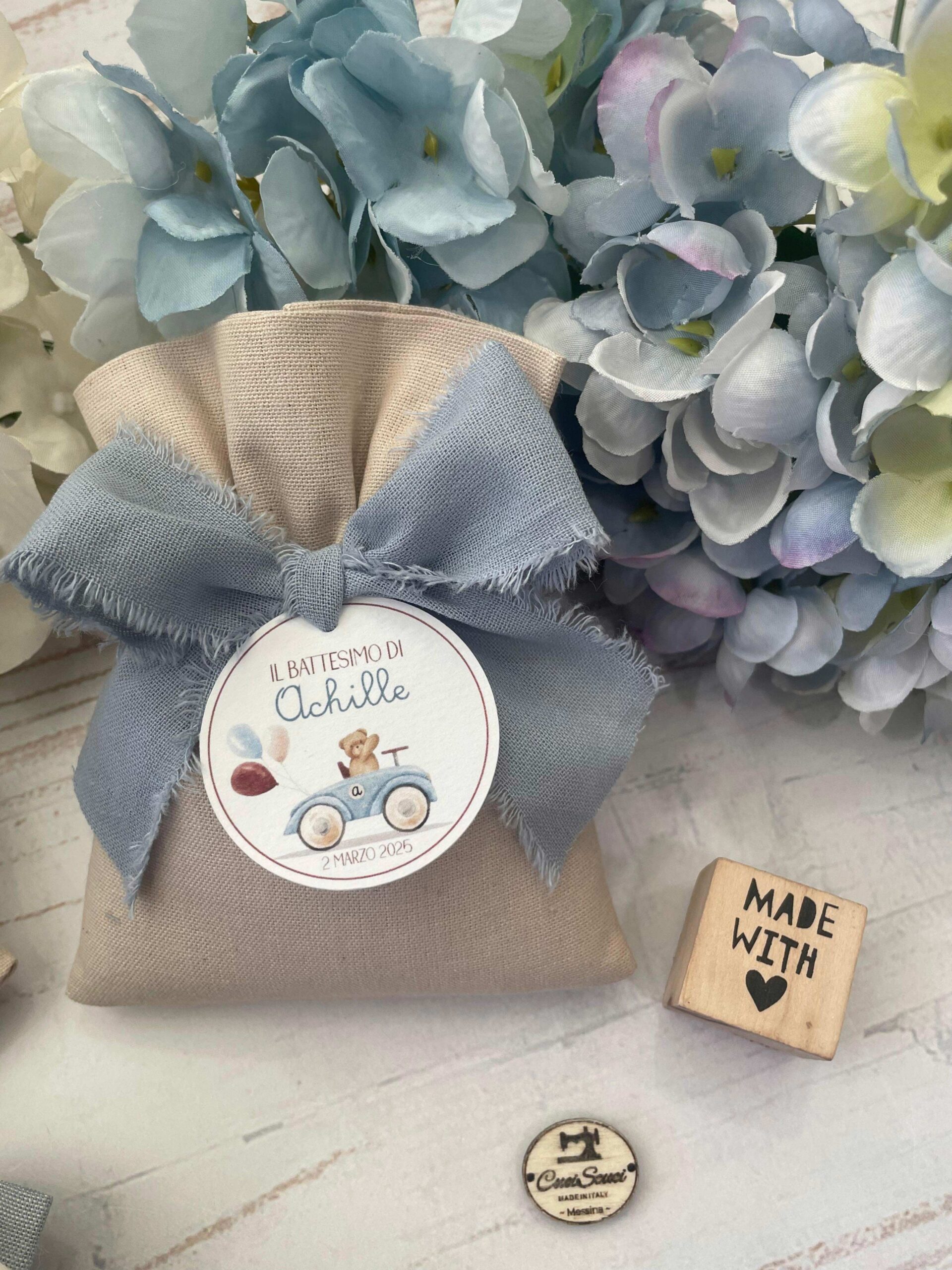 La bomboniera, pronta da donare ai tuoi ospiti, comprende il sacchetto, confezionato con imbottitura in ovatta, fiocco abbinato, 5 confetti in busta sigillata, con o senza tag.