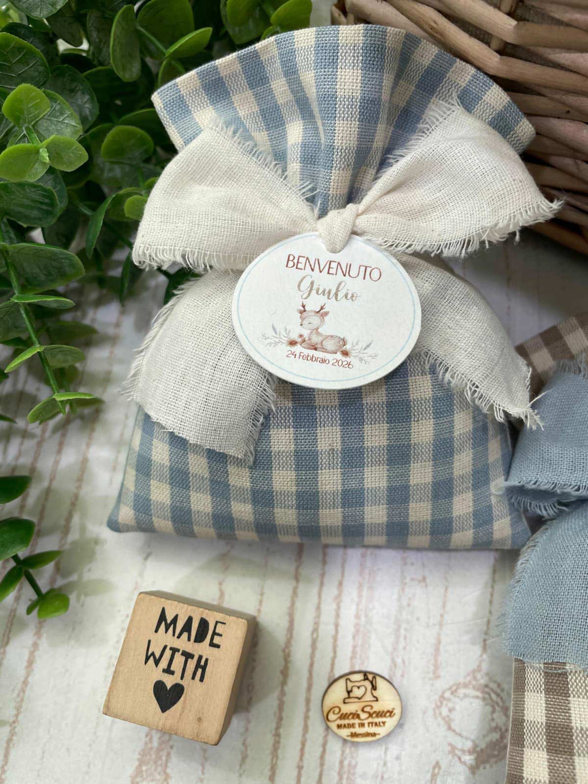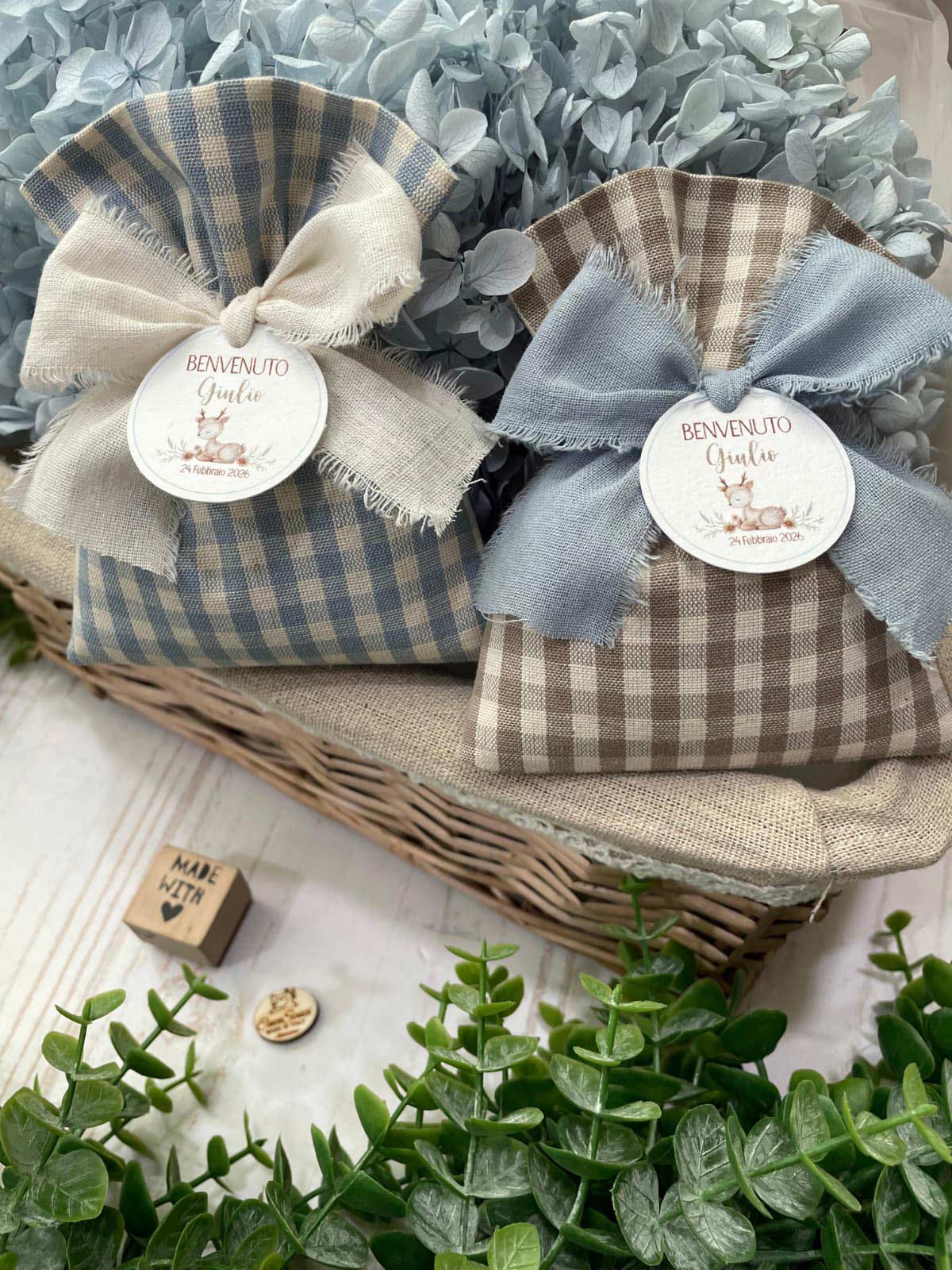 La bomboniera, pronta da donare ai tuoi ospiti, comprende il sacchetto, confezionato con imbottitura in ovatta, fiocco abbinato, 5 confetti in busta sigillata, con o senza tag.