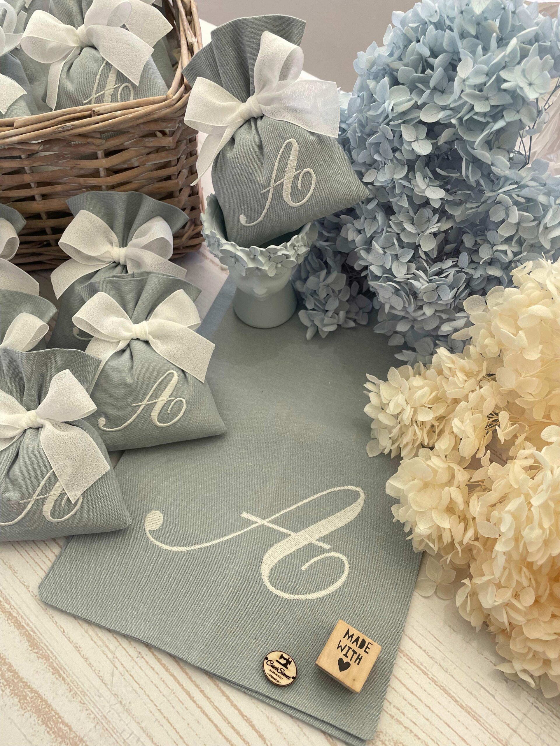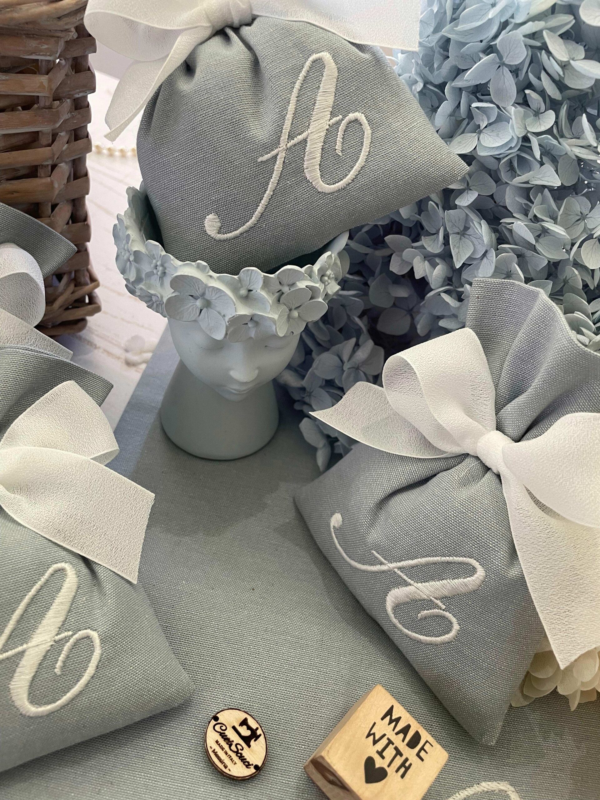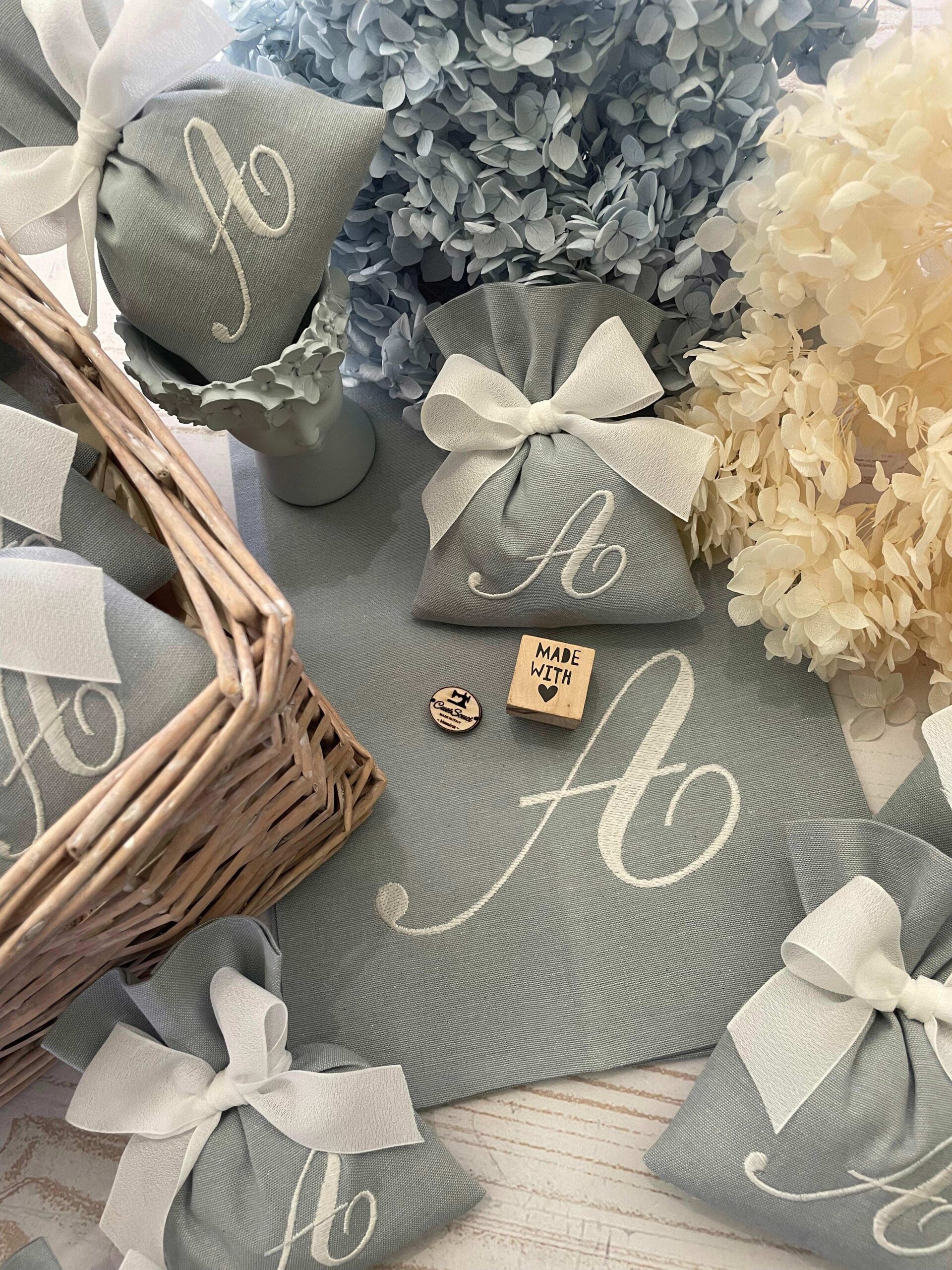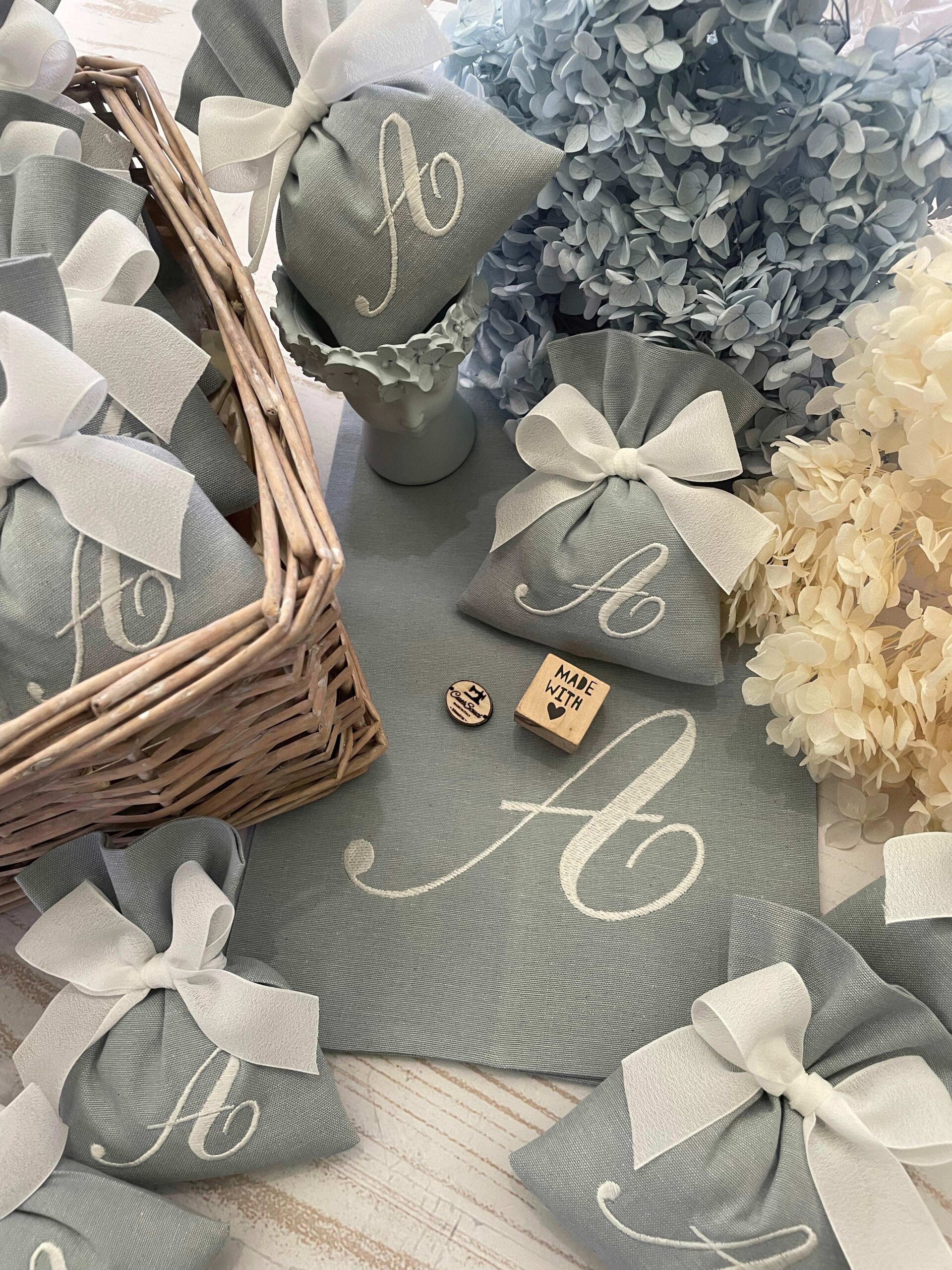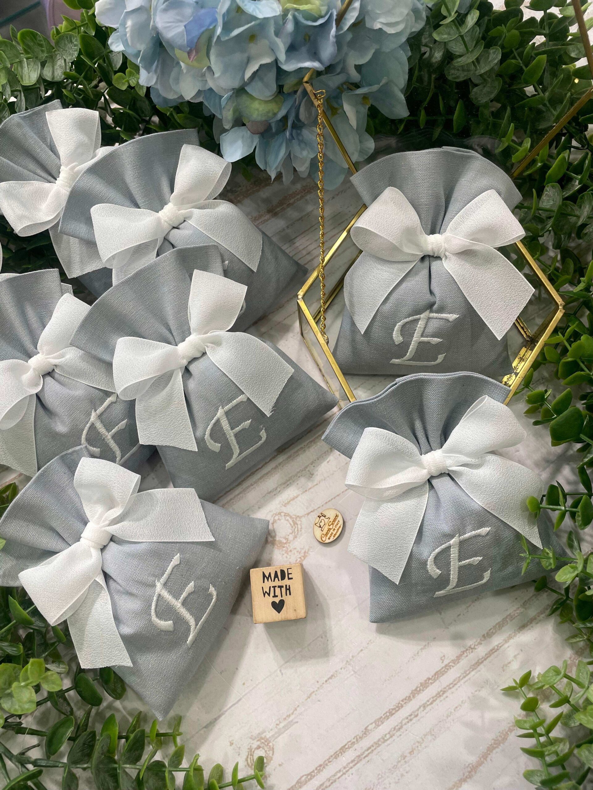 La bomboniera, pronta da donare ai tuoi ospiti, comprende il sacchetto con ricamo, confezionato con imbottitura in ovatta, fiocco abbinato e 5 confetti in busta sigillata.