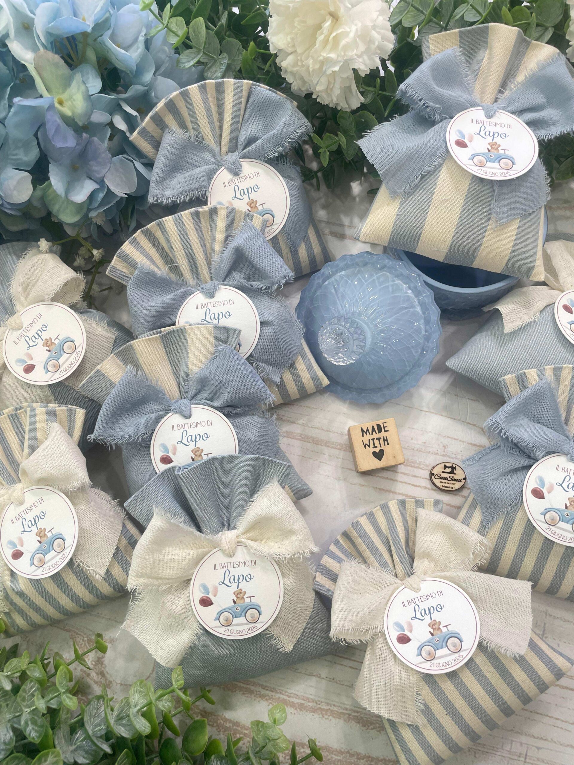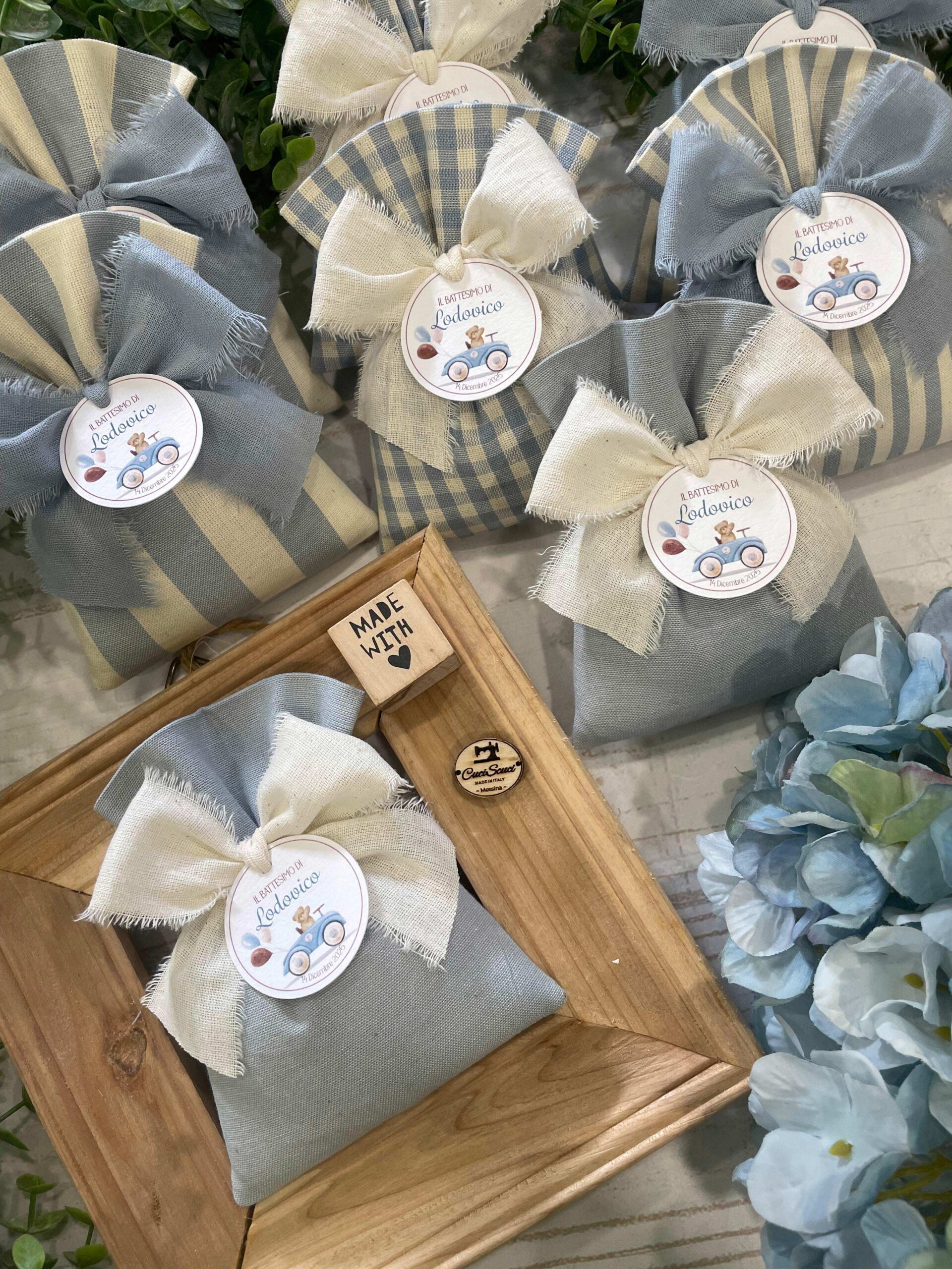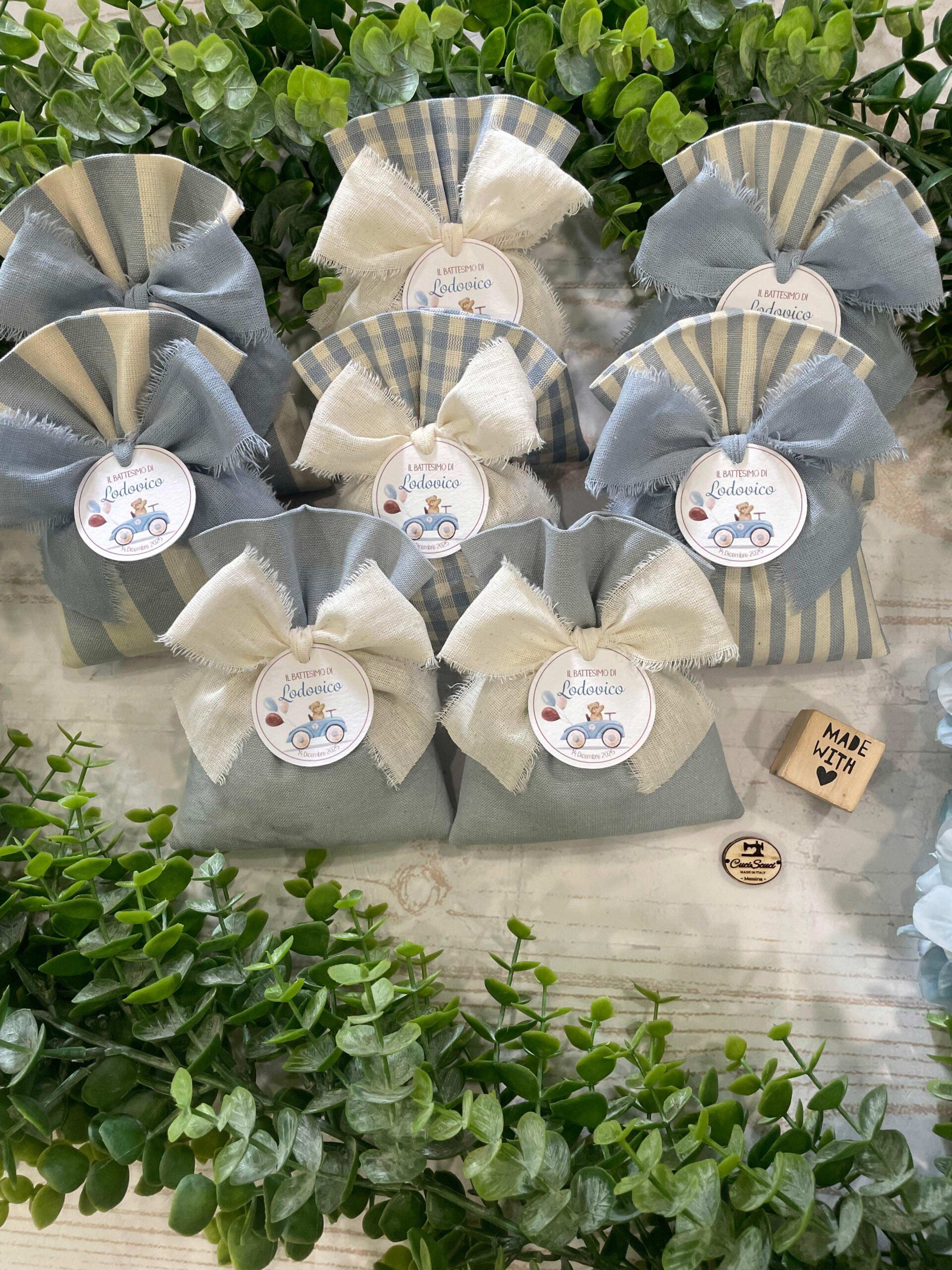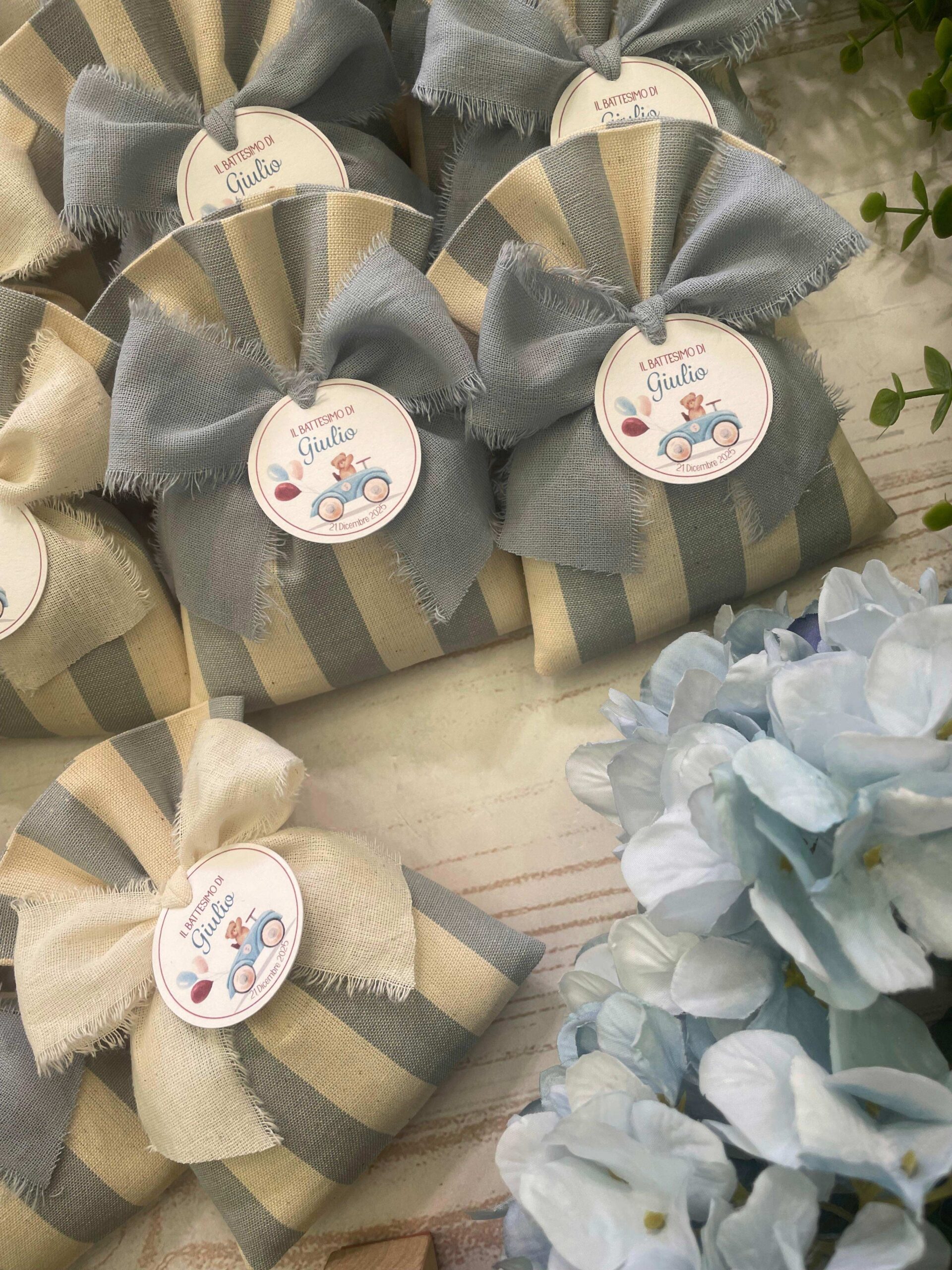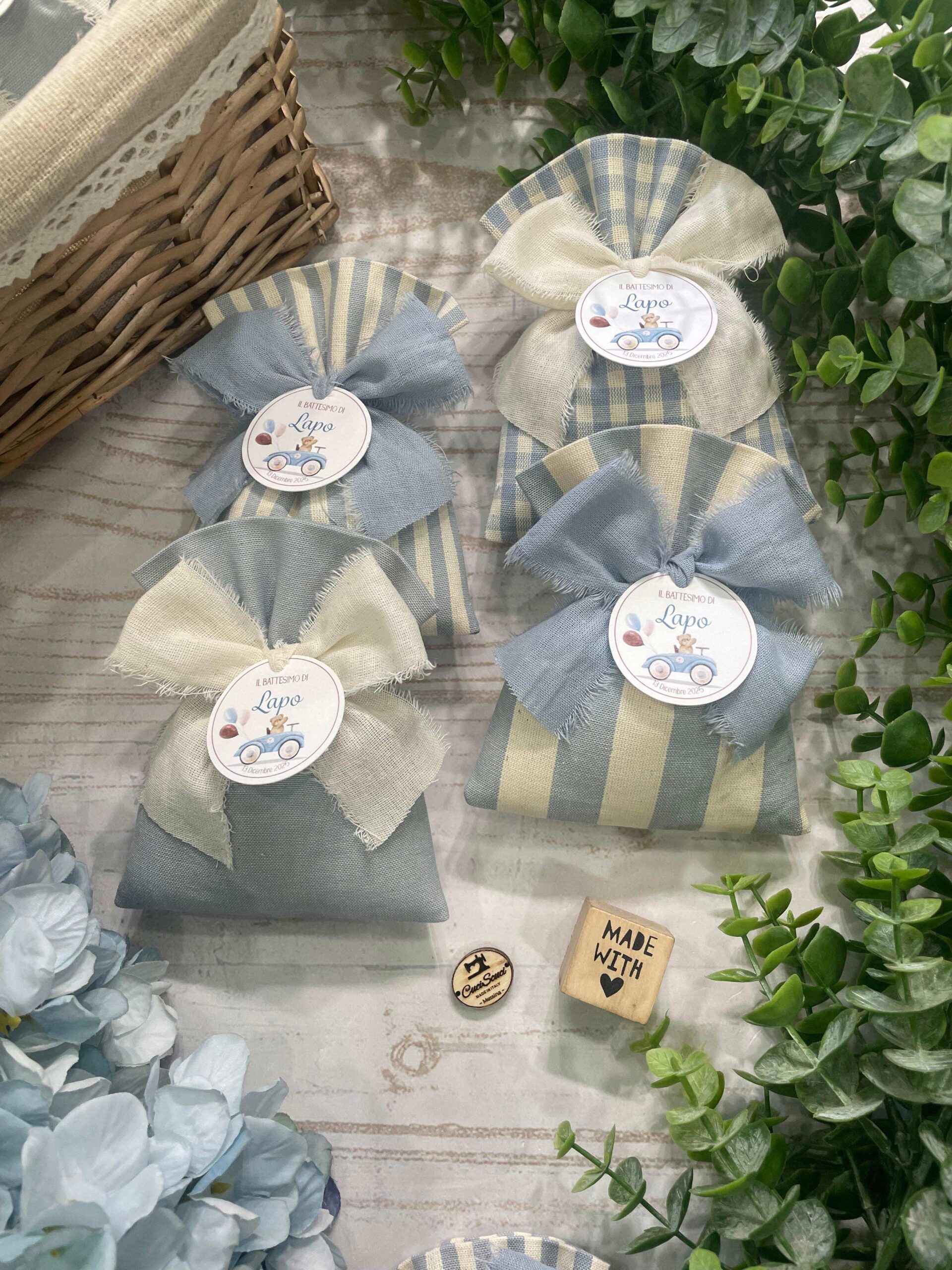 La bomboniera, pronta da donare ai tuoi ospiti, comprende il sacchetto, confezionato con imbottitura in ovatta, fiocco abbinato, 5 confetti in busta sigillata, con o senza tag.