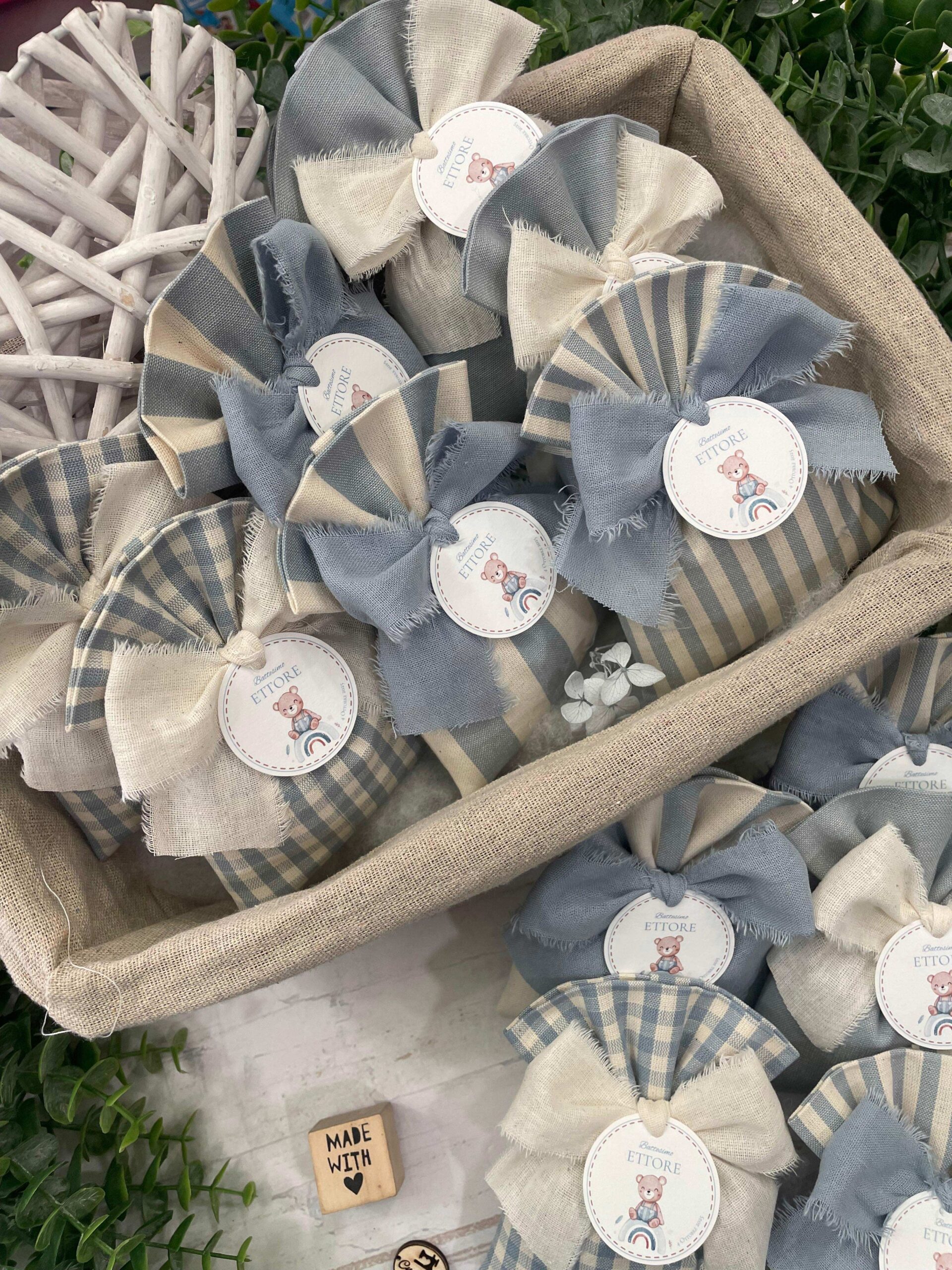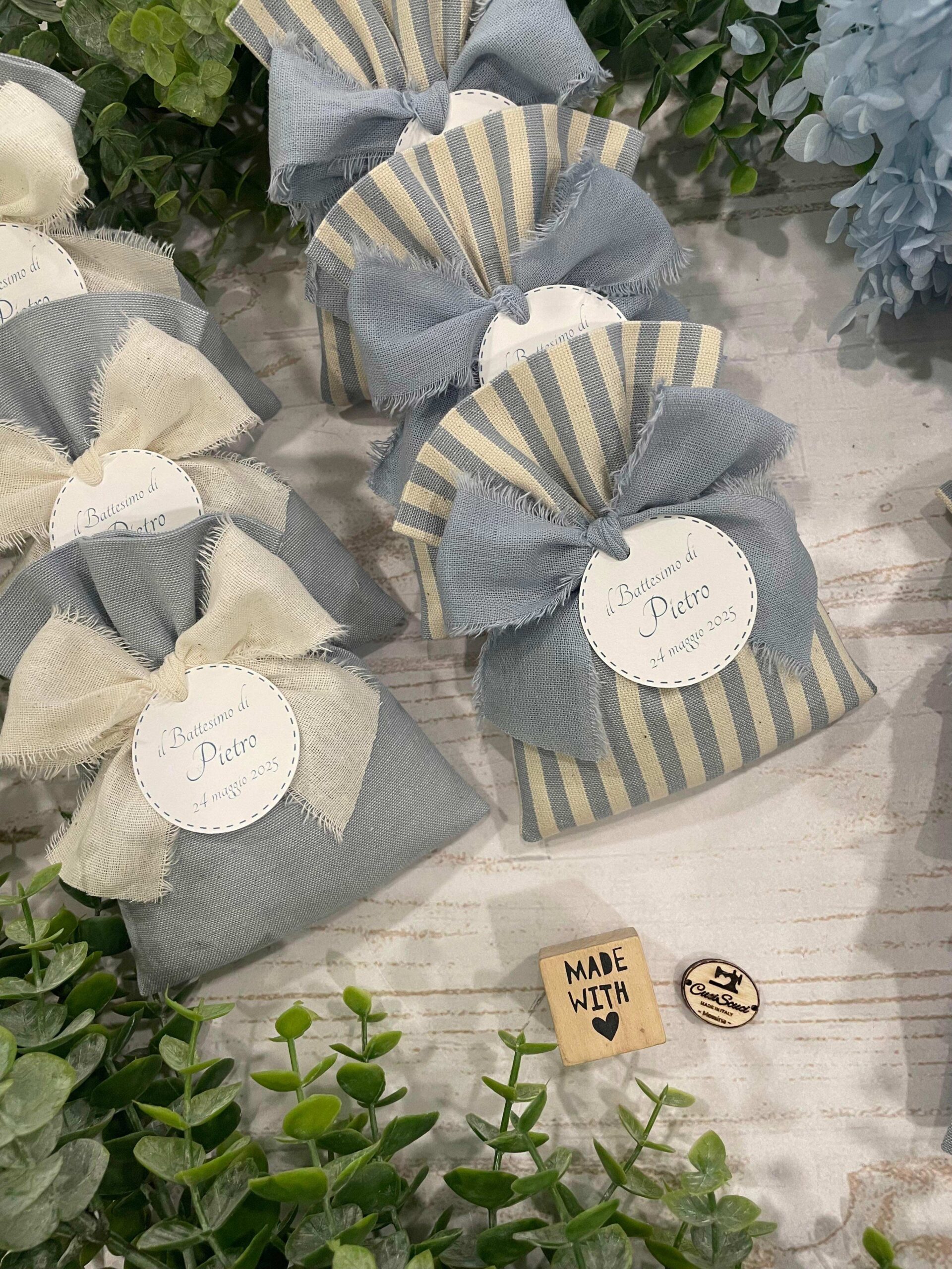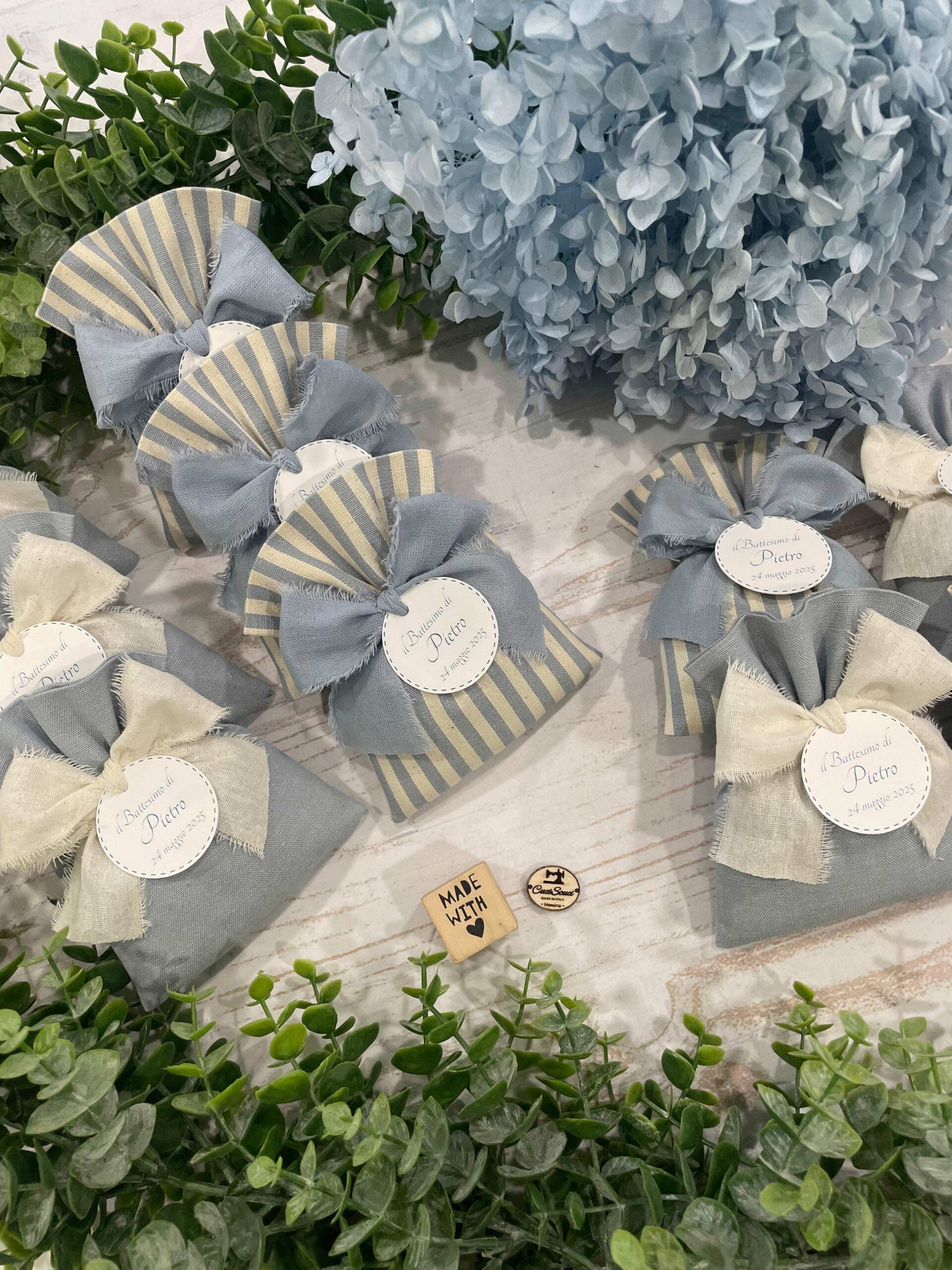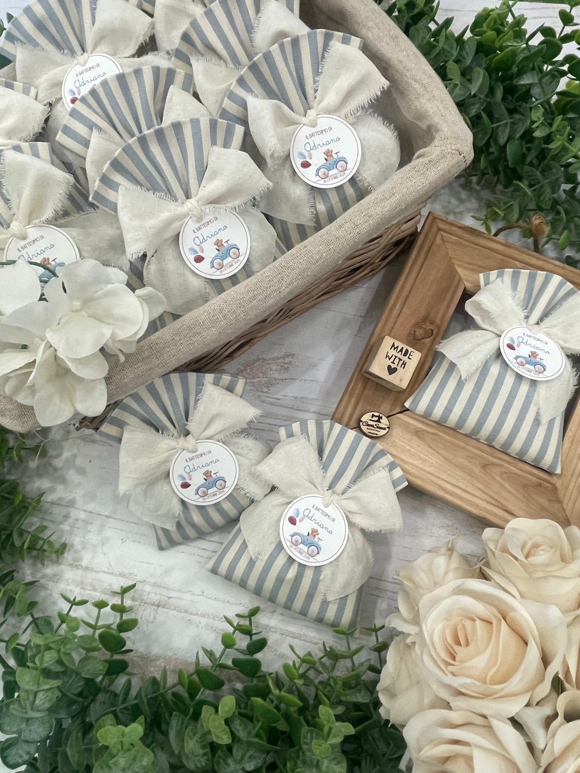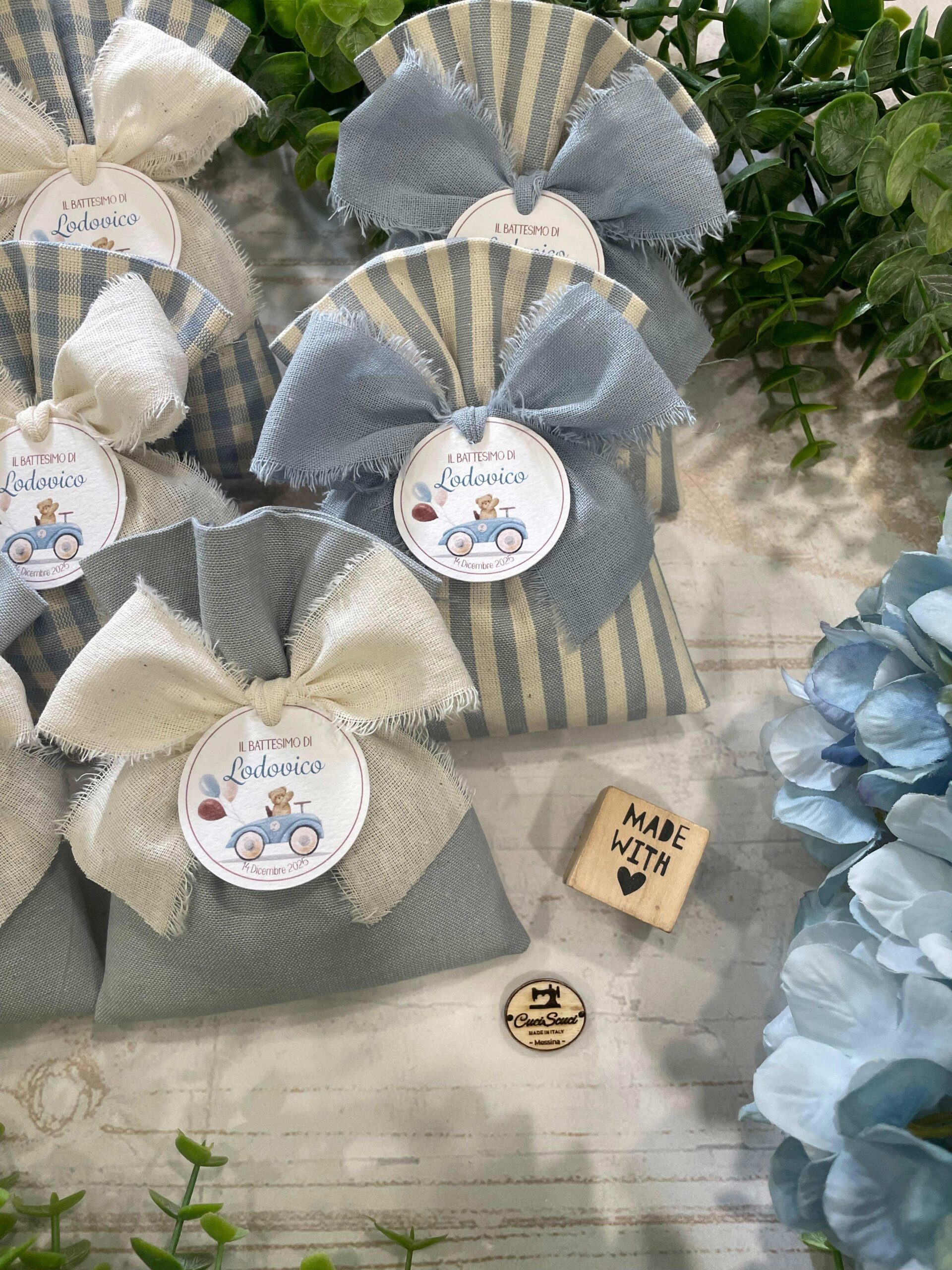 La bomboniera, pronta da donare ai tuoi ospiti, comprende il sacchetto, confezionato con imbottitura in ovatta, fiocco abbinato, 5 confetti in busta sigillata, con o senza tag.