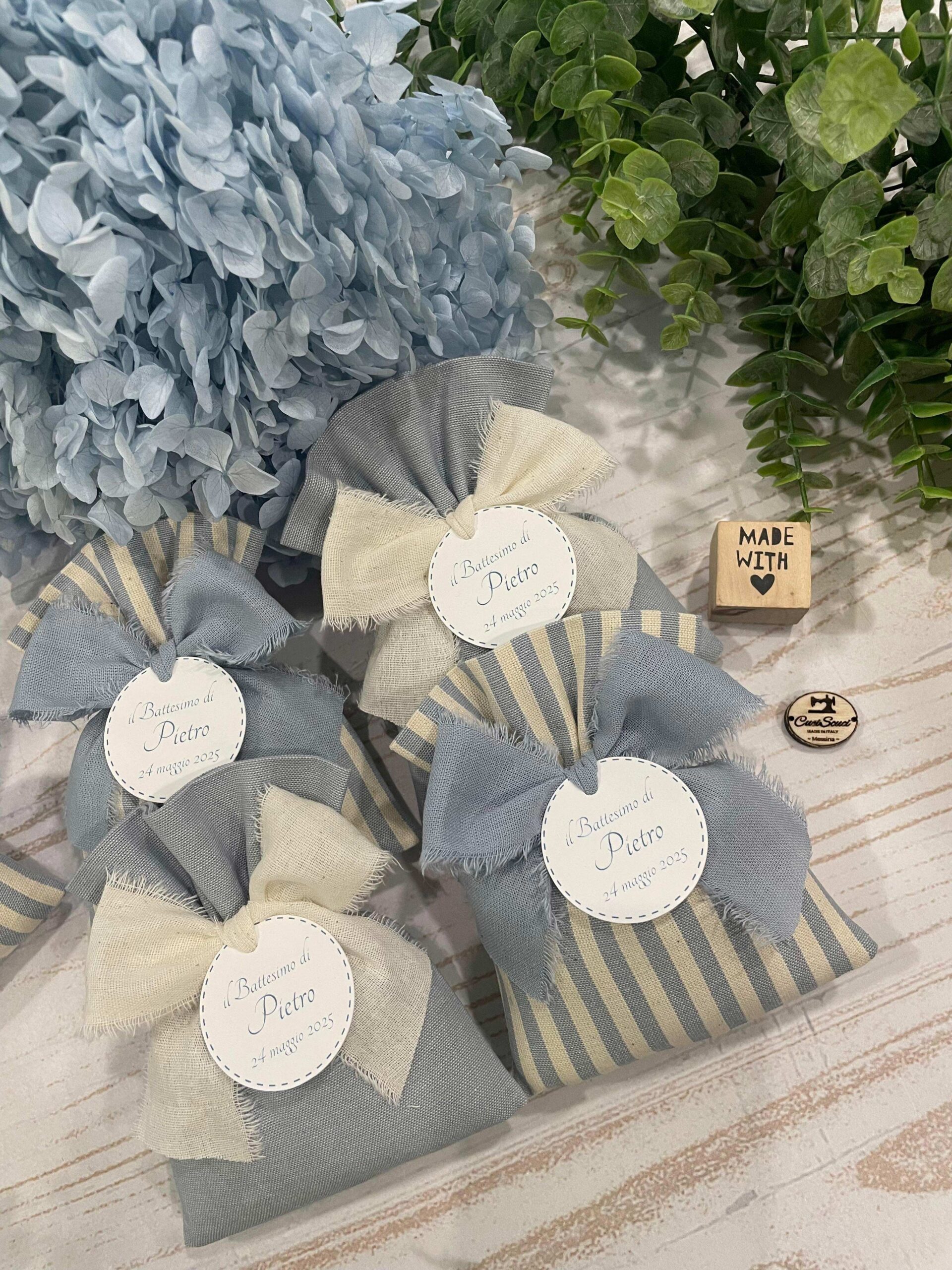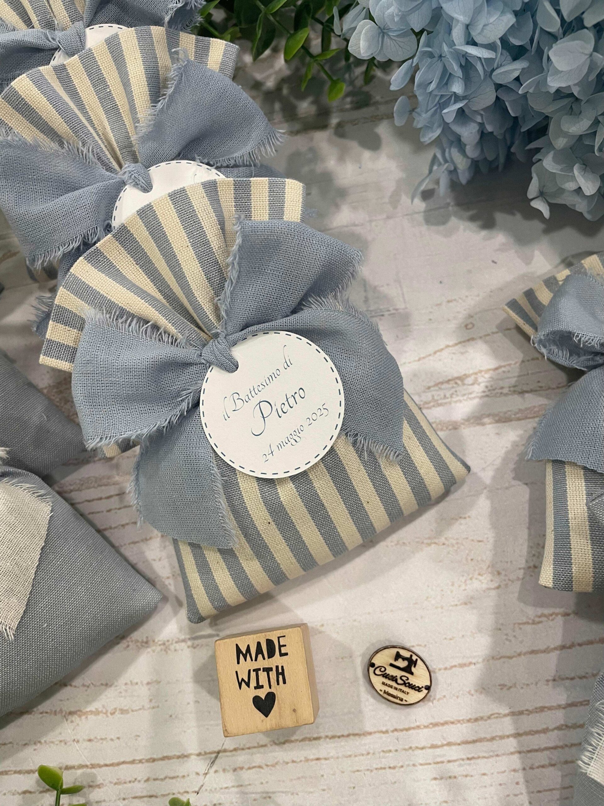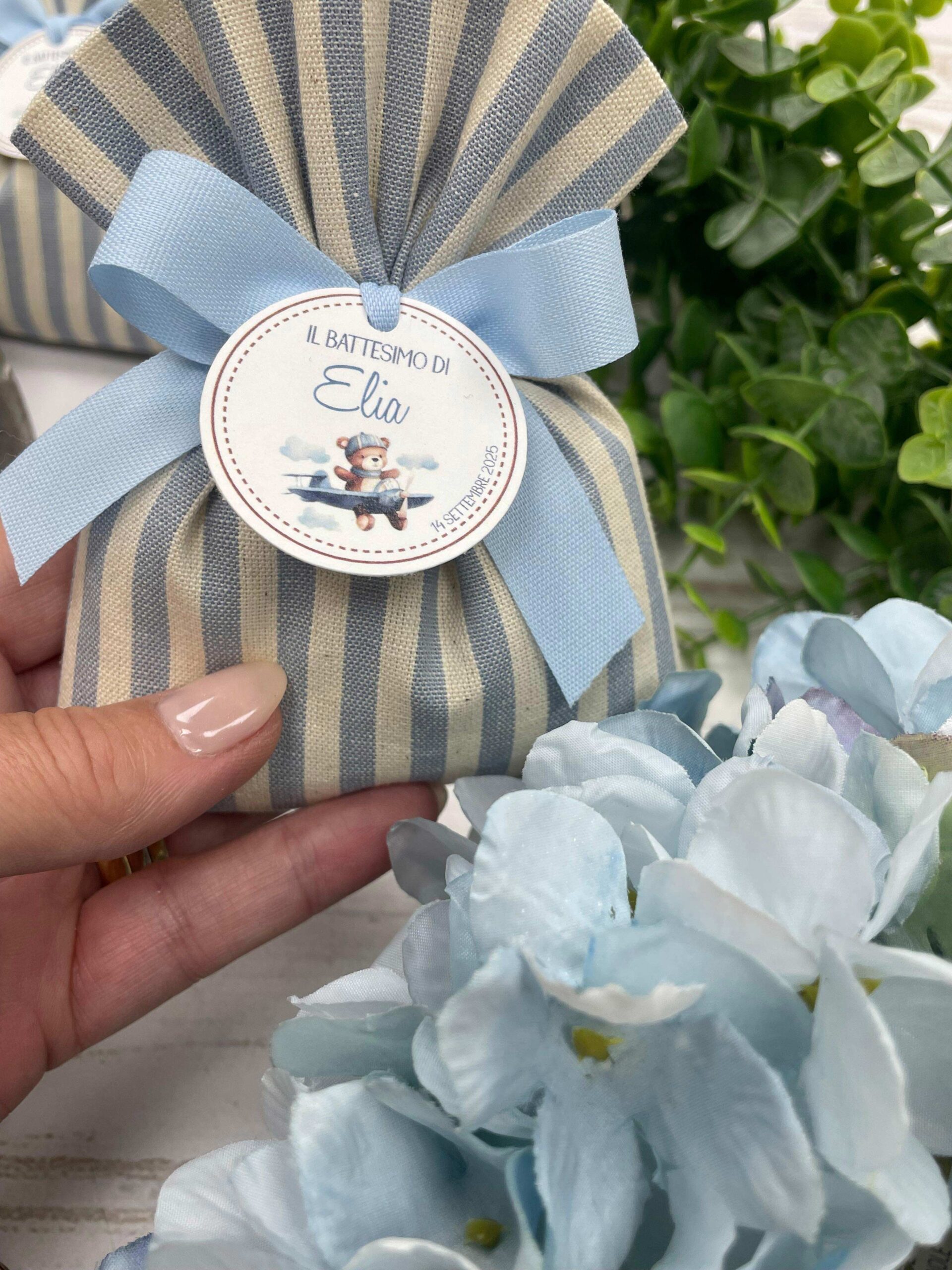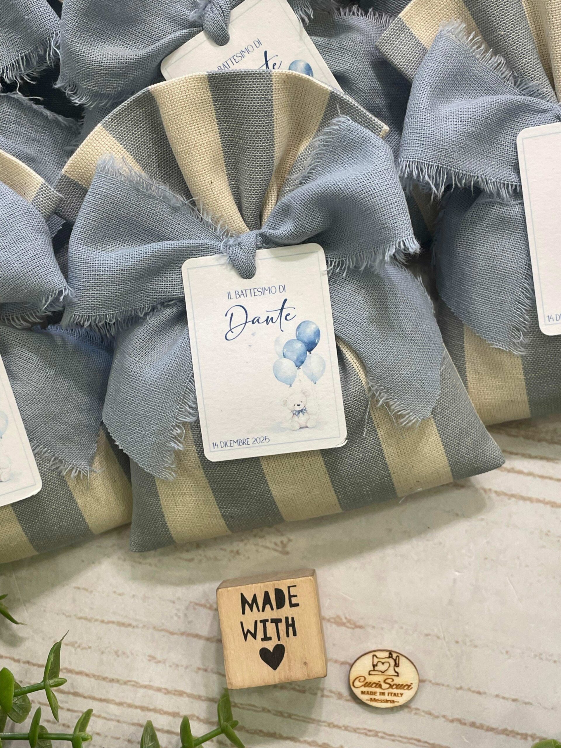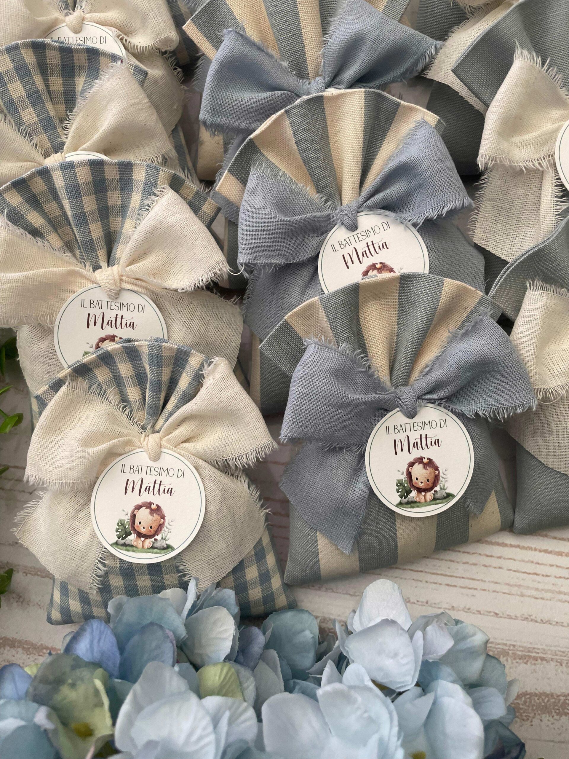 La bomboniera, pronta da donare ai tuoi ospiti, comprende il sacchetto, confezionato con imbottitura in ovatta, fiocco abbinato, 5 confetti in busta sigillata, con o senza tag.