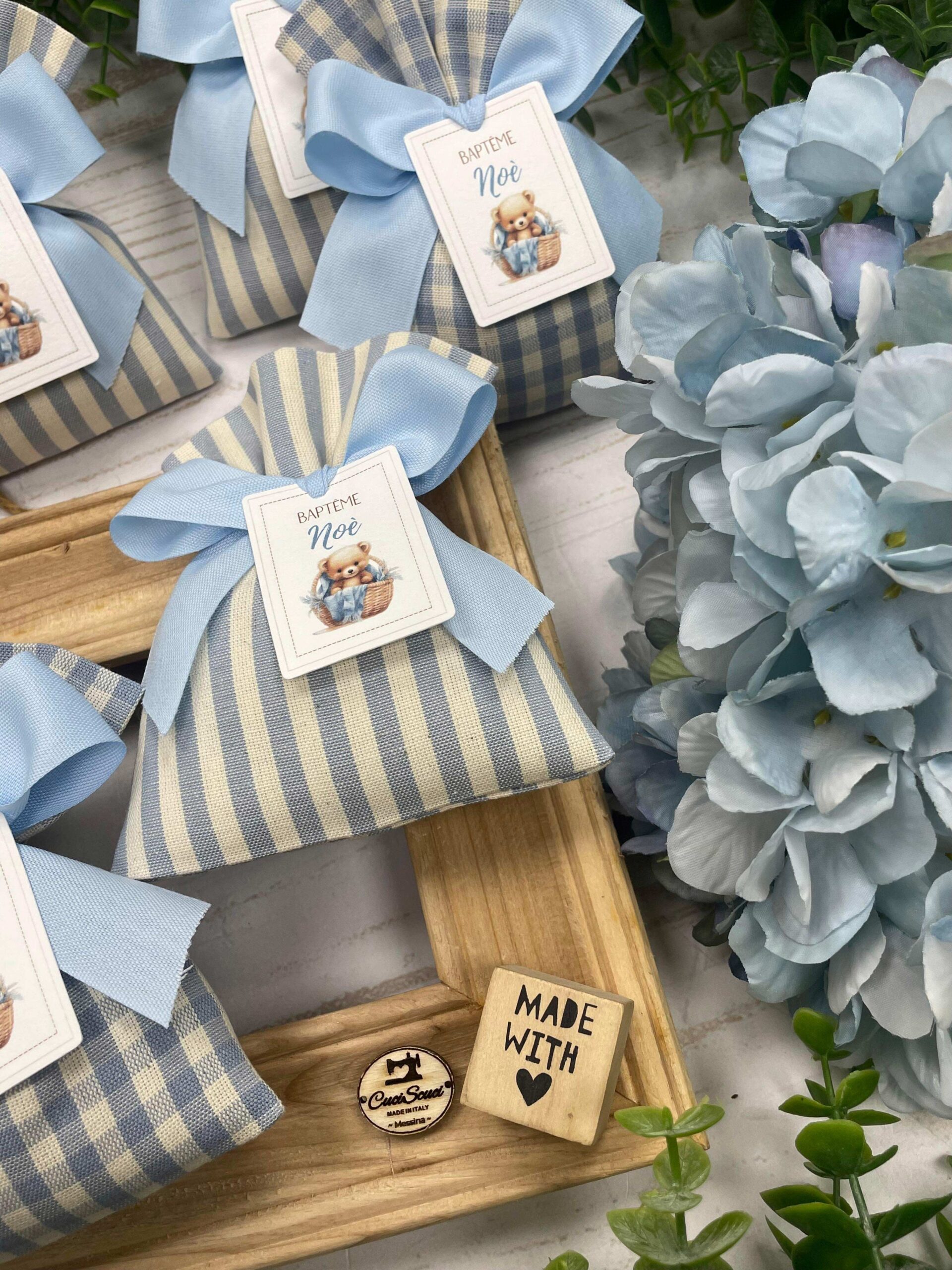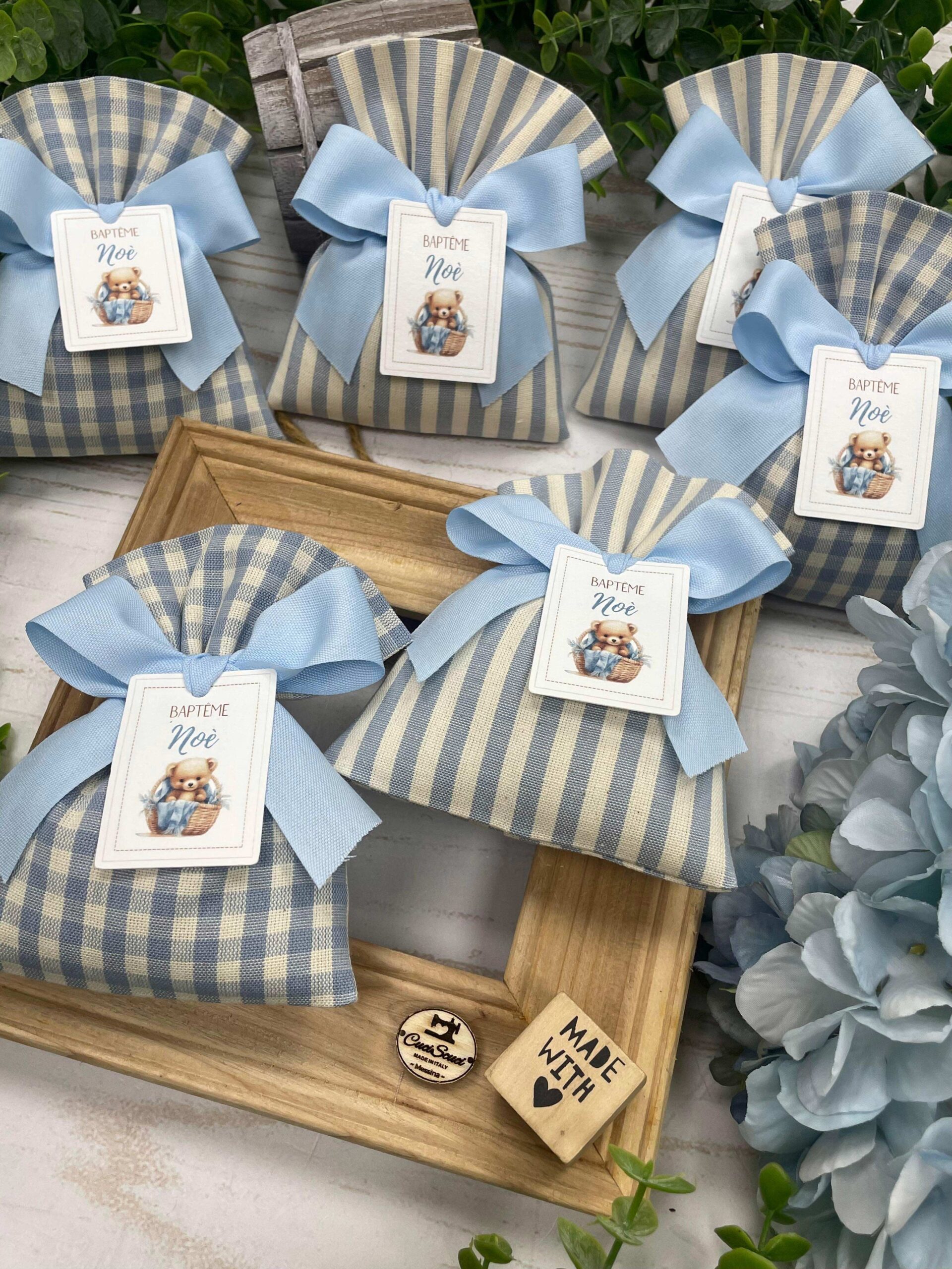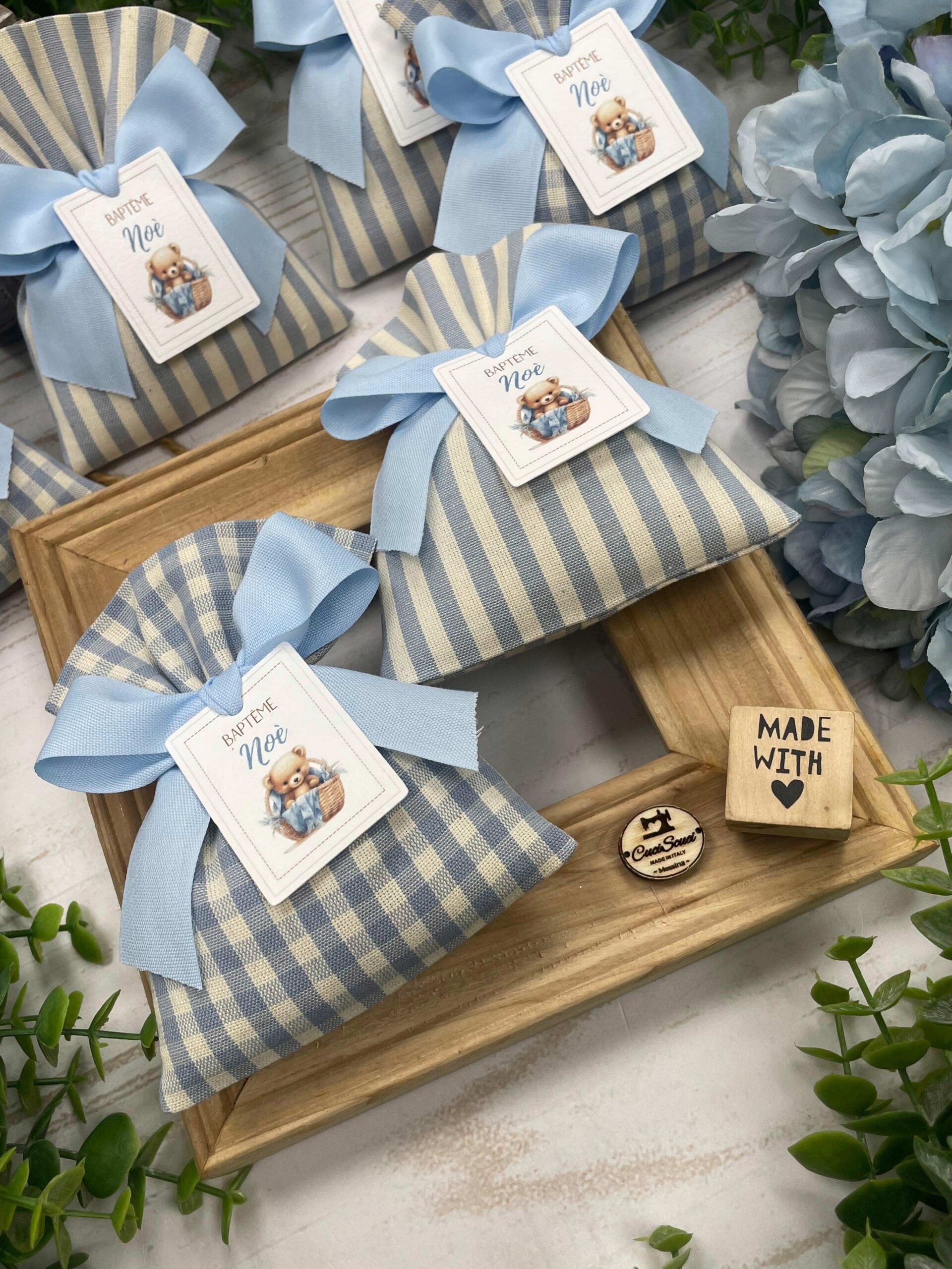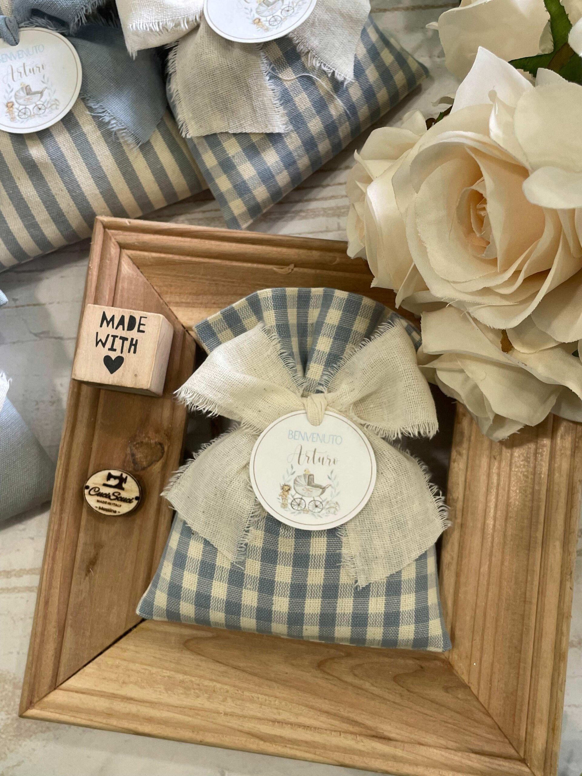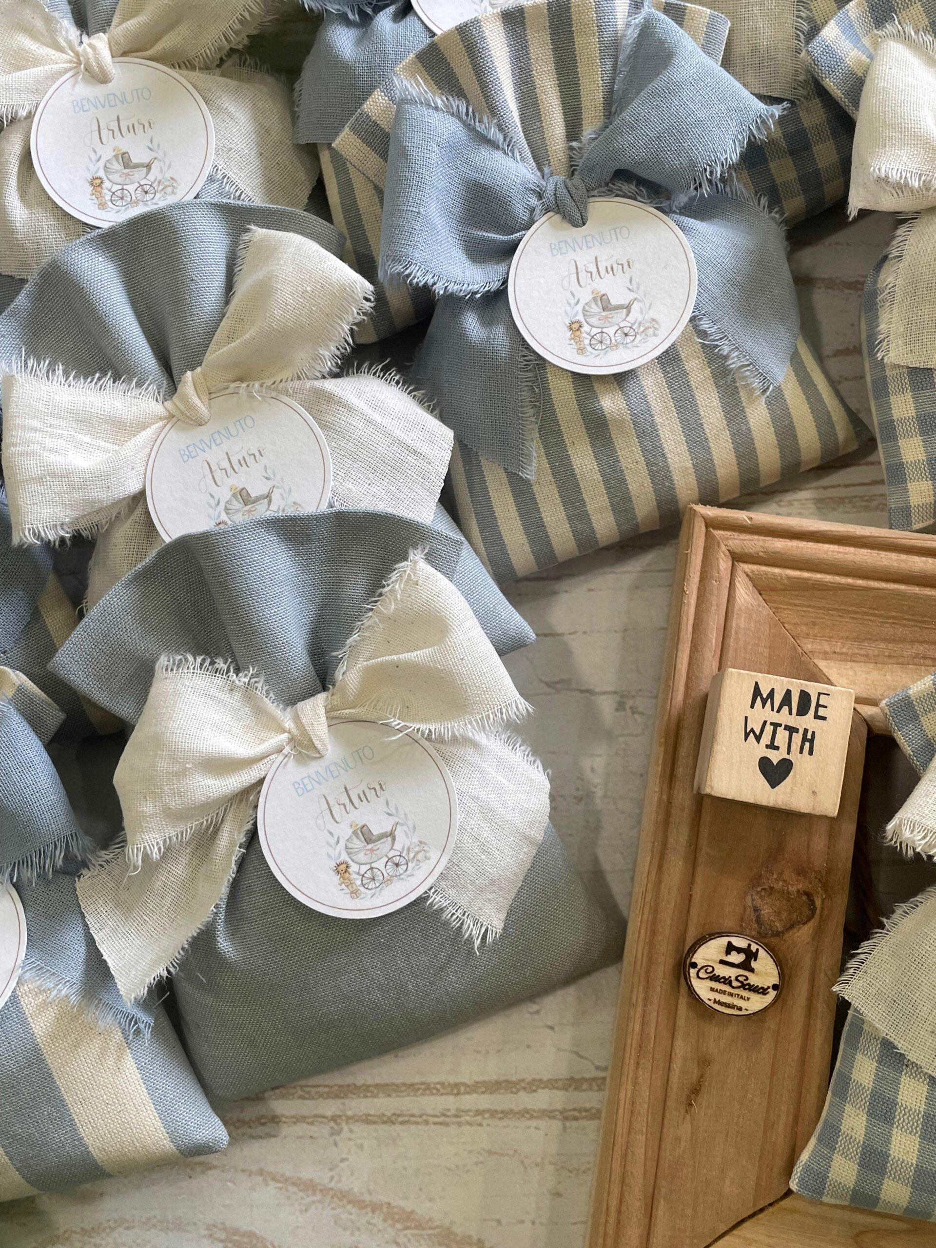 La bomboniera, pronta da donare ai tuoi ospiti, comprende il sacchetto, confezionato con imbottitura in ovatta, fiocco abbinato, 5 confetti in busta sigillata, con o senza tag.