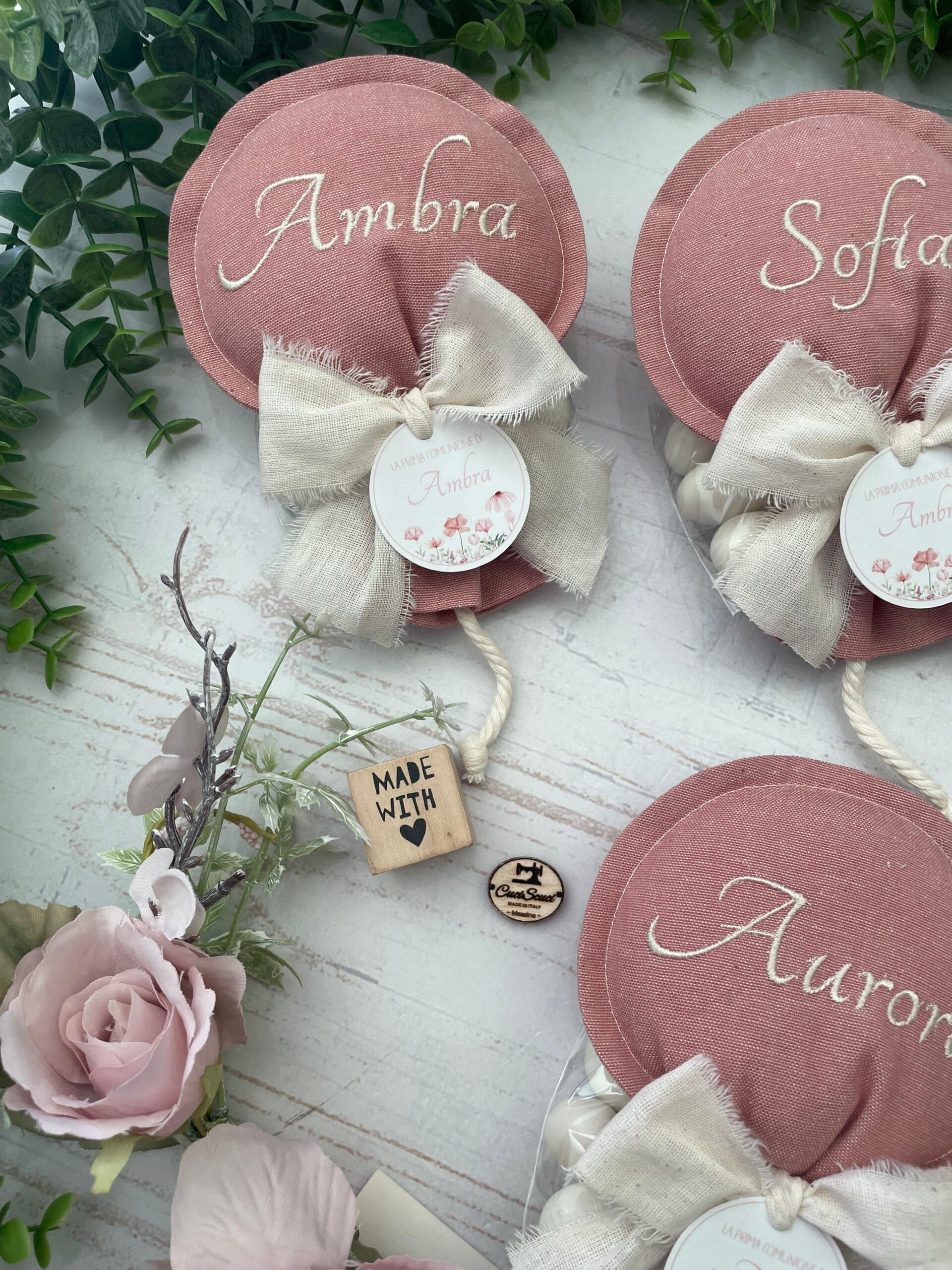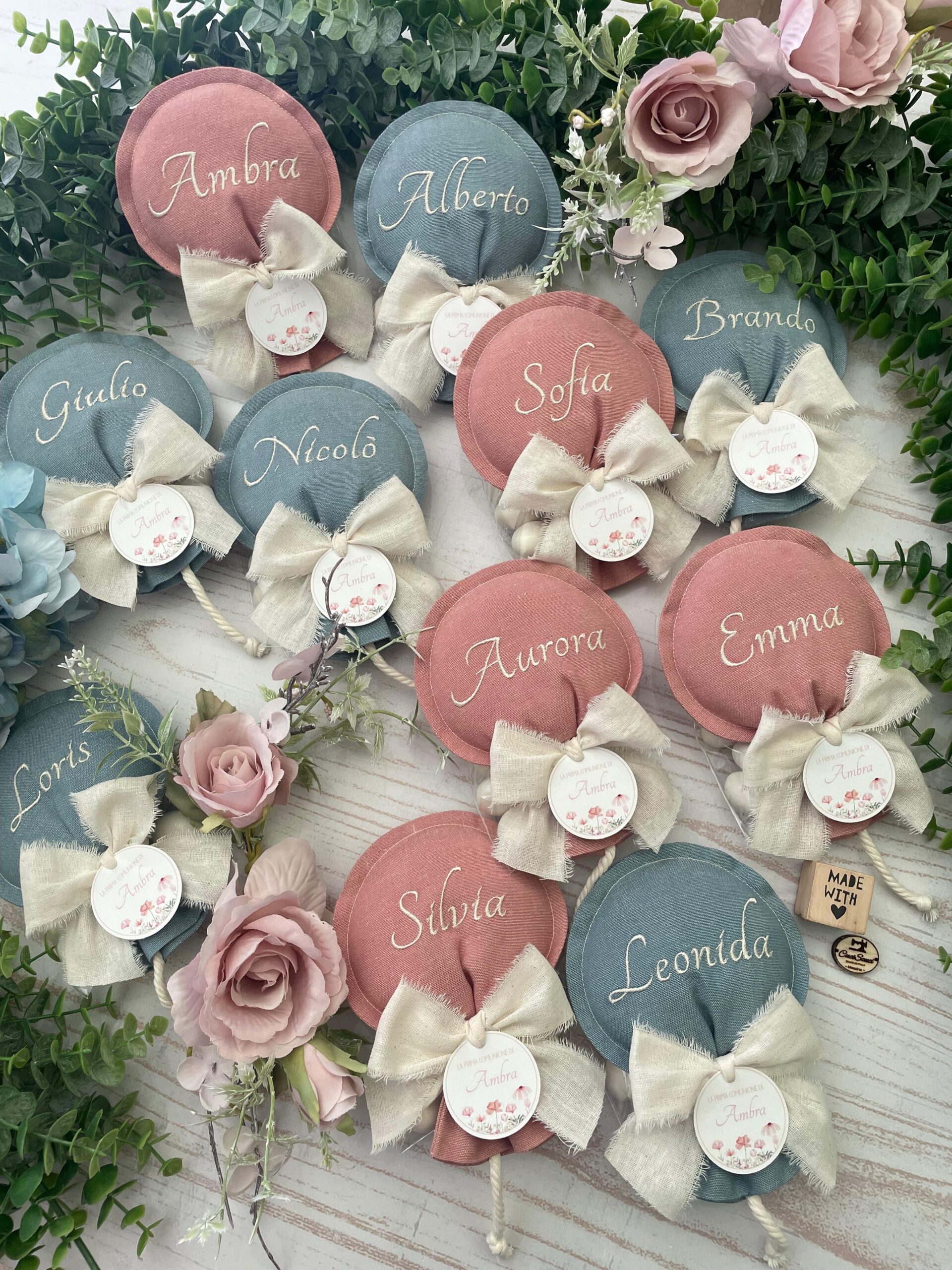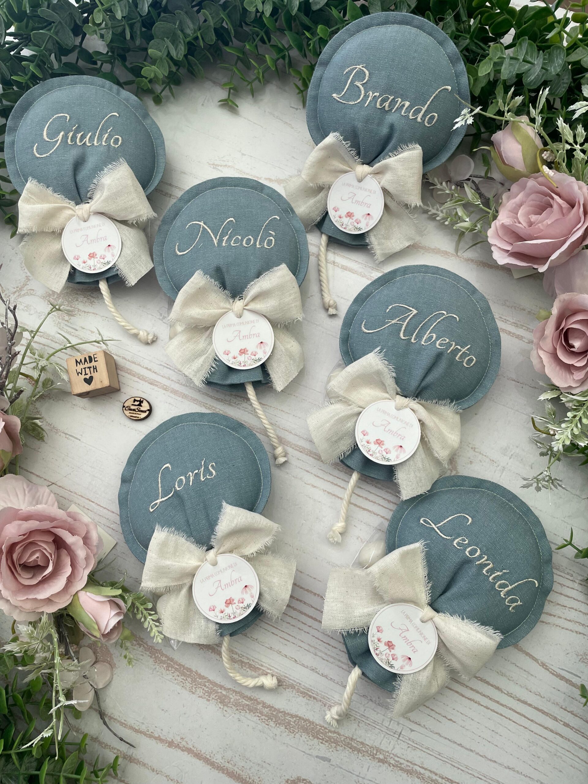 Ogni sacchetto può essere personalizzato con il nome ricamato. Ogni palloncino può riportare un nome diverso, per un effetto ancora più speciale e personalizzato.