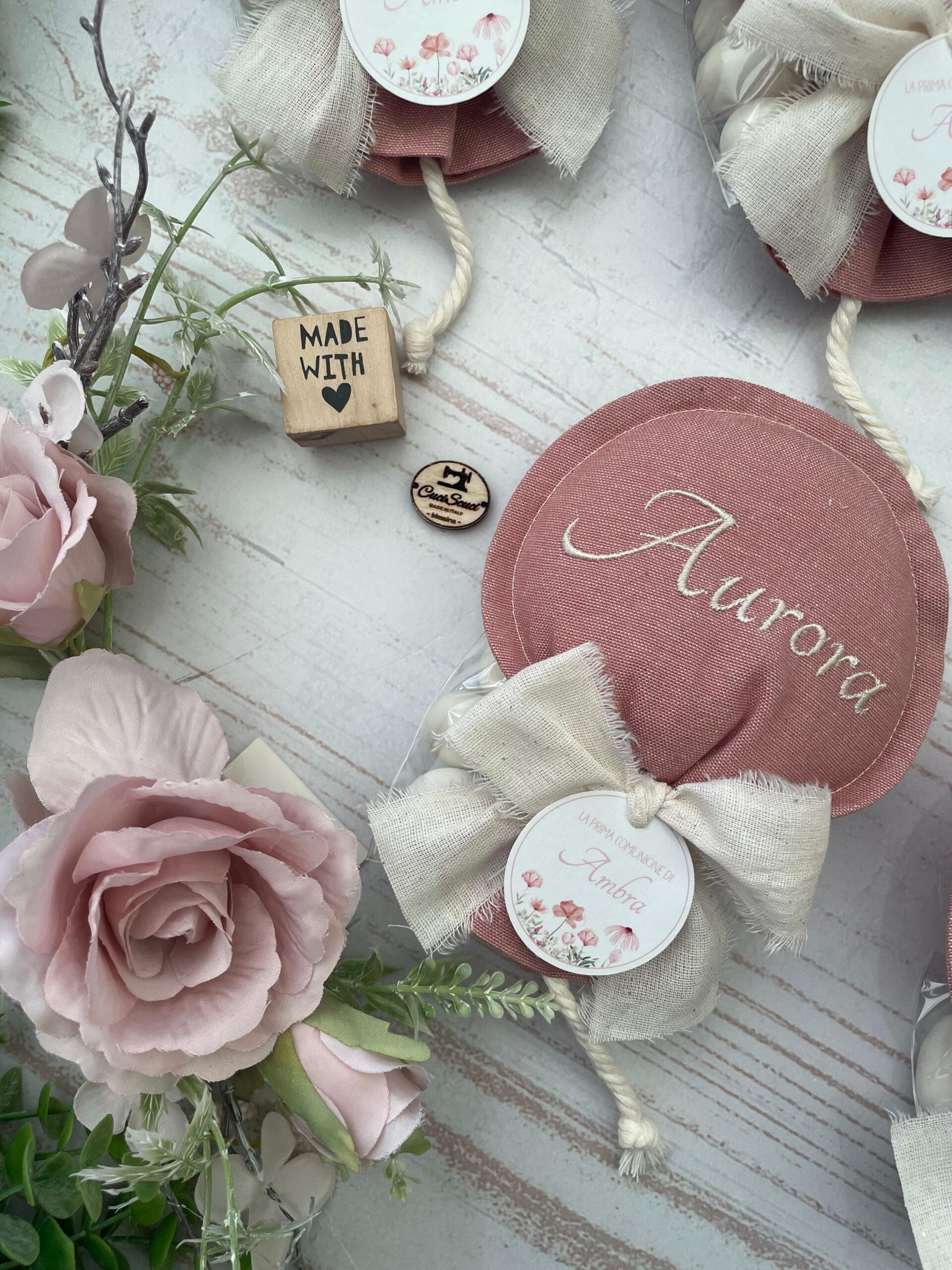 Realizzato con cotone tinto filo in fantasie assortite (o a scelta) nei toni dell’azzurro polvere e del rosa antico, con l’applicazione di un tag personalizzato.