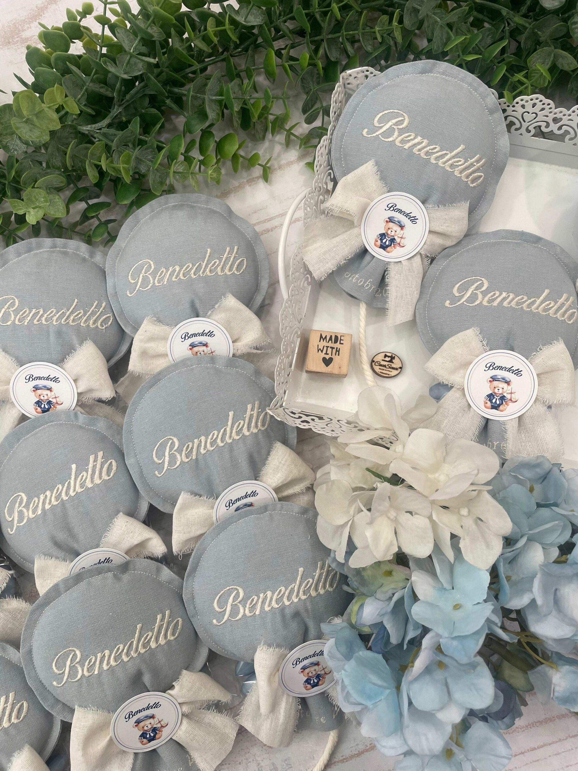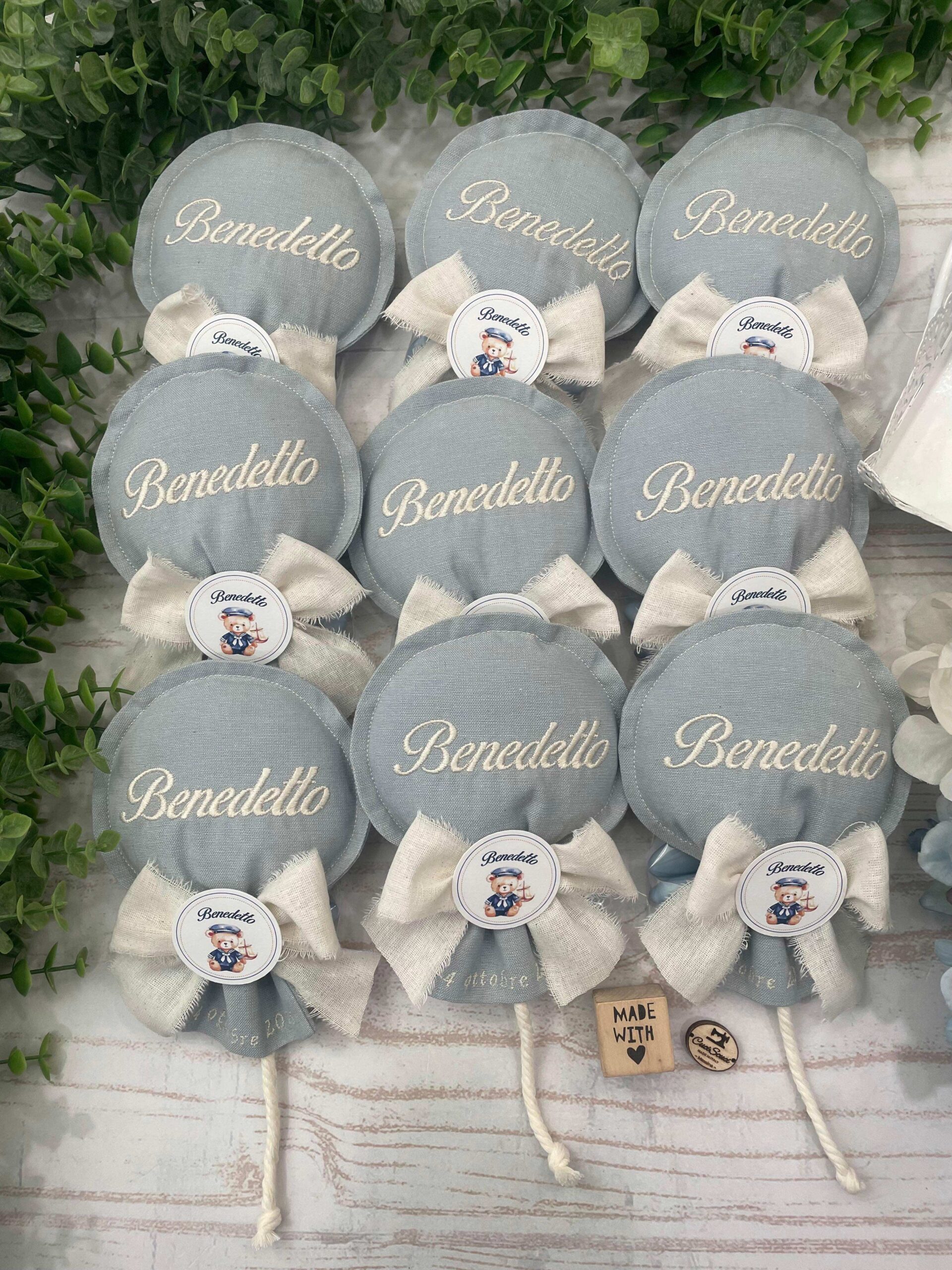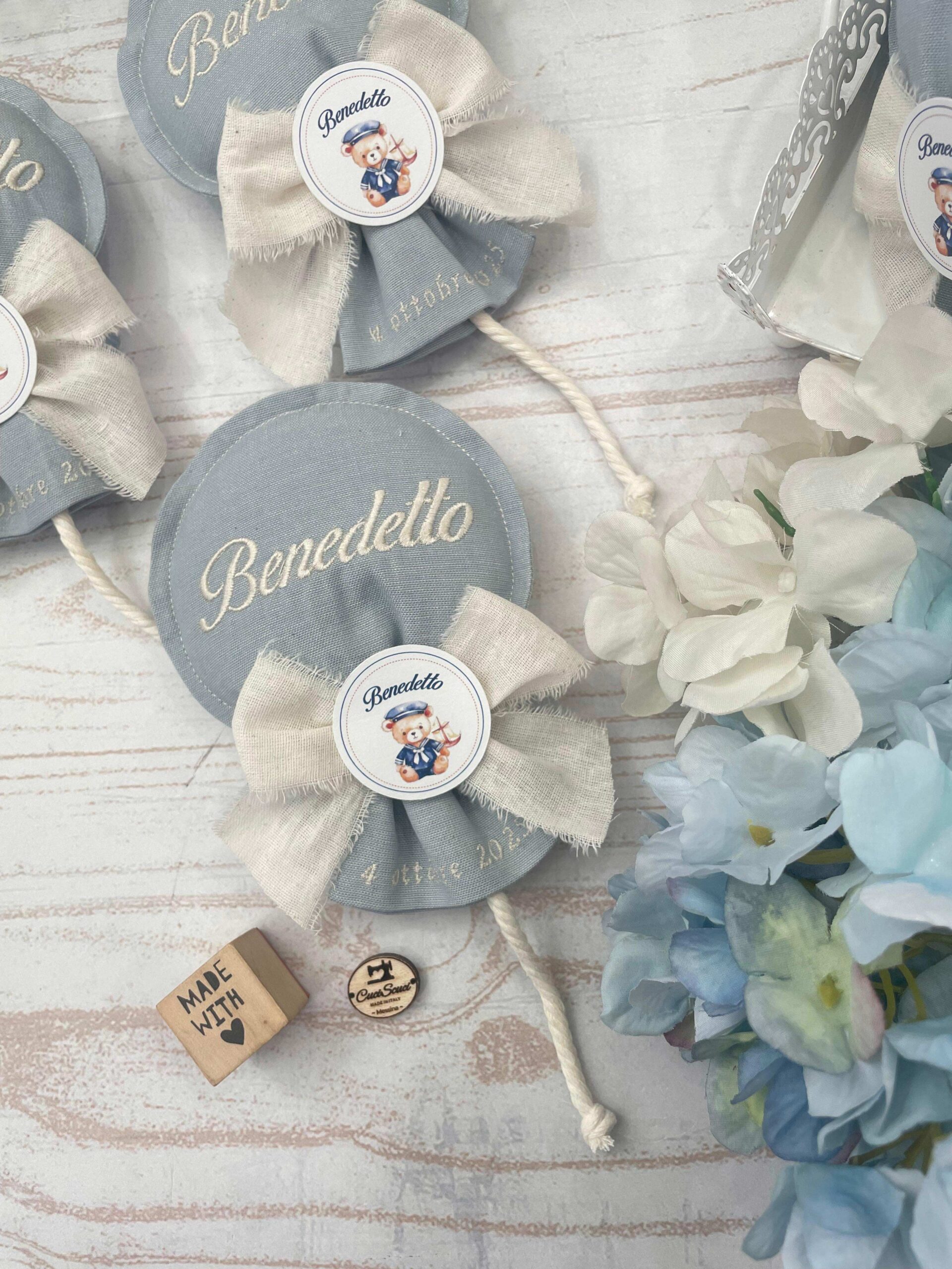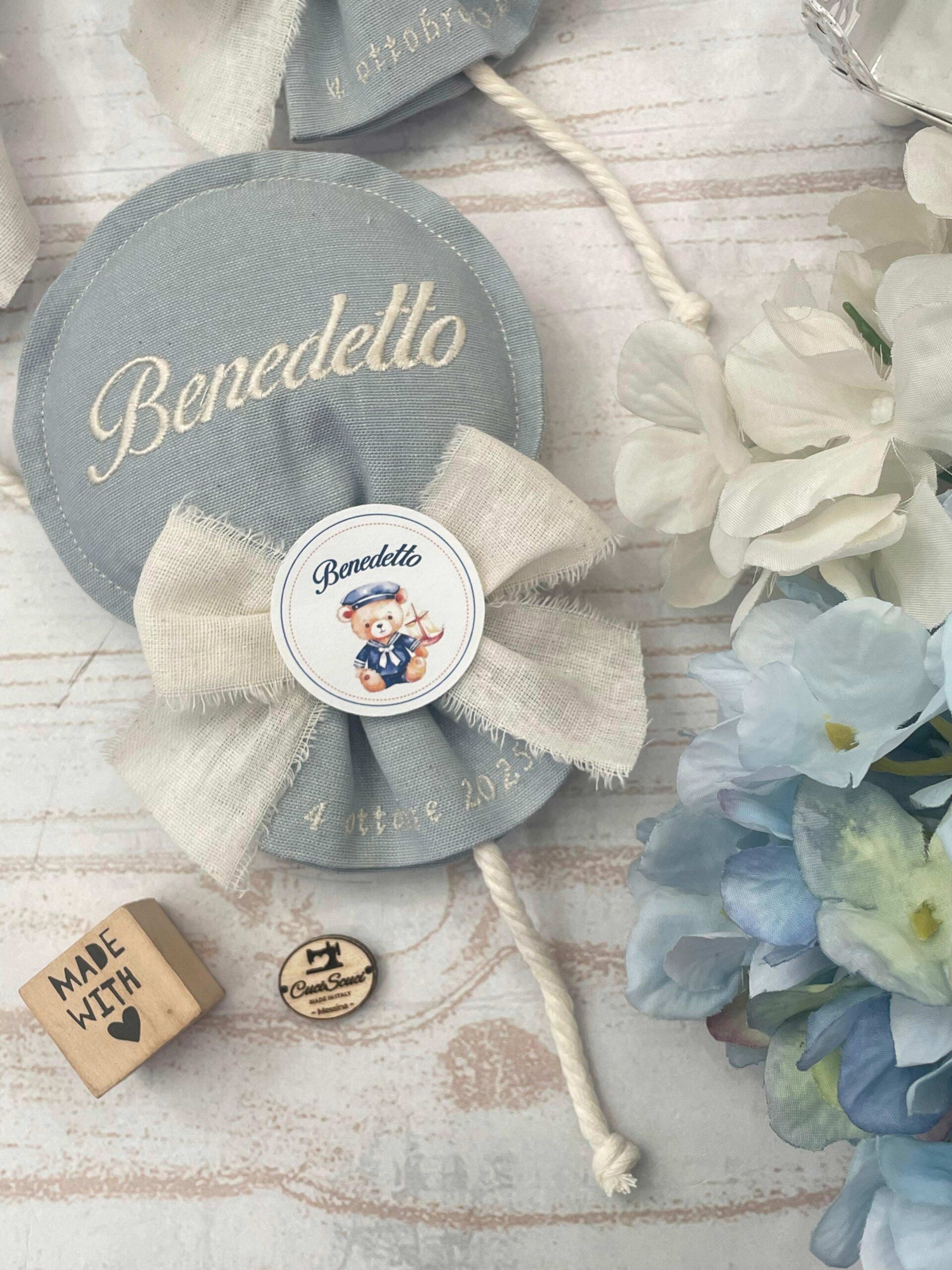Sul sacchetto è ricamato il nome del bimbo e la data dell’evento.