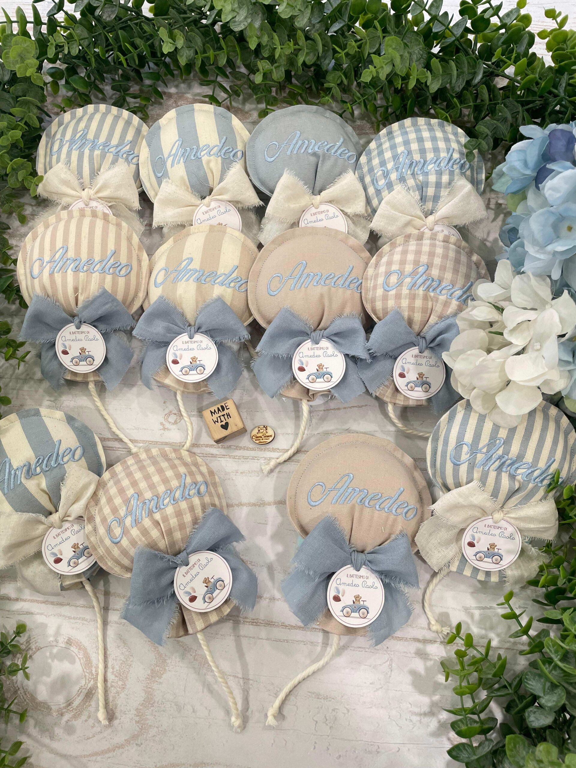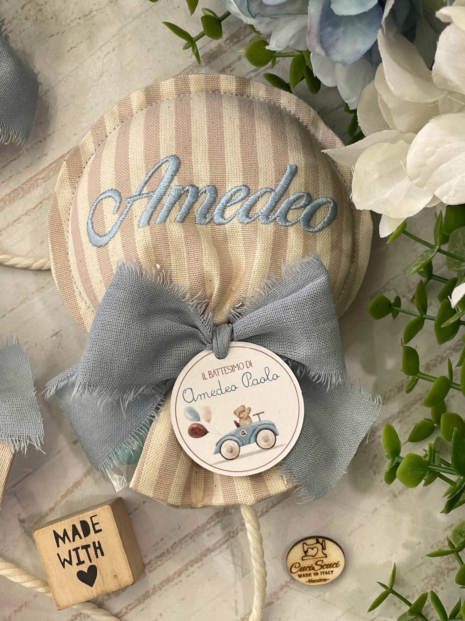La bomboniera, pronta da donare ai tuoi ospiti, comprende il sacchetto con ricamo, confezionato con imbottitura in ovatta, fiocco abbinato, 5 confetti in busta sigillata, con o senza tag.
