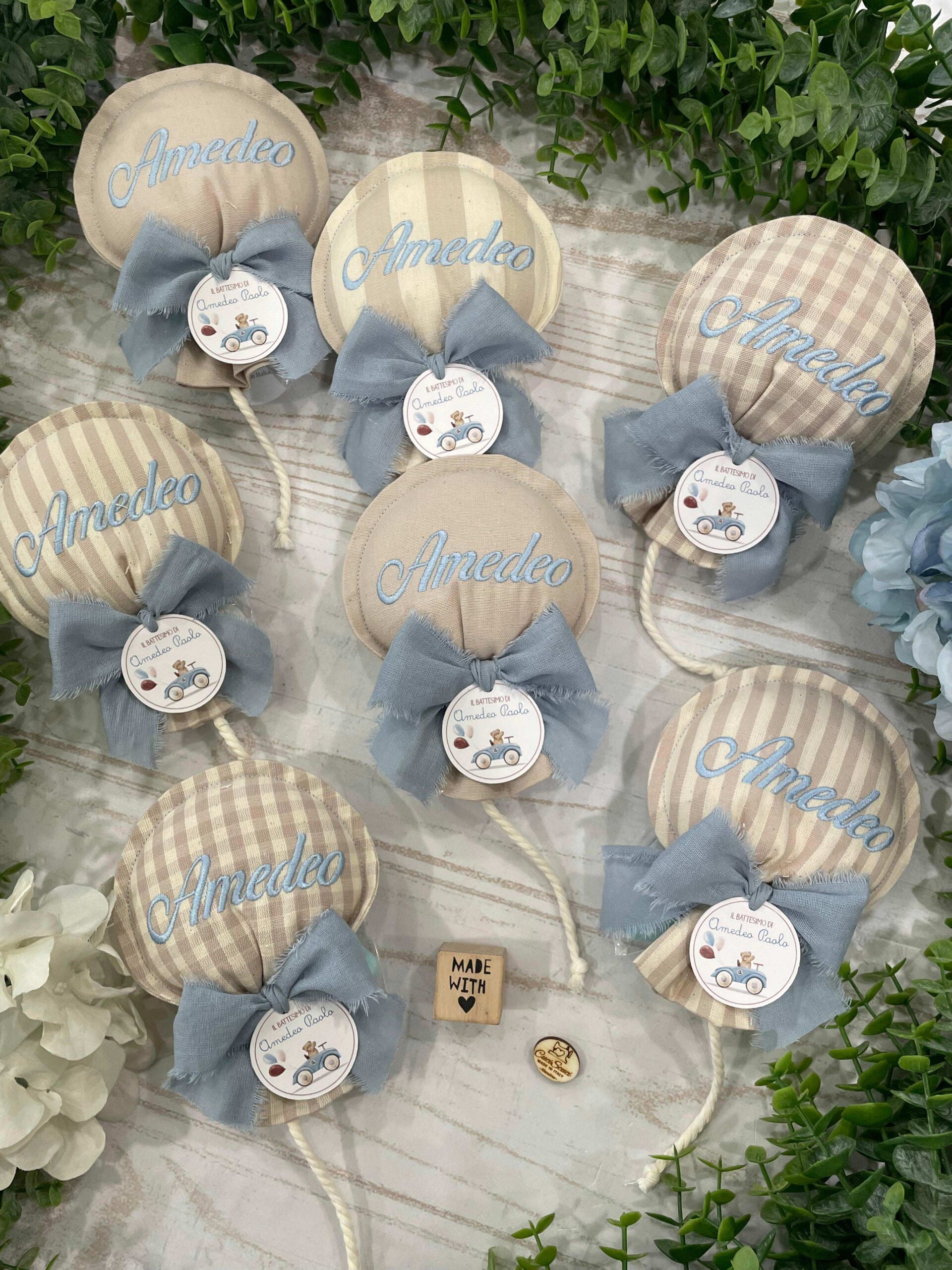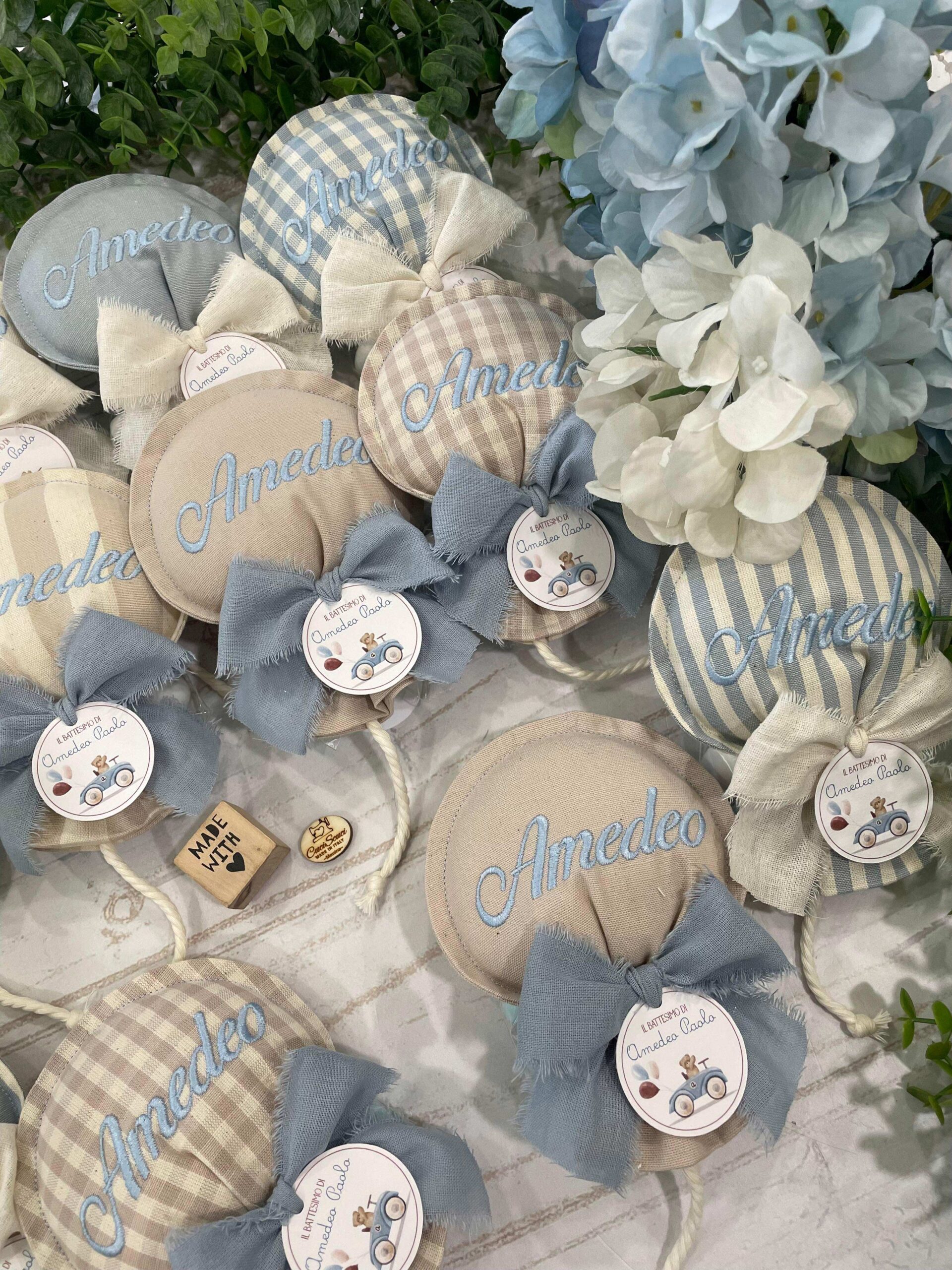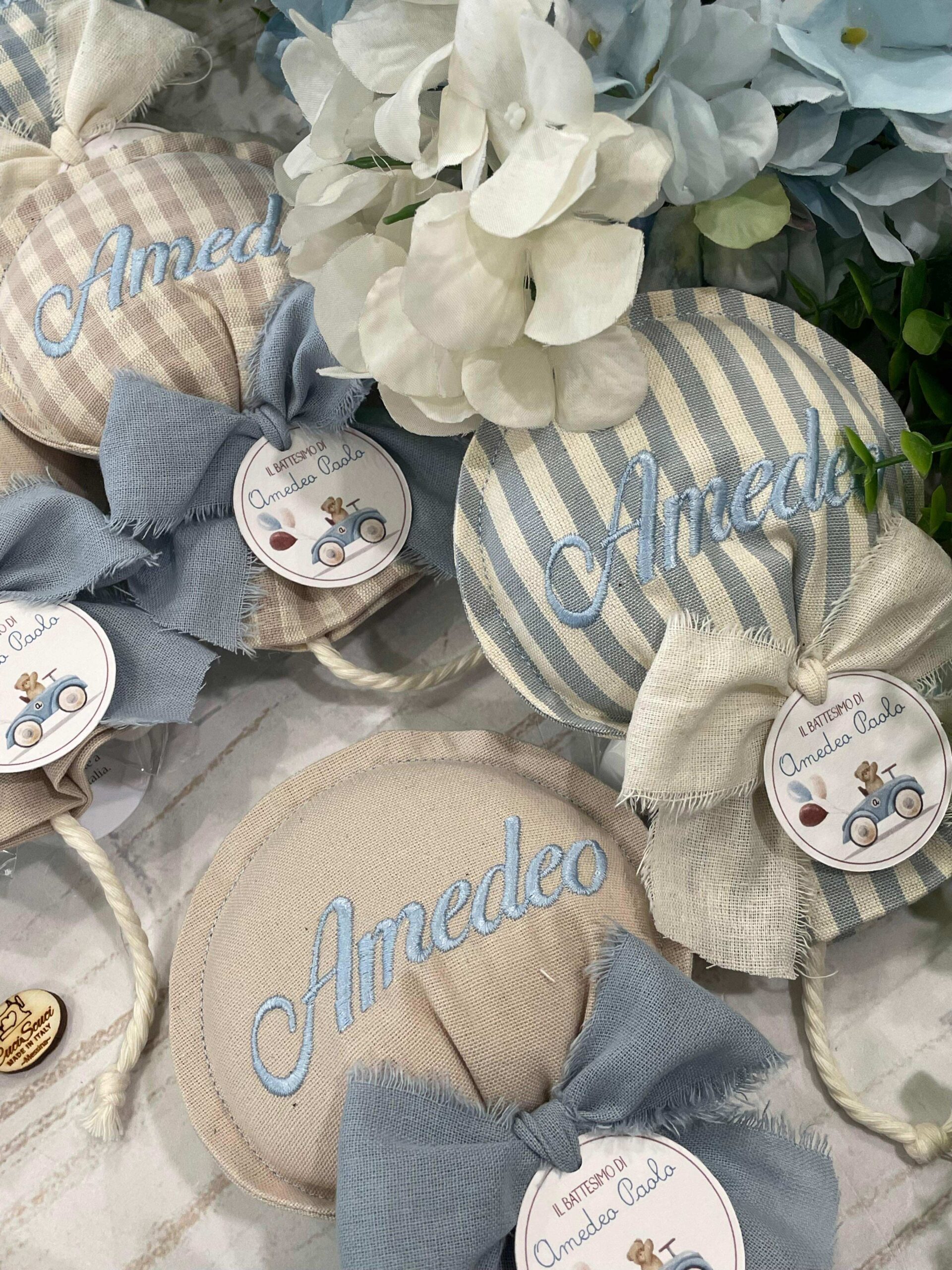 Sul sacchetto è ricamato il nome del bimbo.