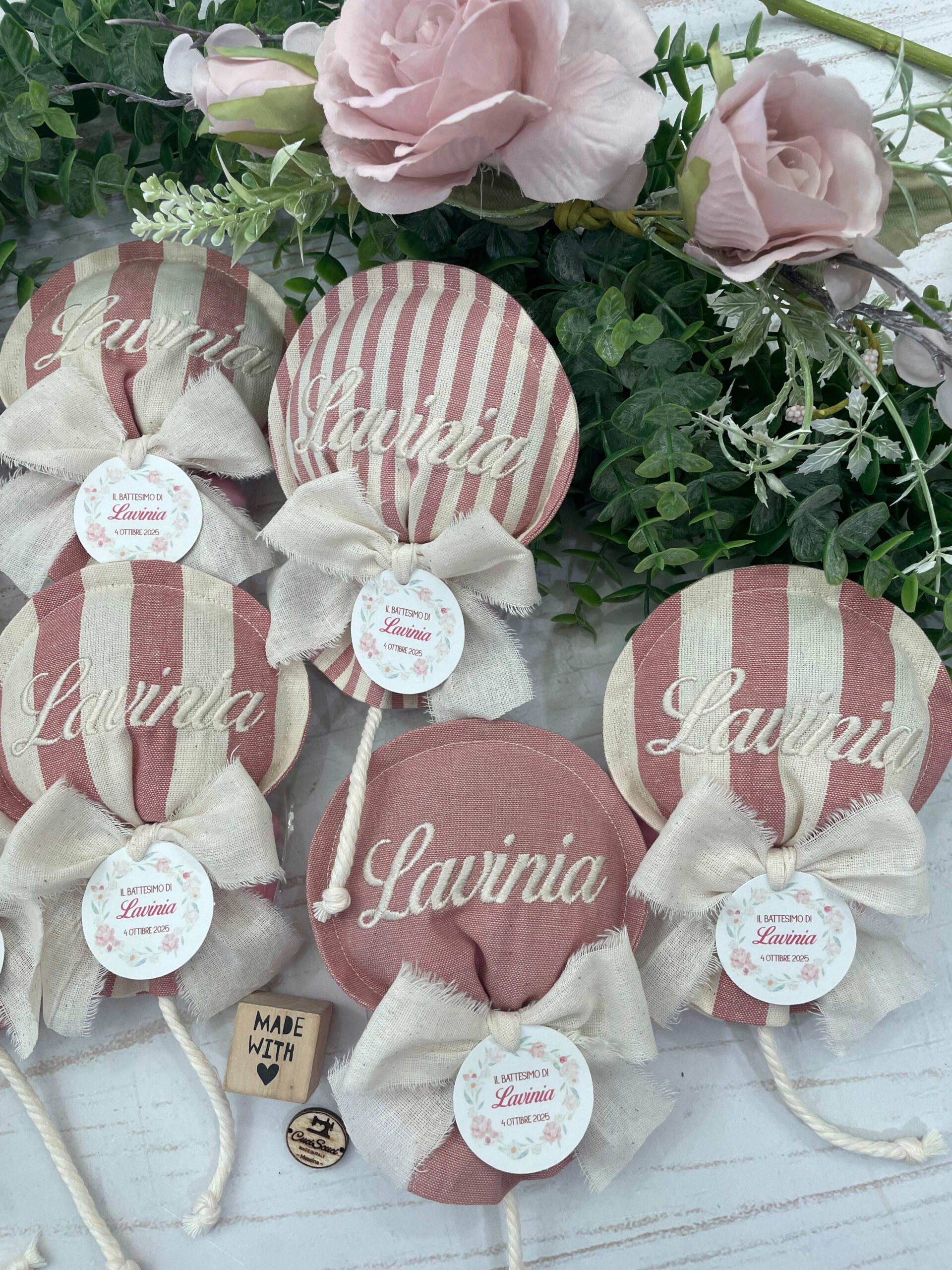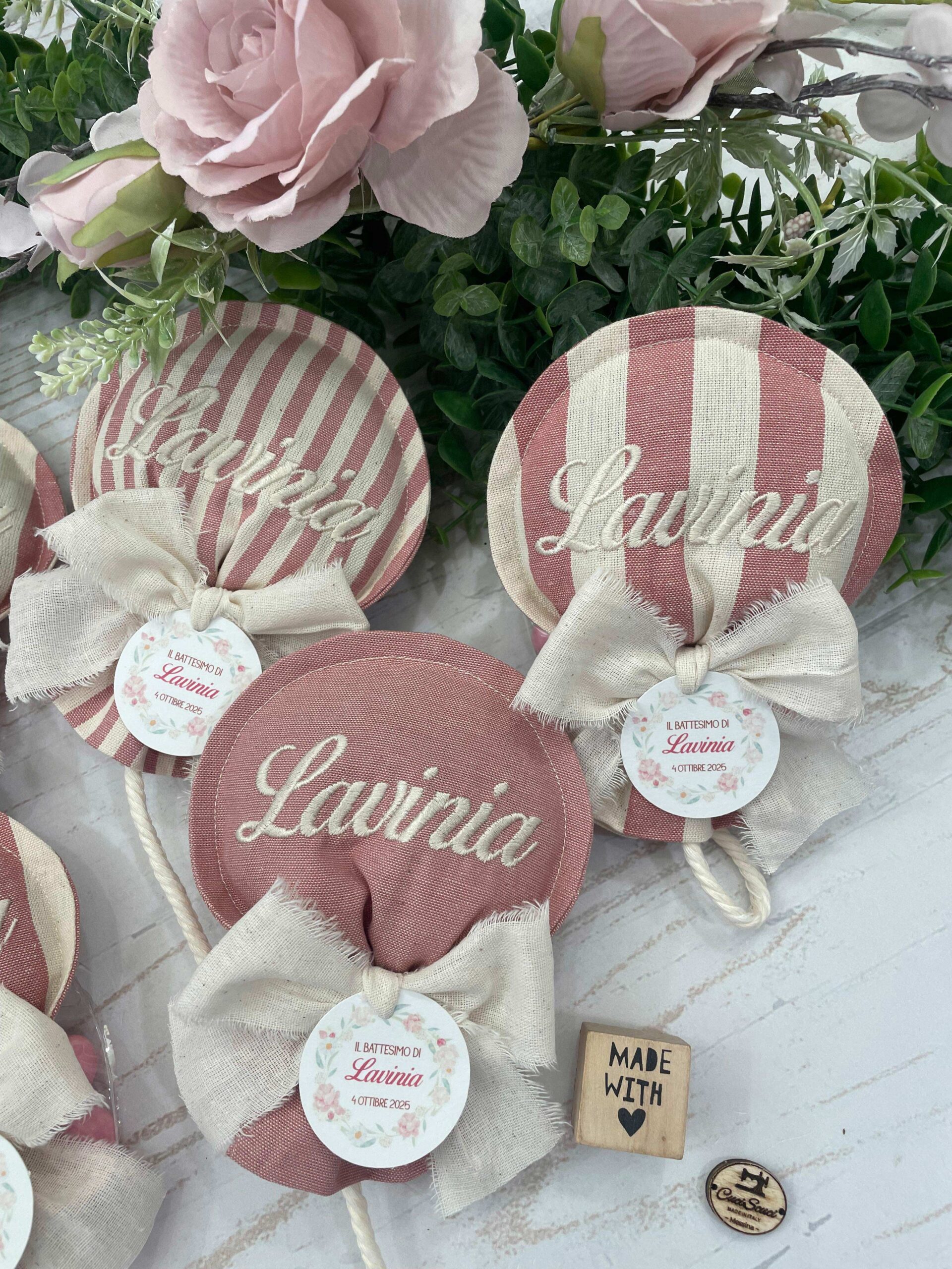 Realizzato con cotone tinto filo in fantasie assortite (o a scelta) nei toni del rosa antico e del panna, con l’applicazione di un tag personalizzato.