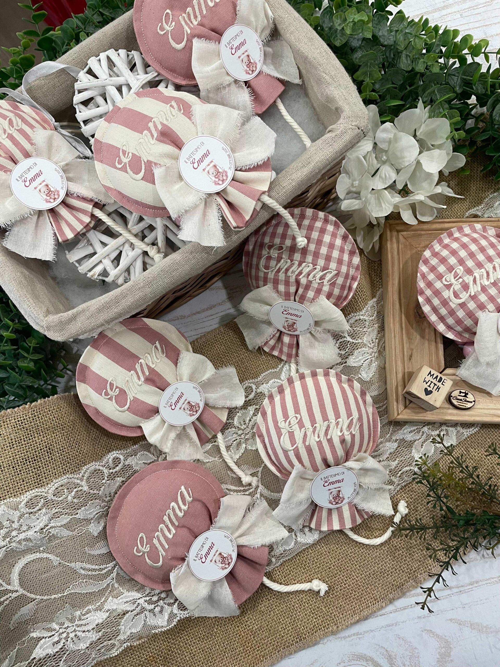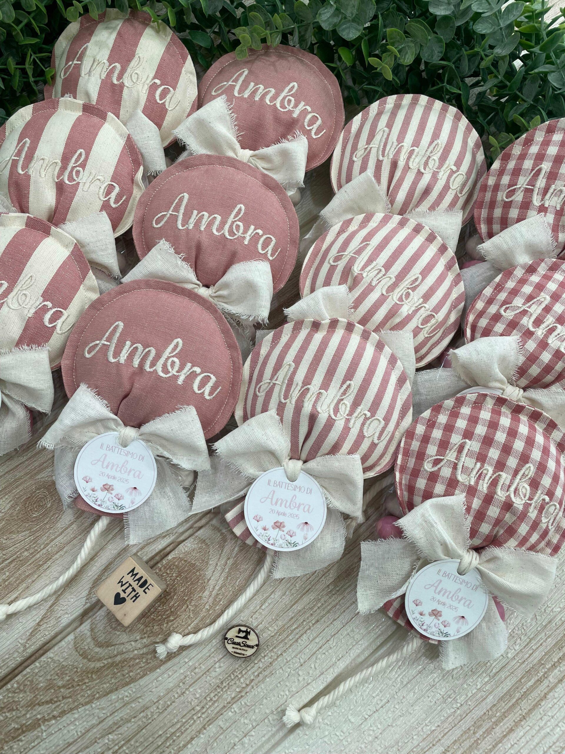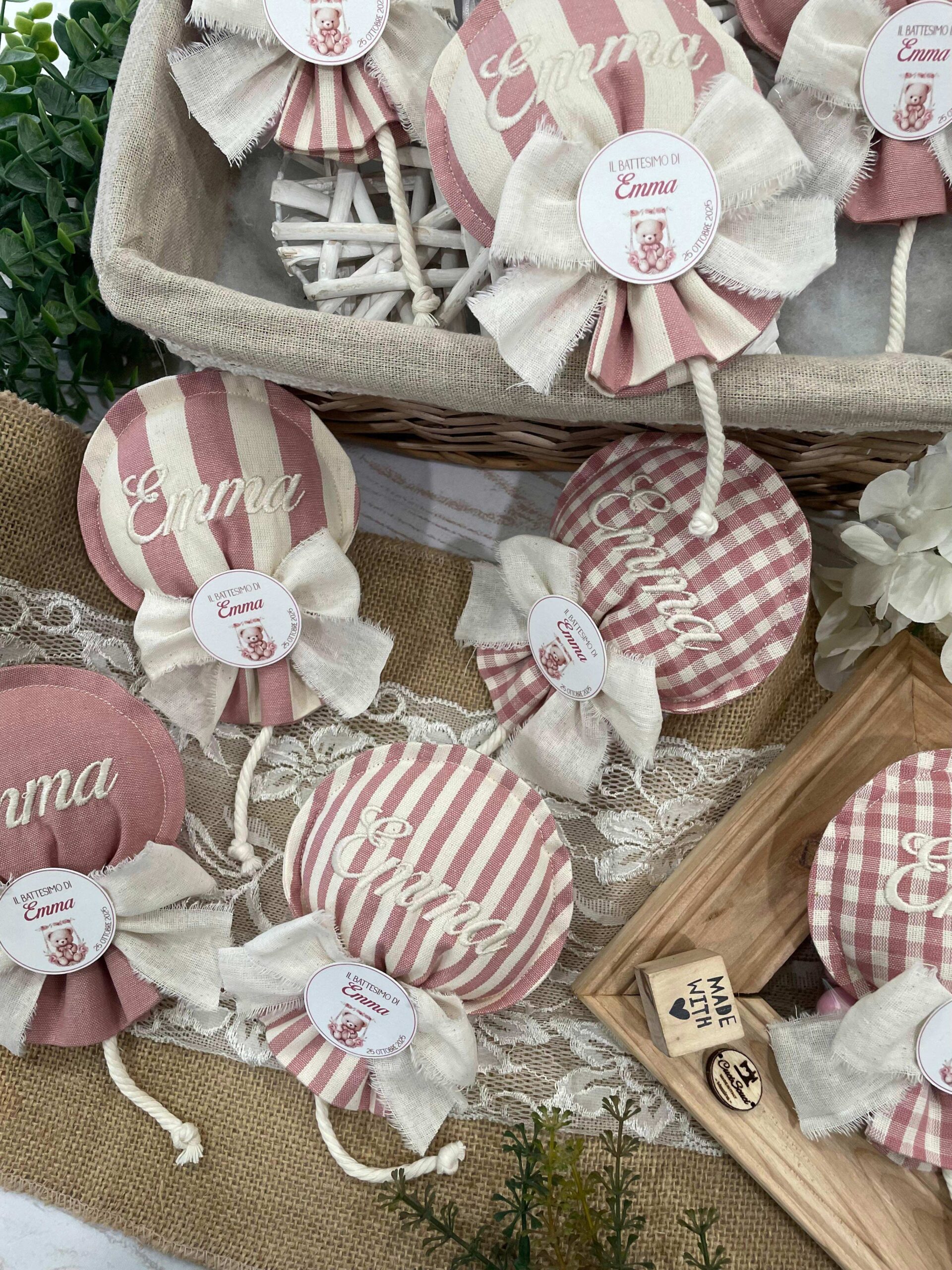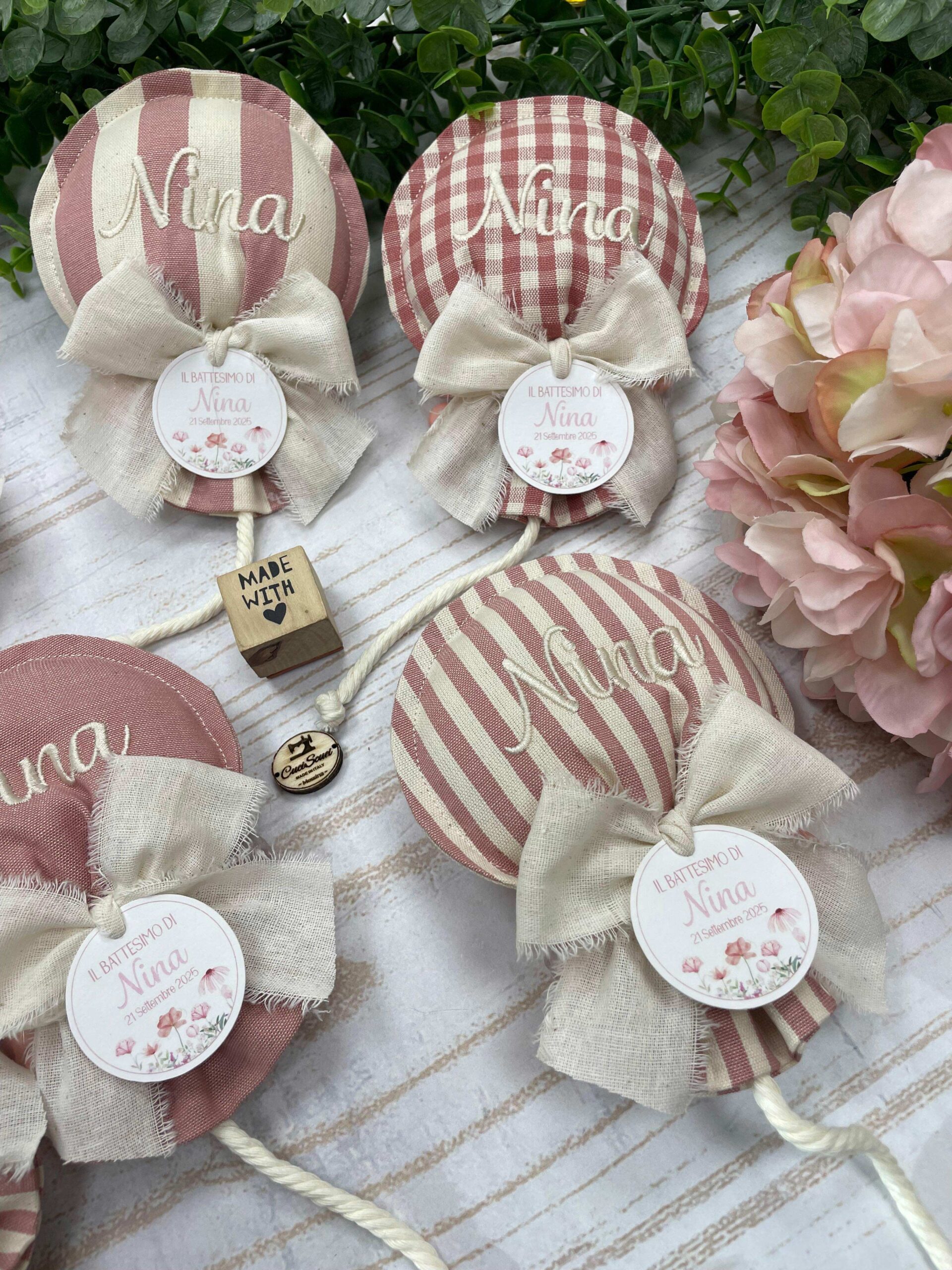 Realizzato con cotone tinto filo in fantasie assortite (o a scelta) nei toni del rosa antico e del panna con l’applicazione di un tag personalizzato.