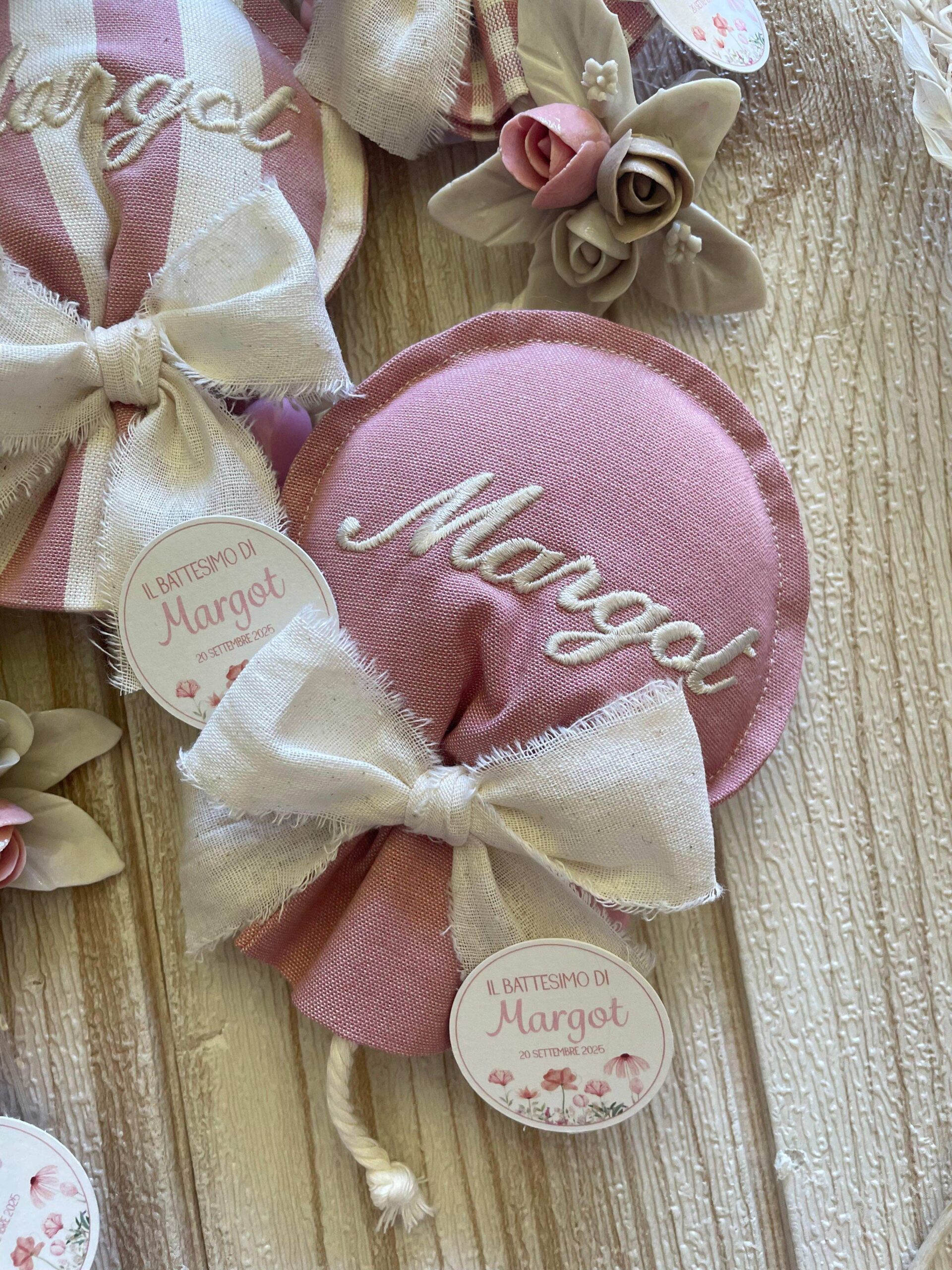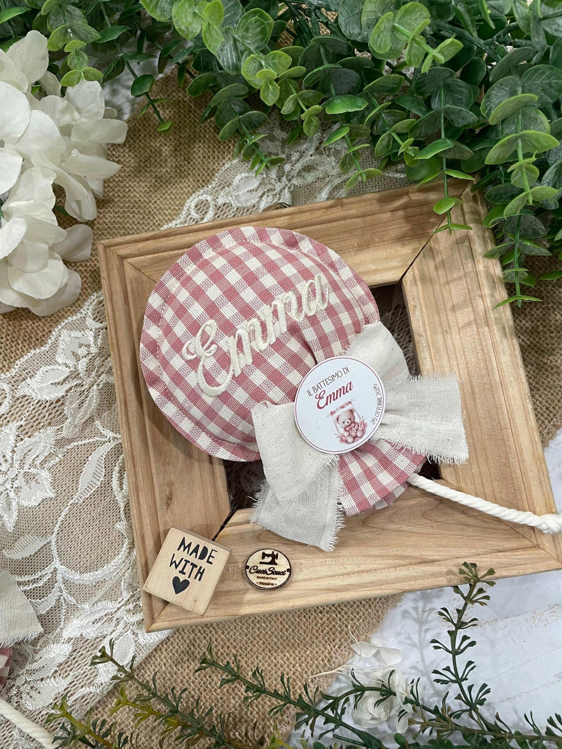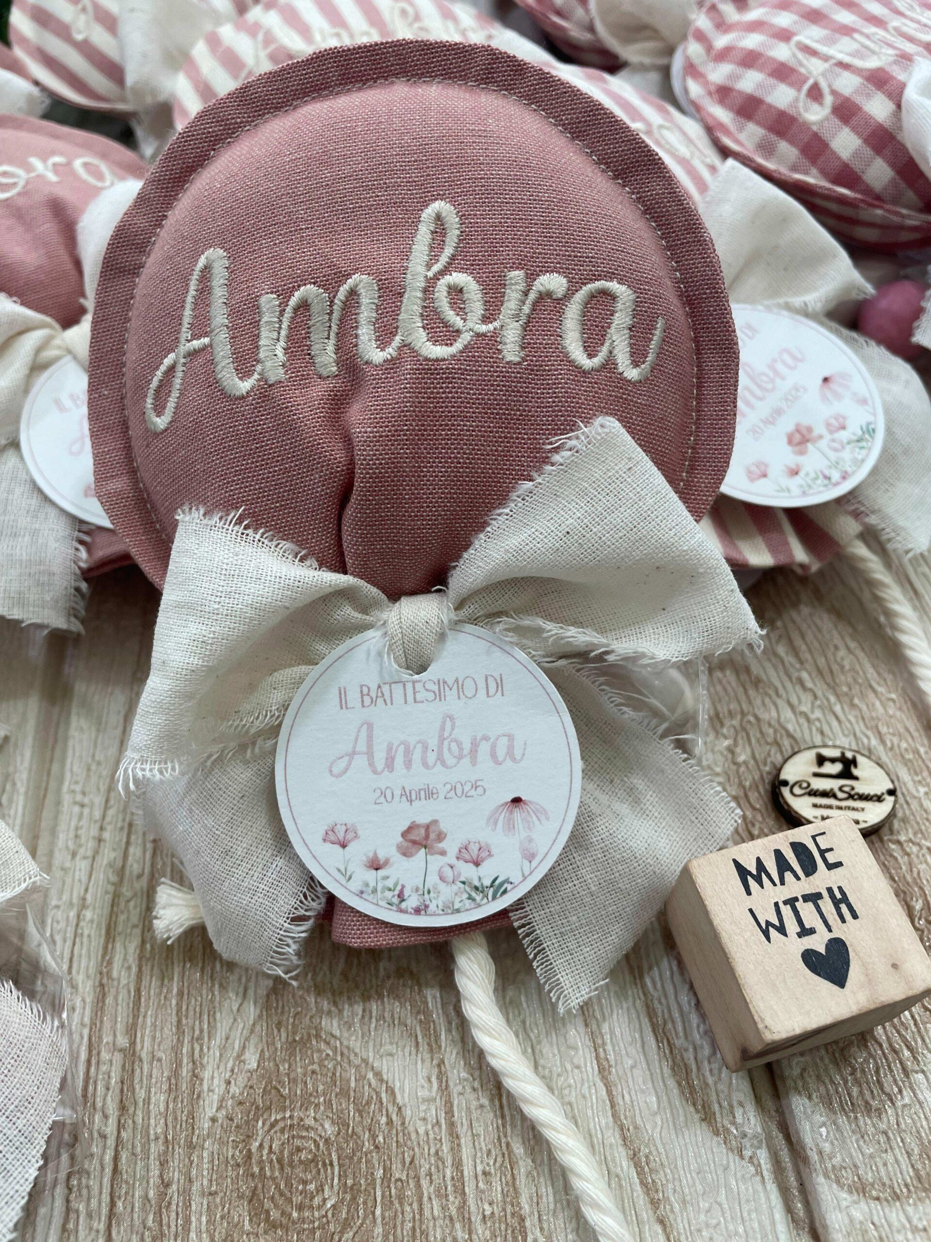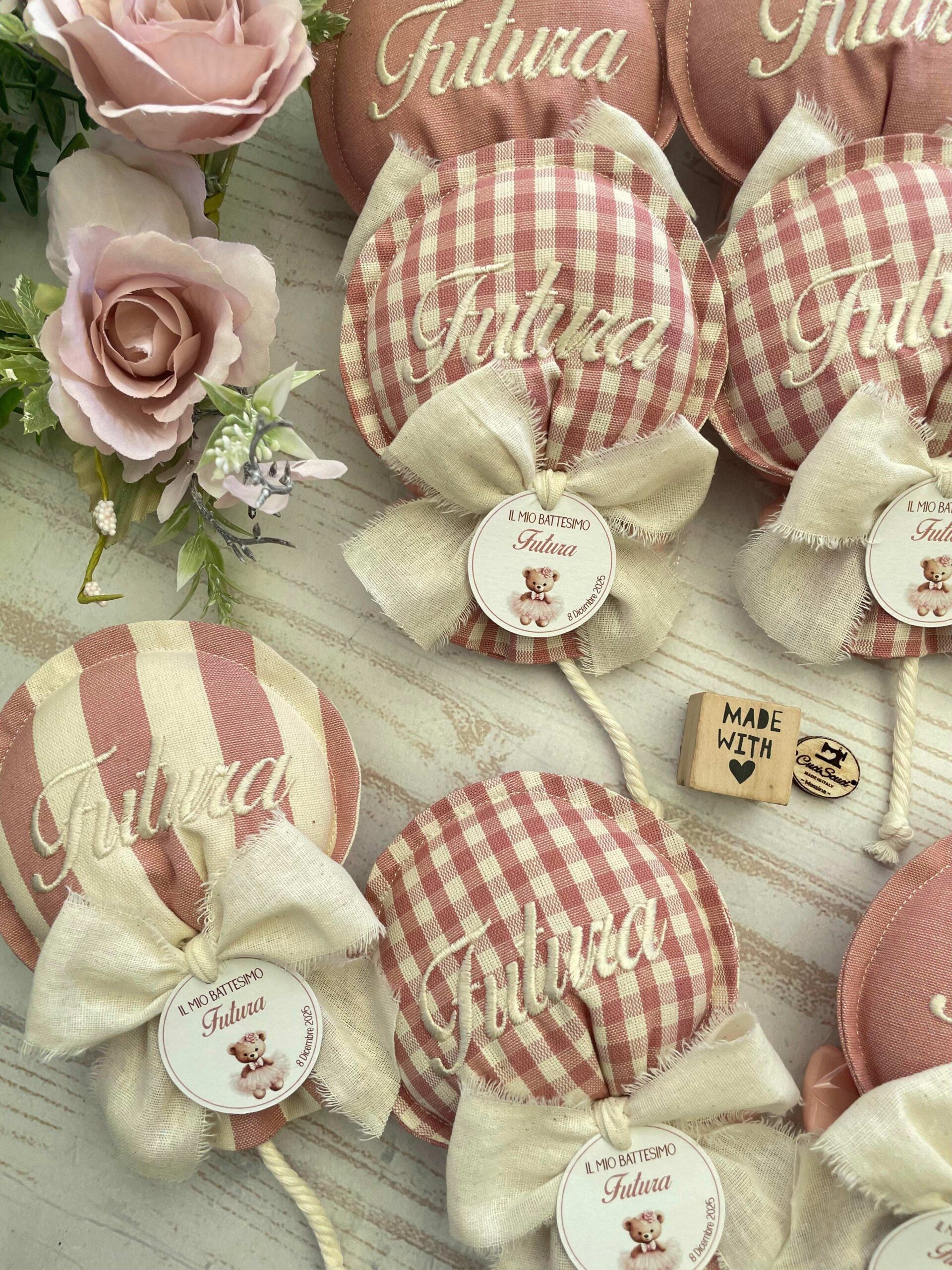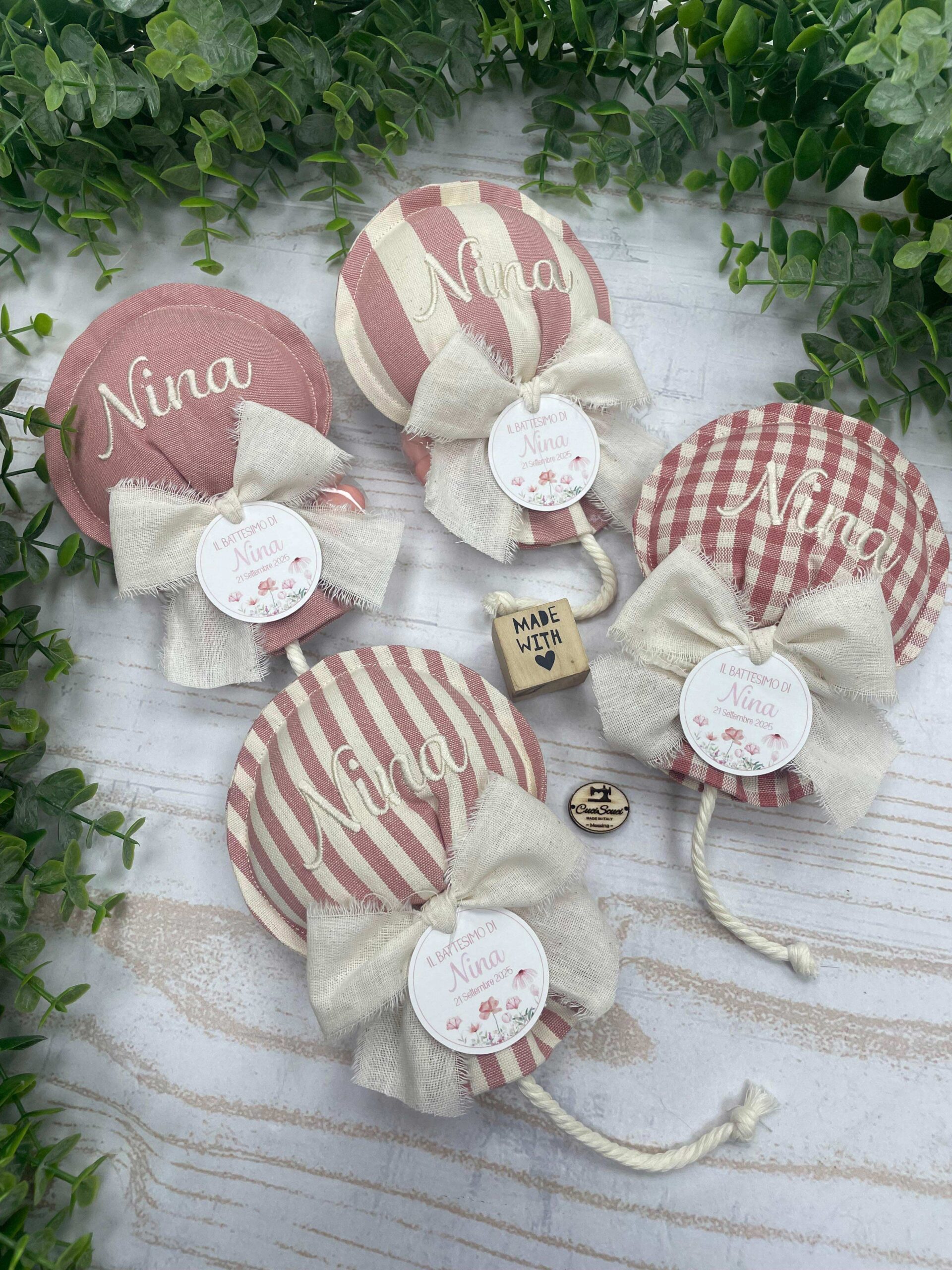 Realizzato con cotone tinto filo in fantasie assortite (o a scelta) nei toni del rosa antico e del panna con l’applicazione di un tag personalizzato.