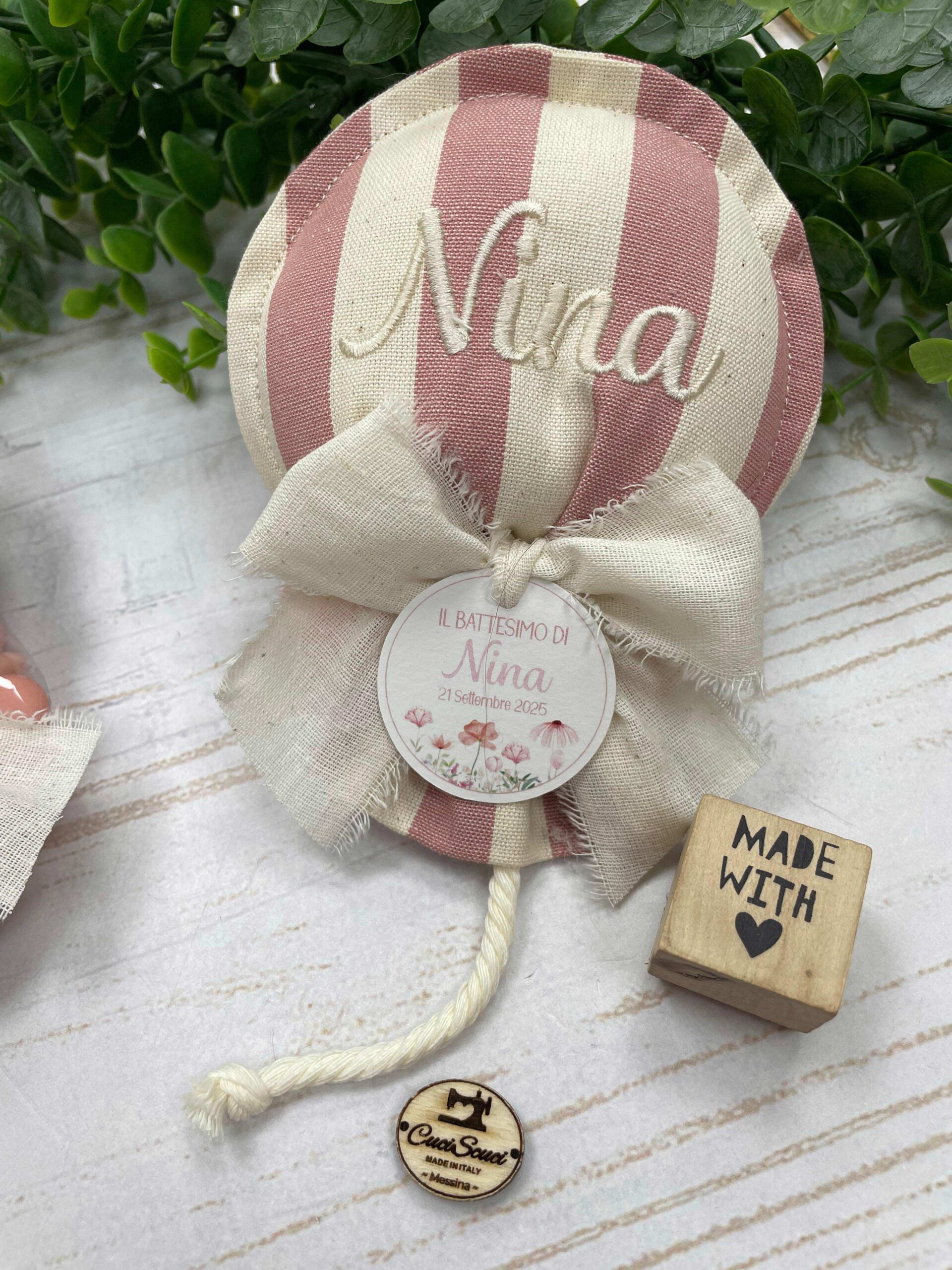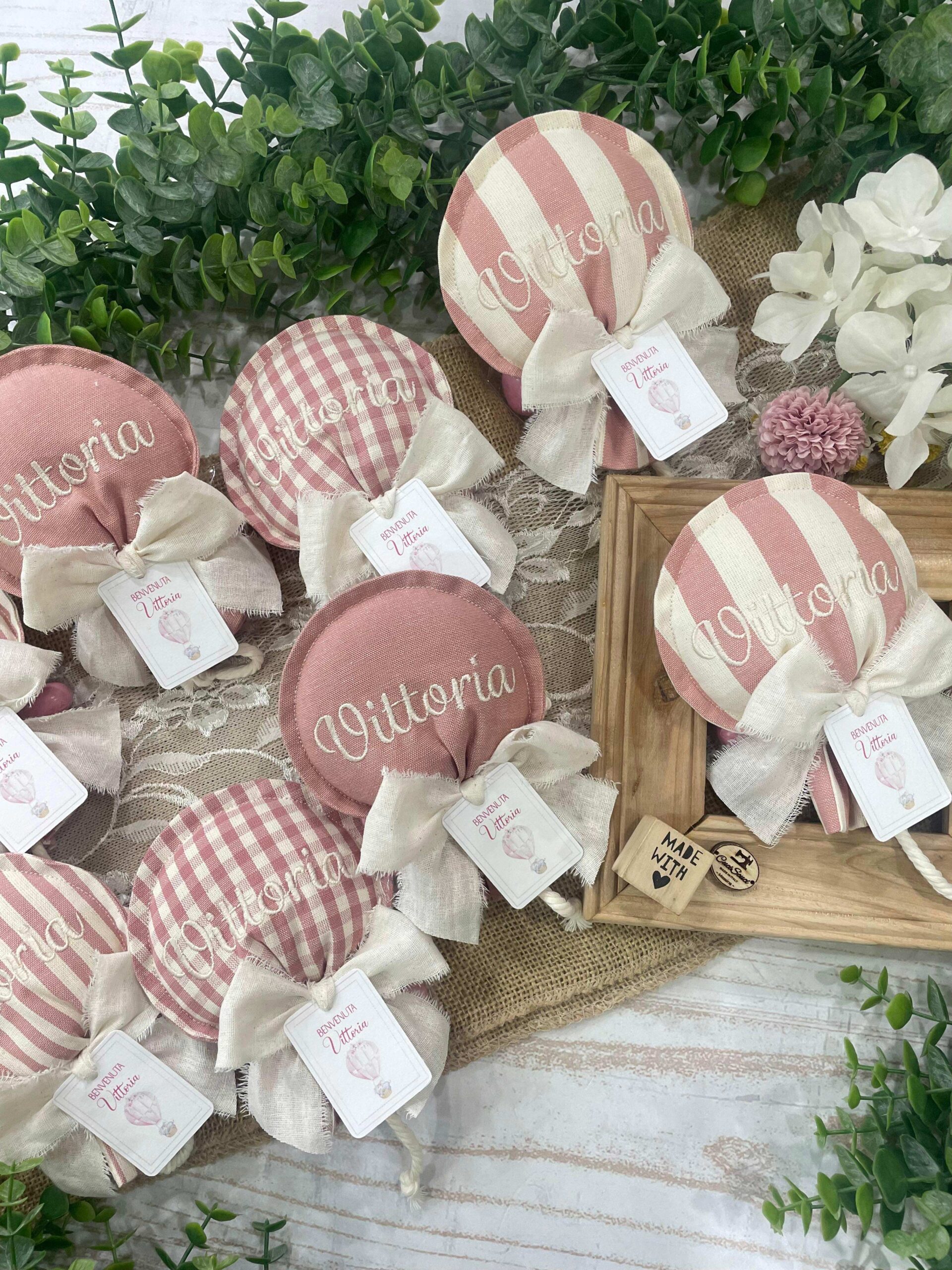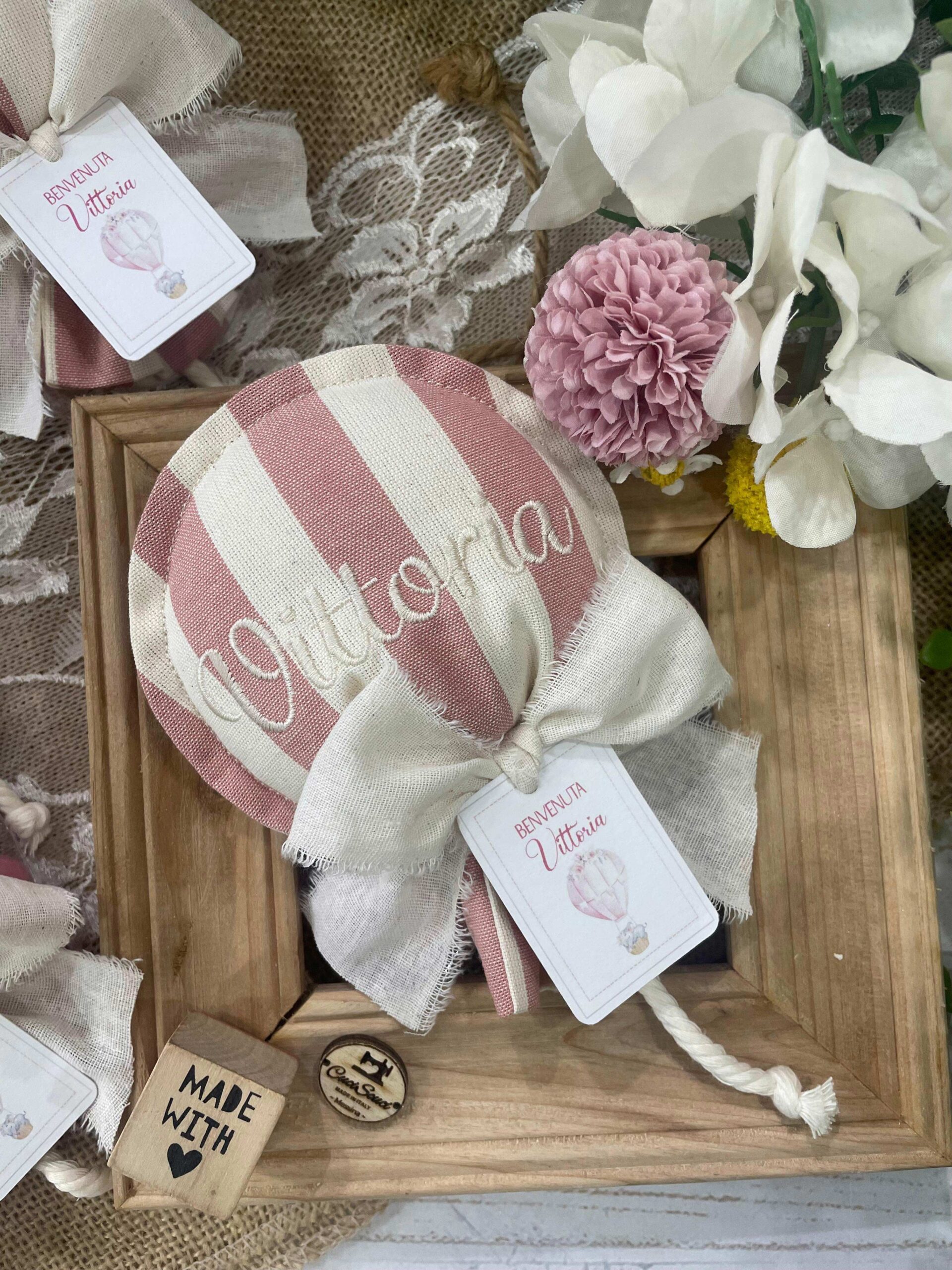 Al centro del palloncino è ricamato il nome della bimba.