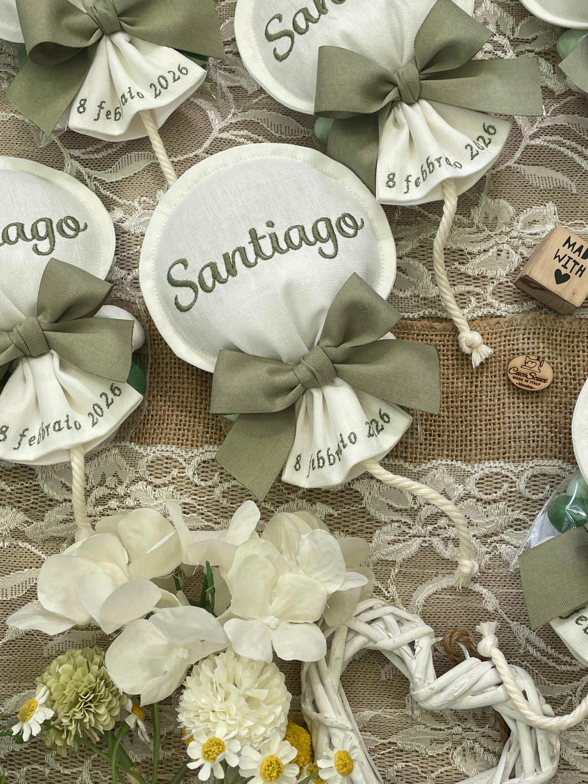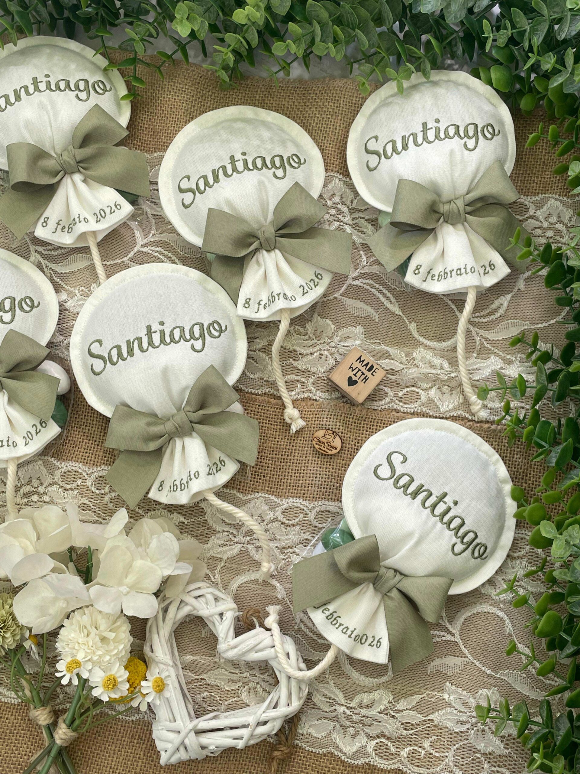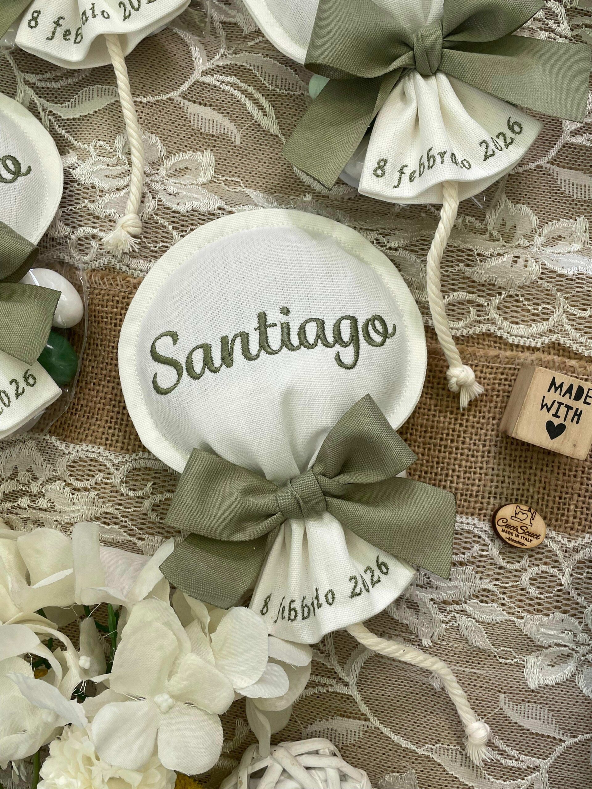Sul sacchetto è ricamato il nome del bimbo e la data dell’evento.