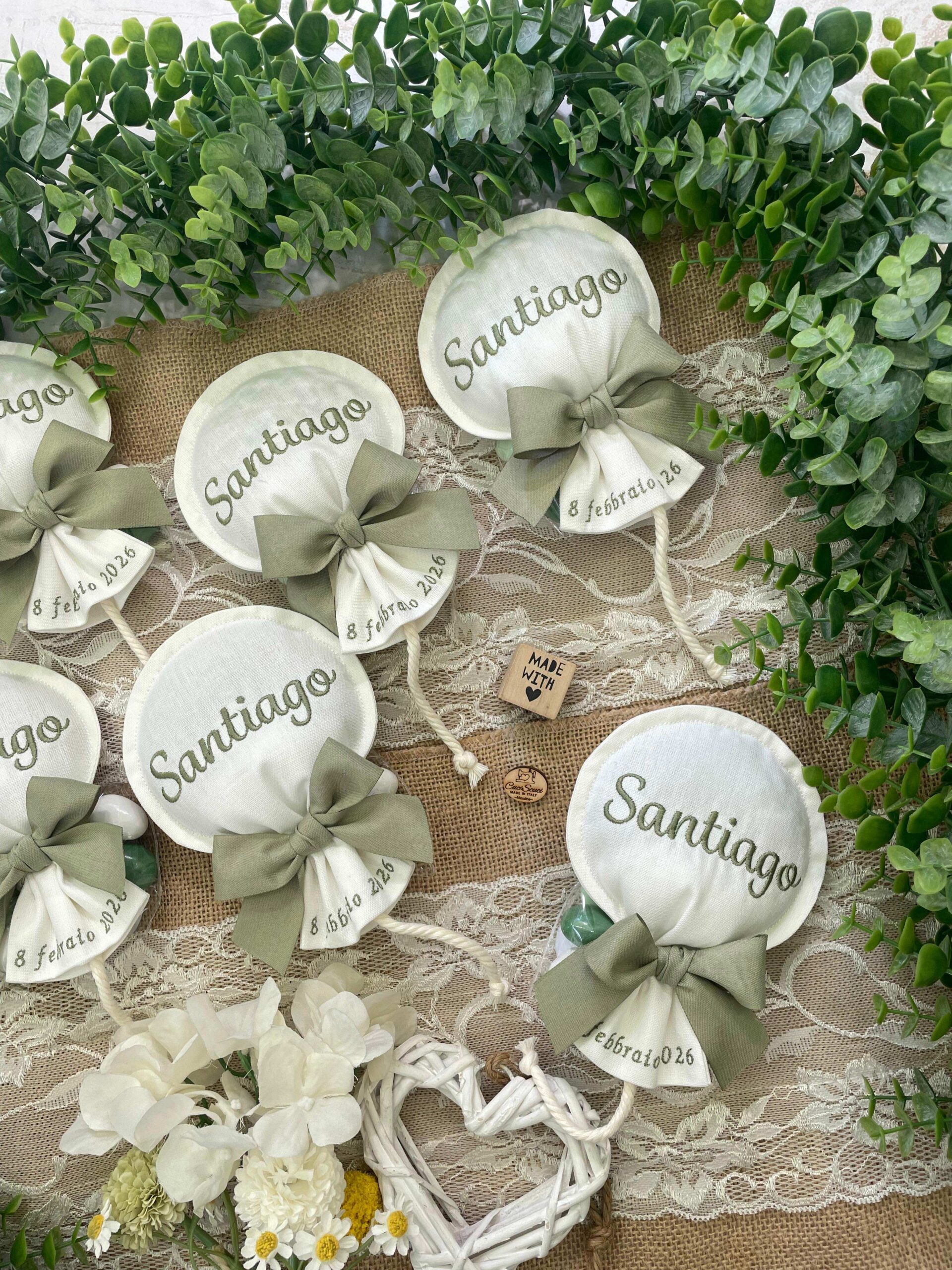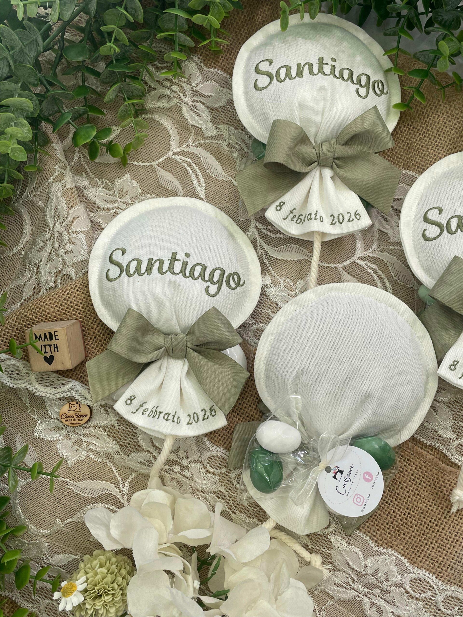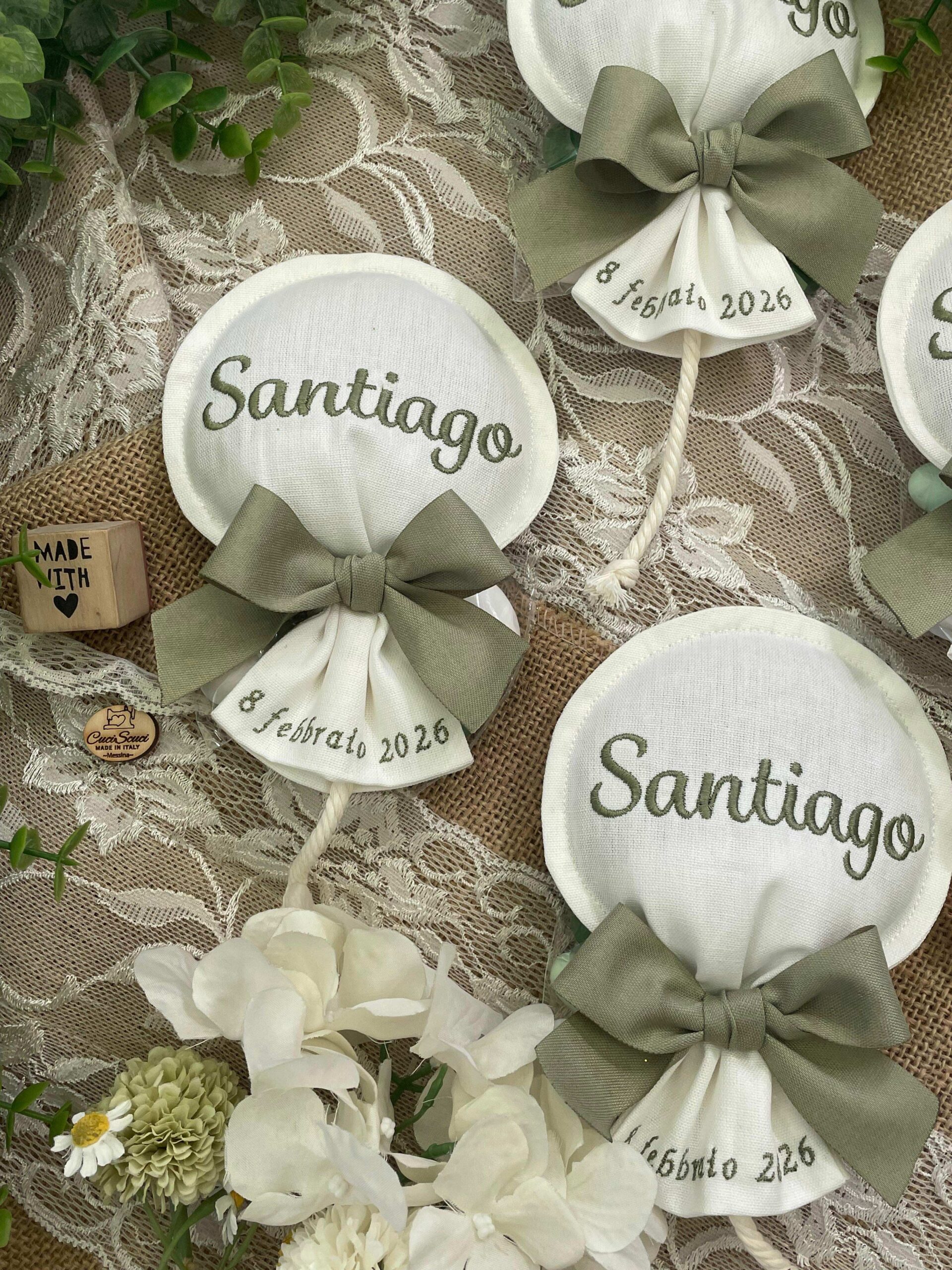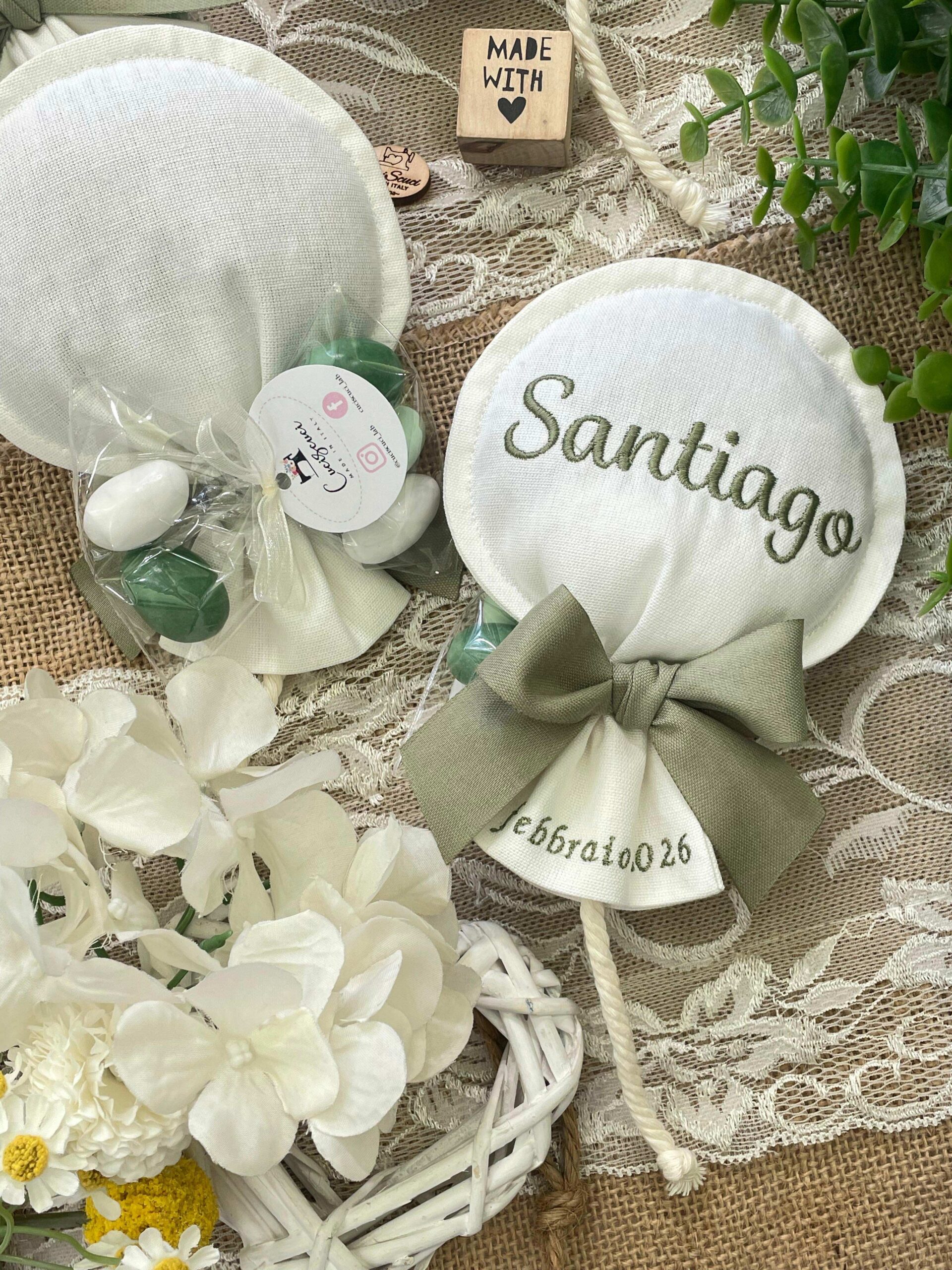 Sul sacchetto è ricamato il nome del bimbo e la data dell’evento.
