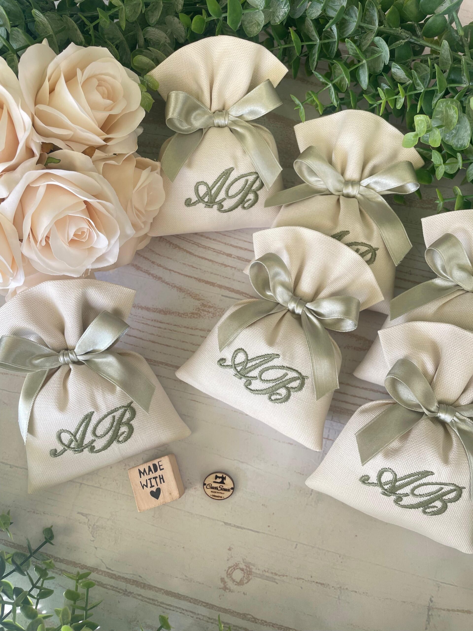 La bomboniera, pronta da donare ai tuoi ospiti, comprende il sacchetto confezionato con imbottitura in ovatta, fiocco abbinato e 5 confetti in busta sigillata, a scelta se con o senza tag.
