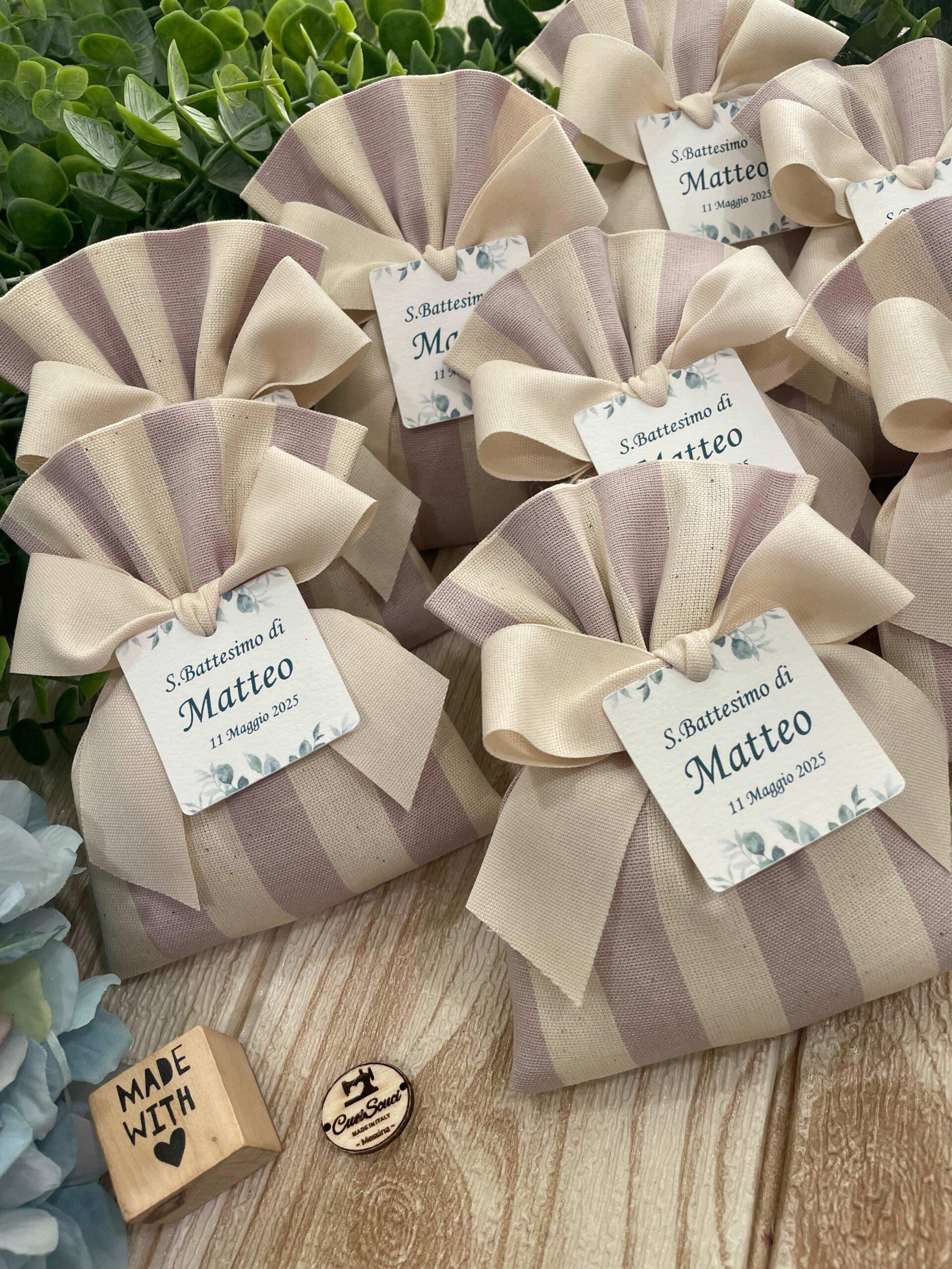 La bomboniera, pronta da donare ai tuoi ospiti, comprende il sacchetto, confezionato con imbottitura in ovatta, fiocco abbinato e 5 confetti in busta sigillata, con o senza tag.
