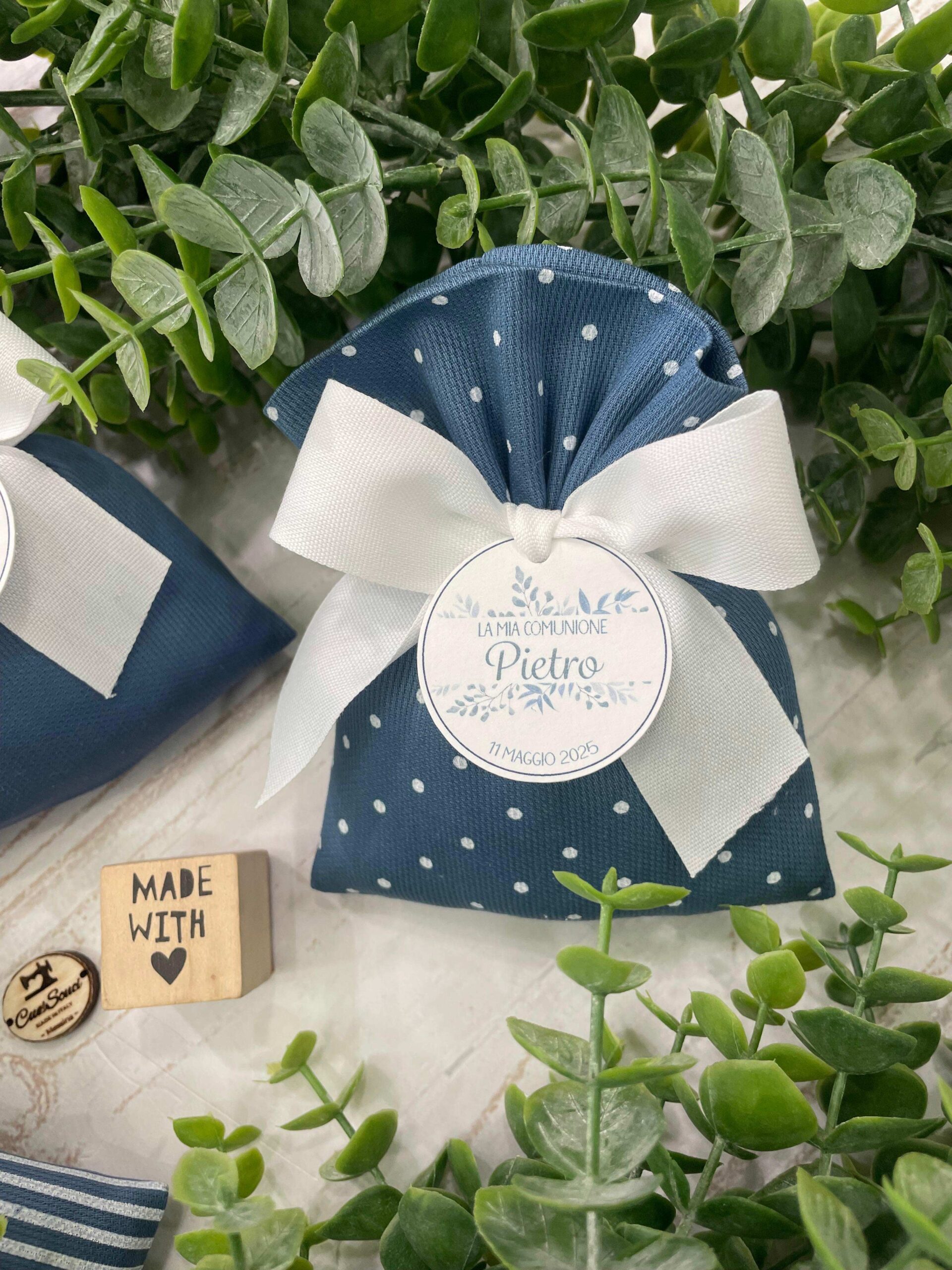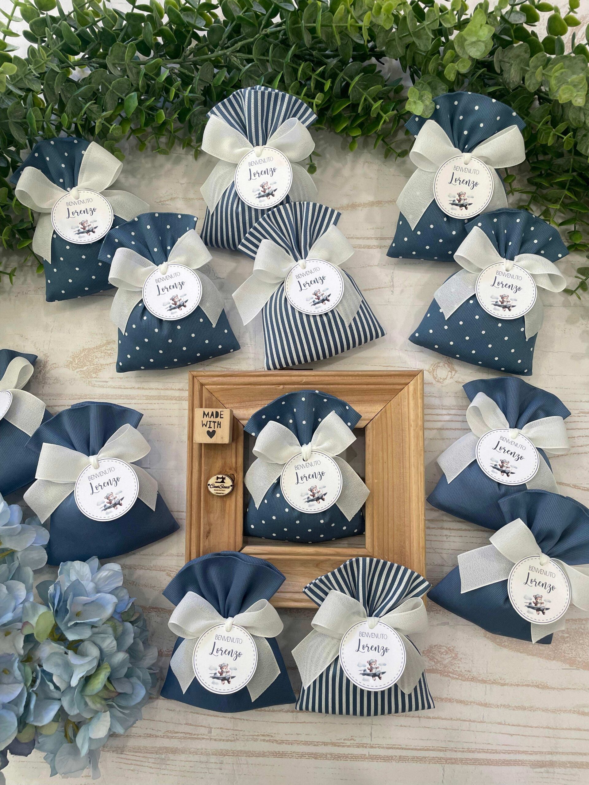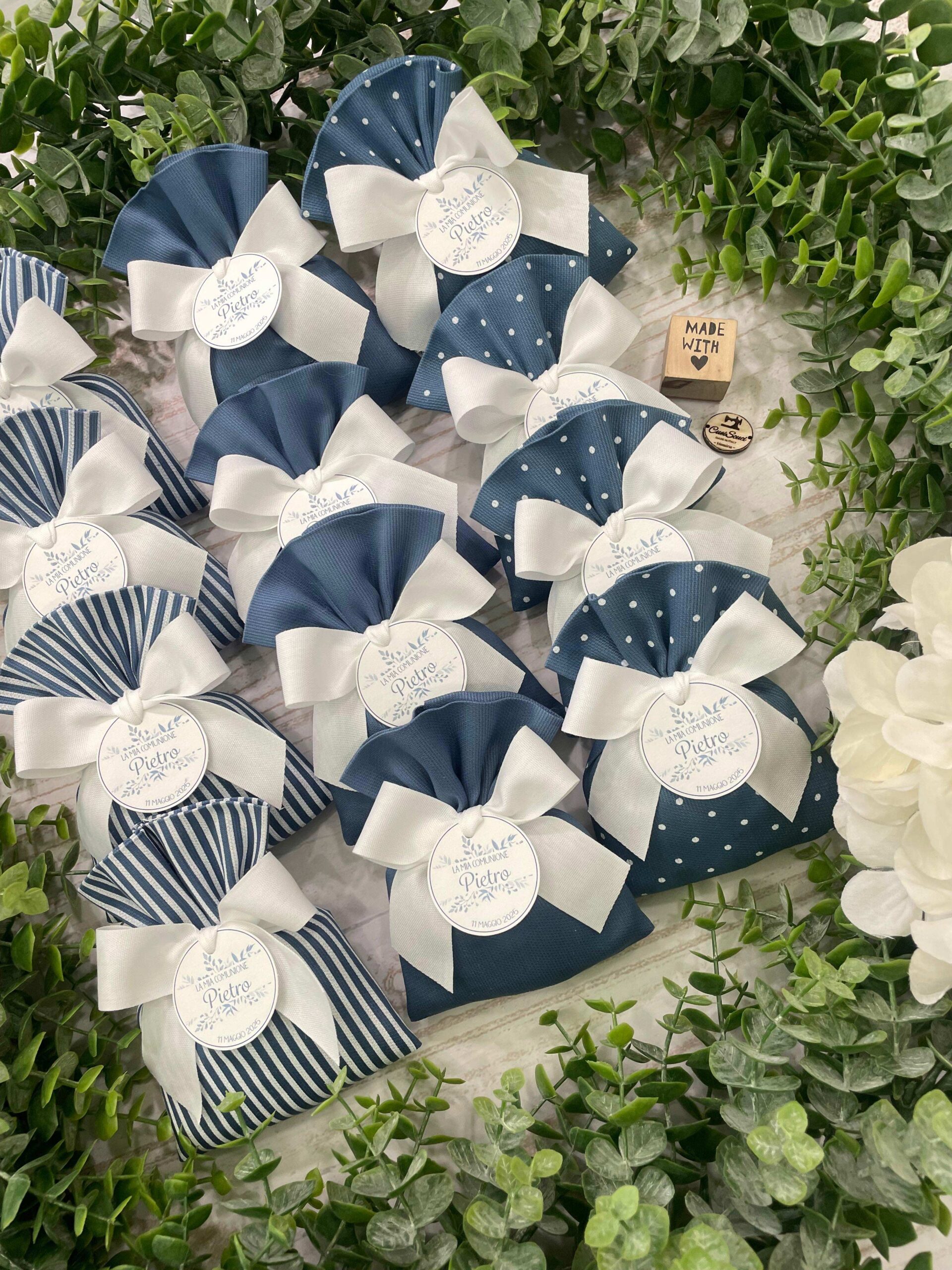 La bomboniera, pronta da donare ai tuoi ospiti, comprende il sacchetto, confezionato con imbottitura in ovatta, fiocco abbinato, 5 confetti in busta sigillata, con o senza tag.