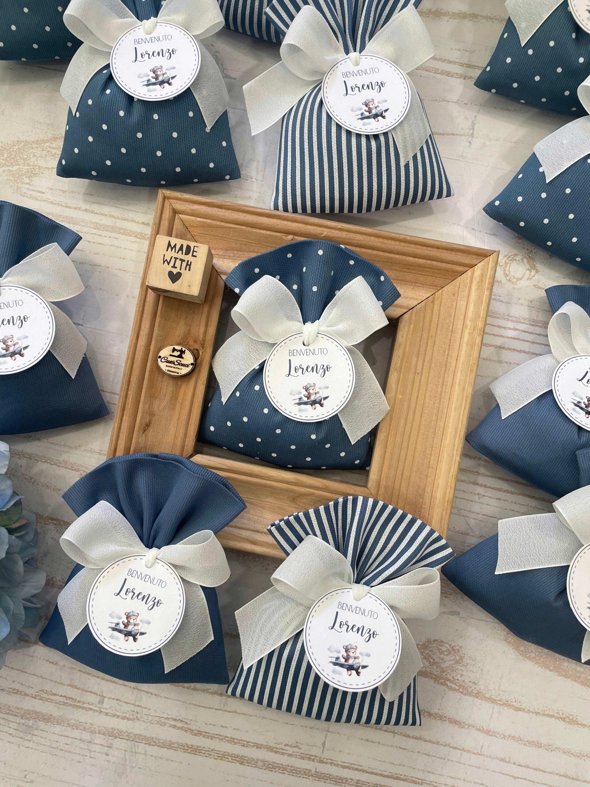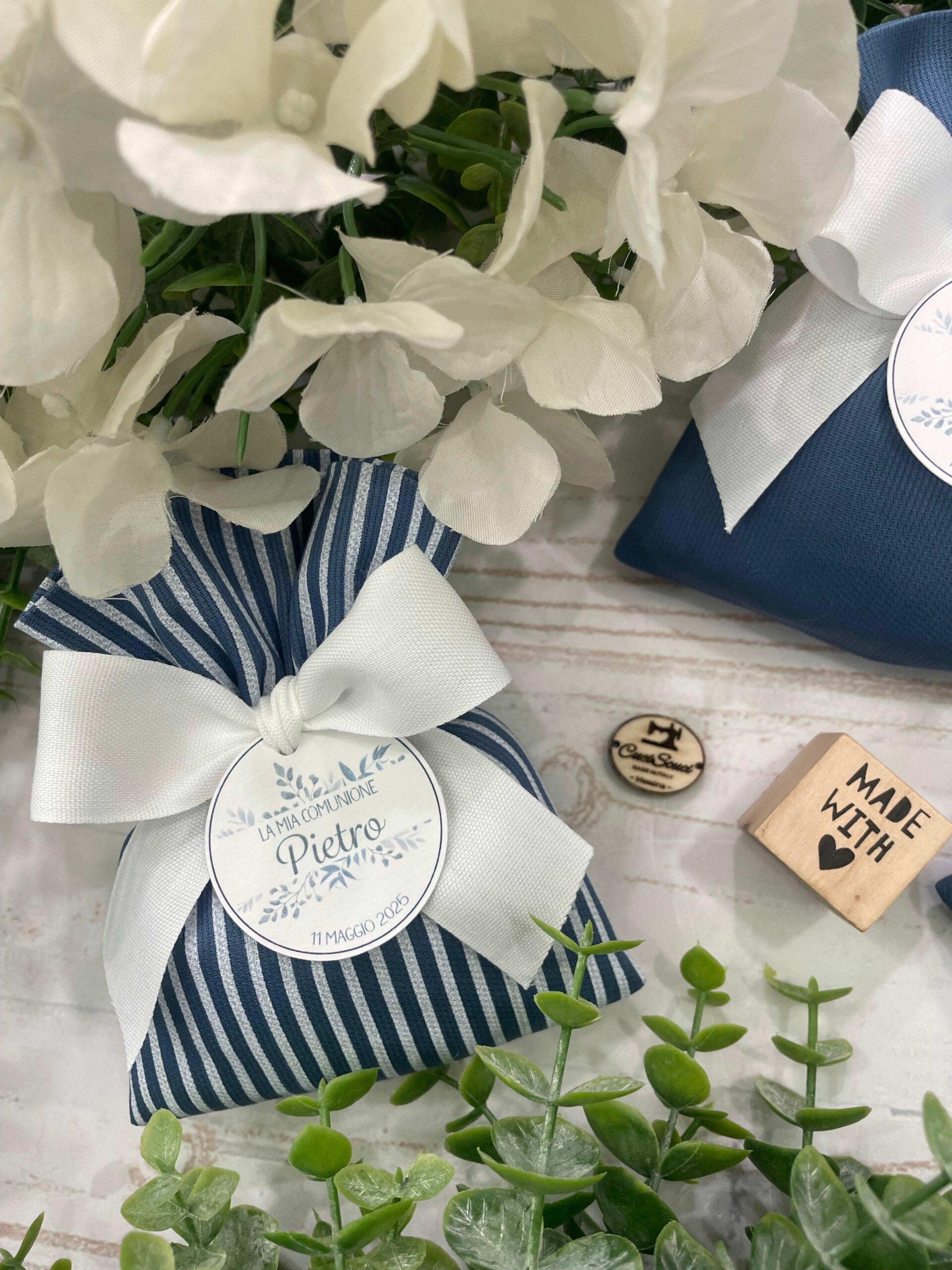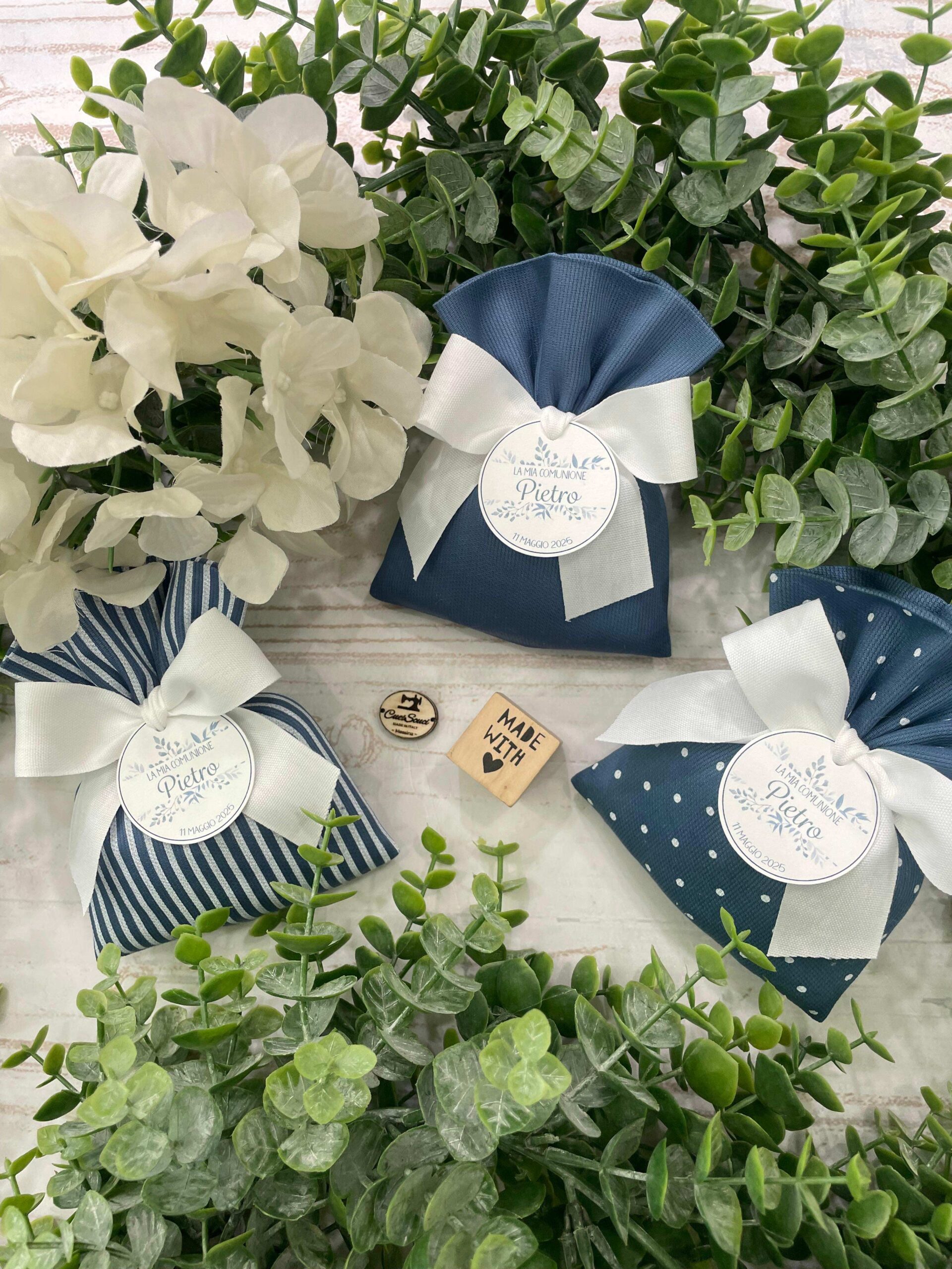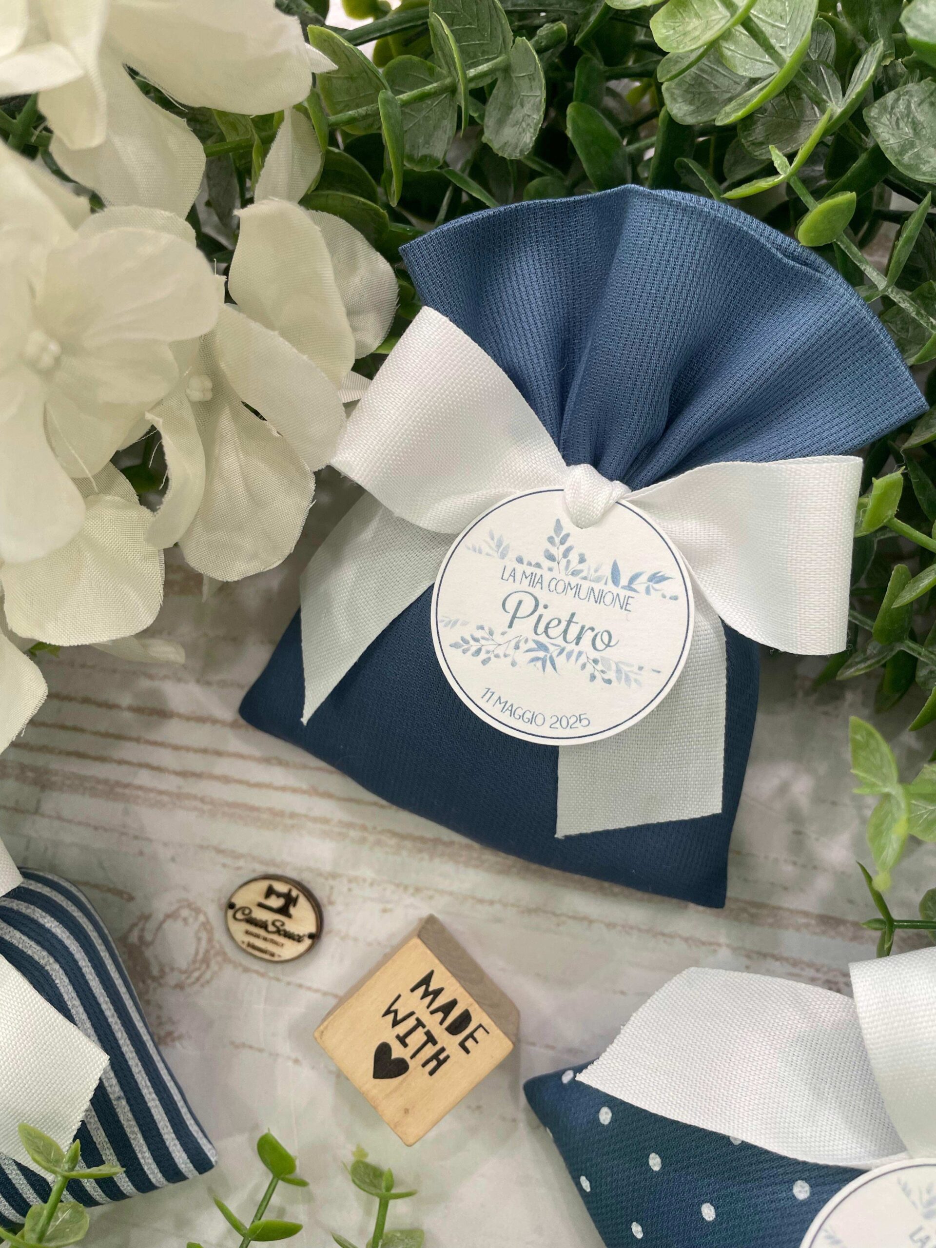 La bomboniera, pronta da donare ai tuoi ospiti, comprende il sacchetto, confezionato con imbottitura in ovatta, fiocco abbinato, 5 confetti in busta sigillata, con o senza tag.