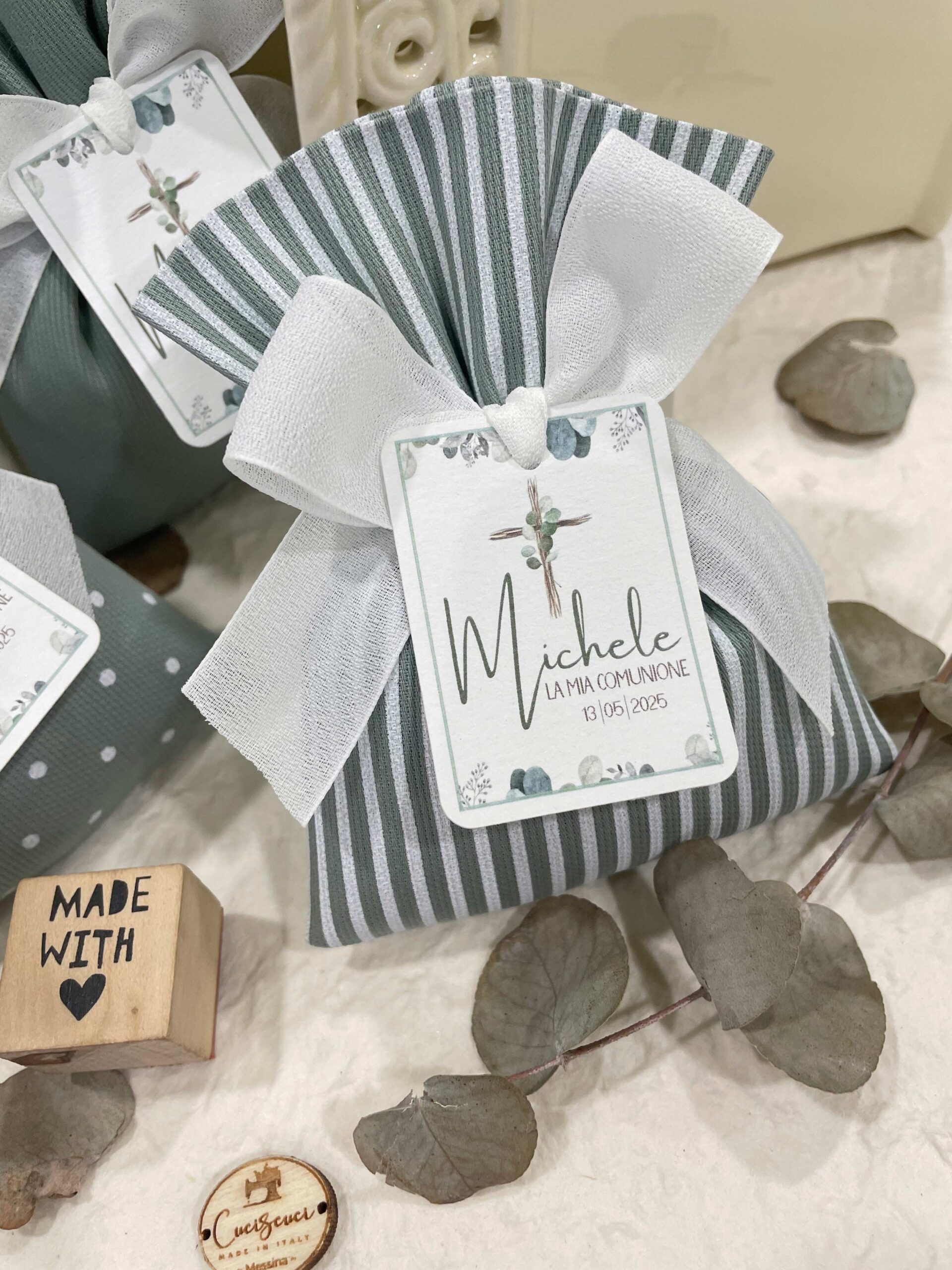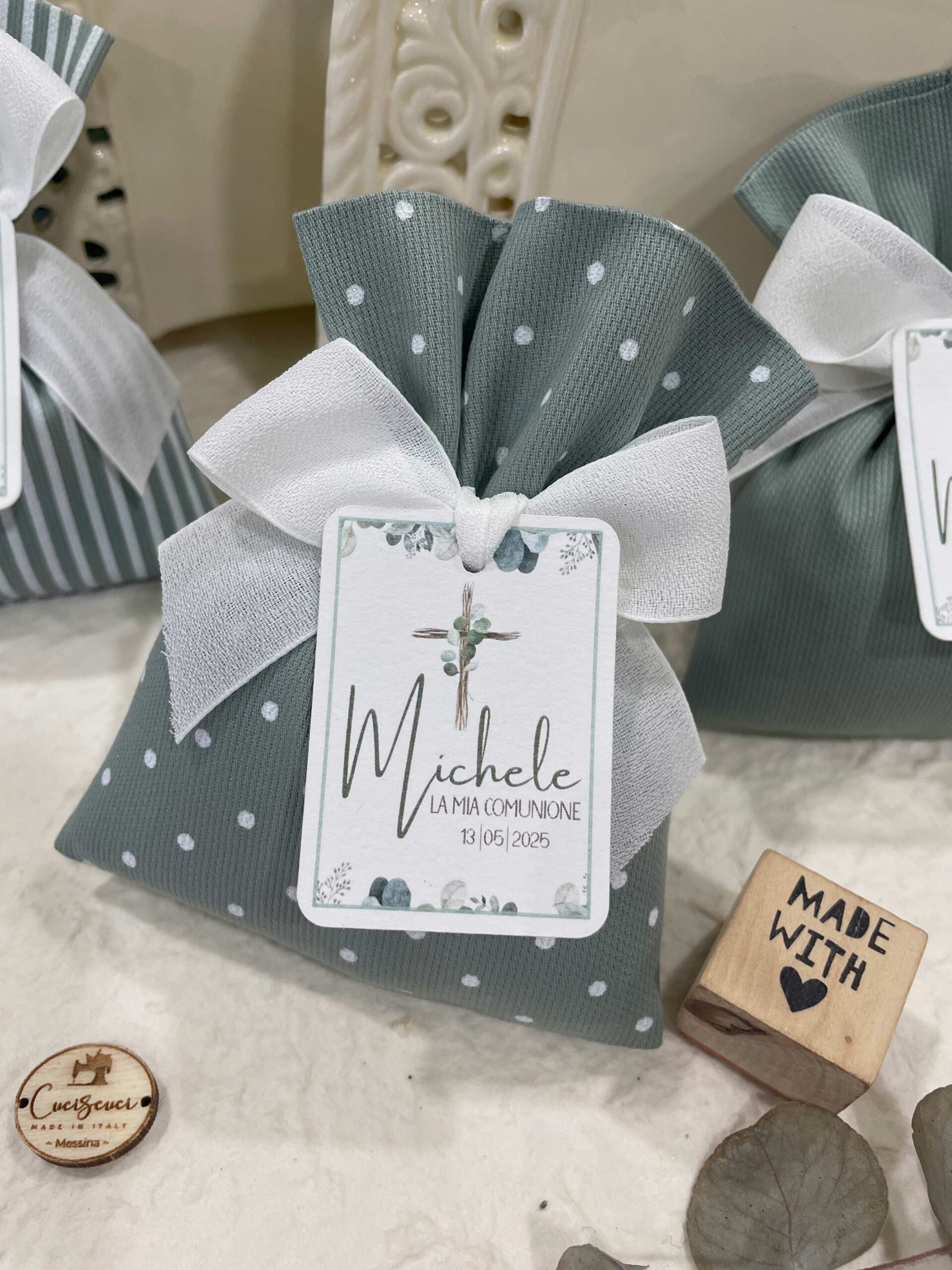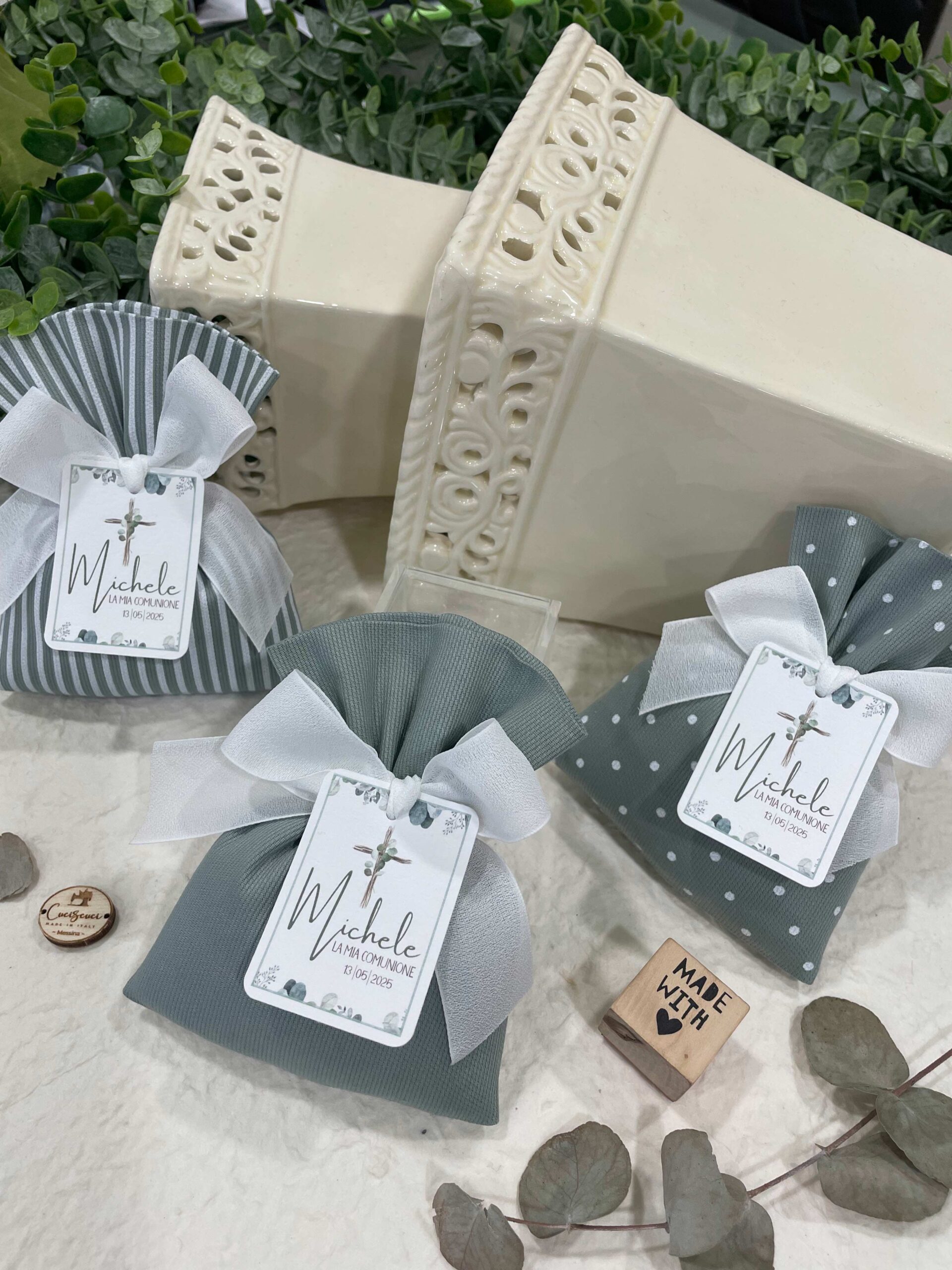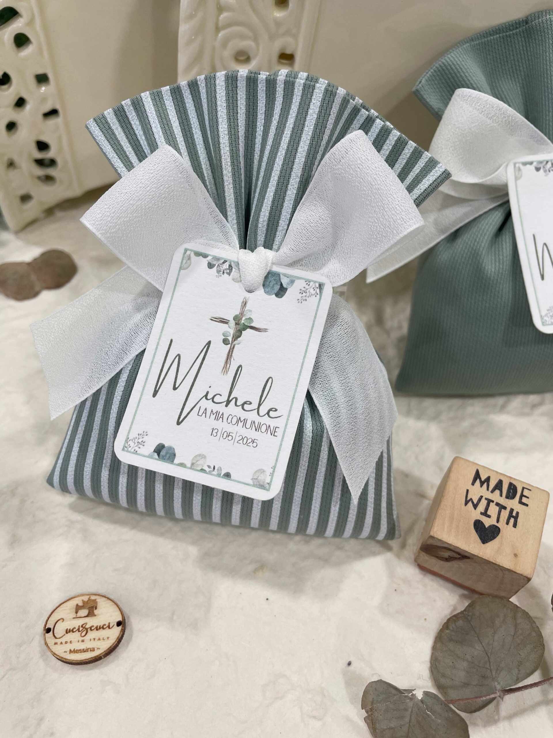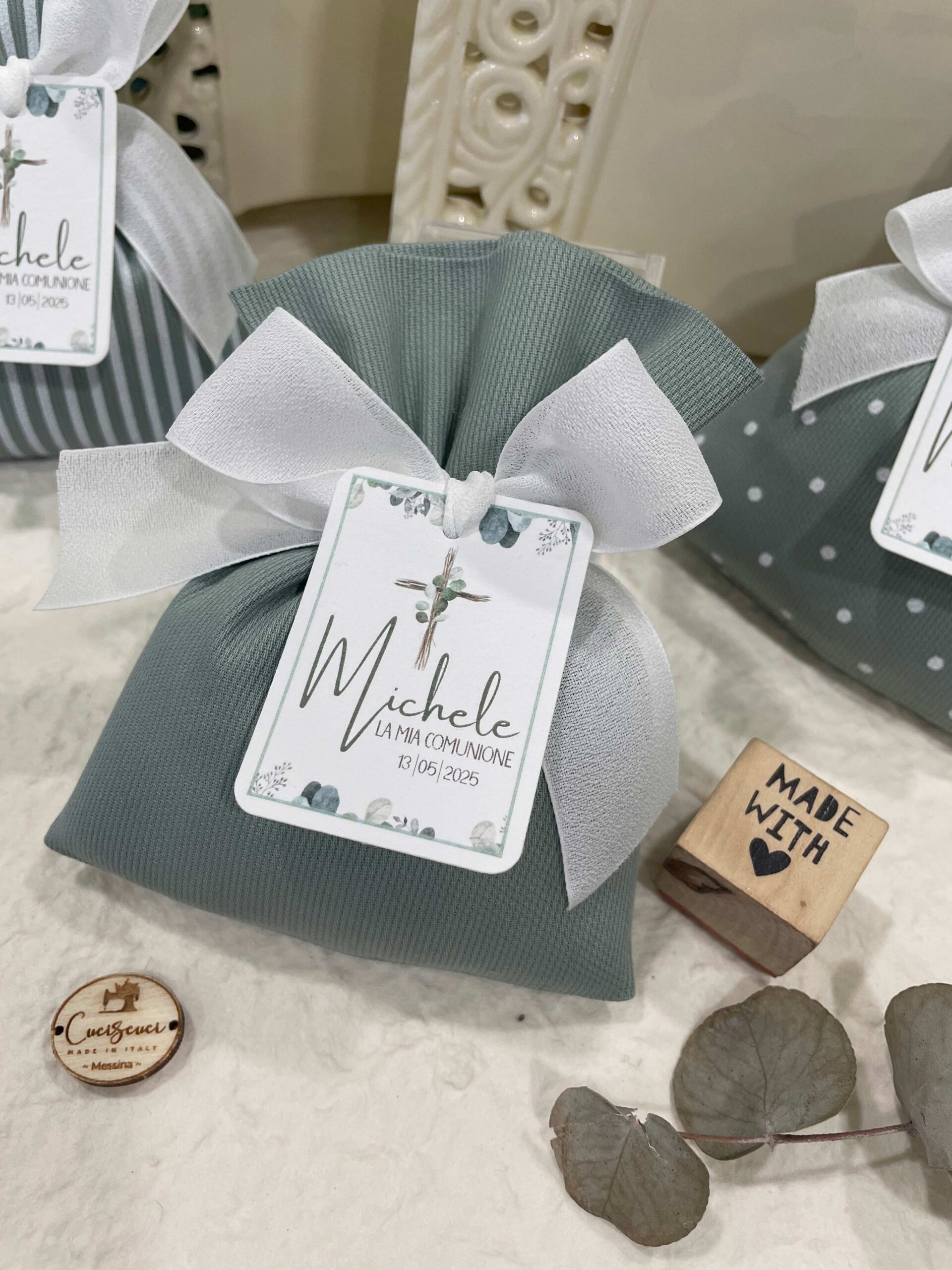 La bomboniera, pronta da donare ai tuoi ospiti, comprende il sacchetto, confezionato con imbottitura in ovatta, fiocco abbinato, 5 confetti in busta sigillata, con o senza tag.