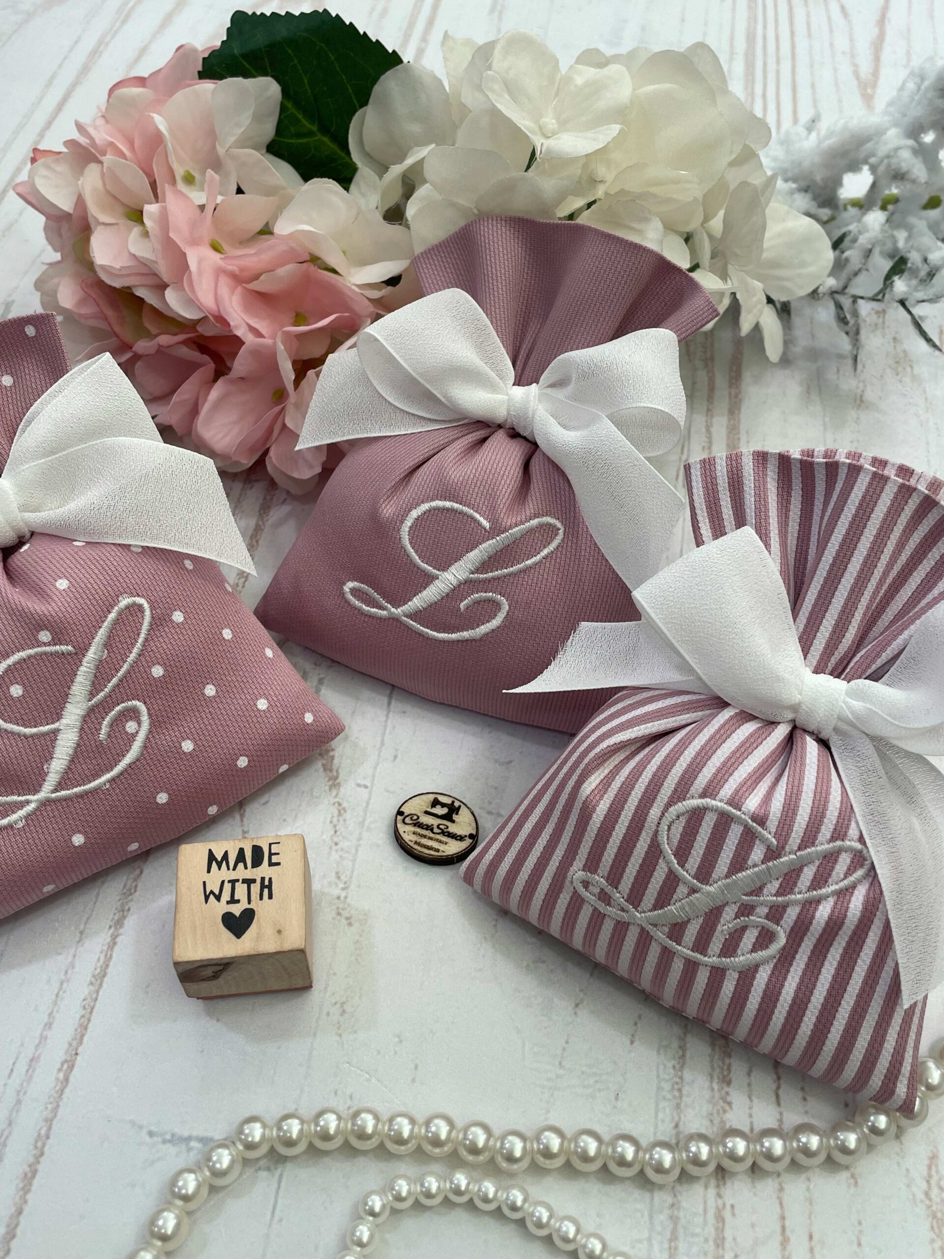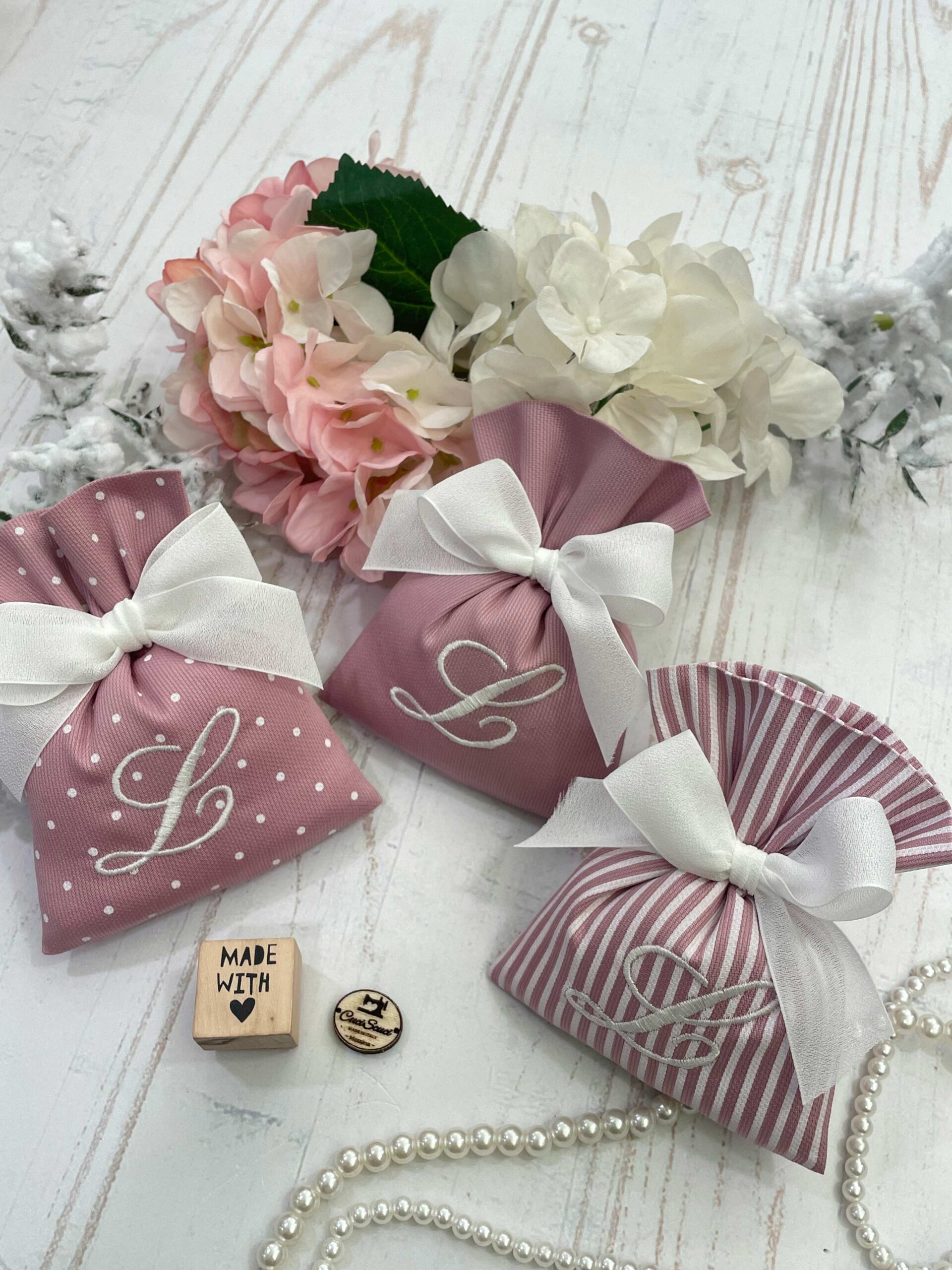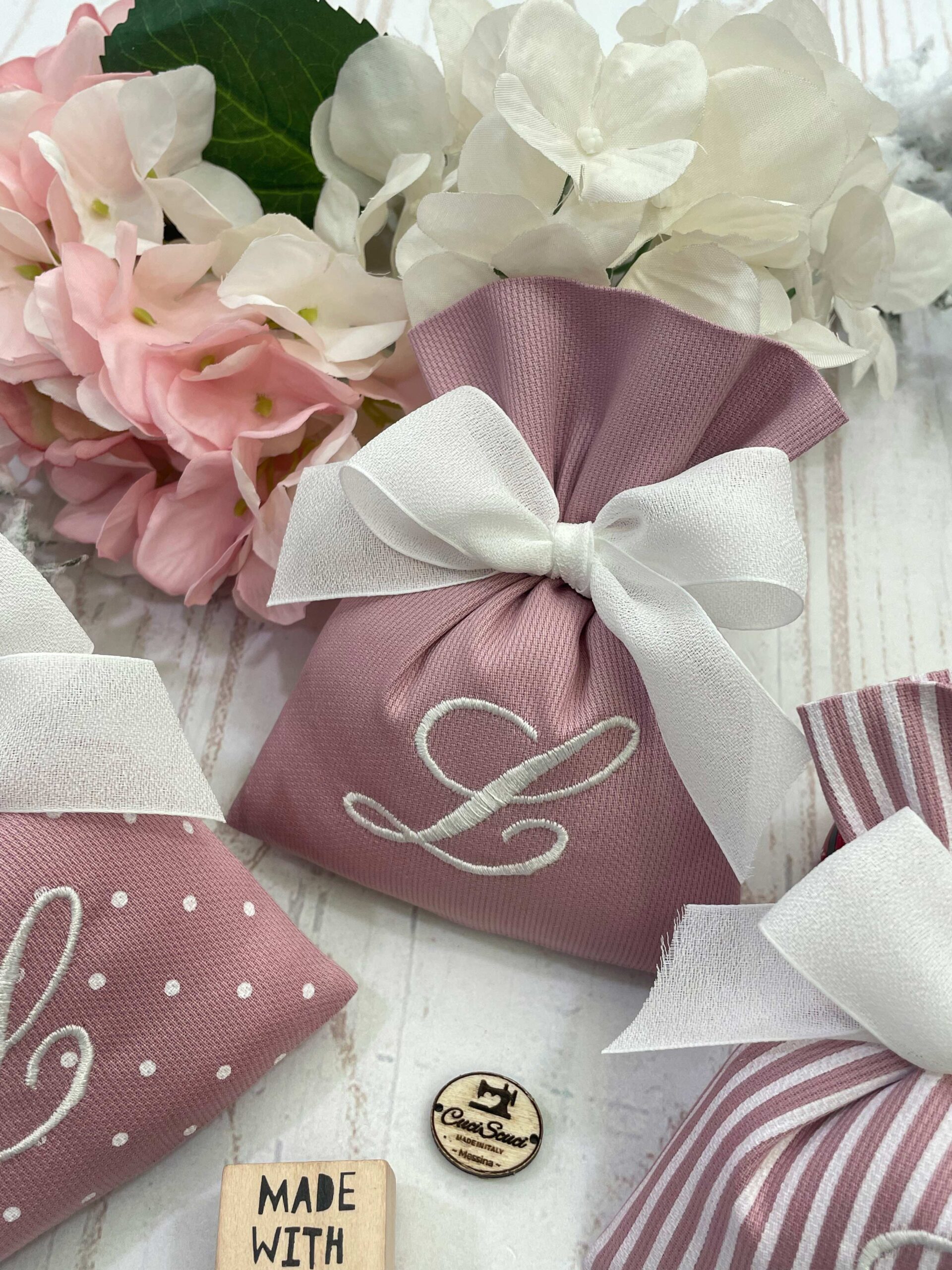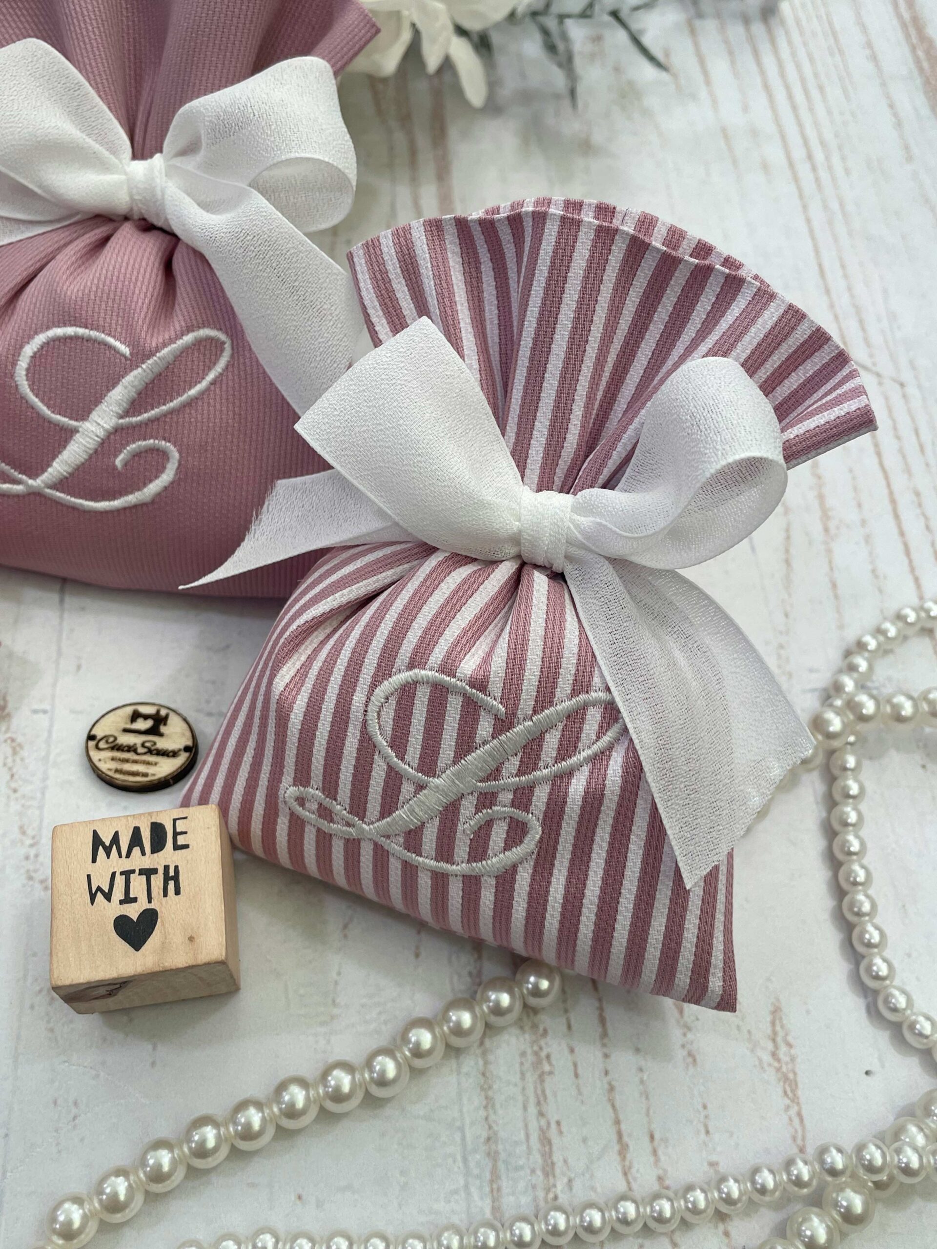 Realizzato con rigatino di cotone in fantasie assortite, o a scelta, nei toni rosa antico, con il ricamo di un’iniziale.