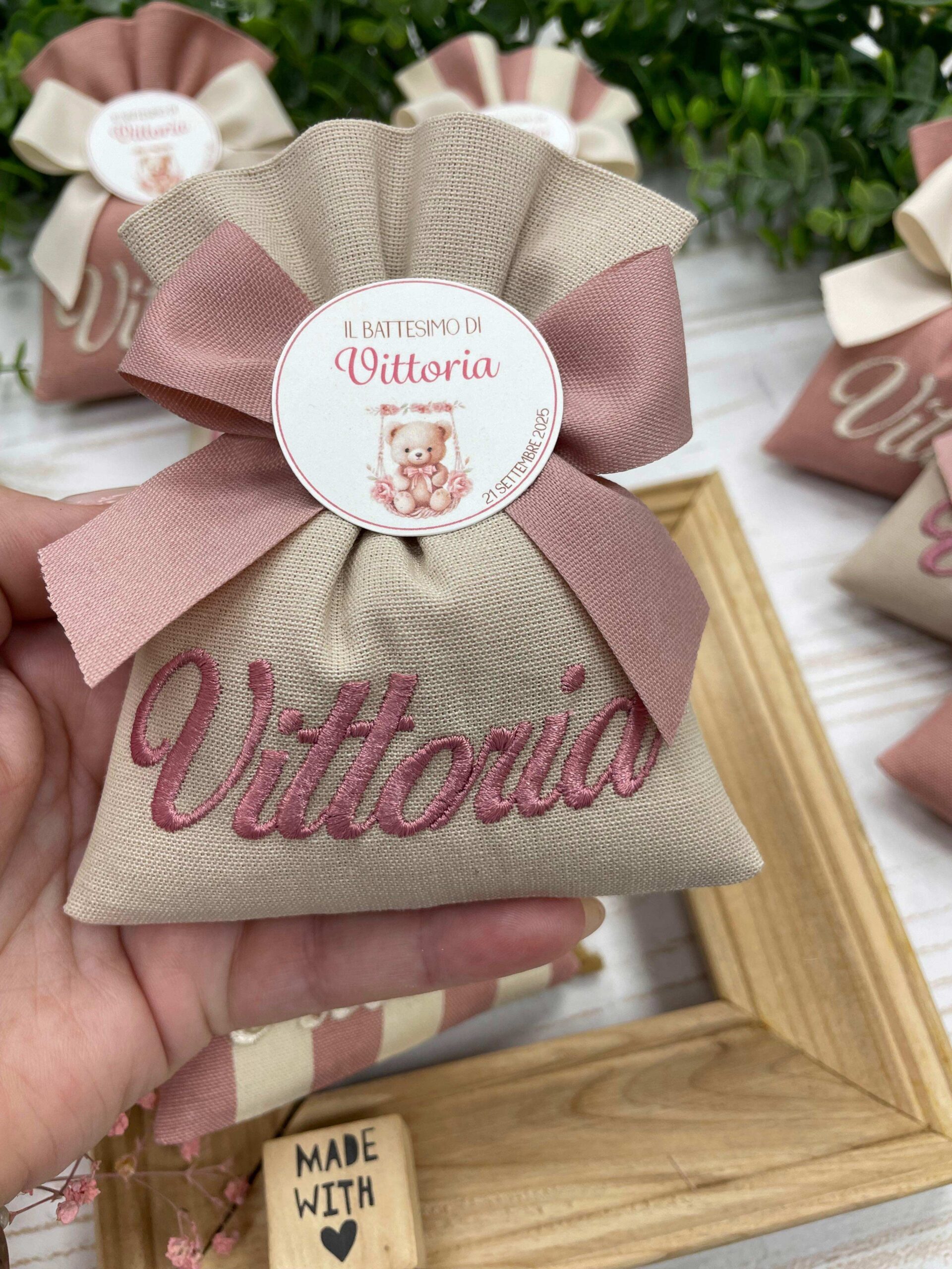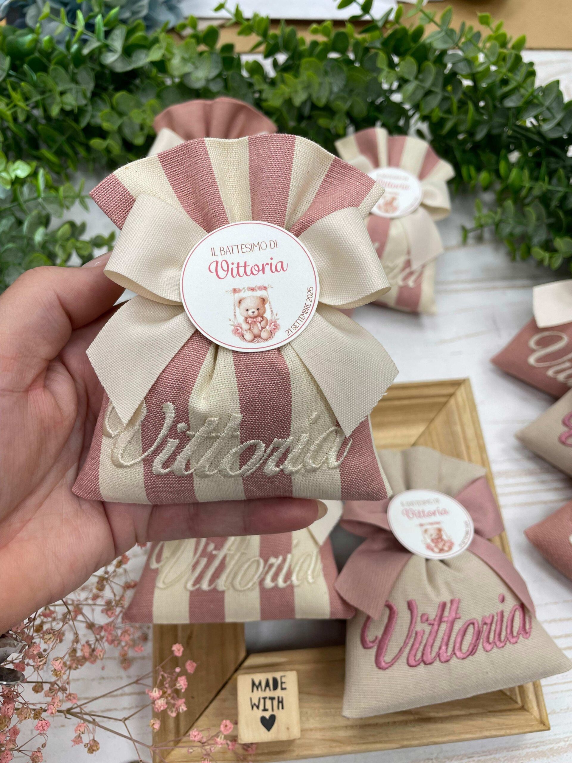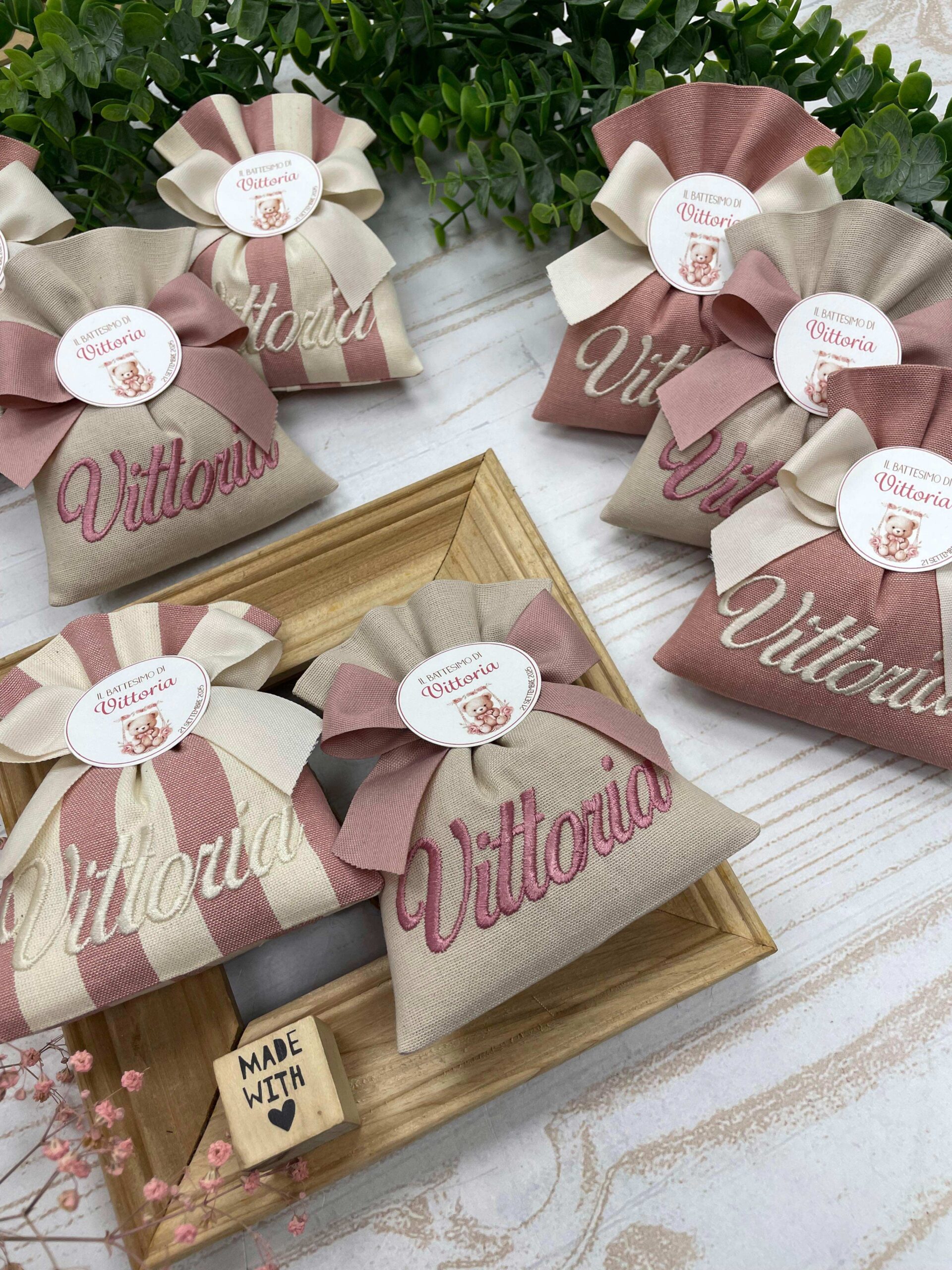La bomboniera, pronta da donare ai tuoi ospiti, comprende il sacchetto ricamato, confezionato con imbottitura in ovatta, fiocco abbinato e 5 confetti in busta sigillata, con o senza tag.