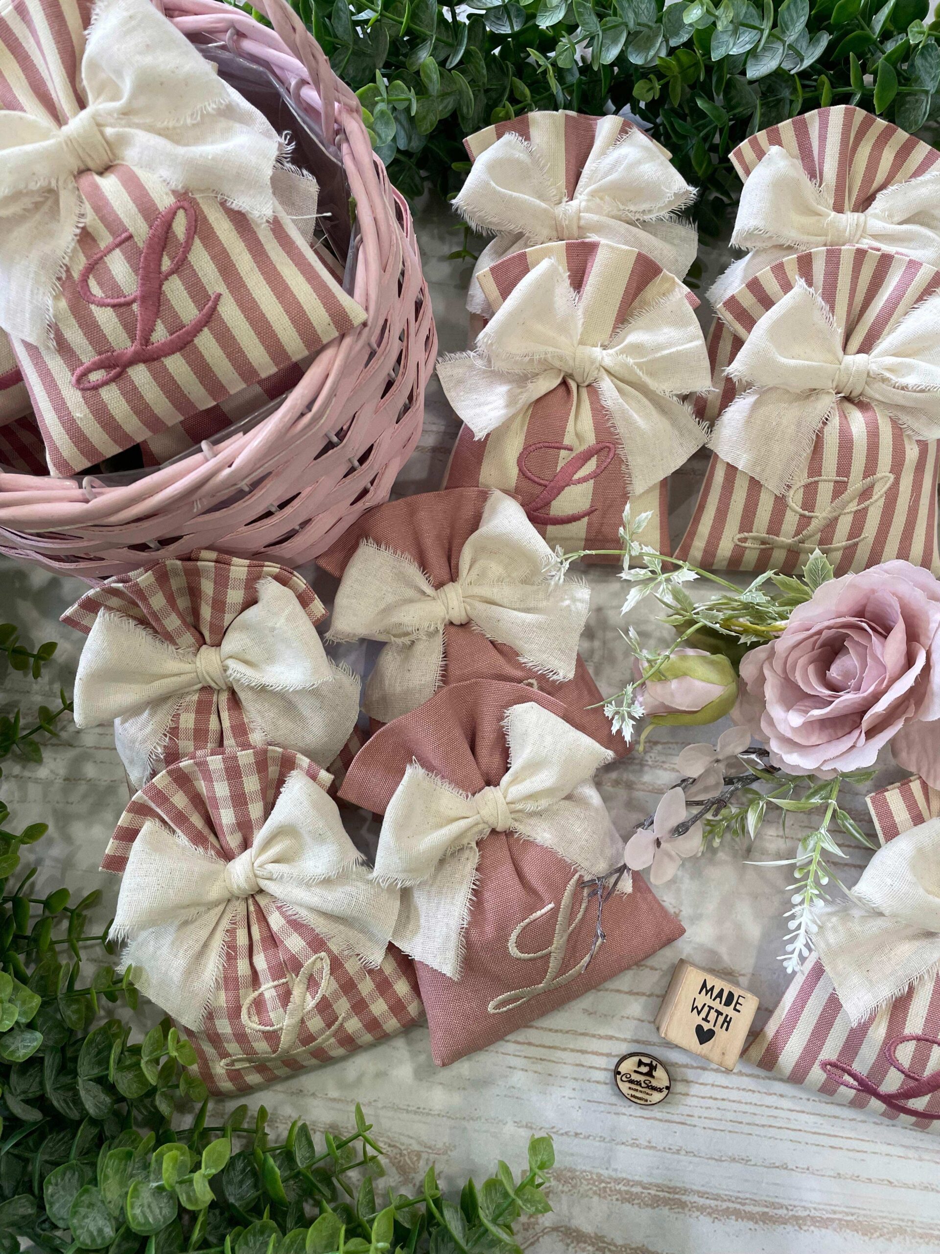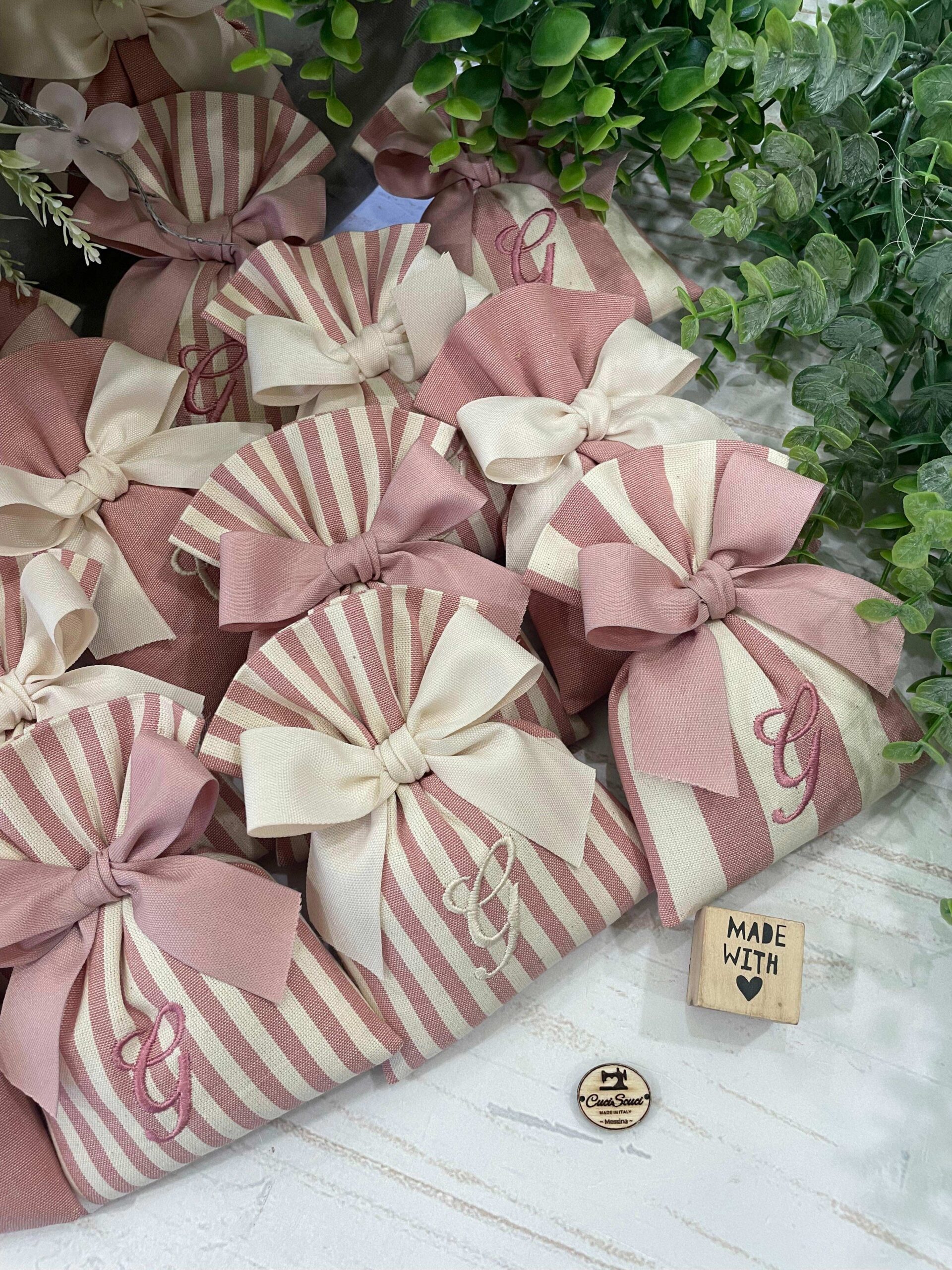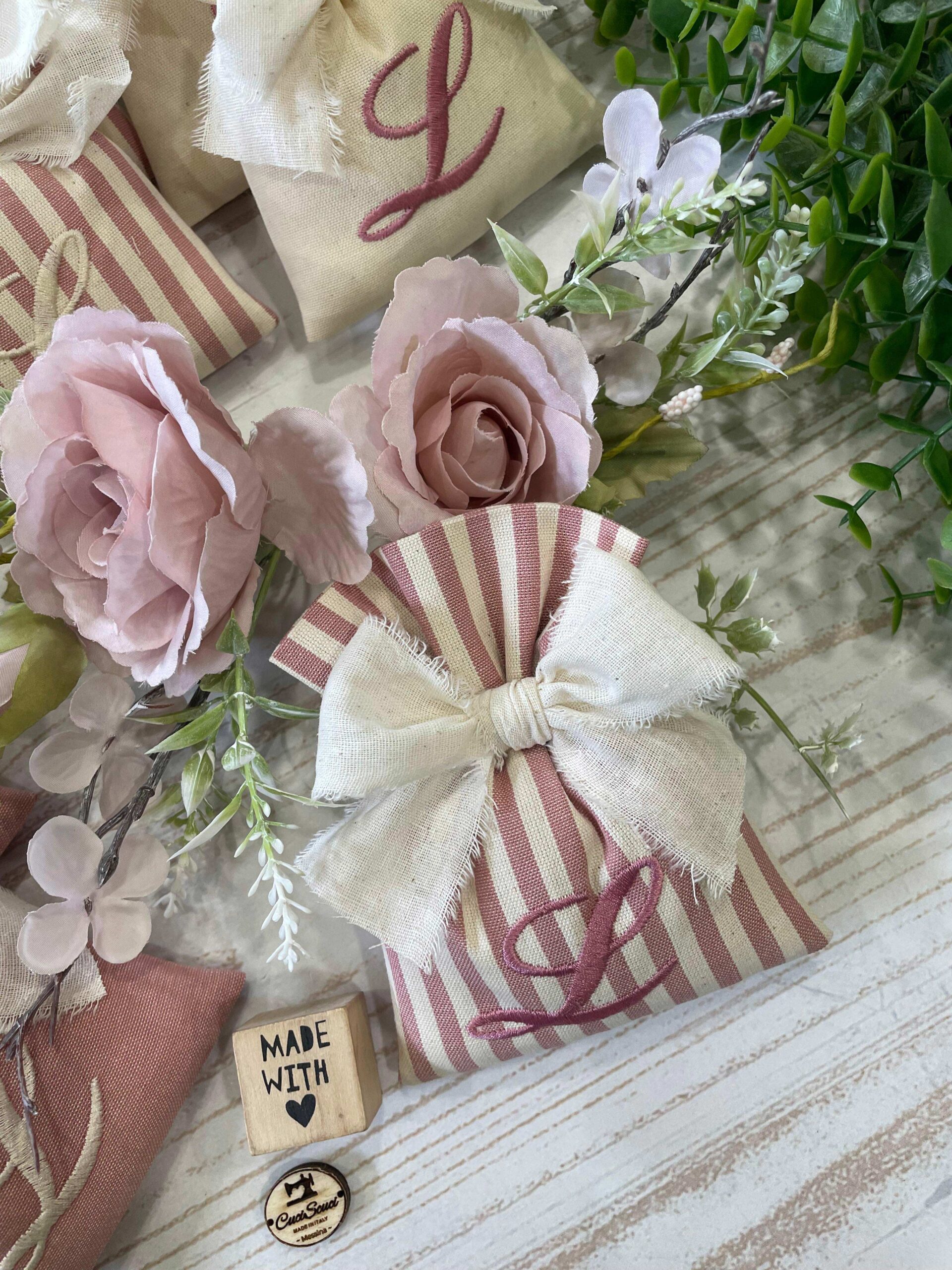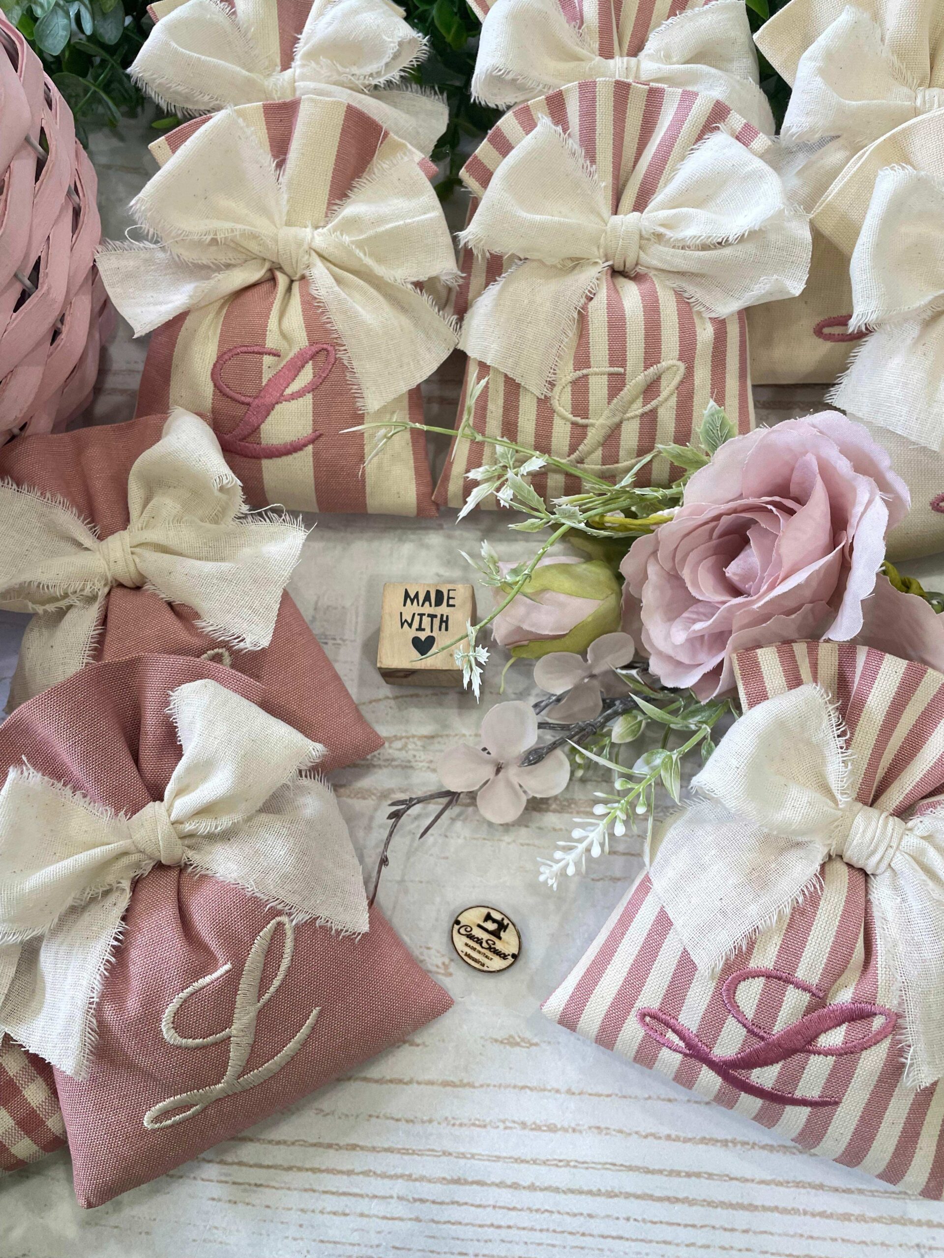 Realizzato con cotone tinto filo in fantasie assortite (o a scelta) nei toni del rosa antico e del panna con il ricamo di un’iniziale e l’applicazione di un tag personalizzato.