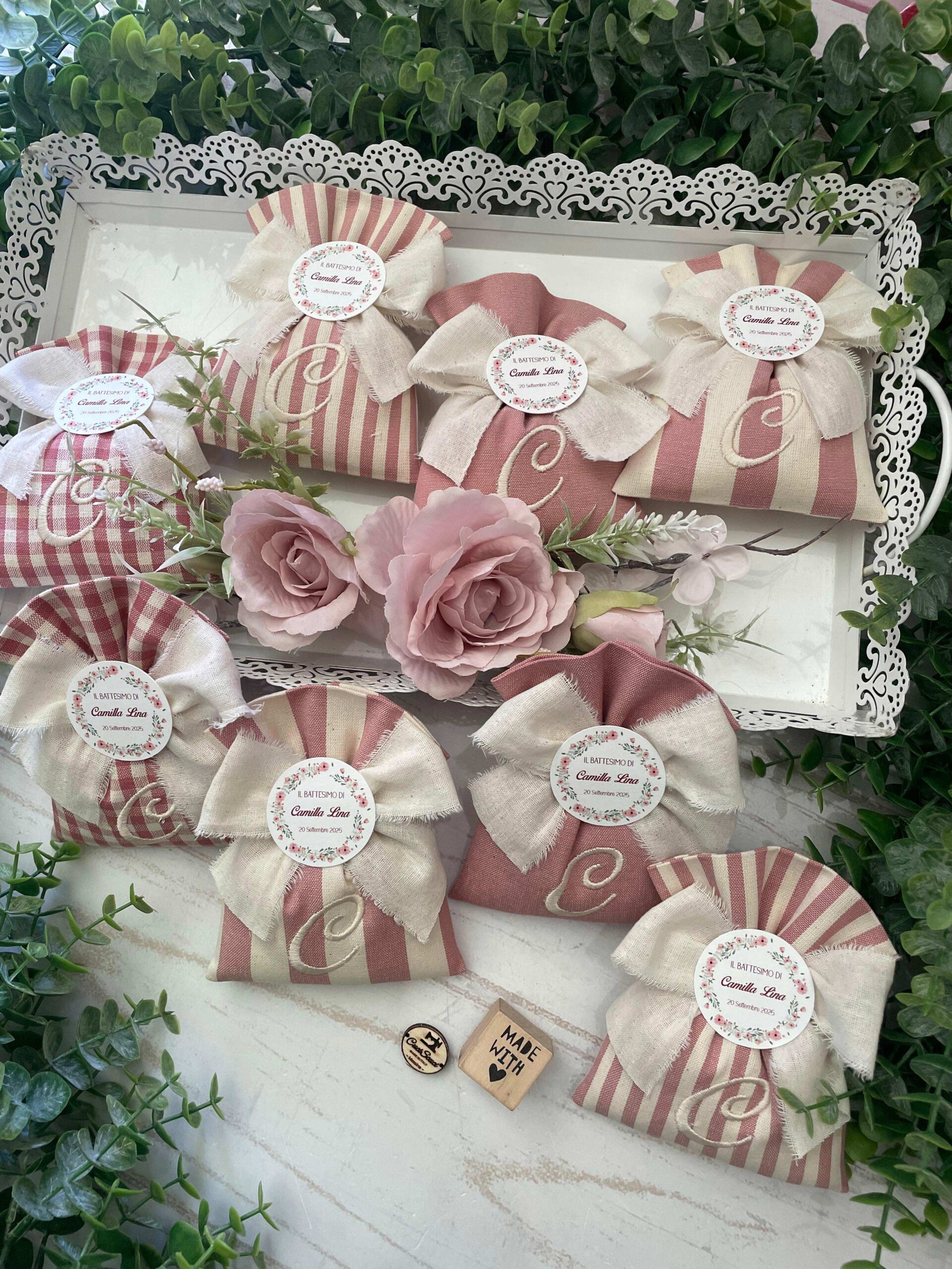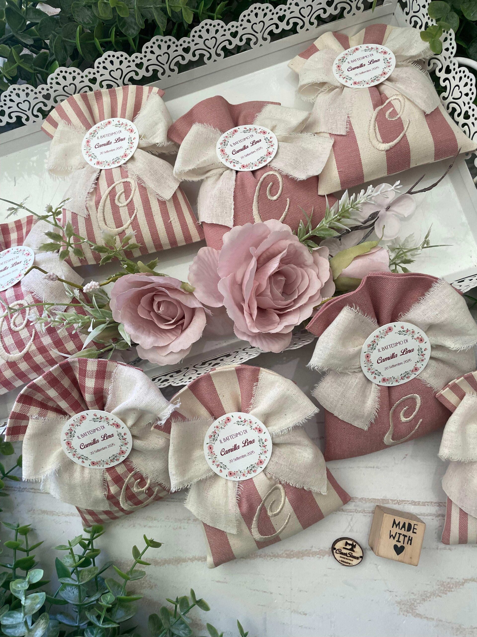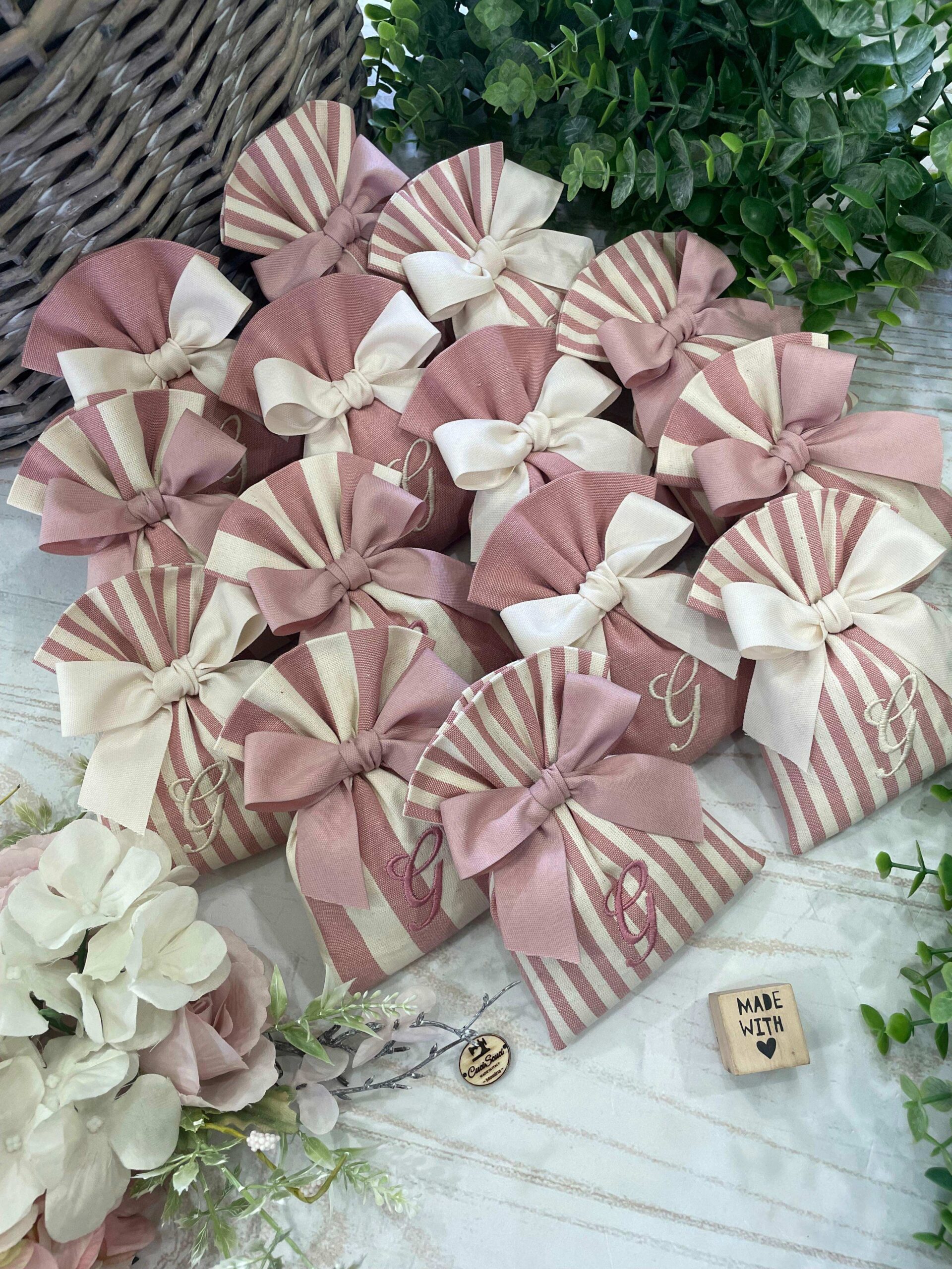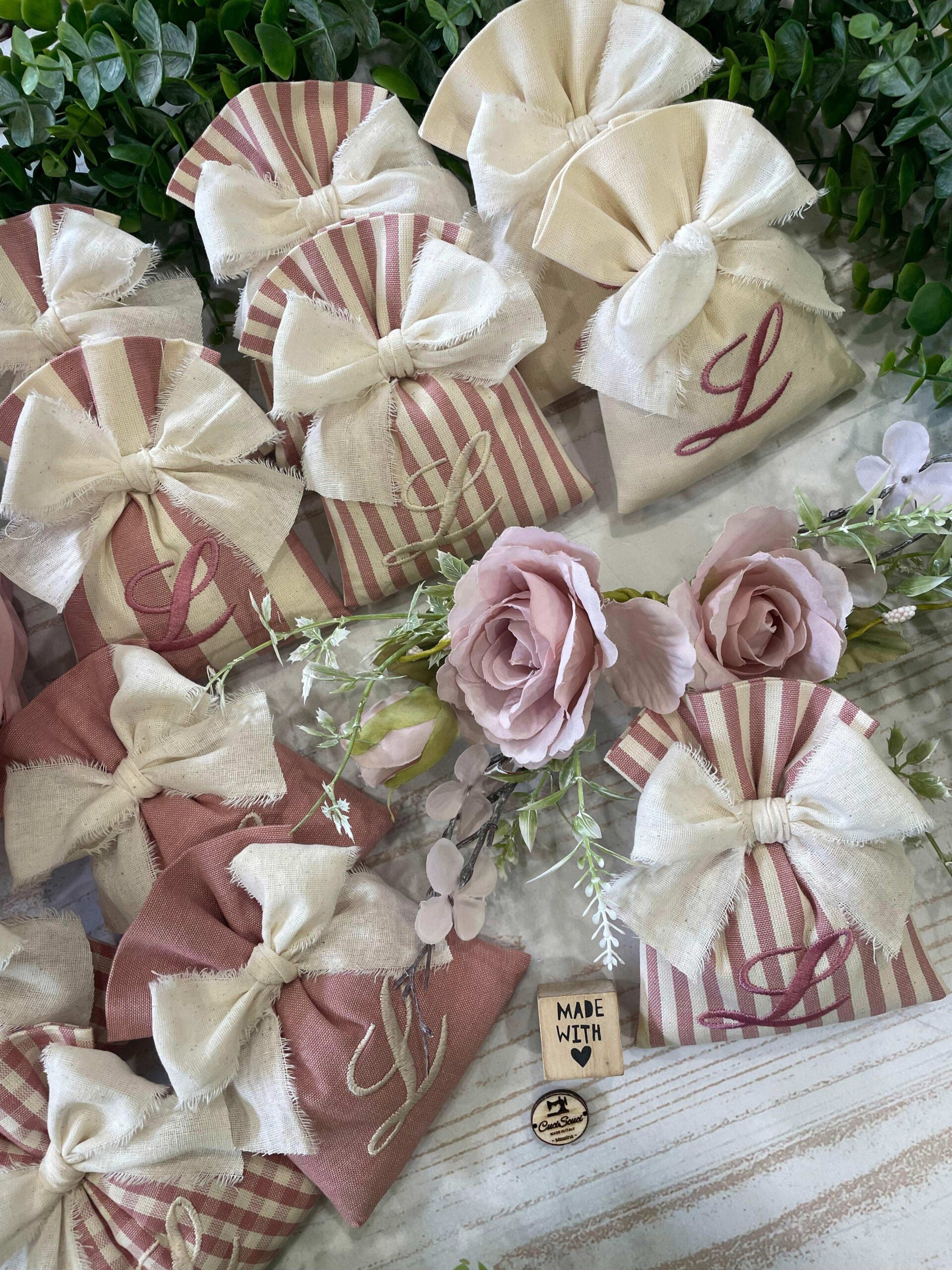 Realizzato con cotone tinto filo in fantasie assortite (o a scelta) nei toni del rosa antico e del panna con il ricamo di un’iniziale e l’applicazione di un tag personalizzato.