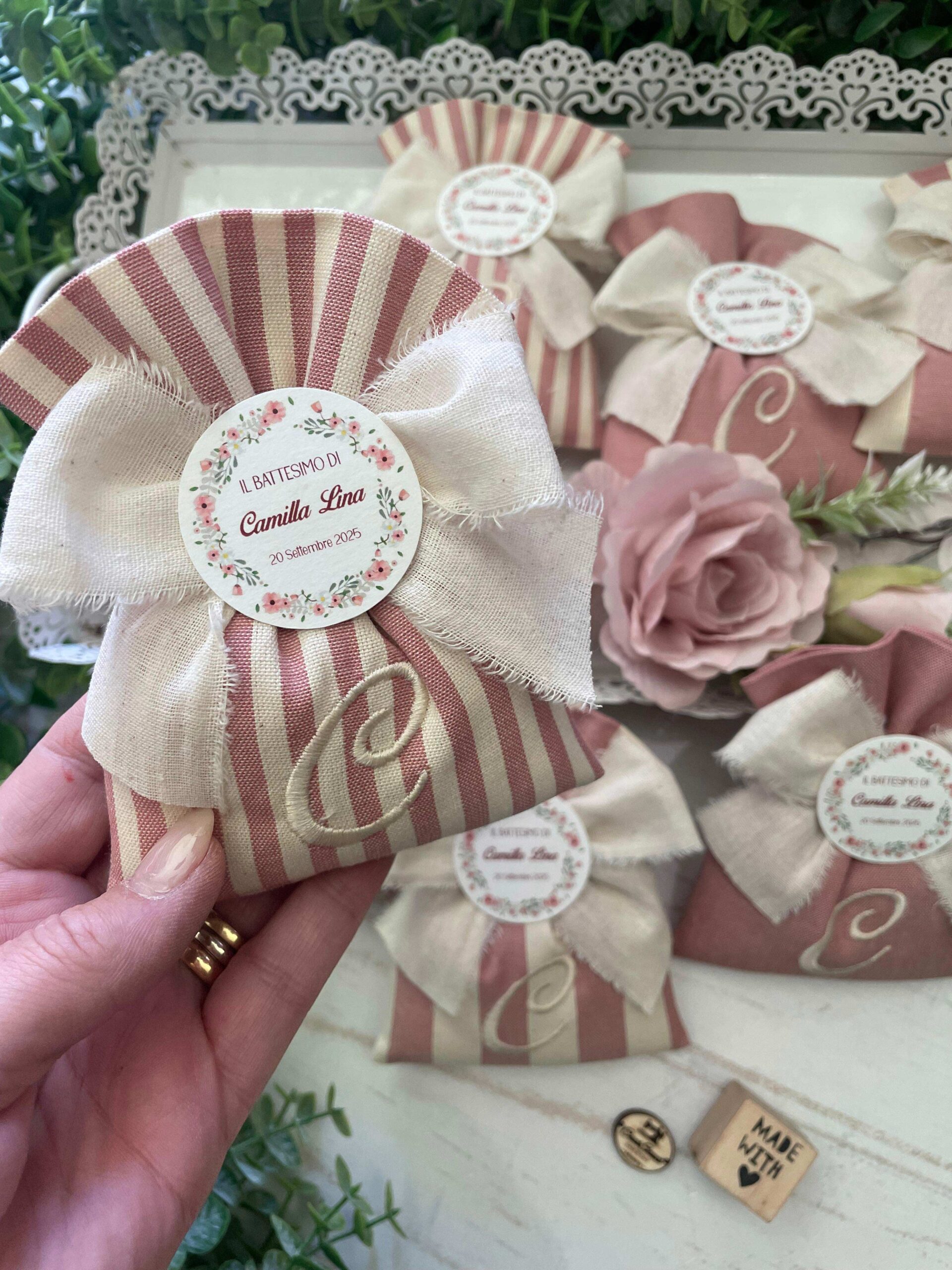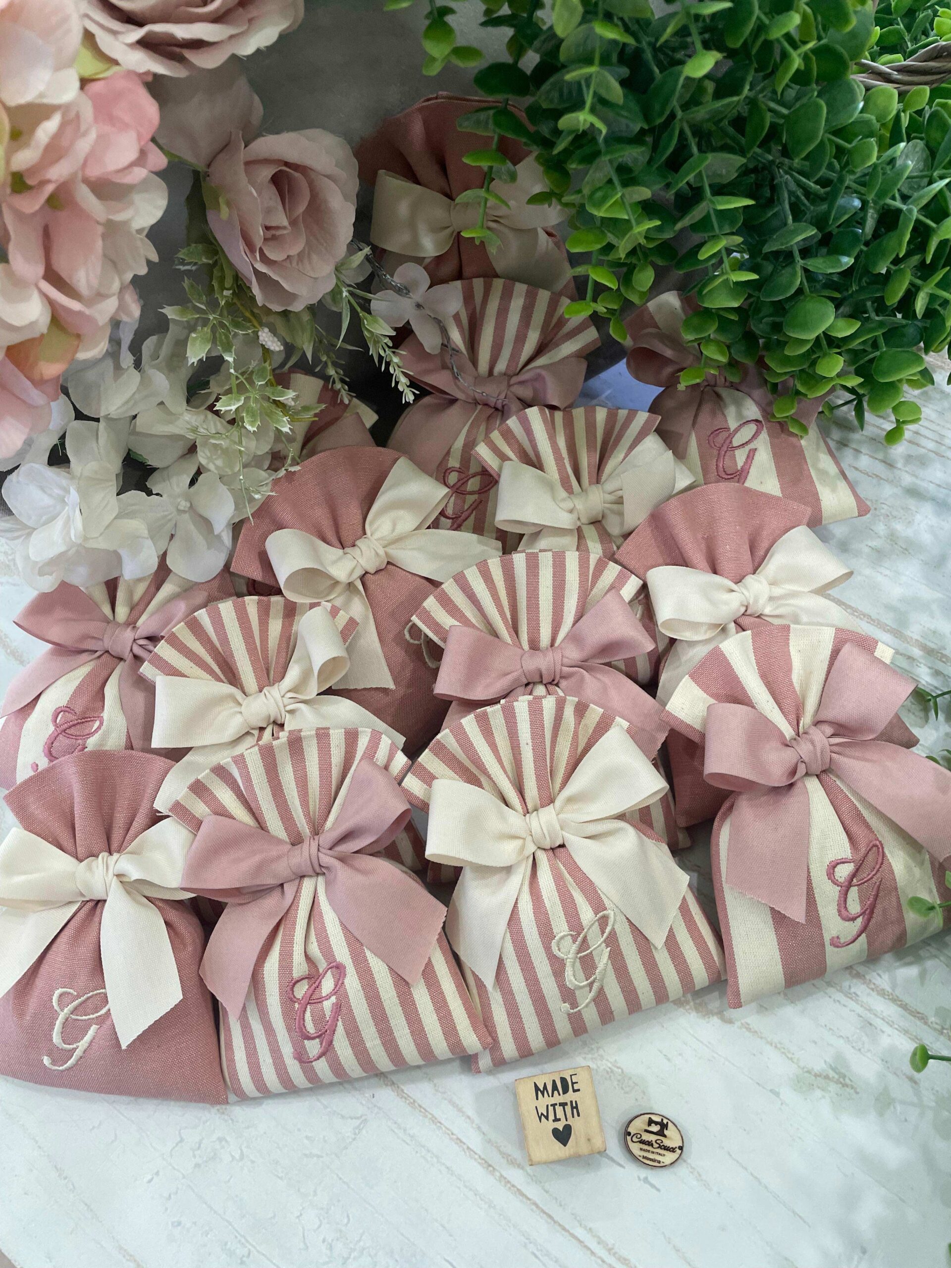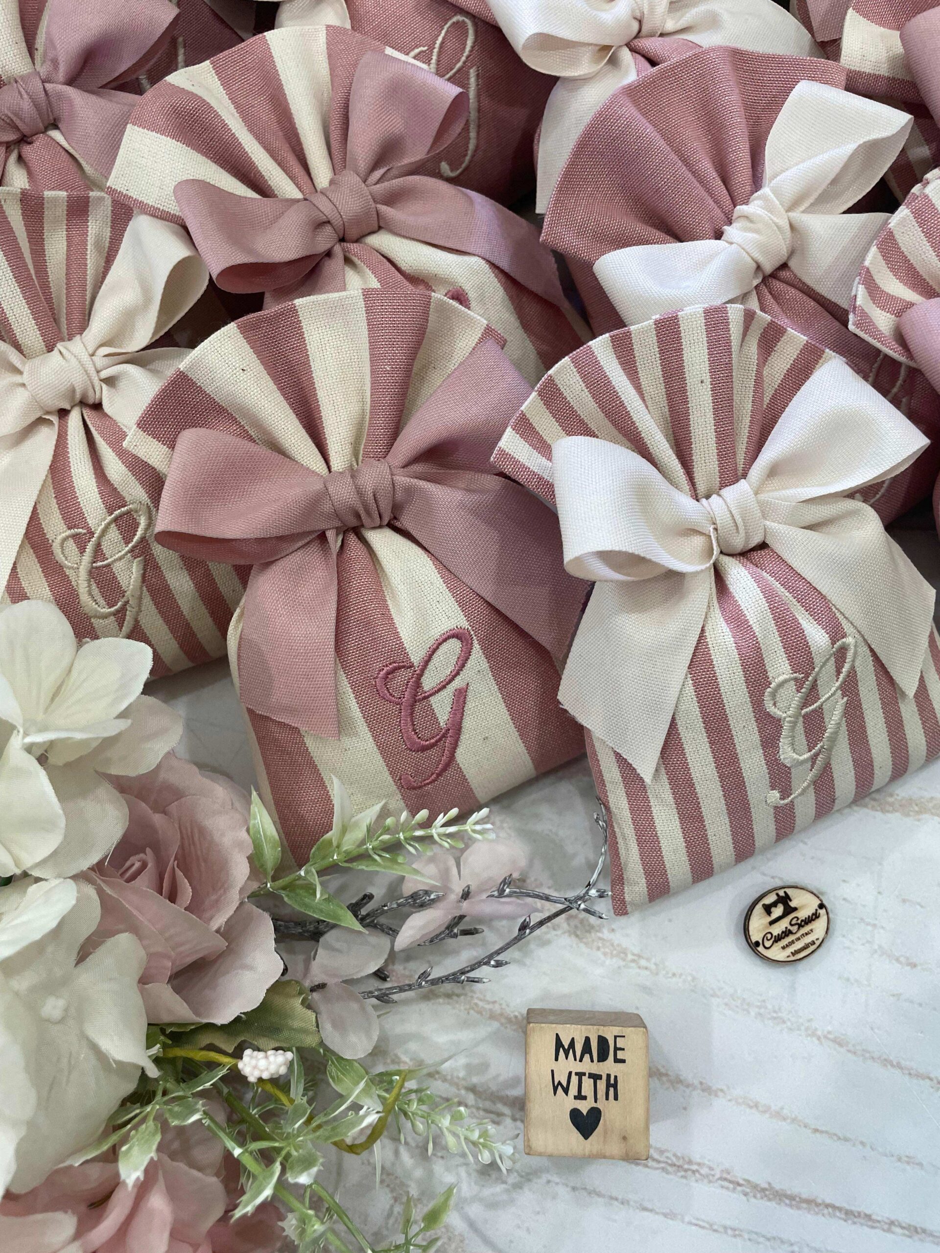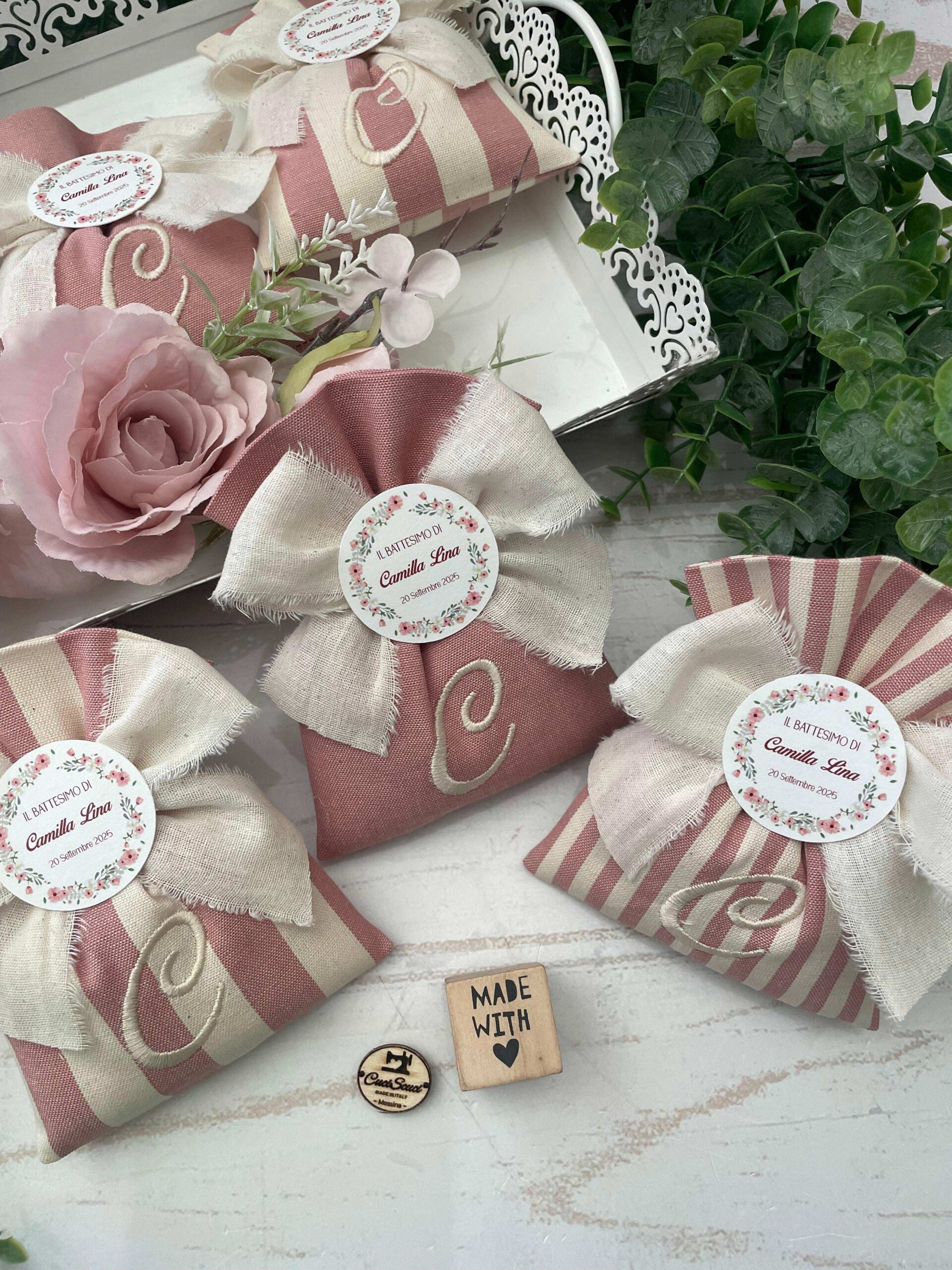 Realizzato con cotone tinto filo in fantasie assortite (o a scelta) nei toni del rosa antico e del panna con il ricamo di un’iniziale e l’applicazione di un tag personalizzato.